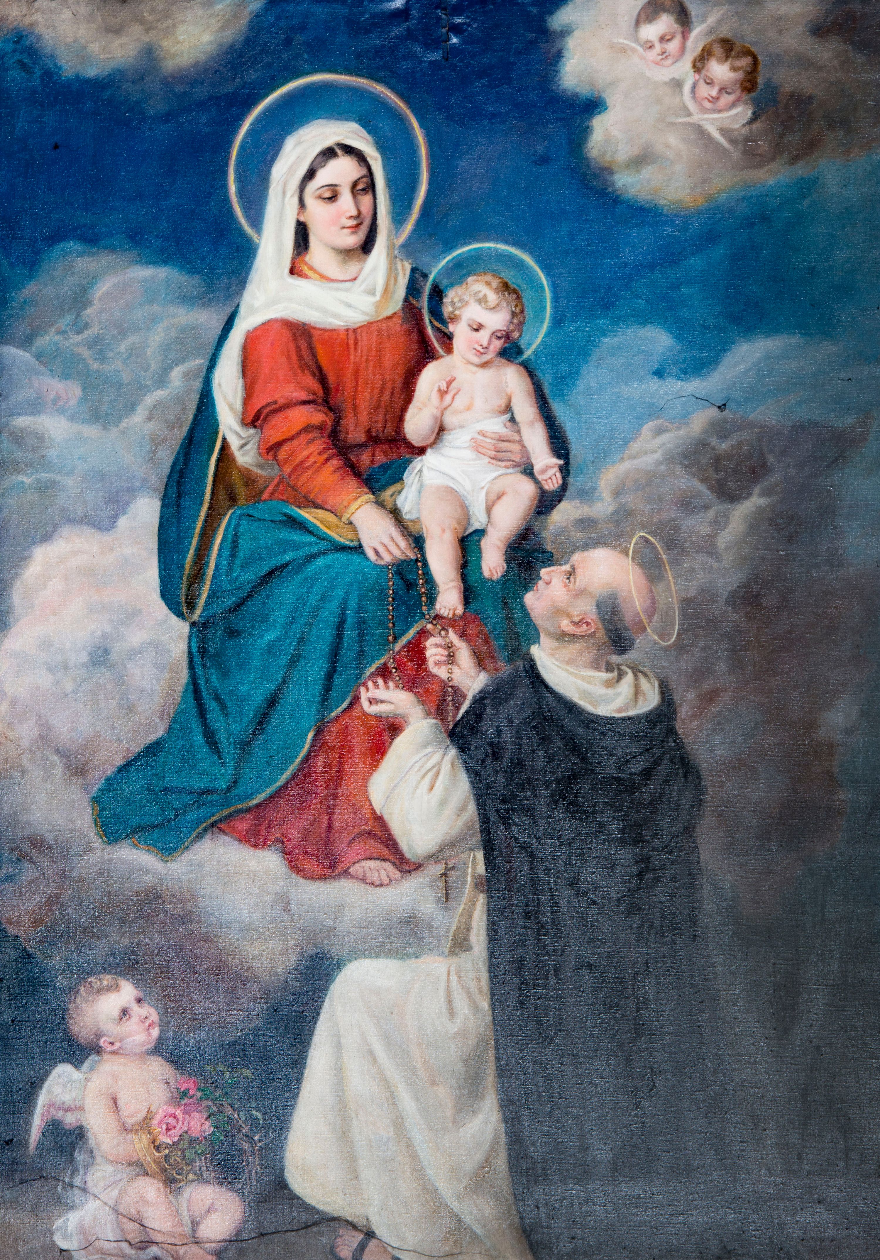 Obraz w kształcie stojącego prostokąta z przedstawieniem Matki Boskiej Różańcowej ze św. Dominikiem. Nieznacznie na lewo od centrum kompozycji tronuje wśród obłoków Matka Boska z Dzieciątkiem na lewym kolanie, zwrócona lekko w lewo. Maria spogląda w dół, na świętego, ma owalną twarz o łagodnym wyrazie; duże oczy, wąski nos, zaróżowione policzki oraz małe usta rozciągnięte w przyjaznym uśmiechu. Prawą ręką podaje różaniec, lewą przytrzymuje Jezuska. Jest ubrana w czerwoną suknię o rękawach zwężających się poniżej łokcia, niebieski, podbity złotem płaszcz, który zakrywa jej plecy i nogi oraz biały welon zarzucony na głowę i przełożony przez dekolt za prawe ramię. Dzieciątko prawą rękę unosi w geście błogosławieństwa, lewą wyciąga w stronę świętego. Ma owalną twarz o pogodnym wyrazie otoczoną jasnymi loczkami. Święty Dominik klęczy na prawym kolanie zwrócony przodem do Marii, wznosi głowę, obiema rękami odbiera podawany mu różaniec. Ma małą twarz o ostrych rysach, tonsurę i siwiejące włosy; jest ubrany w habit dominikański. W lewym, dolnym rogu kompozycji siedzi trzymające bukiet róż putto, które spogląda na rozgrywającą się powyżej scenę. W prawym górnym rogu unoszą się na tle chmury dwie uskrzydlone główki anielskie. Tło wypełniają skłębione obłoki, między którymi widoczne są fragmenty niebieskiego nieba. Obraz ujęty w prostokątną, profilowaną, złoconą ramę.