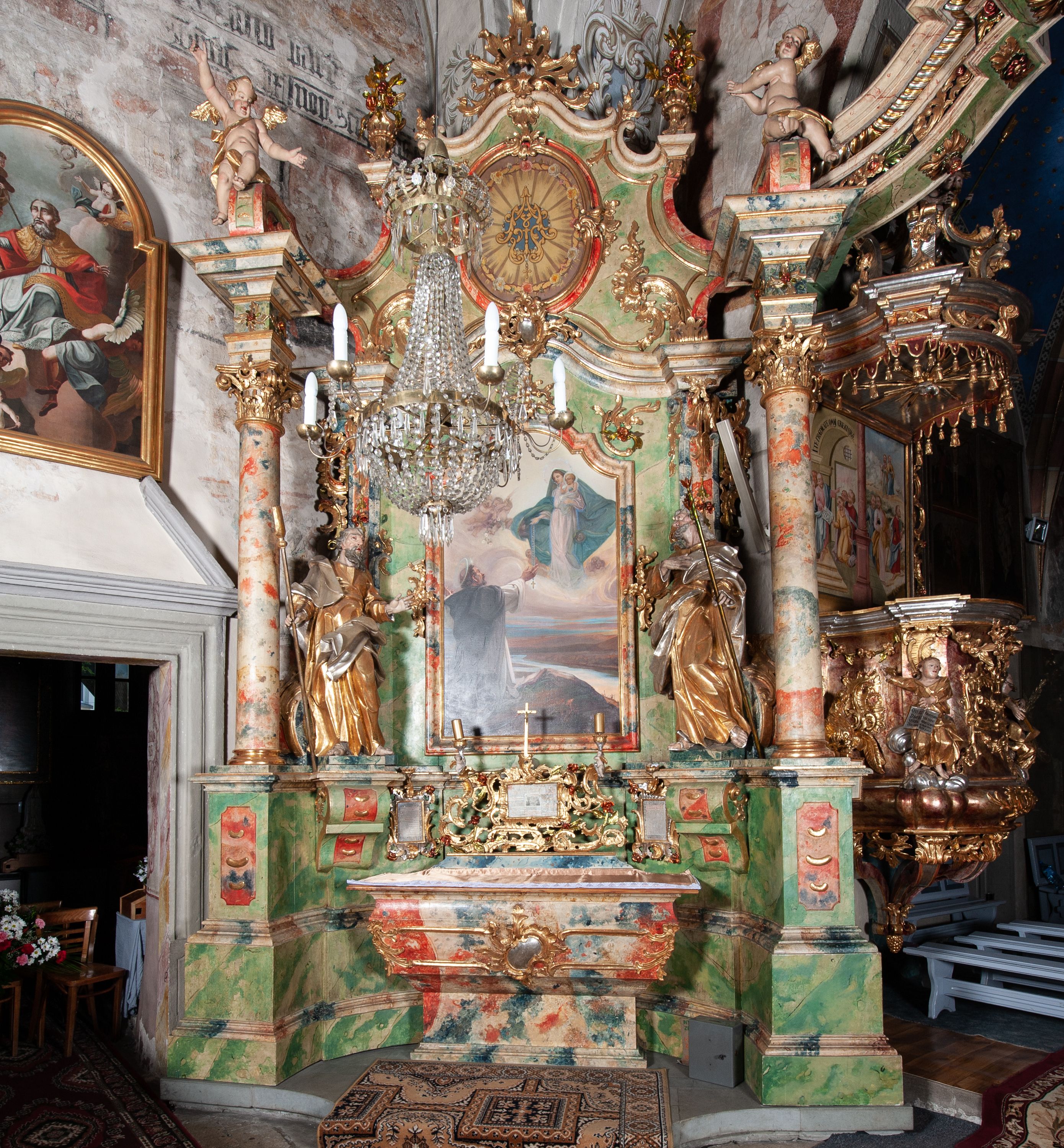 Obraz w kształcie stojącego prostokąta zwieńczonego łukiem wklęsło-wypukłym, z przedstawieniem Matki Boskiej wręczającej różaniec św. Dominikowi (Dominik Guzmán OP). Matka Boska, ukazana w całej postaci, stoi na obłokach w prawej części obrazu, ubrana w długą, białą suknię i obszerny niebieski płaszcz okrywający głowę i plecy. Lewą ręką podtrzymuje Dzieciątko Jezus, w prawej trzyma różaniec. Biodra i nóżki Dzieciątka otulone są białą szatą. W lewej rączce trzyma kulę ziemską, prawa uniesiona w geście błogosławieństwa. Wśród obłoków oraz przy płaszczu Marii ukazane aniołki. U dołu, po lewej stronie obrazu ukazany w trzech czwartych, tyłem do widza klęczący św. Dominik. Głowa lekko uniesiona do góry, wzrok skierowany w stronę Matki Boskiej, ręce rozłożone, uniesione do góry. Święty ubrany w habit dominikański i narzuconą na wierzch czarną kapę. Tło przestawienia stanowi rozległy, górzysty pejzaż z płynącą pośrodku rzeką. Kolorystyka delikatna, stonowana gama barwna. W prawym dolnym narożu sygnatura: Tary Lajos / 1912 Budapest.