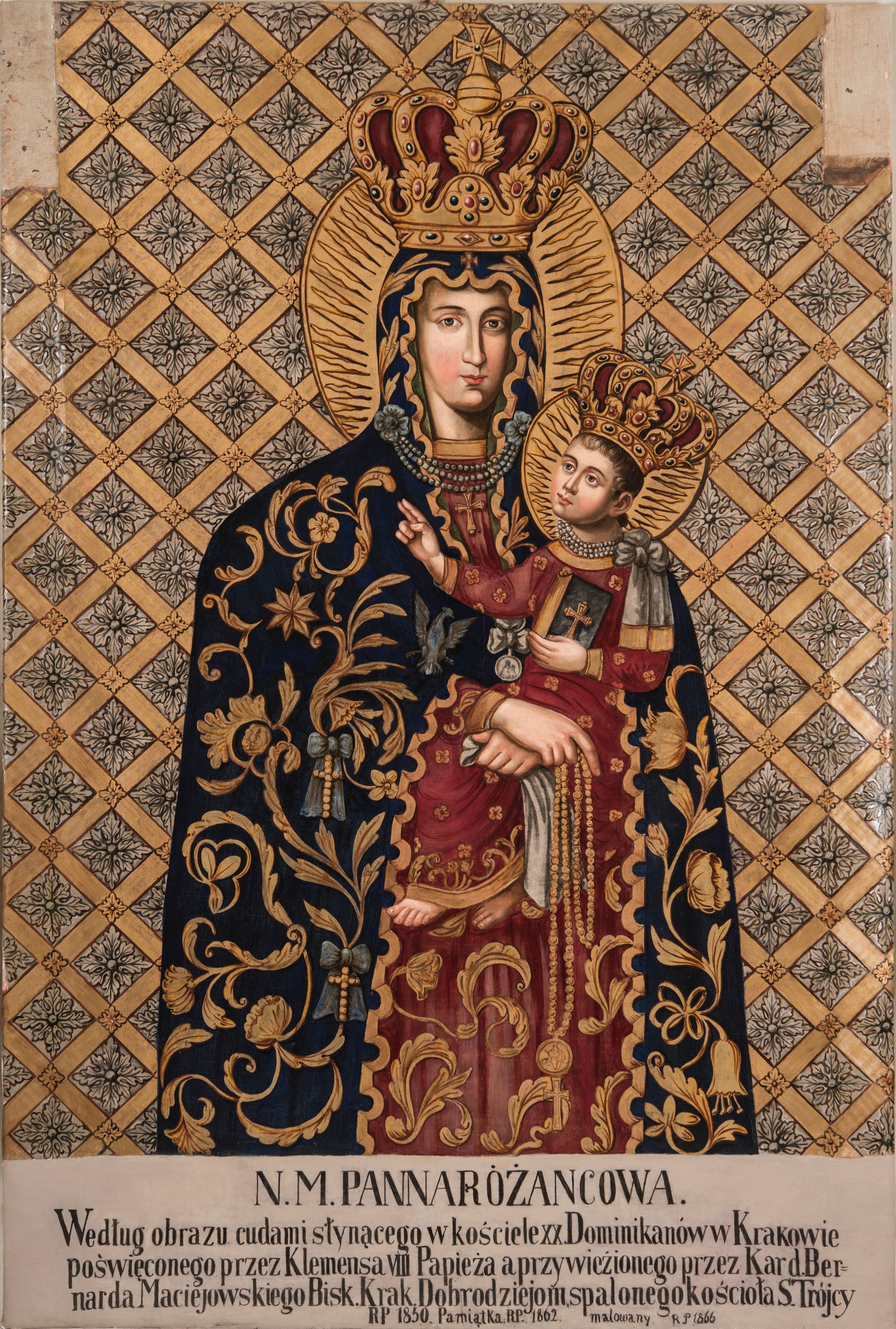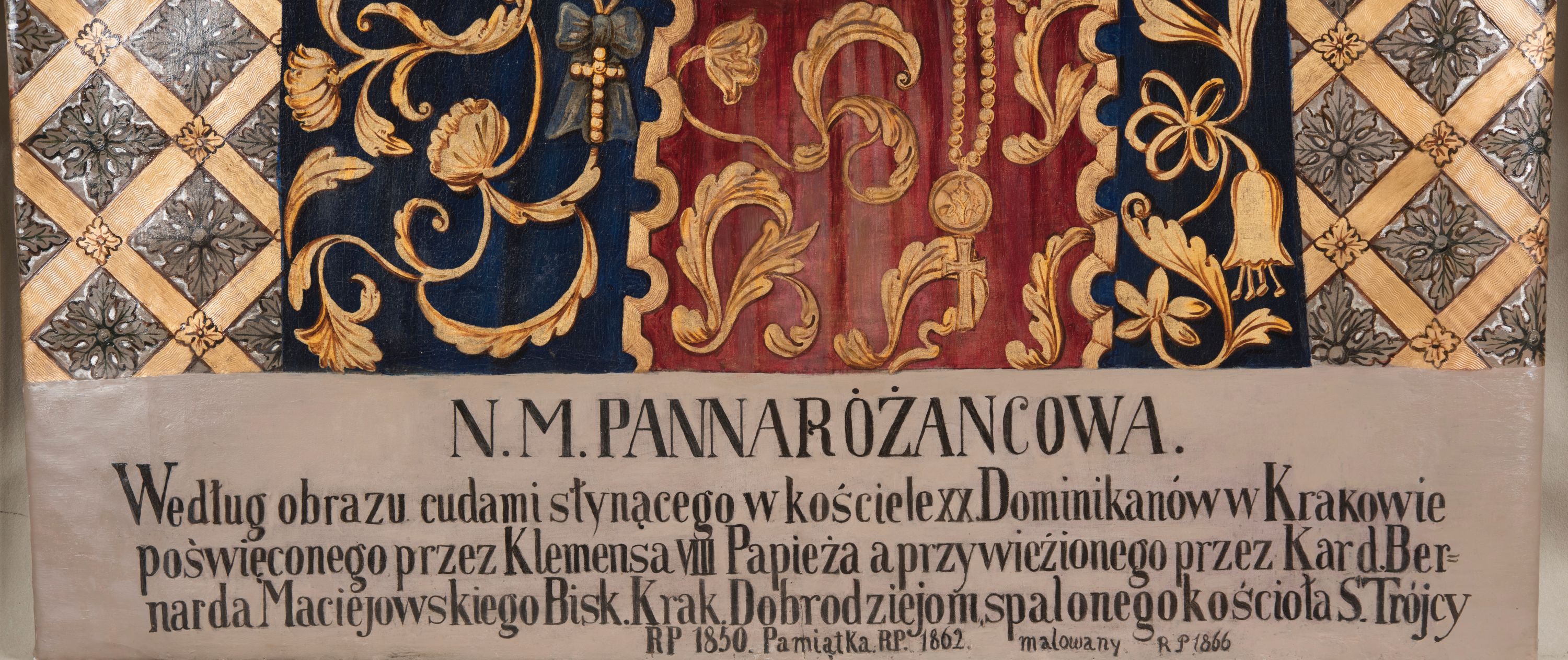 W dolnej części obrazu na białym tle umieszczono czarny napis: N(AJŚWIĘTSZA) M(ARIA) PANNA RÓŻAŃCOWA / Według obrazu cudami słynącego w kościele XX. Dominikanów w Krakowie / poświęconego przez Klemensa VIII Papieża a przywiezionego przez Kard(dynała) Ber / narda Maciejowskiego Bisk(upa) Krak(owskiego) Dobrodziejom spalonego kościoła S(więtej) Trójcy / R(oku) P(ańskiego) 1850. Pamiątka R(oku) P(ańskiego) 1862 malowany R(oku) P(ańskiego) 1866.