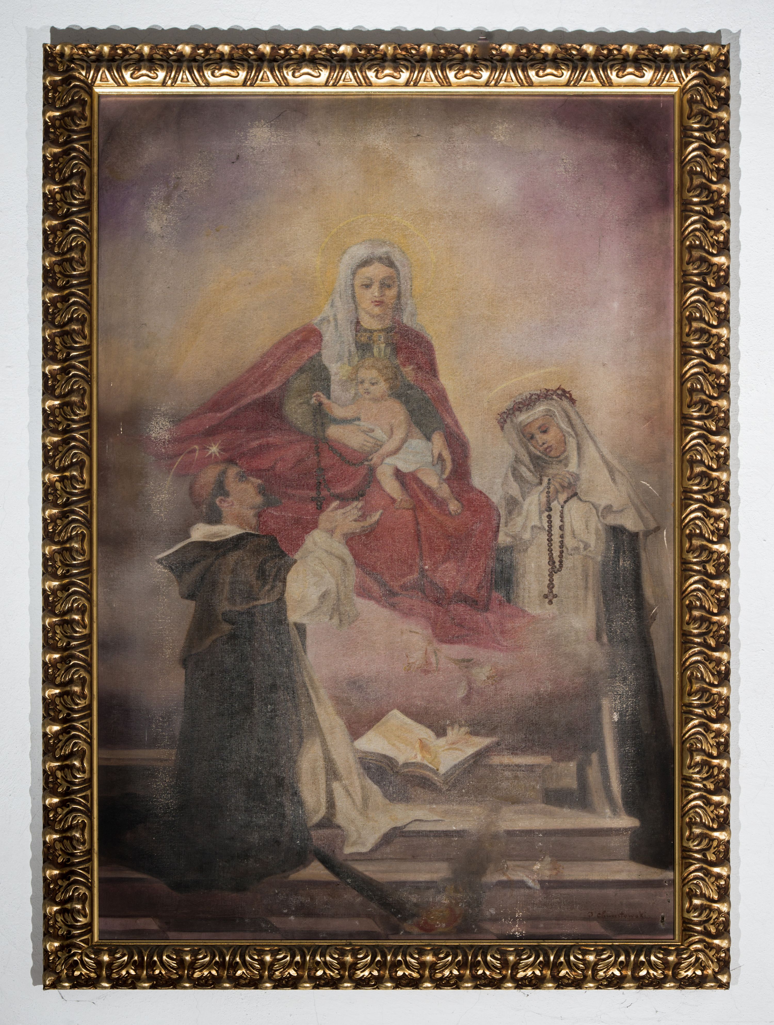 Obraz uzyskał kształt stojącego prostokąta, ujętego w złoconą, dekorowaną ornamentalne ramę. W centrum kompozycji ukazano Matkę Boską Różańcową przekazującą różaniec św. Dominikowi i św. Katarzynie Sieneńskiej. Siedząca na obłokach Madonna została ujęta frontalnie. Na kolanach obiema rękami podtrzymuje Dzieciątko. Maria ma owalną twarz o jasnej karnacji, wydatny nos i usta. Na głowie ma białą chustę, spod której widać fragment brązowych włosów. Ubrana jest w ciemnooliwkową suknię oraz narzucony na ramionach szkarłatny płaszcz okrywający jej kolana. Mały Jezus został ujęty w trzech czwartych w lewo. Obiema rękami przekazuje klęczącemu poniżej św. Dominikowi różaniec. Jezus ma pucułowatą twarz o jasnej karnacji, drobnym nosie i ustach. Jego głowę otaczają kręcone, jasne włosy i świetliste promienie. Nagie ciało okrywa tylko biała chusta przerzucona przez biodra. Z lewej strony kompozycji klęczy św. Dominik ukazany z profilu w prawo. Obie ręce ma uniesione w stronę Jezusa. Jest to dojrzały mężczyzna z tonsurą, ciemnymi, krótkim włosami i brodą. Jego twarz charakteryzuje prosty nos i wąskie usta. Nad głową ma nimb talerzowy z gwiazdą. Ubrany jest w biały habit dominikański i czarny zakonny płaszcz. Dominik klęczy na schodach, na których leży otwarta księga oraz zapalona pochodnia. Za schodami i częściowo obłokami, na których zasiada Maria stoi św. Katarzyna Sieneńska ujęta frontalnie z głową pochyloną w lewo. Ma modlitewnie splecione ręce na piersi przewiązane różańcem. Jej pociągłą twarz charakteryzuje jasna karnacja, wydatny nos i usta. Ubrana jest w habit dominikański z koroną cierniową na welonie. Nad głową ma nimb talerzowy.