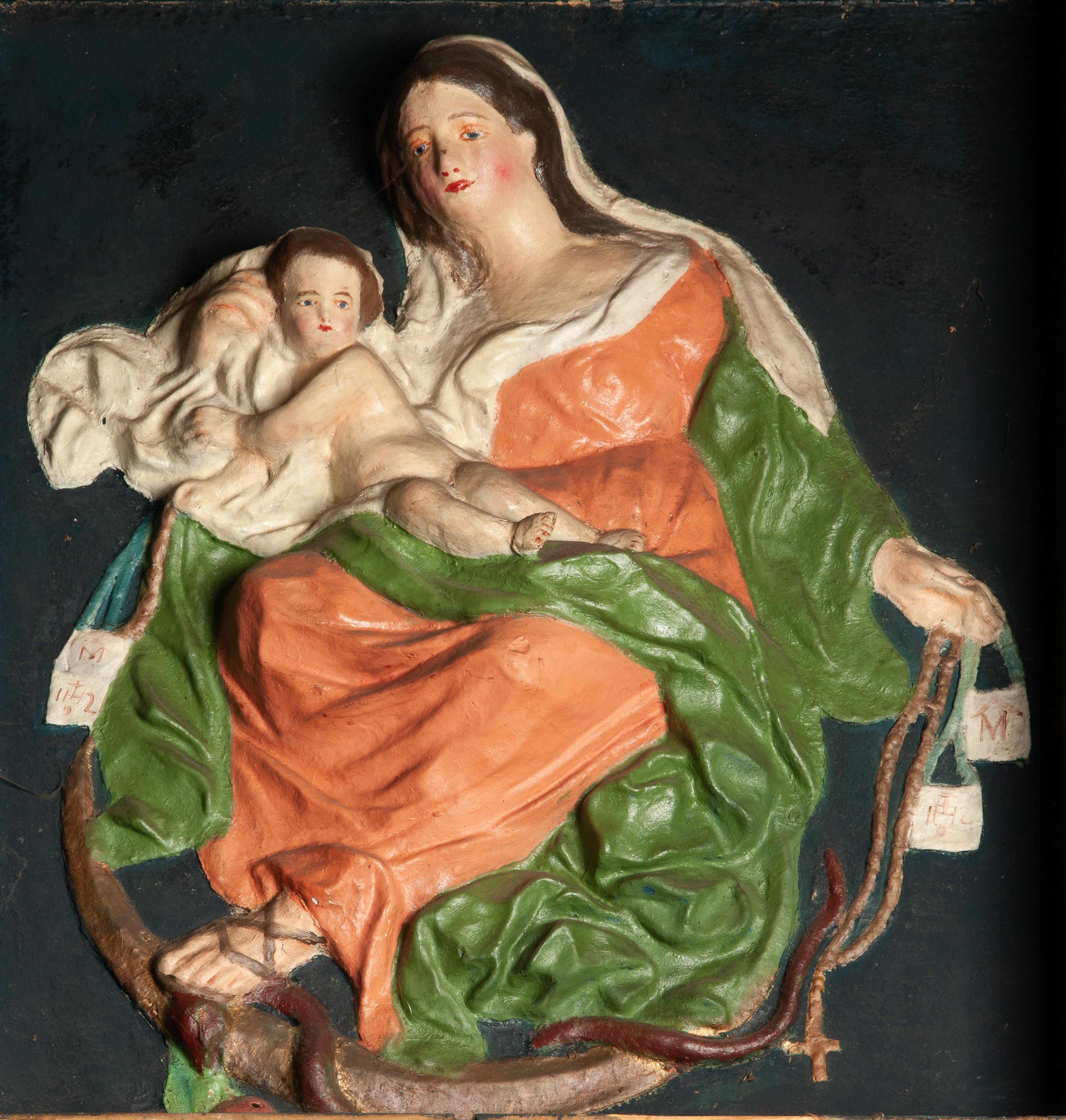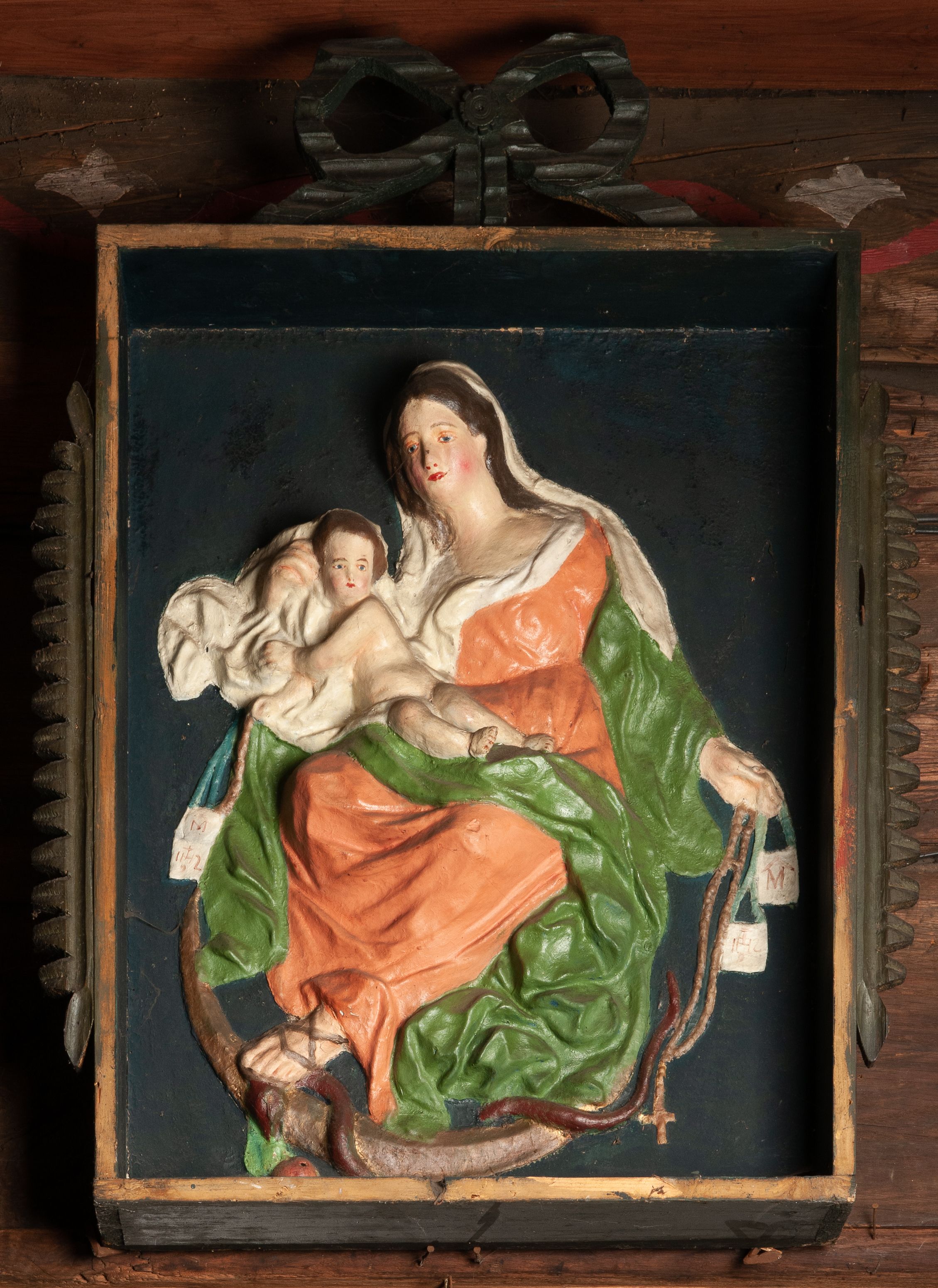 Płaskorzeźba Matki Boskiej z Dzieciątkiem na prostokątnym tle. Maria ukazana jako siedząca, zwrócona w trzech czwartych w prawo, lewą stopę opiera na półksiężycu, depcząc głowę węża.