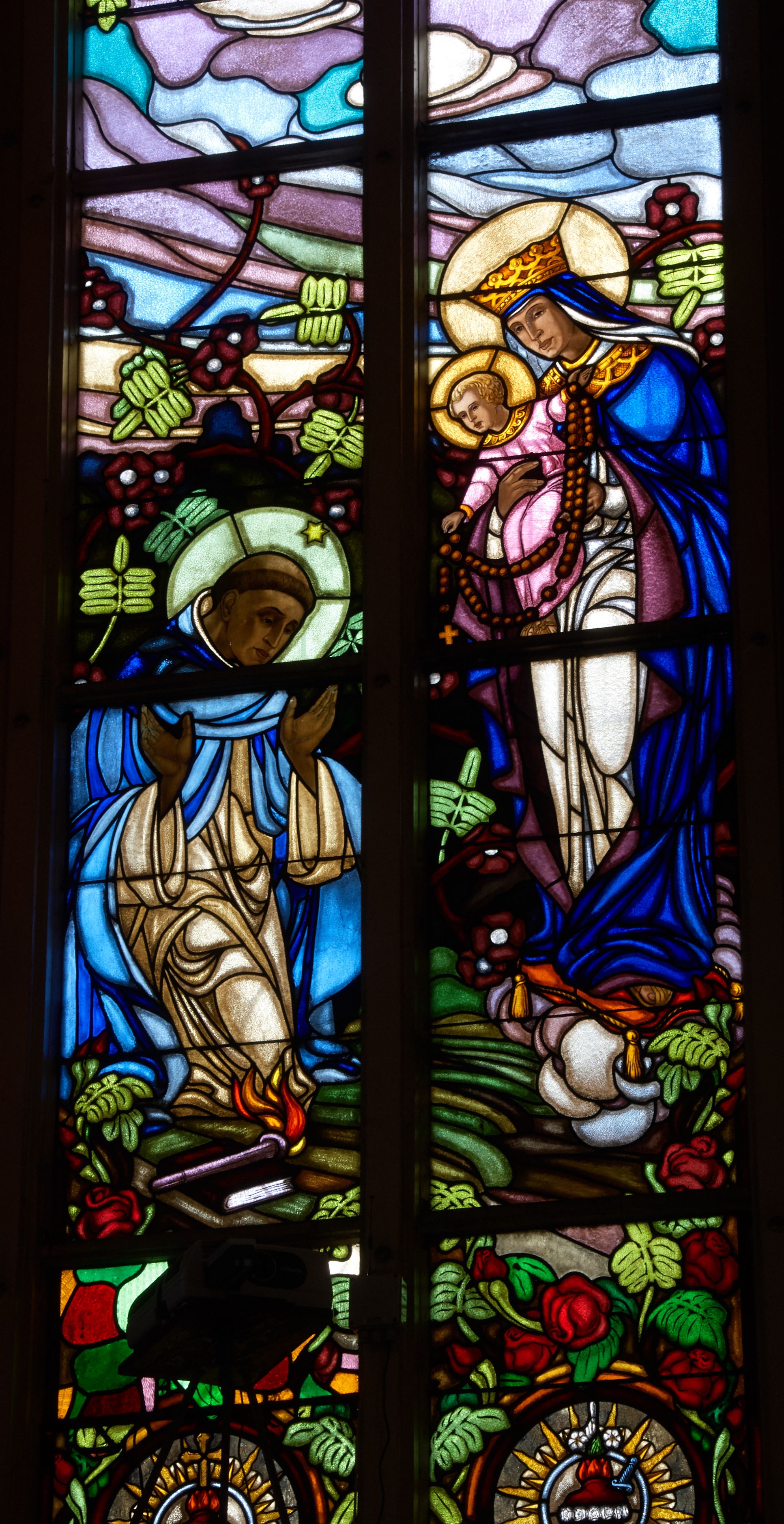 Witraż z przedstawieniem Matki Boskiej Różańcowej ze świętym Dominikiem, wykonany zapewne w latach trzydziestych XX wieku w Krakowie.