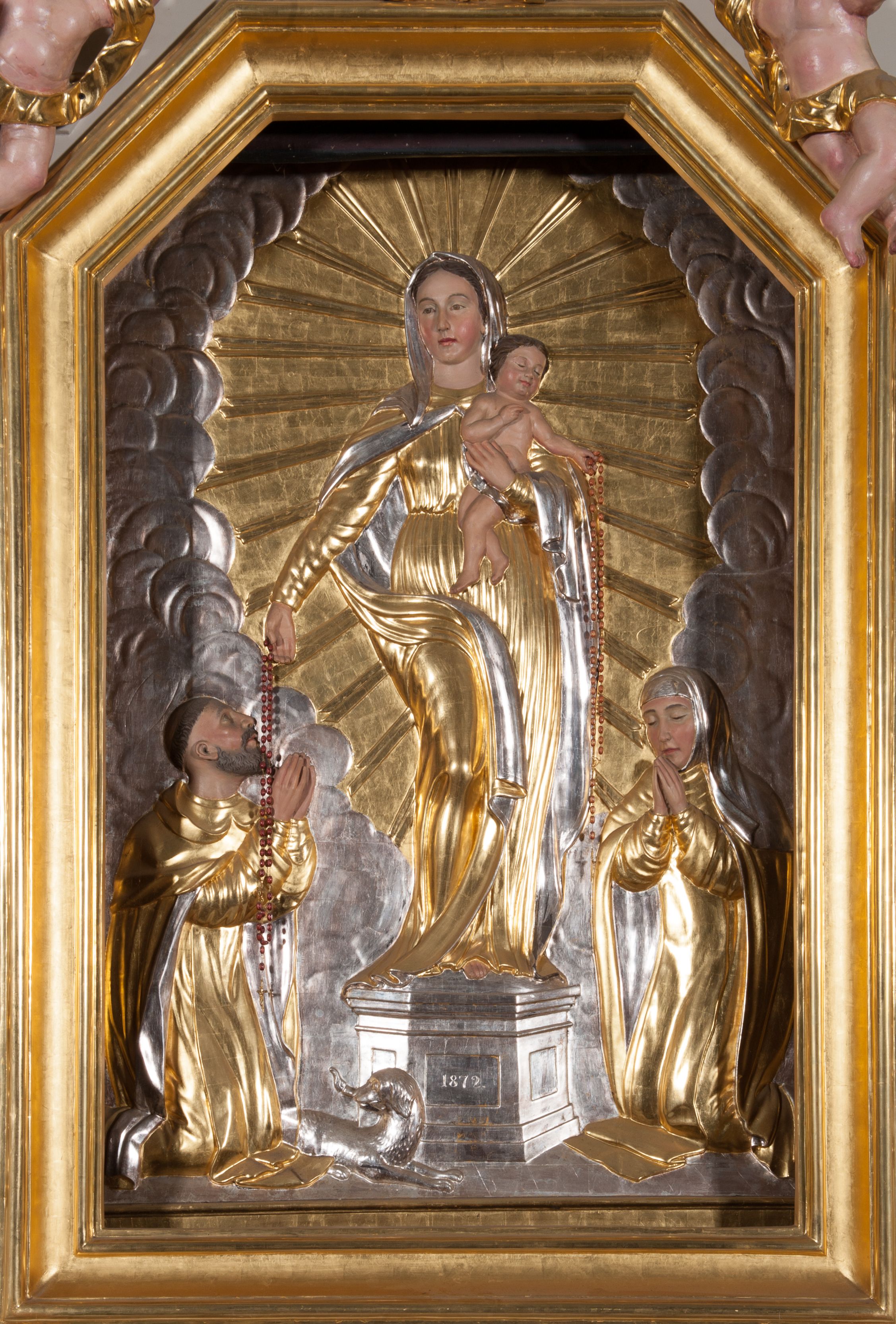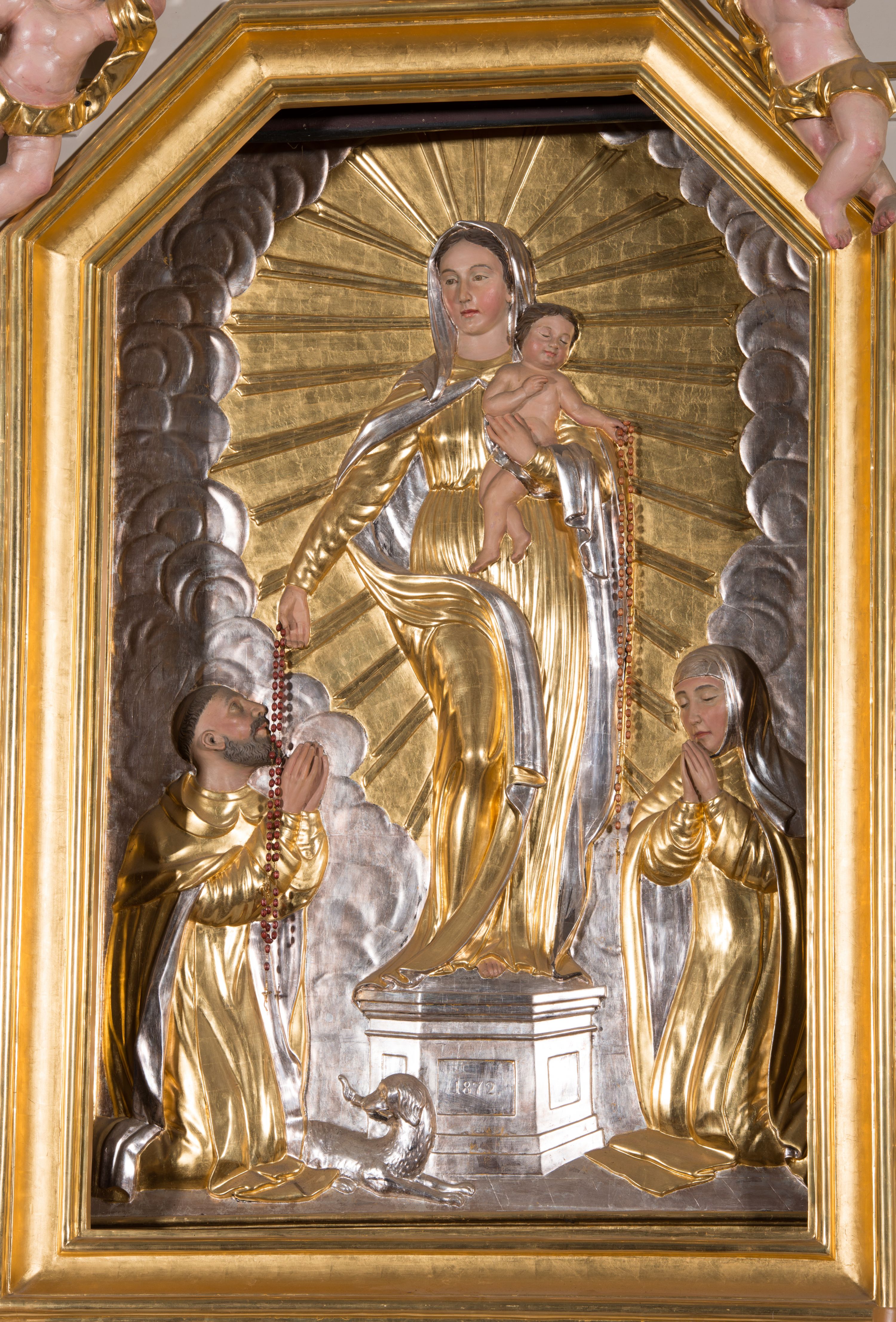 Płaskorzeźba w kształcie stojącego prostokąta o ściętych górnych narożach. W centrum kompozycji na wielobocznym cokole z rytą datą „1872” stoi Maria, ukazana frontalnie, w kontrapoście, lewą ręką podtrzymuje Dzieciątko, prawą wyciąga w bok, w dłoni trzyma różaniec. Twarz ma owalną, o łagodnych rysach, migdałowatych oczach, prostym nosie i pełnych ustach, okoloną brązowymi włosami ukrytymi pod welonem. Ubrana jest w przylegającą do ciała, obficie drapowaną suknię, przepasaną w talii, pod szyją ma zapięty płaszcz opadający na ramiona i prawą nogę, a na głowie welon. Dzieciątko w pozycji siedzącej, o esowato wygiętej sylwetce, zwrócone w lewo, prawą rękę ugina i unosi w geście błogosławieństwa, lewą wyciąga przed siebie, w dłoni trzyma różaniec. Twarz ma kwadratową, o pełnych policzkach, zamkniętych oczach, małym nosie i ustach, okoloną krótkimi, brązowymi włosami. Ciało ma pulchne, w partii bioder przewiązane pieluszką. W lewym dolnym rogu obrazu klęcząca postać św. Dominika, ukazana z prawego profilu, z uniesioną głową i rękami złożonymi w geście modlitwy. Twarz ma szczupłą, z oczami skierowanymi w górę, okoloną krótką brodą i włosami, na głowie ma tonsurę. Ubrany jest w habit ze szkaplerzem oraz płaszcz z kapturem. Przed nim, na ziemi leży pies z pochodnią w pysku. W prawym dolnym rogu klęcząca św. Katarzyna Sieneńska, zwrócona w trzech czwartych do środka kompozycji, z dłońmi złożonymi w geście modlitwy. Twarz ma pociągłą, o zamkniętych oczach, długim nosie i wąskich ustach. Wokół głowy ma podwikę, na niej welon. Ubrana jest w habit ze szkaplerzem, na ramiona ma narzucony płaszcz. Wokół Marii gloria promienista, tło przedstawienia wypełnione obłokami. Polichromia w partiach ciała naturalistyczna, stroje i tło złocone i srebrzone.
