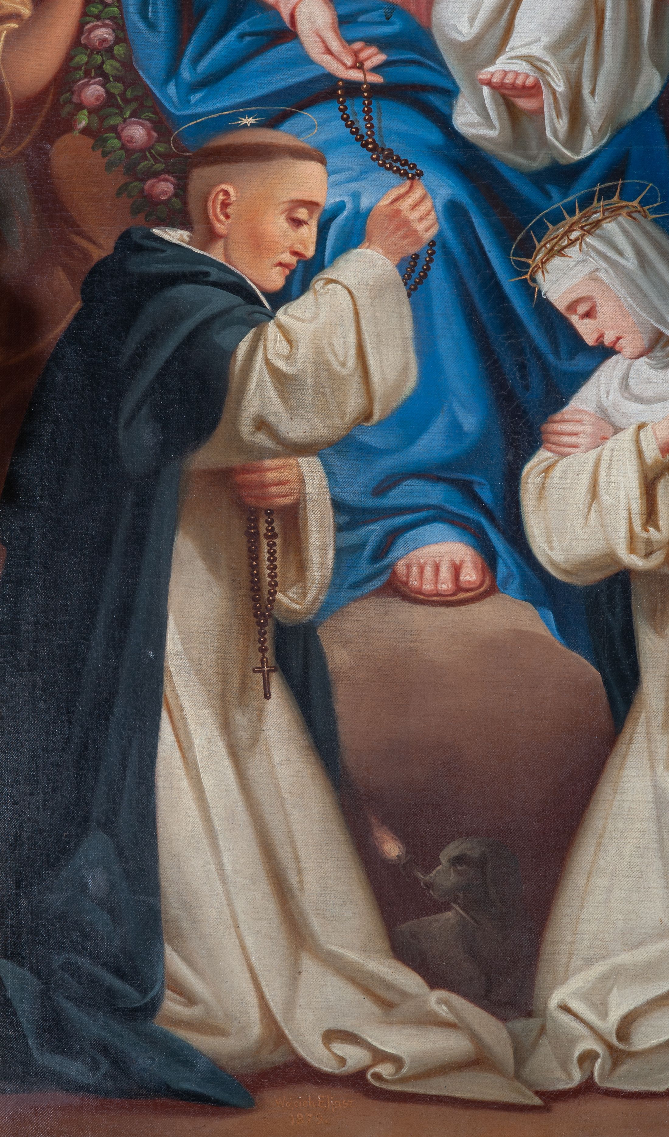 Proboszcz Józef Michalec (1871-1882) zlecił namalowanie obrazu Matki Boskiej Różańcowej do ołtarza bocznego. Dzieło wykonał malarz Wojciech Eljasz w 1873 roku. Przedstawienie Matki Boskiej z Dzieciątkiem ze św. Dominikiem i św. Katarzyną Sieneńską miało połączyć w jednym wizerunku najważniejszych reprezentantów męskiego i żeńskiego zakonu dominikańskiego. Miało na celu również ukazać razem założyciela zakonu i najbardziej czczoną świętą oraz złączyć św. Katarzynę z kultem różańca, silnie propagowanym dominikanów.