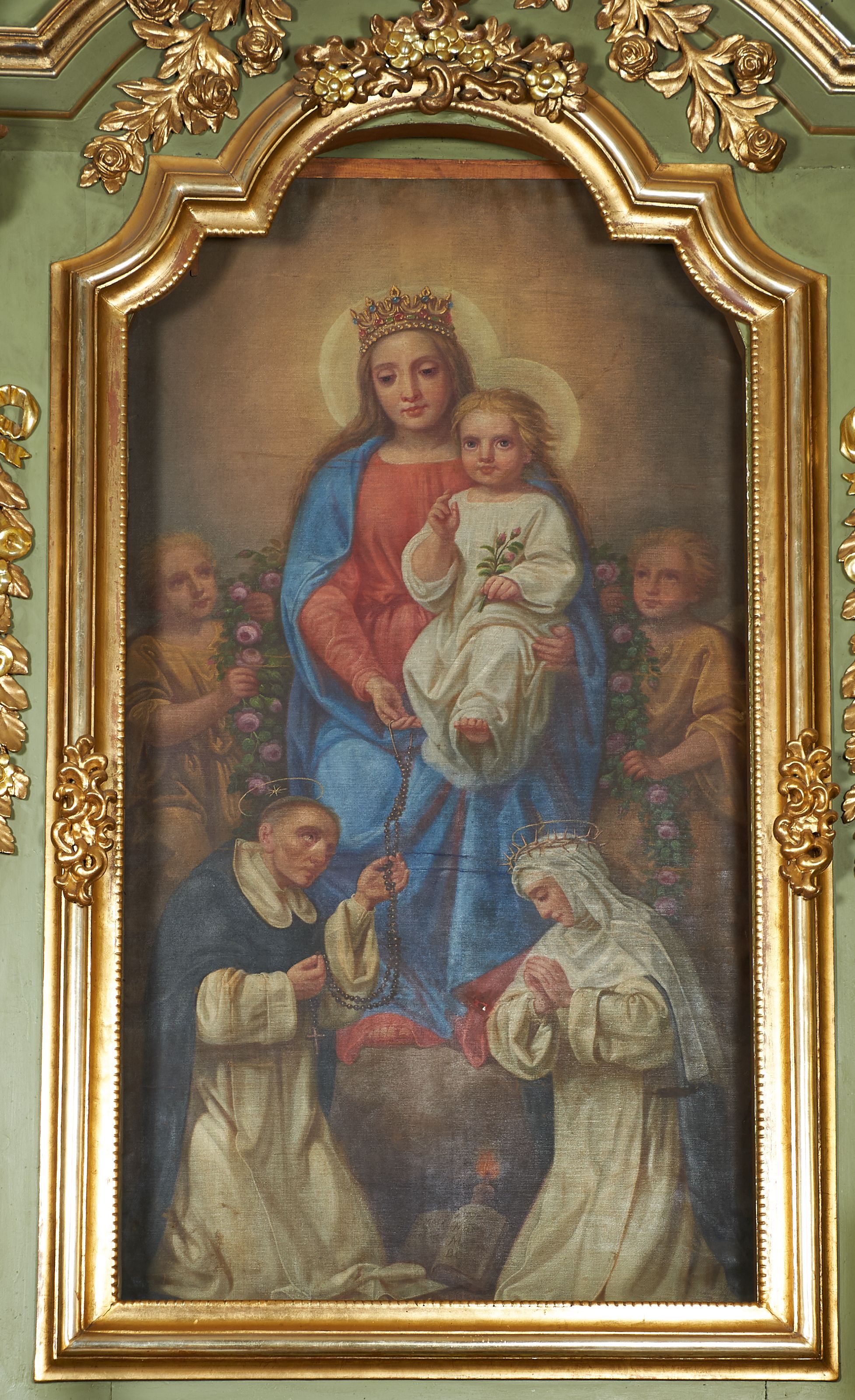 Obraz w formie stojącego prostokąta z przedstawieniem stojącej na skale Matki Boskiej z Dzieciątkiem i klęczącymi przed nimi św. Dominikiem oraz św. Katarzyną Sieneńską. Maria ukazana jest w całej postaci, zwrócona frontalnie, w kontrapoście, lewą ręką podtrzymuje Dzieciątko, prawą podaje różaniec św. Dominikowi. Maria ma owalną twarz, o półprzymkniętych, okrągłych oczach, długim nosie i pełnych ustach, okoloną długimi, jasnymi włosami opadającymi na ramiona. Na głowie ma koronę otwartą. Ubrana jest w czerwoną suknię, przepasaną w talii oraz niebieski płaszcz zarzucony na ramiona i nogi. Dzieciątko w pozycji siedzącej, z lewą nogą wysuniętą do przodu, w lewej ręce trzyma gałązkę róży, prawą błogosławi. Twarz ma kwadratową, oczy okrągłe, nos mały, usta pełne oraz krótkie, jasne włosy. Ubrane jest w białą, długą i obszerną tunikę. Wokół głów obu postaci nimby. Postać Marii flankują dwa anioły w żółtych tunikach trzymające kwiatowe girlandy. Po prawej stronie Marii klęczy św. Dominik zwrócony w trzech czwartych w lewo, z pochyloną głową. Obiema ugiętymi rękami odbiera różaniec. Jego twarz jest szczupła, o dużych oczach skierowanych w górę, dużym, krótkim nosie i pełnych ustach, na głowie ma tonsurę, nad nią aureolę z gwiazdą. Ubrany jest w biały habit dominikański ze szkaplerzem oraz czarny płaszcz z kapturem. Po lewej stronie Marii klęcząca św. Katarzyna Sieneńska, zwrócona w trzech czwartych w prawo, z pochyloną głową oraz dłońmi złożonymi w geście modlitwy. Twarz ma pociągłą, z oczami skierowanymi w dół, małym nosie i pełnych ustach. Ubrana jest w biały habit dominikański ze szkaplerzem i białym welonem oraz w czarny płaszcz. Na głowie ma koronę cierniową, nad nią aureolę. Pomiędzy świętymi leży otwarta księga ze świecą. Scena ukazana na jasnobrązowym tle, rozświetlonym wokół Marii i Dzieciątka.