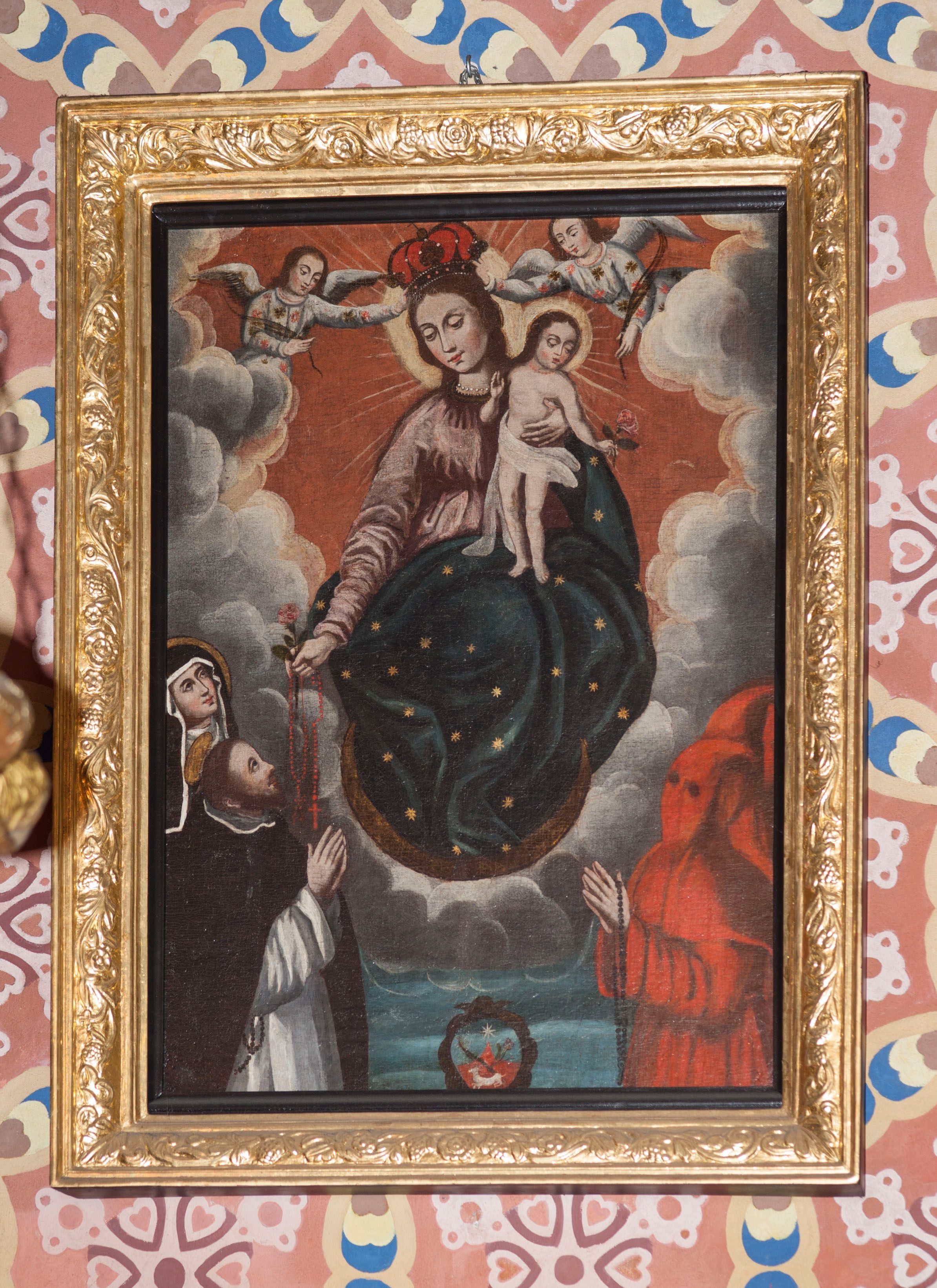Obraz w formie stojącego prostokąta. W centrum, na obłokach Matka Boska, ukazana w pozycji siedzącej, zwrócona w trzech czwartych w lewo, z głową pochyloną i skierowaną w prawo, nogi ma oparte na sierpie księżyca. Lewą ręką przytrzymuje stojące na jej kolanach Dzieciątko, prawą wyciąga w dół, podając różaniec, w dłoni trzyma różę. Twarz ma owalną o łagodnych, delikatnych rysach, migdałowatych oczach, prostym nosie i małych ustach, okoloną długimi brązowymi włosami, opadającymi wzdłuż ramion. Ubrana jest w jasnoróżową suknię z wysokim stanem oraz ciemnoniebieski płaszcz w gwiazdy zarzucony na lewe ramię i nogi. Na głowie ma zamkniętą koronę podtrzymywaną przez dwa nadlatujące anioły, w biały tunikach, o kwiecistym wzorze, trzymające liście palm. Dzieciątko w pozycji stojącej, z pochyloną głową, skierowaną w lewo. Prawą rękę unosi w geście błogosławieństwa, lewą wyciąga w dół, trzymając różę. Twarz ma owalną, o łagodnych rysach, zbliżonych do Matki, okoloną brązowymi włosami sięgającymi ramion. Ciało ma szczupłe, w partii bioder przewiązane białą tkaniną, wokół szyi czerwone korale. Wokół głowy obu postaci nimby i gloria promienista. Maria ujęta jest obłokami, na tle rozświetlonego czerwono-żółtego nieba. W lewym dolnym rogu półpostacie św. Dominika i św. Katarzyny Sieneńskiej. Dominik ukazany jest z profilu, skierowany w lewo, z głową zwróconą do góry i rękami złożonymi w geście modlitwy. Twarz ma okoloną krótką brodą i włosami. Nad głową aureola. Ubrany jest w biały habit i czarny płaszcz. Za nim św. Katarzyna, z głową skierowaną w górę. Twarz ma owalną, o łagodnych rysach. Wokół niej ma białą podwikę, na głowie czarny welon. Wokół głowy nimb. W prawym dolnym rogu obrazu trzej członkowie bractwa, pierwszy ukazany z profilu, z rękami złożonymi w geście modlitwy, na których ma zawieszony różaniec. Ubrani są w czerwone tuniki z kapturami na głowach. U dołu przedstawienia godło zakonu dominikanów w fantazyjnym kartuszu, na niebieskim tle.