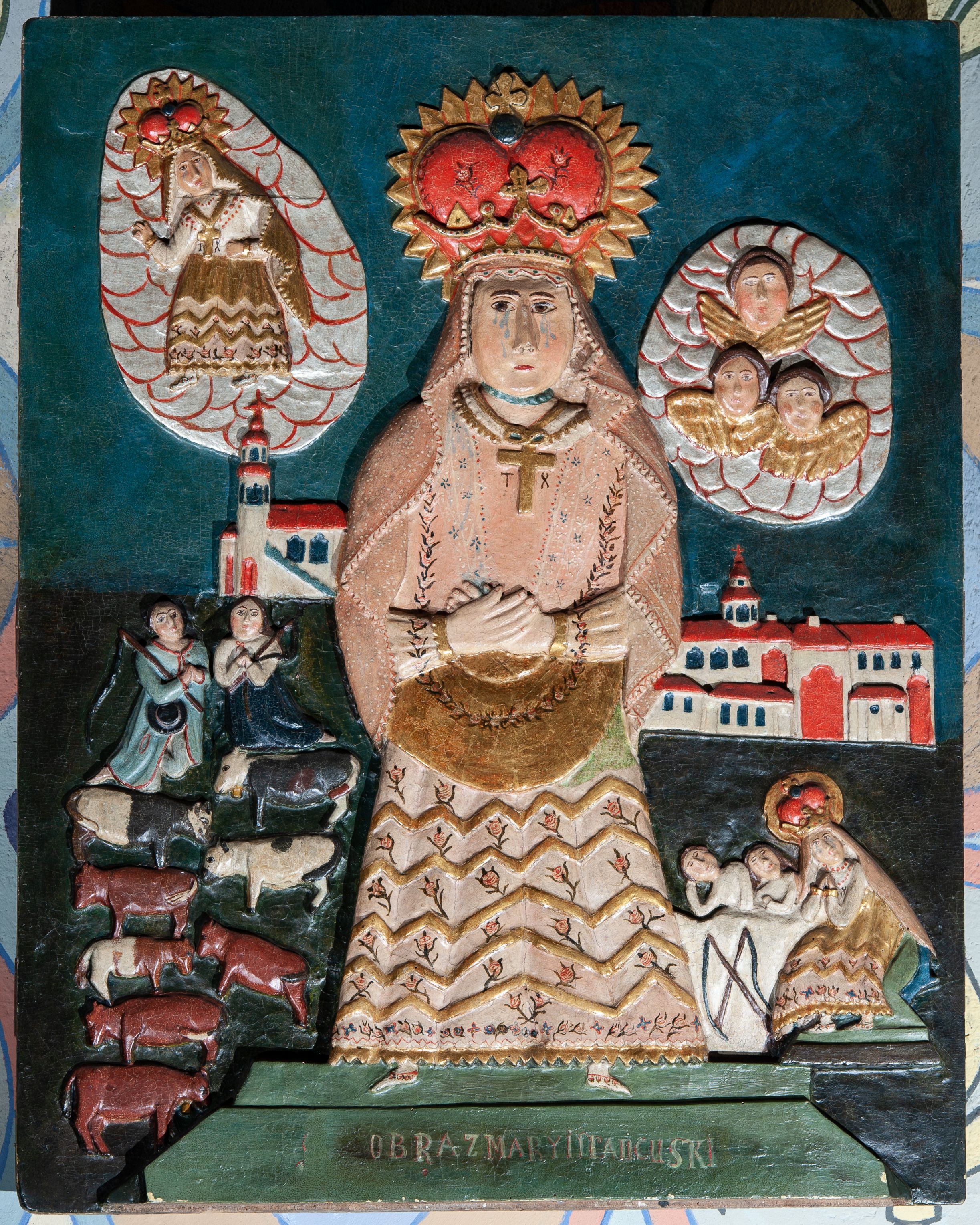 Płaskorzeźbiony polichromowany i złocony obraz z przedstawieniem Matki Boskiej Saletyńskiej oraz scen objawienia maryjnego 19 września 1846 roku w La Salette. Obraz twórcy ludowego z przełomu XIX i XX wieku.