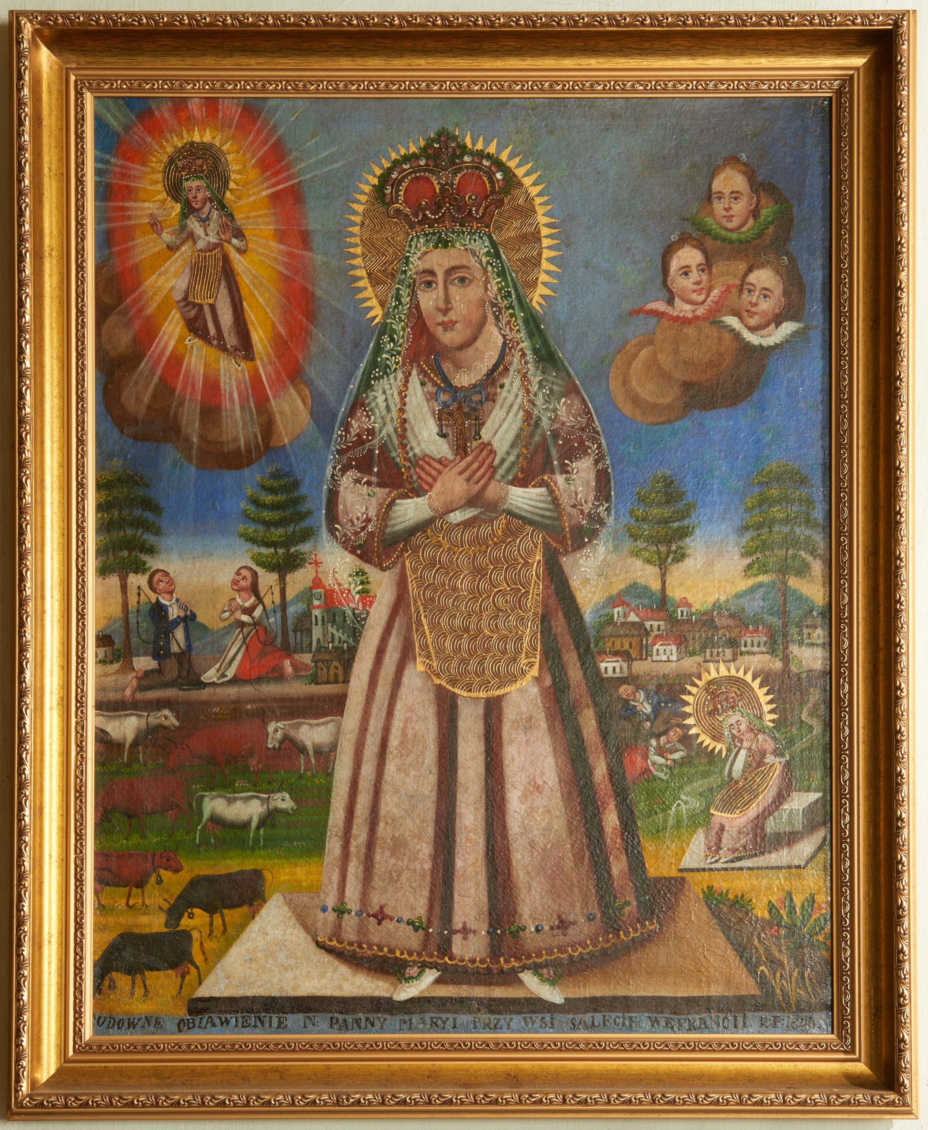 Obraz w kształcie stojącego prostokąta z przedstawieniem Matki Boskiej z La Salette. Kompozycja wieloplanowa, wielopostaciowa. Centrum obrazu zajmuje całopostaciowe przedstawienie Matki Boskiej ukazanej frontalnie ze skrzyżowanymi na piersi rękami, stojącej na kamiennym, szerokim postumencie. Maria ubrana jest w białą suknię spodnią z długimi rękawami; długą, jasnoróżową suknię wierzchnią; złoty fartuszek zdobiony motywem rybiej łuski; białą chustę na piersiach; welon ozdobiony wzorem roślinnym i białe trzewiki. Na głowie ma założoną koronę w typie zamkniętym, a na szyi krucyfiks zawieszony na błękitnej wstążce oraz sznur sięgających do pasa korali; wokół głowy ma złoty i kolisty nimb z promieniami w kształcie ząbków. Draperia sukni sztywna, fałdy proste i pionowe. Twarz owalna, długi i wąski nos, duże oczy i małe usta. W głębi, po lewej stronie obrazu znajduje się scena objawienia Matki Boskiej dwójce pastuszków. Matka Boska ukazana w owalnej, żółto-czerwonej glorii umieszczonej na szarym obłoku, poniżej dwójka klęczących pastuszków ze złożonymi w geście modlitwy rękami i z głowami skierowanymi w stronę Matki Boskiej. Przed nimi ukazano pasące się bydło. Po prawej stronie obrazu scena zaśnięcia pastuszków i siedząca na kamiennym postumencie Matka Boska z głową podpartą rękami. W górnej partii obrazu, po prawej stronie trzy uskrzydlone główki aniołków w obłokach. W tle widoczna miejscowość La Salette, pojedyncze drzewa i góry oraz błękitne niebo. U dołu obrazu napis na błękitnym tle: „CUDOWNE OBJAWIENIE N. PANNY MARYI PRZY WSI SALECIE WE FRANCJI R:P: 1846.” Rama drewniana, profilowana w kolorze złotym, na obrzeżach z dwoma wąskimi pasami ornamentu roślinnego.