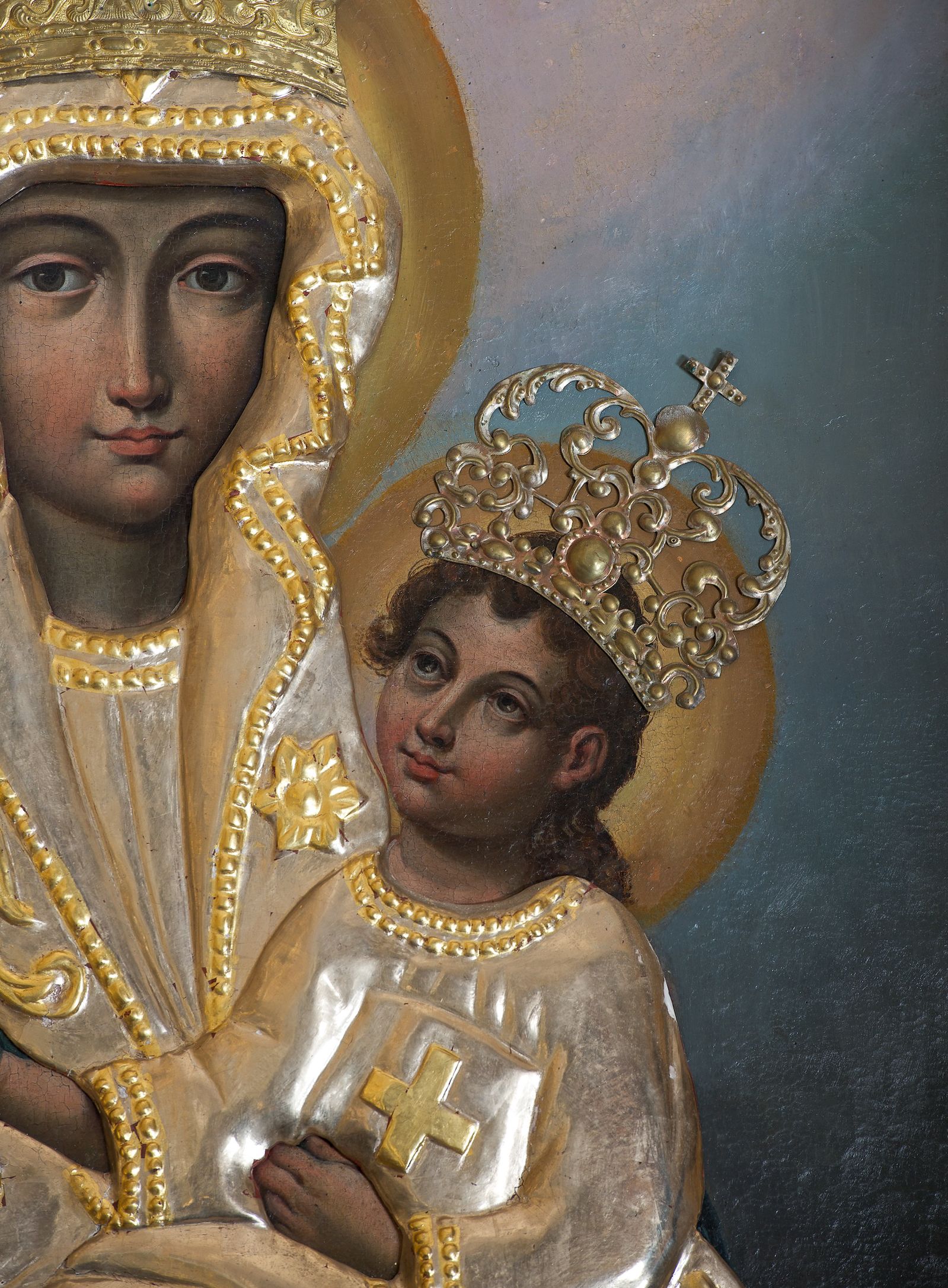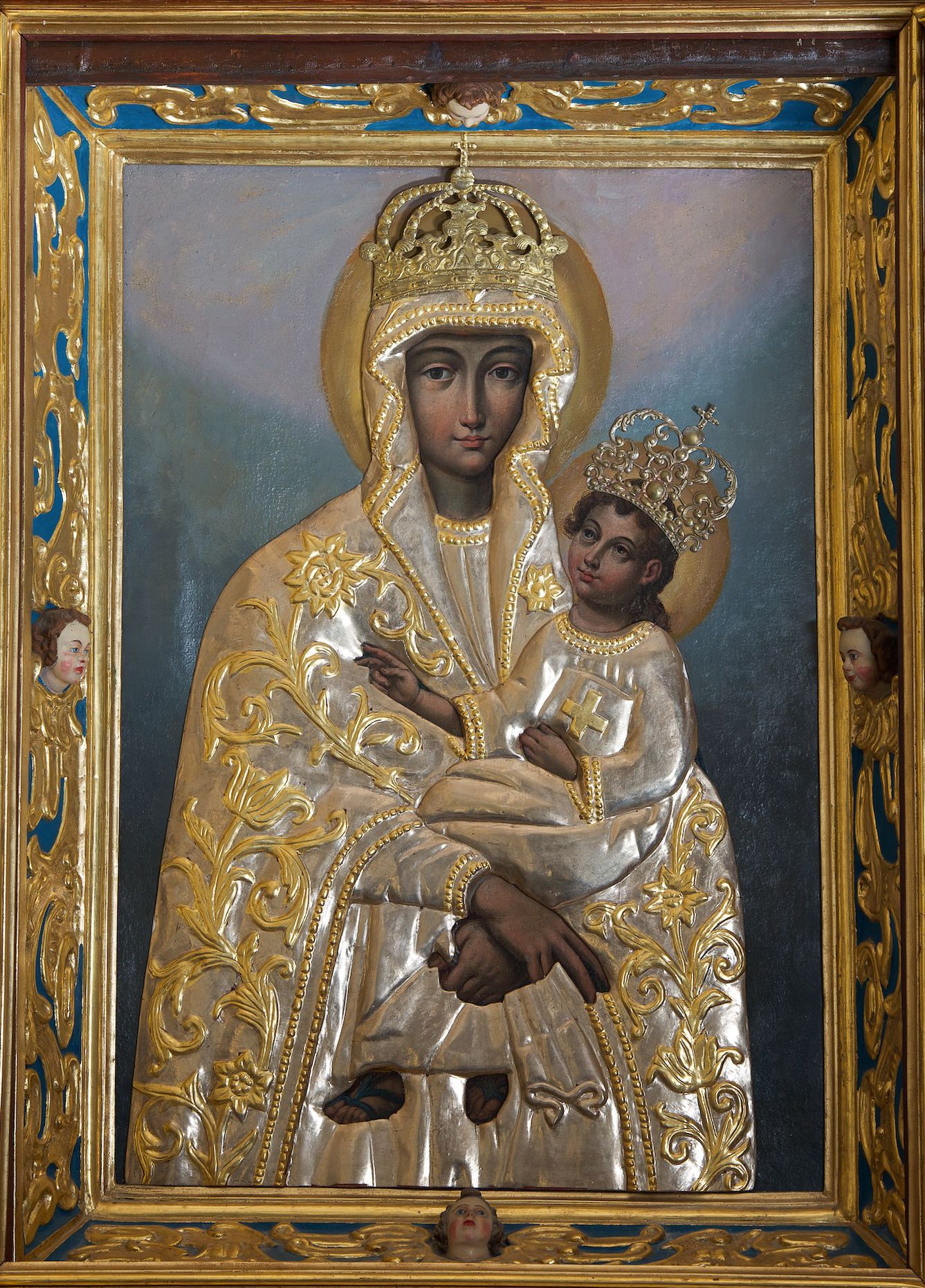 Obraz w kształcie stojącego prostokąta z wizerunkiem Matki Boskiej Śnieżnej. Maria przedstawiona frontalnie, w półpostaci, z Dzieciątkiem Jezus na lewym ręku, ze skrzyżowanymi dłońmi. Twarz podłużna, z długim i wąskim nosem, drobnymi ustami, dużymi oczami obwiedzionymi regularnymi łukami brwiowymi, ze wzrokiem skierowanym wprost na widza. Dzieciątko zwrócone trzy czwarte w prawo, w pozycji siedzącej, z książką ze znakiem krzyża na obwolucie w lewej dłoni, prawą czyniące gest błogosławieństwa, na stopach ma namalowane rzymskie sandałki. Twarz okrągła o wyrazistych rysach, duże i brązowe oczy, zarumienione policzki, włosy kręcone, średniej długości opadające na plecy, wzrok skierowany na Matkę. Wokół głów Marii i Dzieciątka złote i koliste nimby. Tło w ciemnych odcieniach szarości i koloru niebieskiego, rozjaśnione w górnej części. Na postacie Marii i Dzieciątka nałożone metalowe: sukienki, korony w typie zamkniętym oraz chustka w dłoni Marii. Sukienki ozdobione wicią roślinną z kwiatami.