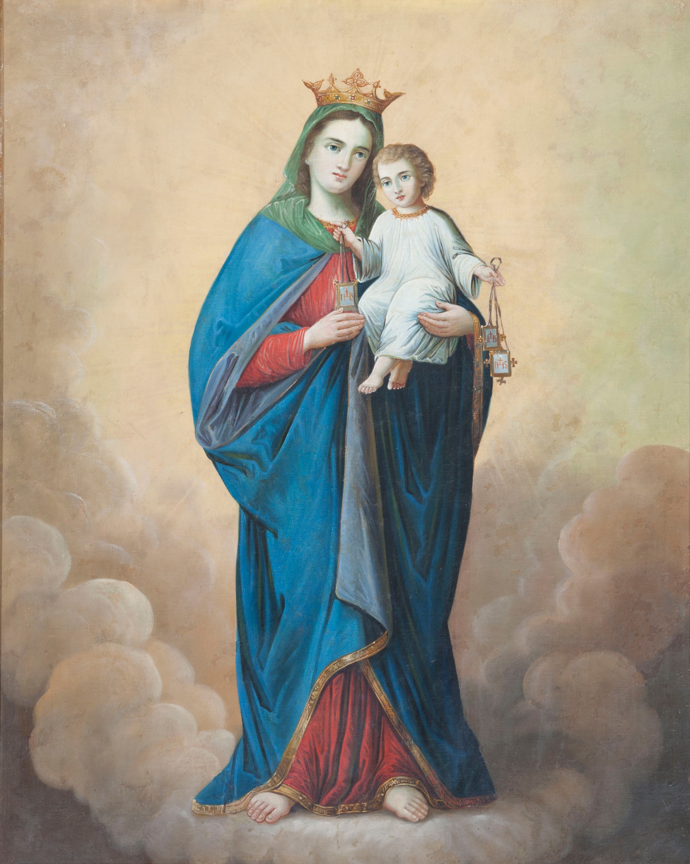Obraz w kształcie stojącego prostokąta. W centrum kompozycji ukazana Matka Boska w całej postaci, frontalnie, z górną połową ciała nieznacznie skręconą w lewo, stojąca na chmurach. Na lewej ręce trzyma siedzące Dzieciątko, prawą chwyta podawany przez nie szkaplerz. Maria głowę skłania na lewo i patrzy w dal. Ma owalną, delikatną twarz, duże, migdałowe szeroko otwarte oczy, wąski nos i wąskie usta oraz długie, ciemne, falowane włosy opadające na plecy. Na głowie ma otwartą koronę. Matka Boska jest ubrana w długą, czerwoną suknię z długimi rękawami oraz niebieski, podbity odcieniem szaroniebieskiego płaszcz zarzucony na plecy, spięty na dekolcie i przytrzymany na wysokości dłoni; na głowie ma zielony welon, stopy bose. Dzieciątko patrzy przed siebie, w obu uniesionych dłoniach trzyma szkaplerze, lewą nogę ma założoną na prawą. Ma owalną twarz o smutnym wyrazie, szeroko otwarte, niebieskie oczy, wąski nos i małe usta. Falowane, krótkie, jasne włosy okalają jego twarz. Jest ubrane w białą długą sukienkę lamowaną pod szyją złotem; stopy bose. Postacie zostały ukazane na tle bladoróżowych obłoków jaśniejących za ich plecami. Szaty zostały ujęte rysunkowo, łamiące się w drobne, równoległe fałdy, tło w sposób malarski.