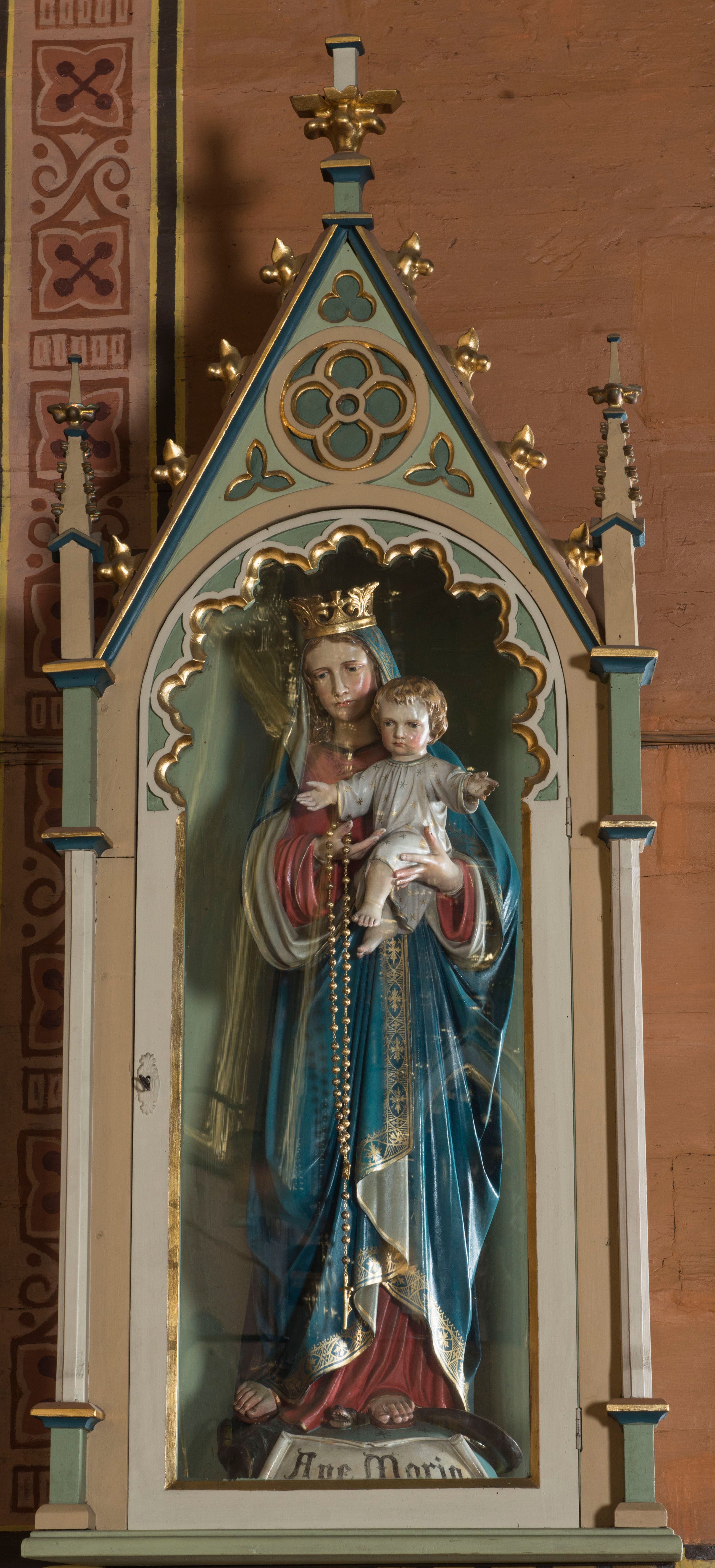 Pełnoplastyczna rzeźba przedstawia Matkę Boską z Dzieciątkiem w całej postaci stojącą na globie ziemskim oplecionym przez węża. Madonna z nieznacznie pochyloną głową w prawo została ujęta w kontrapoście, trzymając Dzieciątko na wysokości piersi lewą ręką, prawą zaś na nie wskazuje. Na prawej ręce ma zawieszony duży, złoty różaniec. Pociągłą twarz Matki Boskiej charakteryzują jasna karnacja z różowymi policzkami, długi, prosty nos, wąskie usta. Jej zamyślone spojrzenie skierowane jest ku dołowi. Twarz otaczają długie, jasnobrązowe włosy opadające na ramiona widoczne spod maforionu. Madonna ubrana jest w niebieski maforion podbity jasnozgniłą zielenią, lamowany złotą, ornamentalną taśmą dekorowaną stylizowanymi krzyżykami. Jego obie poły podciągnięte są na wysokość jej piersi. Spod maforionu widoczna jest czerwona tunika dekorowana przy dekolcie, rękawach i u spodu złotą tasiemką. Tunika odsłania fragmenty stóp w sandałach. Maria ma na głowie złoconą koronę o sterczynach utworzonych ze stylizowanych liści akantu. Dzieciątko zostało ukazane frontalnie z rozłożonymi rękami na wysokości piersi oraz z nieznacznie skrzyżowanymi, bosymi nóżkami. Mały Jezus ma owalną twarz o jasnej karnacji z wysokim czołem, rumiane, pucułowate policzki, szeroko otwarte oczy, wydatny nos i usta. Jego głowę otaczają jasnobrązowe, krótkie włosy. Jezus ubrany jest w jasnoszarą tunikę ze złotym wykończeniem, dekorowaną złotymi gwiazdkami. Pod stopami Marii widnieje do połowy ciemnoniebieski glob ze złotymi gwiazdkami opleciony przez węża, którego depcze lewą stopą Maria. Z przodu globu umieszczono krótką banderolę z łacińskim napisem ”Ave Maria”. Rzeźba znajduje się w przeszklonej witrynie w kształcie neogotyckiej kapliczki z wnęką. Kapliczka uzyskała kształt wydłużonego prostopadłościanu nakrytego dachem siodłowym. Od frontu zaopatrzono ją w półokrągłe, przeszklone drzwi w górnej części dekorowane wewnętrzną arkaturą. Boki flankują smukłe filarki wspierające się na wysokich cokolikach podtrzymujące smukłe imposty z pinaklami zdobionymi czołgankami i zwieńczonymi kwiatonami. Złocone czołganki i kwiaton wieńczący kapliczkę widoczny jest na trójkątnym przyczółku. Jego pole udekorowano płyciną ze złoconym czteroliściem wpisanym w koło otoczone przez trzy trójliście.