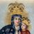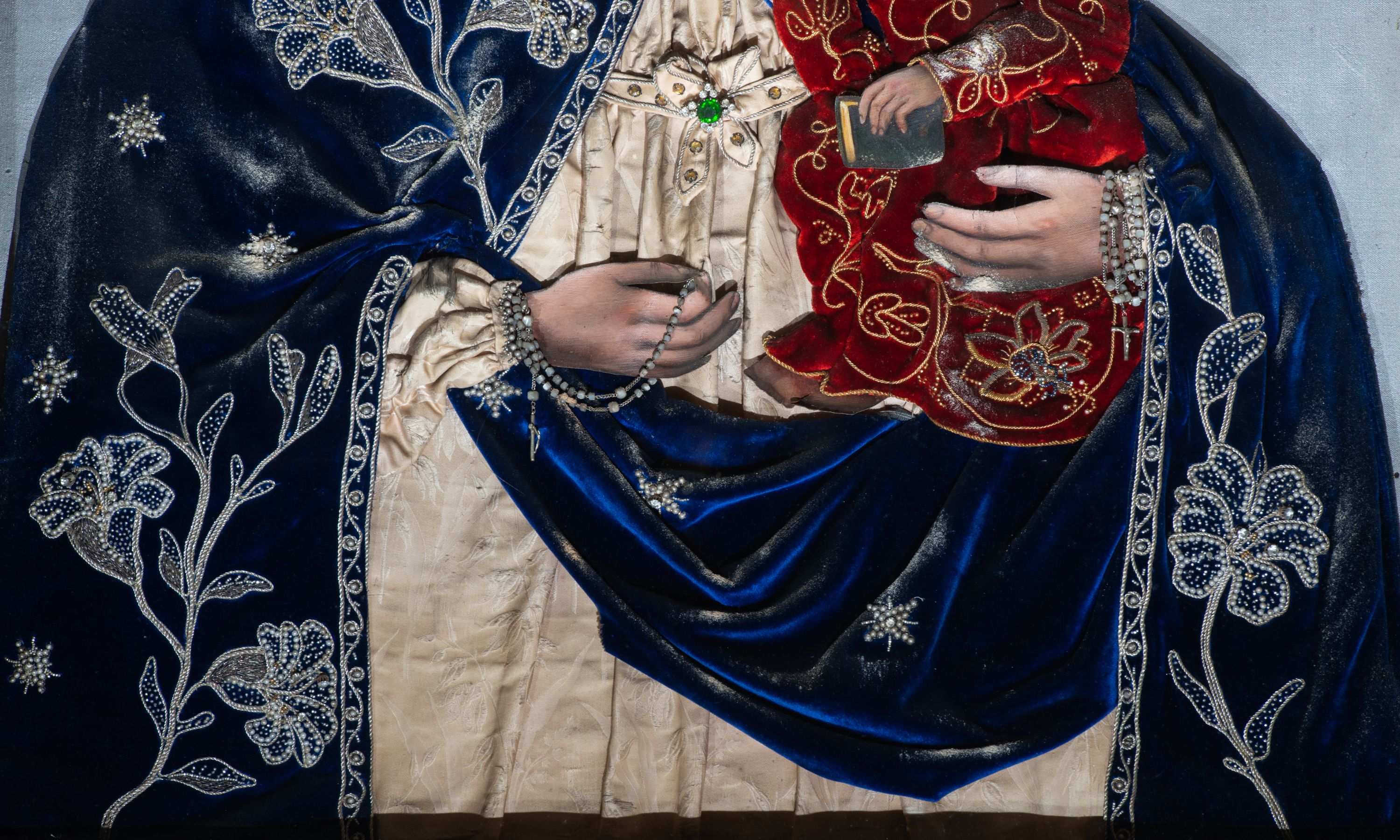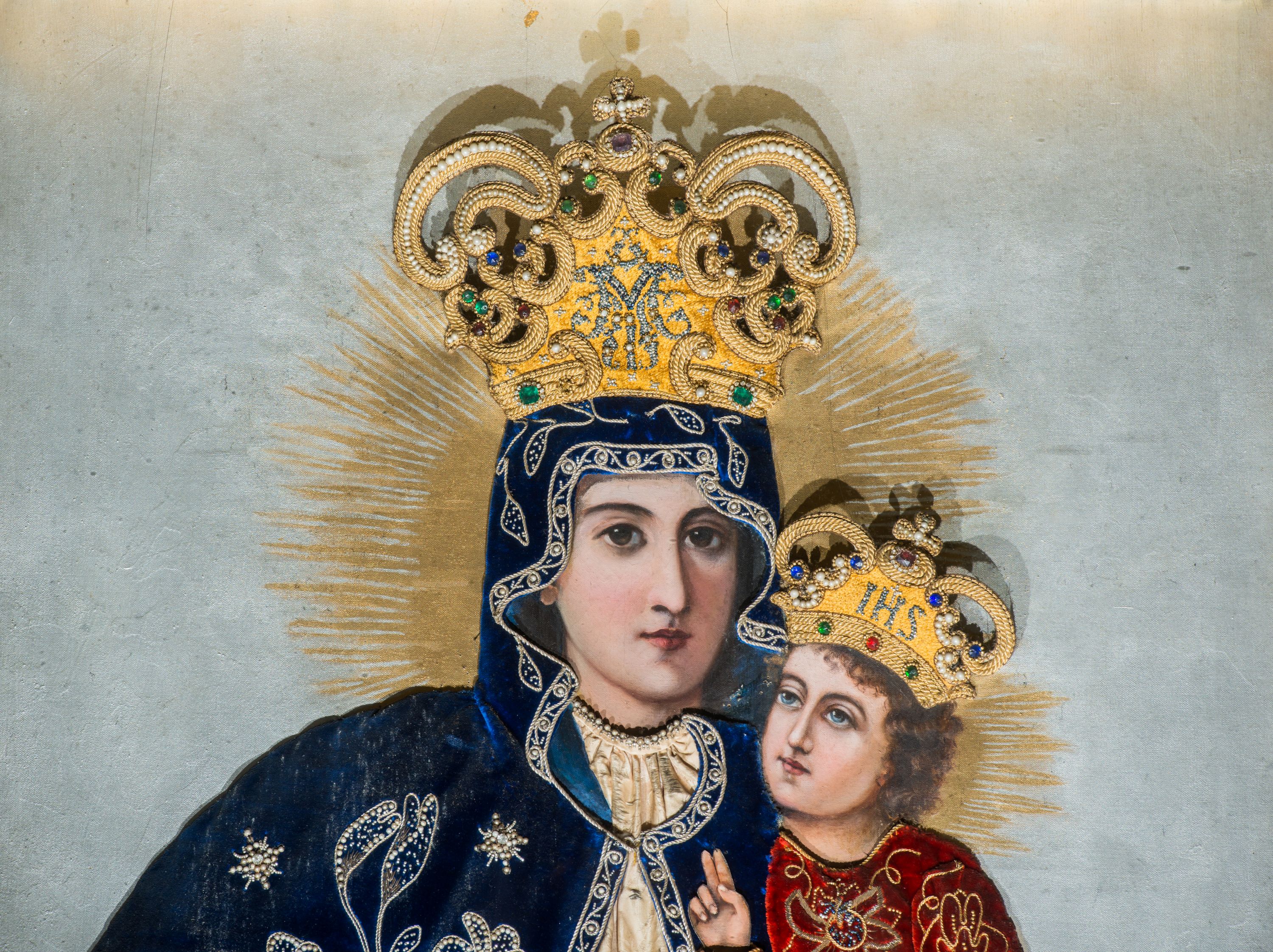 Obraz w kształcie stojącego prostokąta z przedstawieniem Matki Boskiej z Dzieciątkiem. Twarze, dłonie i tło są malowane, szaty i korony, wykonane z dekorowanego haftem i kamieniami materiału, zostały nałożone na obraz. Maria spogląda na widza, na lewej ręce trzyma Dzieciątko, w prawej ma różaniec, jej głowa jest nieproporcjonalnie mała w stosunku do okrytego szatami ciała. Ma owalną, delikatną twarz o szeroko otwartych ciemnych oczach, wąskim, długim nosie i małych ustach. Jest ubrana w kremową suknię marszczoną pod szyją i na rękawach, związaną na dekolcie tasiemką na kokardkę ozdobioną zielonym kamieniem. Na suknię ma nałożony granatowy, zarzucony na głowę płaszcz lamowany ornamentem z wici utworzonej ze sznurka i koralików, z których wykonano również dekorujące poły kwiaty i gwiazdki. Dzieciątko siedzi na jej ręce, patrzy przed siebie, prawą ręką czyni gest błogosławieństwa, w lewej trzyma książeczkę. Ma podłużną twarz, duże oczy, wąski nos i małe usta. Okalają ją ciemne loki. Jezus jest ubrany w czerwoną suknię z wykonaną ze sznurka i koralików dekoracją kwiatową. Obie postaci mają na głowach korony zamknięte skomponowane z nakładanych sznurków, korali i kamieni, w centrum korony Marii jej monogram, w centrum korony Chrystusa „IHS”. Za głowami malowane nimby promieniste, tło jednolite – szare.