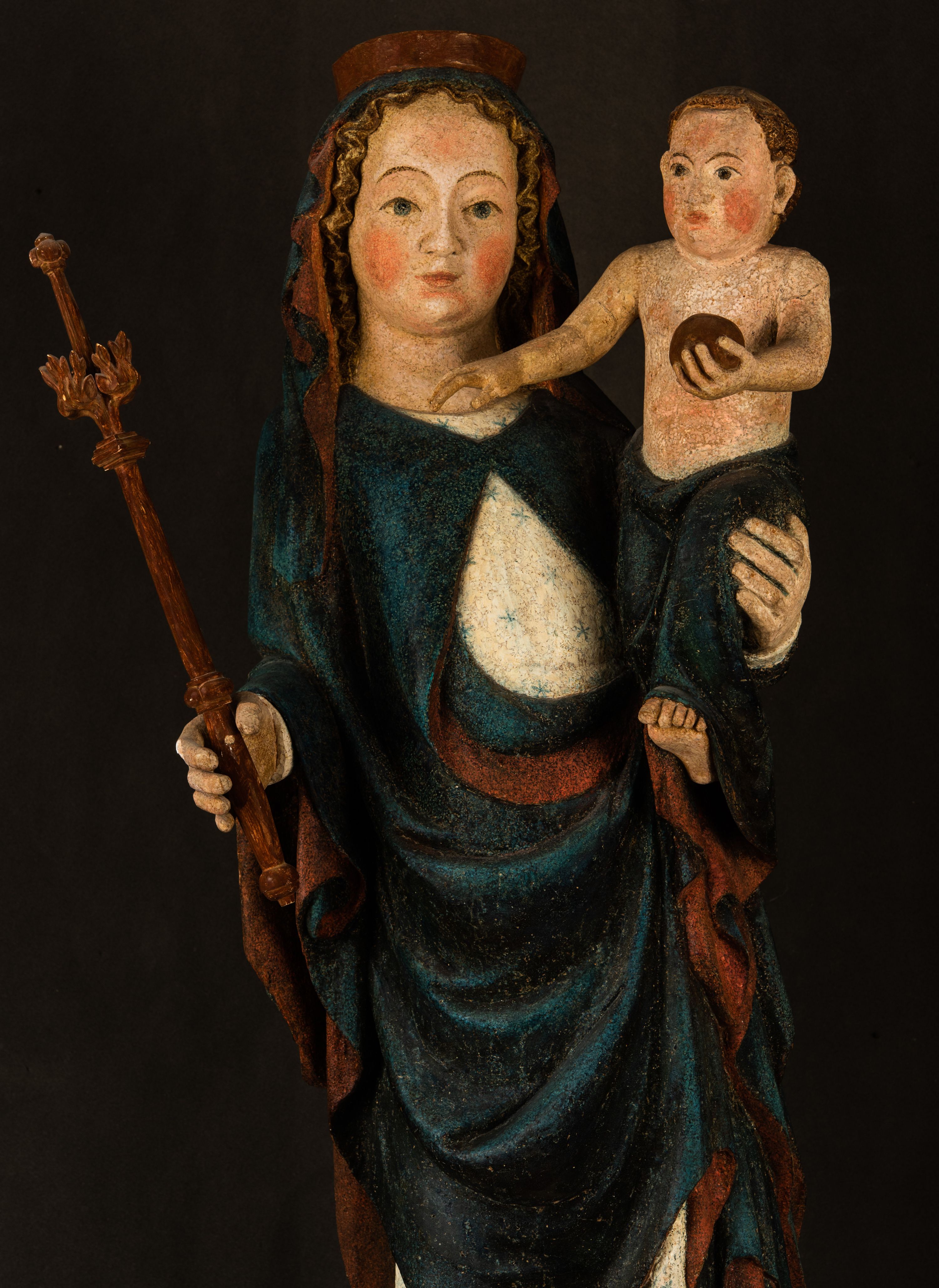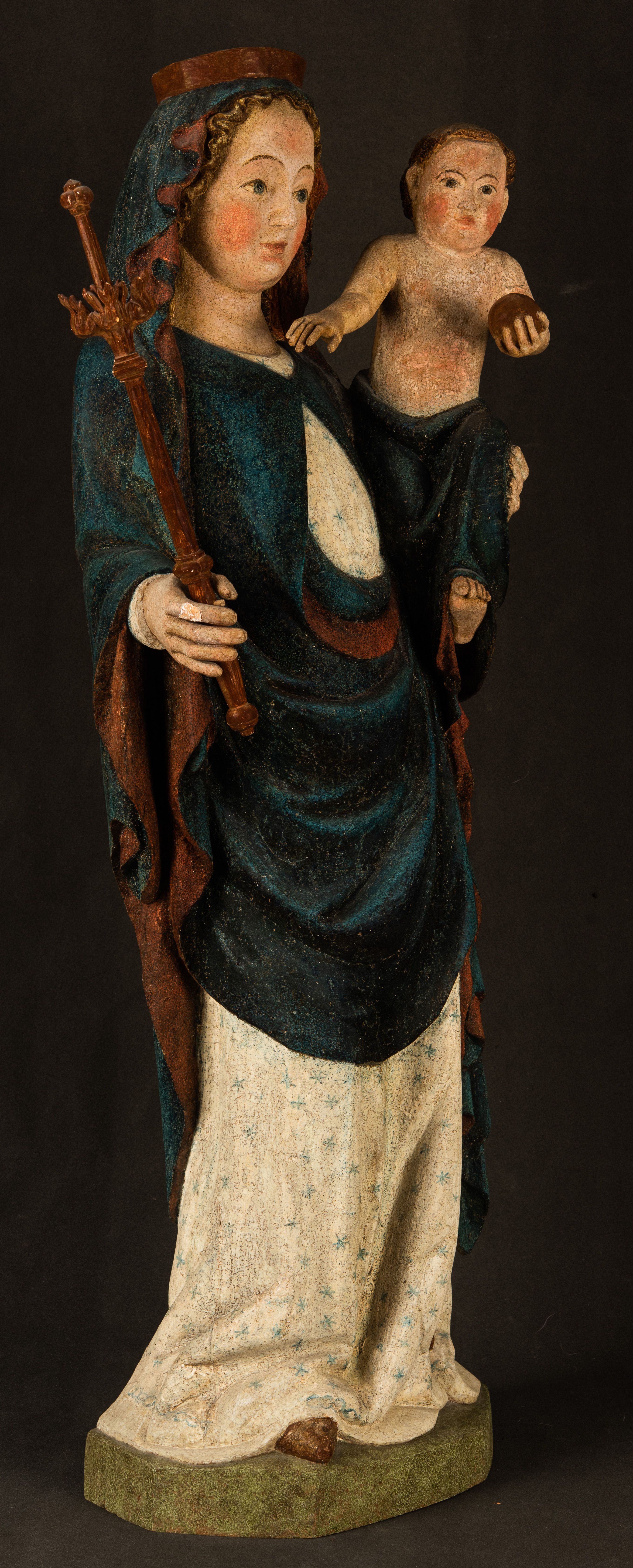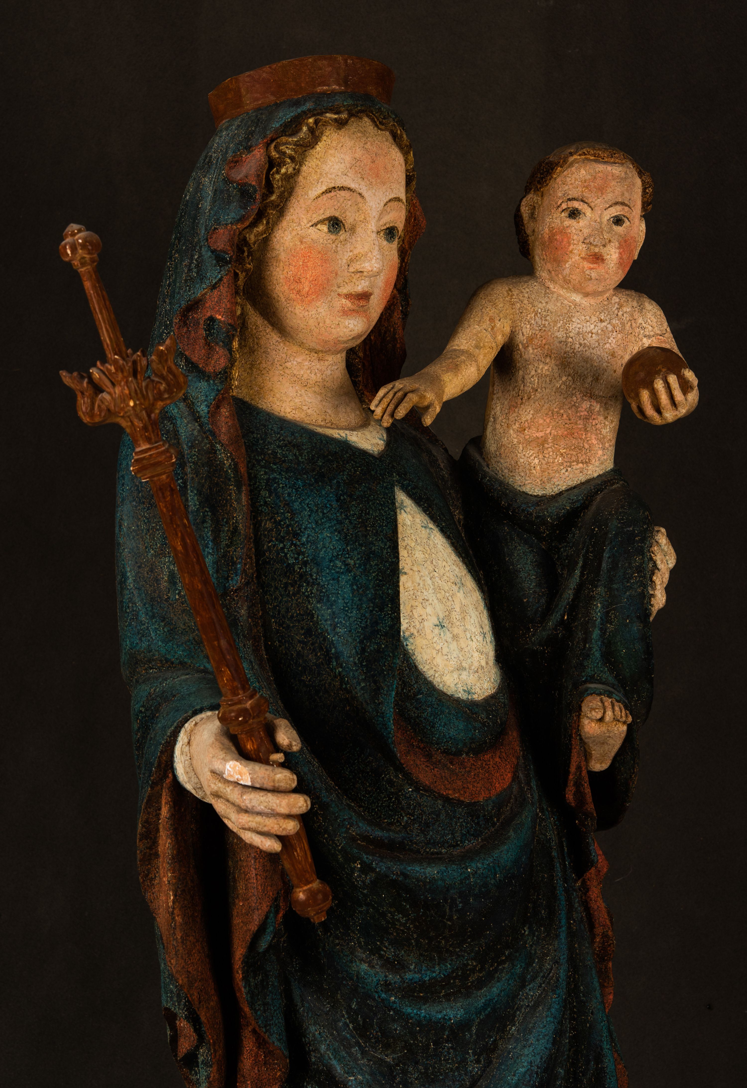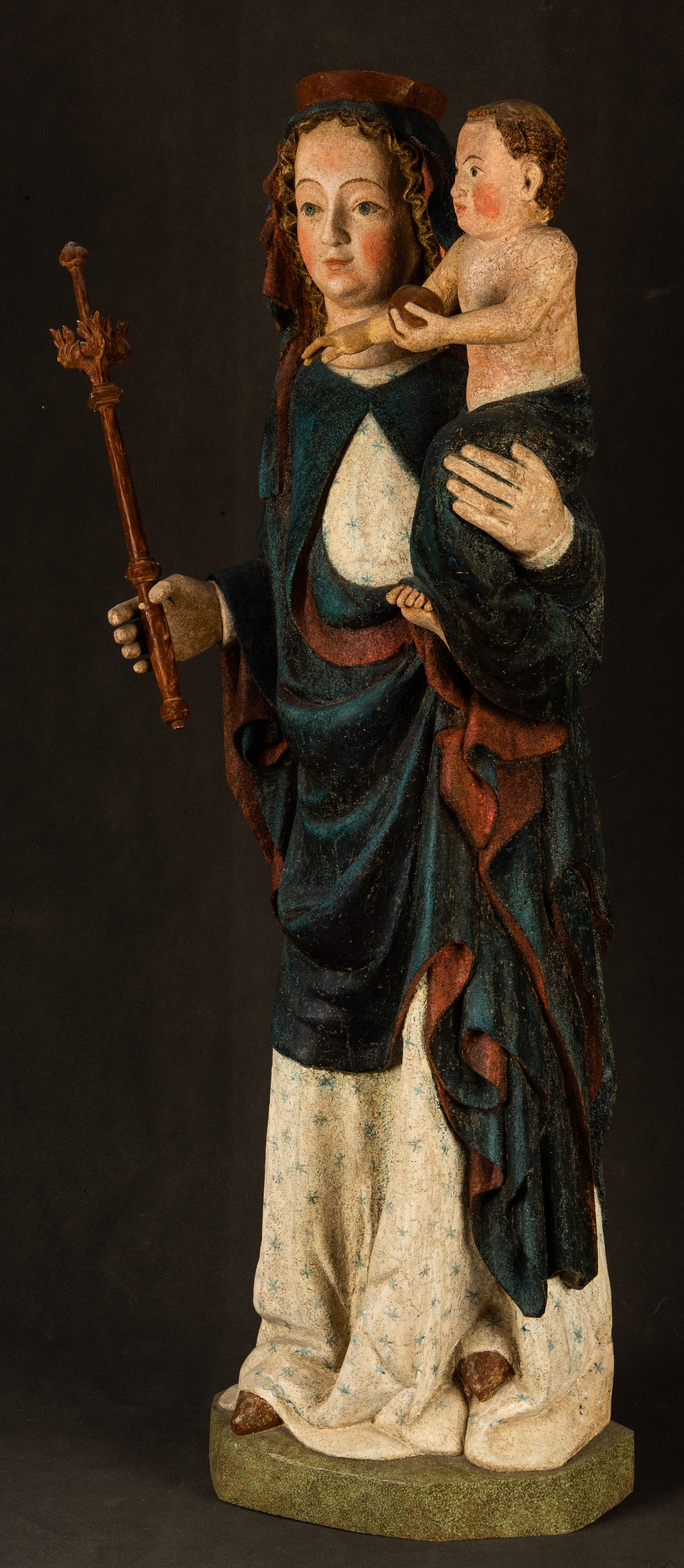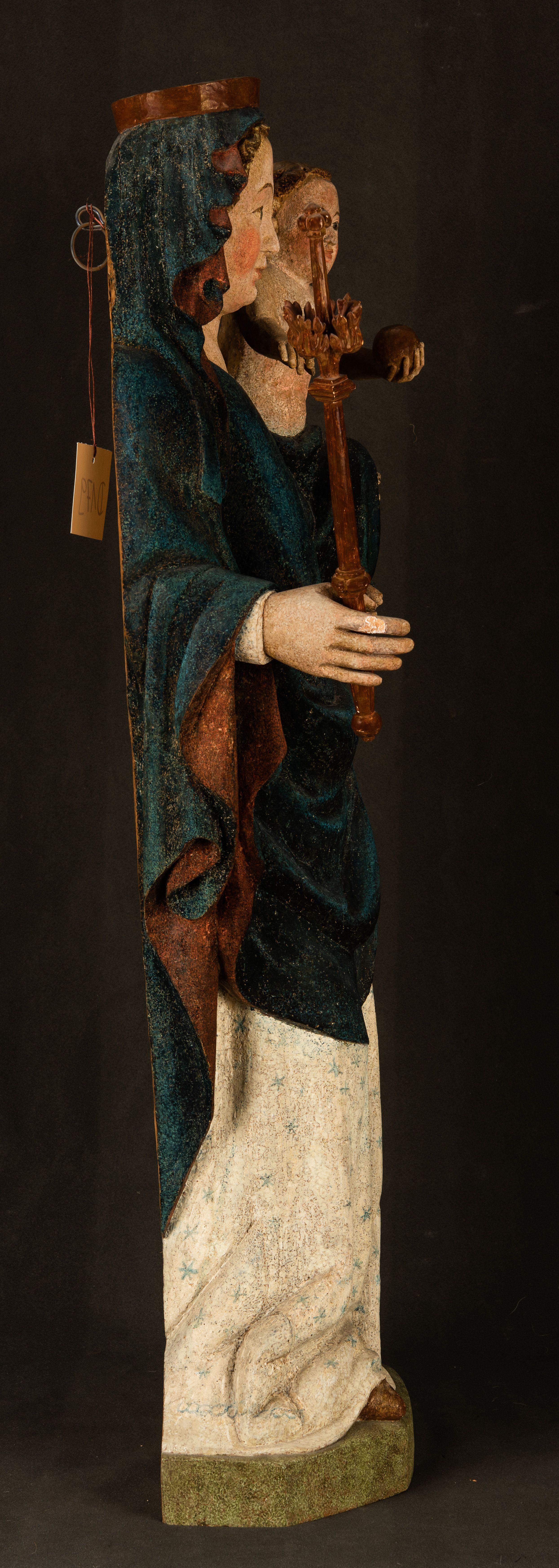 Rzeźba drążona, ukazująca Matkę Boską z Dzieciątkiem. Maria ustawiona frontalnie, w delikatnym kontrapoście, na lewym ręku trzyma Dzieciątko, w prawym dzierży berło. Twarz okrągła z wysokim czołem, drobnymi ustami i małymi oczami o delikatnie zarysowanych łukach brwiowych. Włosy jasne, ułożone w skręcone pukle spływające na plecy. Maria ubrana jest w białą suknię zdobioną drobnymi, niebieskimi gwiazdkami, ciemnobłękitny płaszcz z bordową podszewką spięty na piersi oraz spiczaste, brązowe buty. Na głowie ma założony ciemnoniebieski welon z bordową podszewką, spływający na ramiona i piersi oraz brązową podstawę do niezachowanej korony. Draperia szat miękka o wyraźnie zaznaczonych, licznych fałdach misowych i kaskadowych. Dzieciątko ukazane w pozycji siedzącej, zwrócone w prawo. W lewej dłoni trzyma jabłko królewskie, a prawą wyprostowaną podnosi na wysokość tułowia. Twarz pełna o dziecięcych rysach z małymi ustami, okolona krótkimi i kędzierzawymi włosami. Polichromia w odsłoniętych partiach ciała naturalistyczna, berło polichromowane na brązowo.