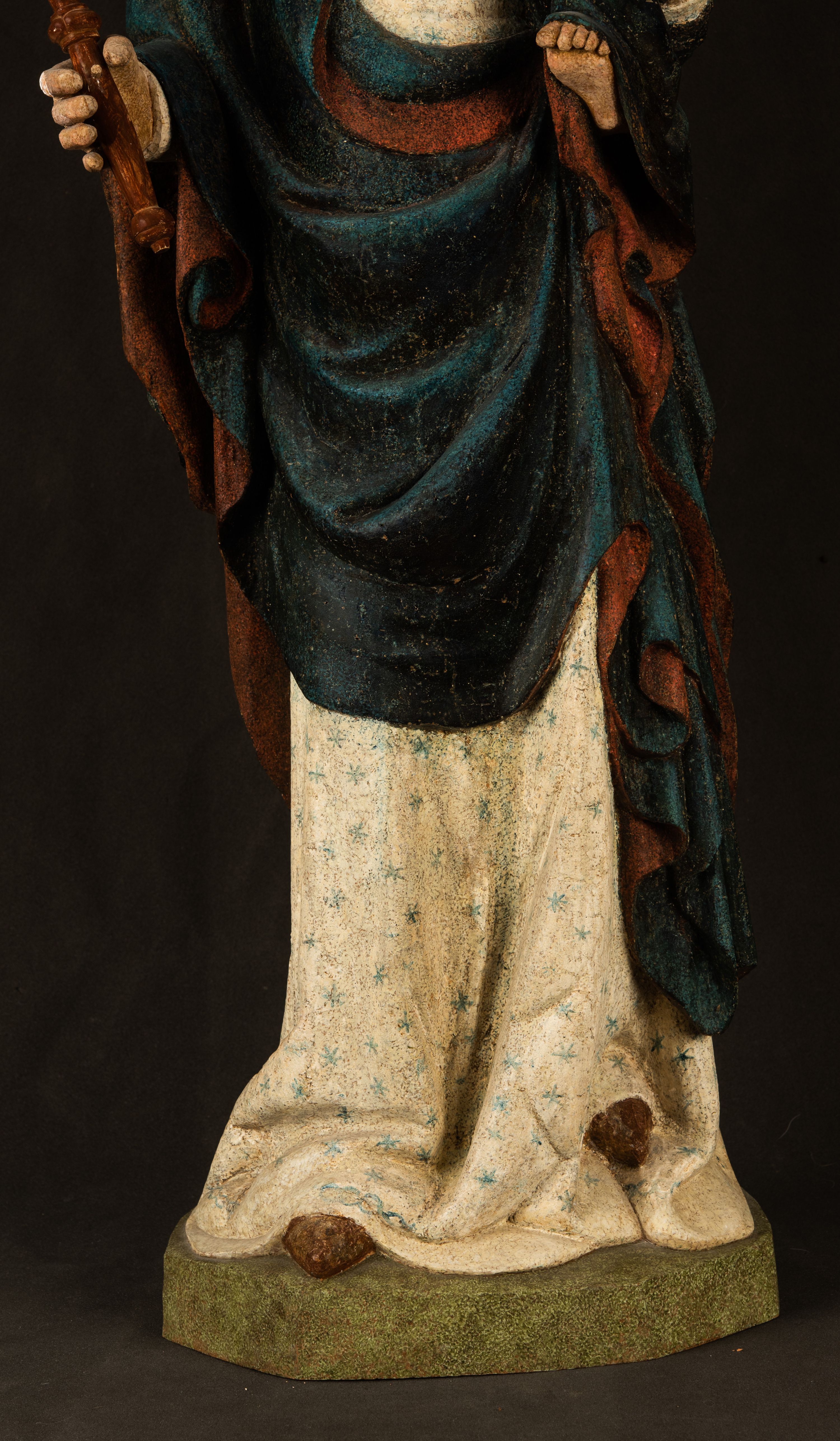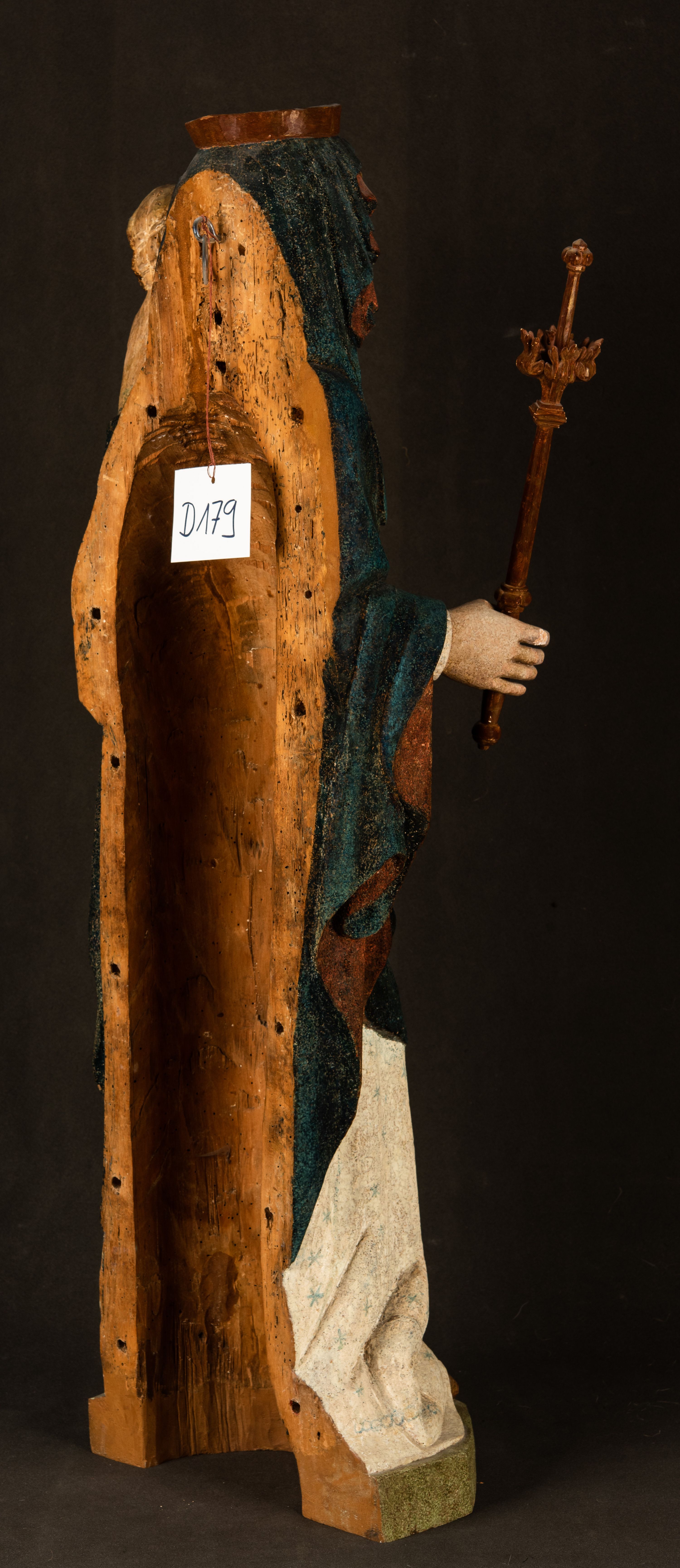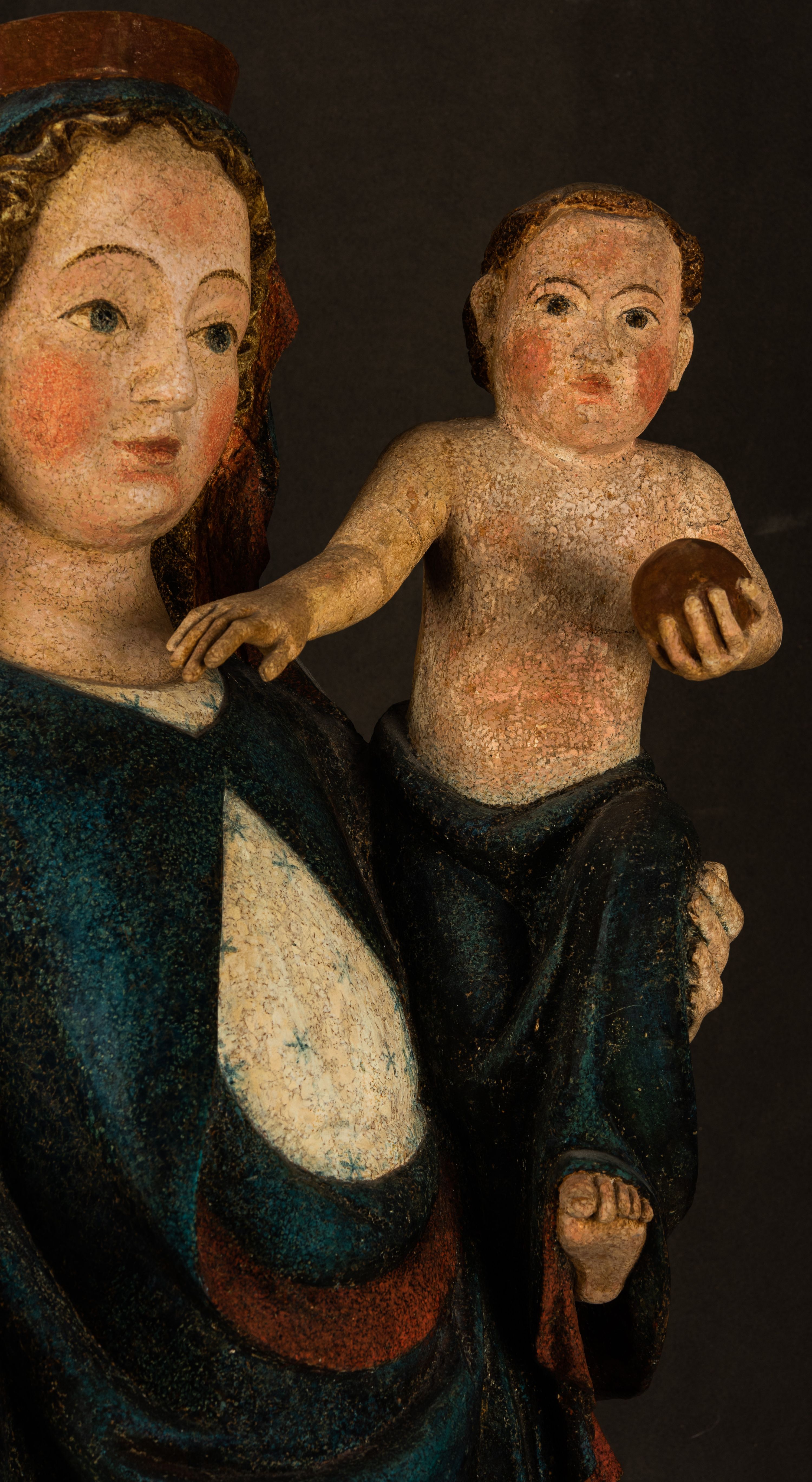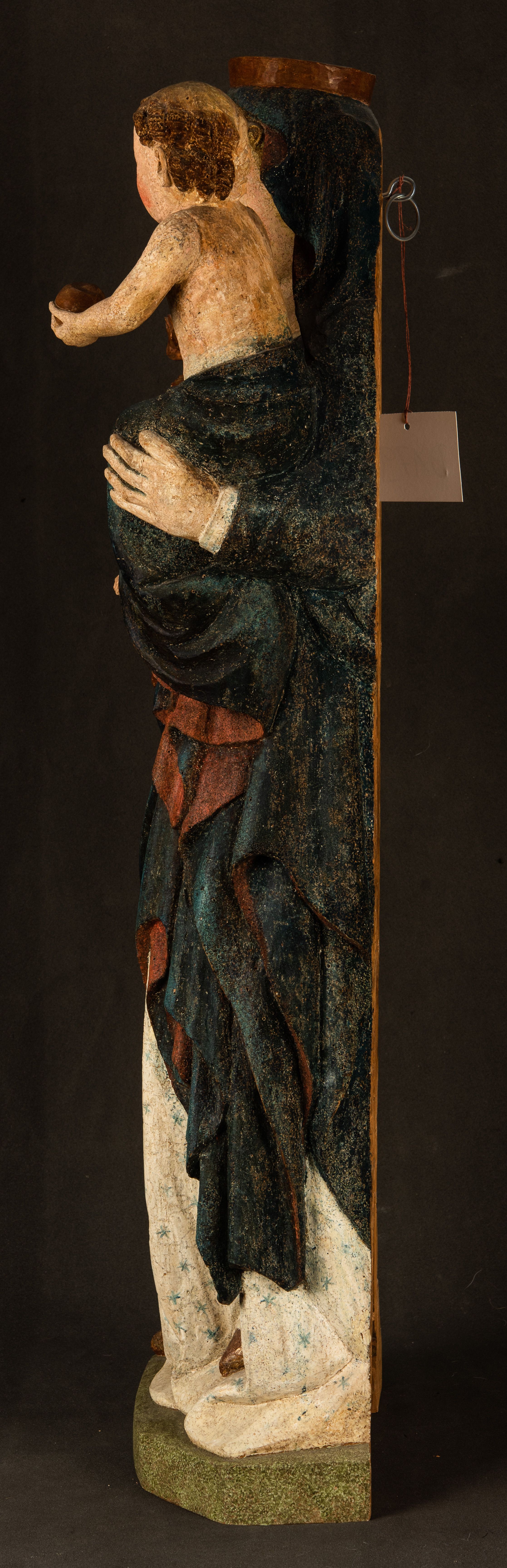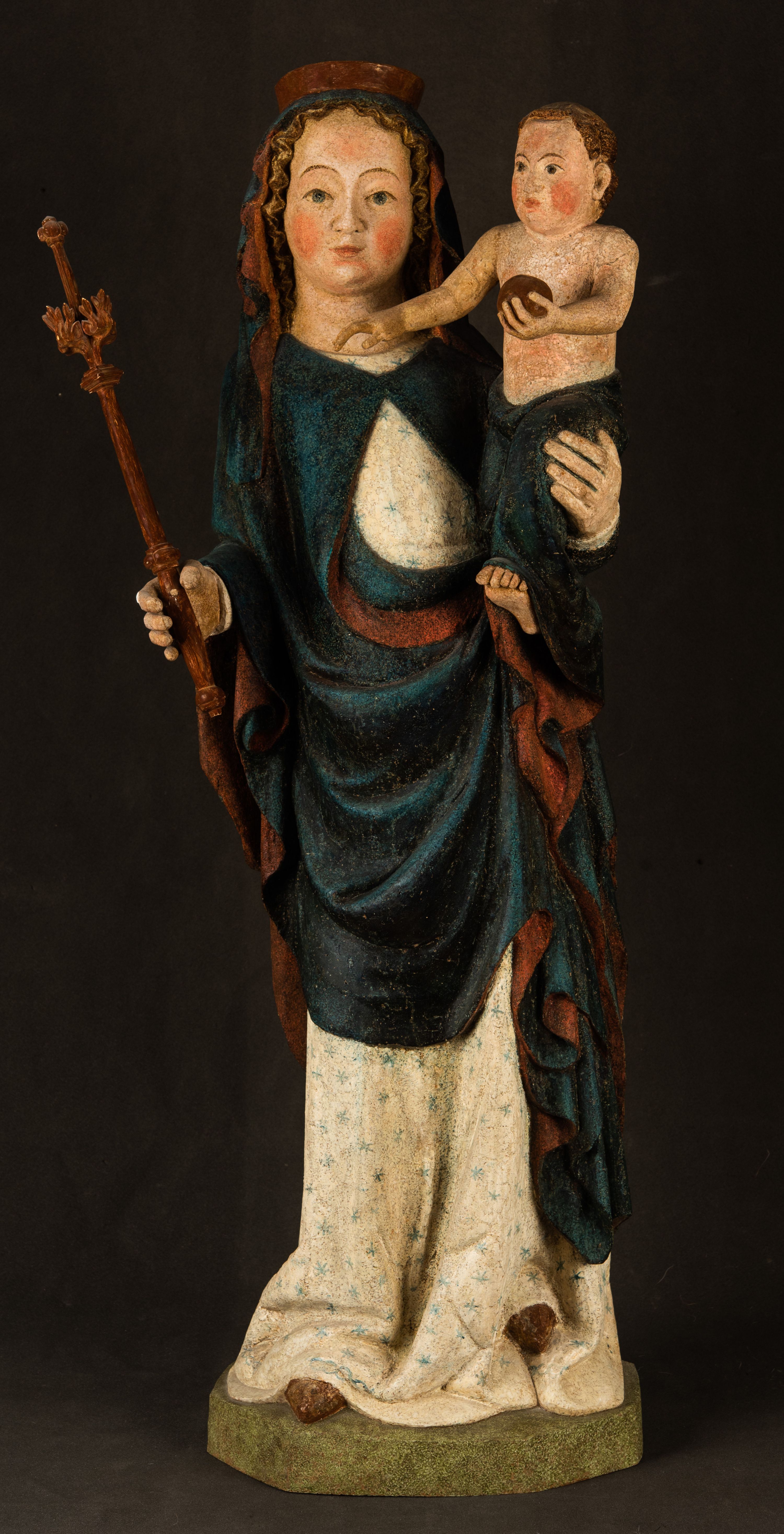 Rzeźba drążona, ukazująca Matkę Boską z Dzieciątkiem. Maria ustawiona frontalnie, w delikatnym kontrapoście, na lewym ręku trzyma Dzieciątko, w prawym dzierży berło. Twarz okrągła z wysokim czołem, drobnymi ustami i małymi oczami o delikatnie zarysowanych łukach brwiowych. Włosy jasne, ułożone w skręcone pukle spływające na plecy. Maria ubrana jest w białą suknię zdobioną drobnymi, niebieskimi gwiazdkami, ciemnobłękitny płaszcz z bordową podszewką spięty na piersi oraz spiczaste, brązowe buty. Na głowie ma założony ciemnoniebieski welon z bordową podszewką, spływający na ramiona i piersi oraz brązową podstawę do niezachowanej korony. Draperia szat miękka o wyraźnie zaznaczonych, licznych fałdach misowych i kaskadowych. Dzieciątko ukazane w pozycji siedzącej, zwrócone w prawo. W lewej dłoni trzyma jabłko królewskie, a prawą wyprostowaną podnosi na wysokość tułowia. Twarz pełna o dziecięcych rysach z małymi ustami, okolona krótkimi i kędzierzawymi włosami. Polichromia w odsłoniętych partiach ciała naturalistyczna, berło polichromowane na brązowo.