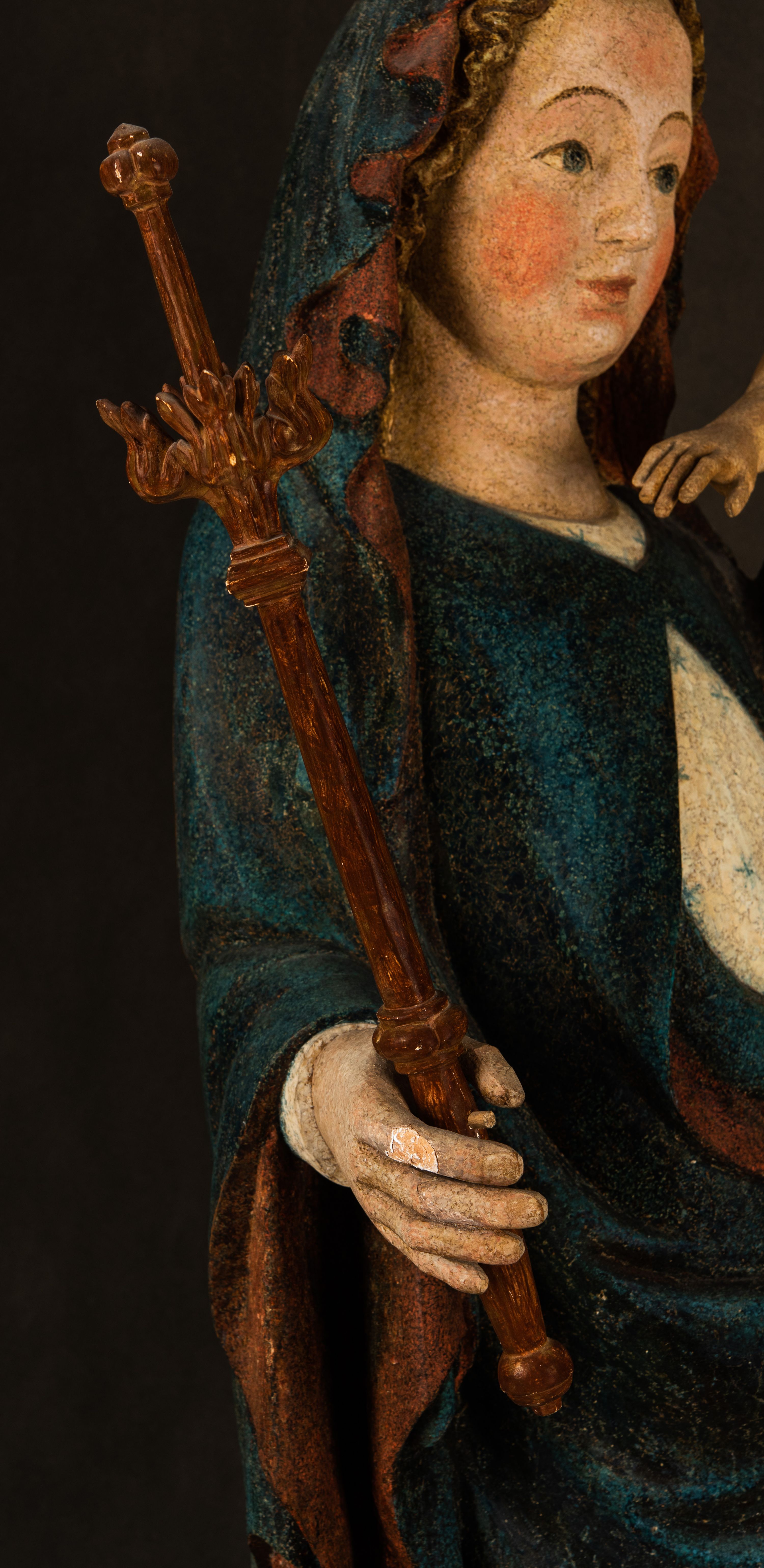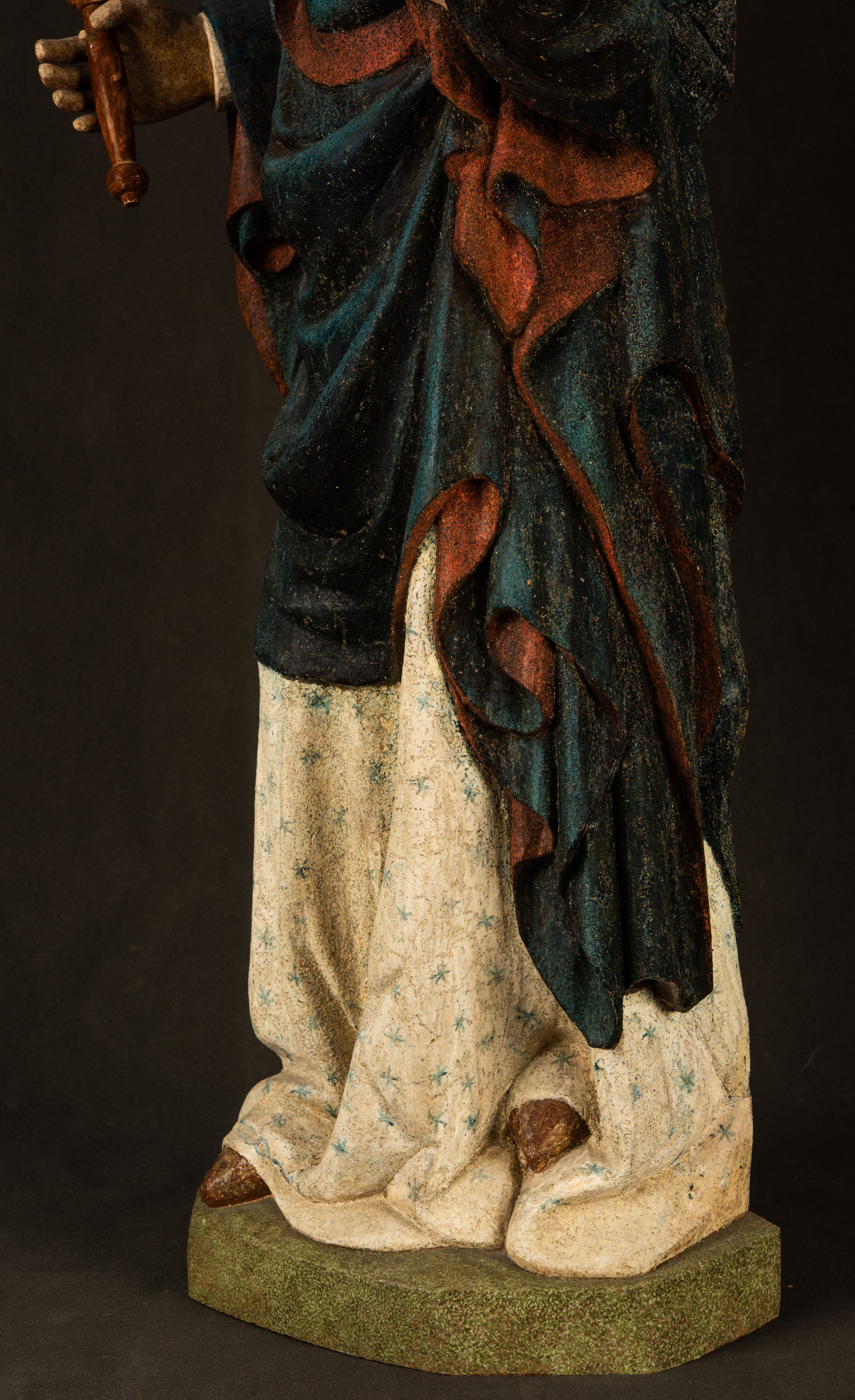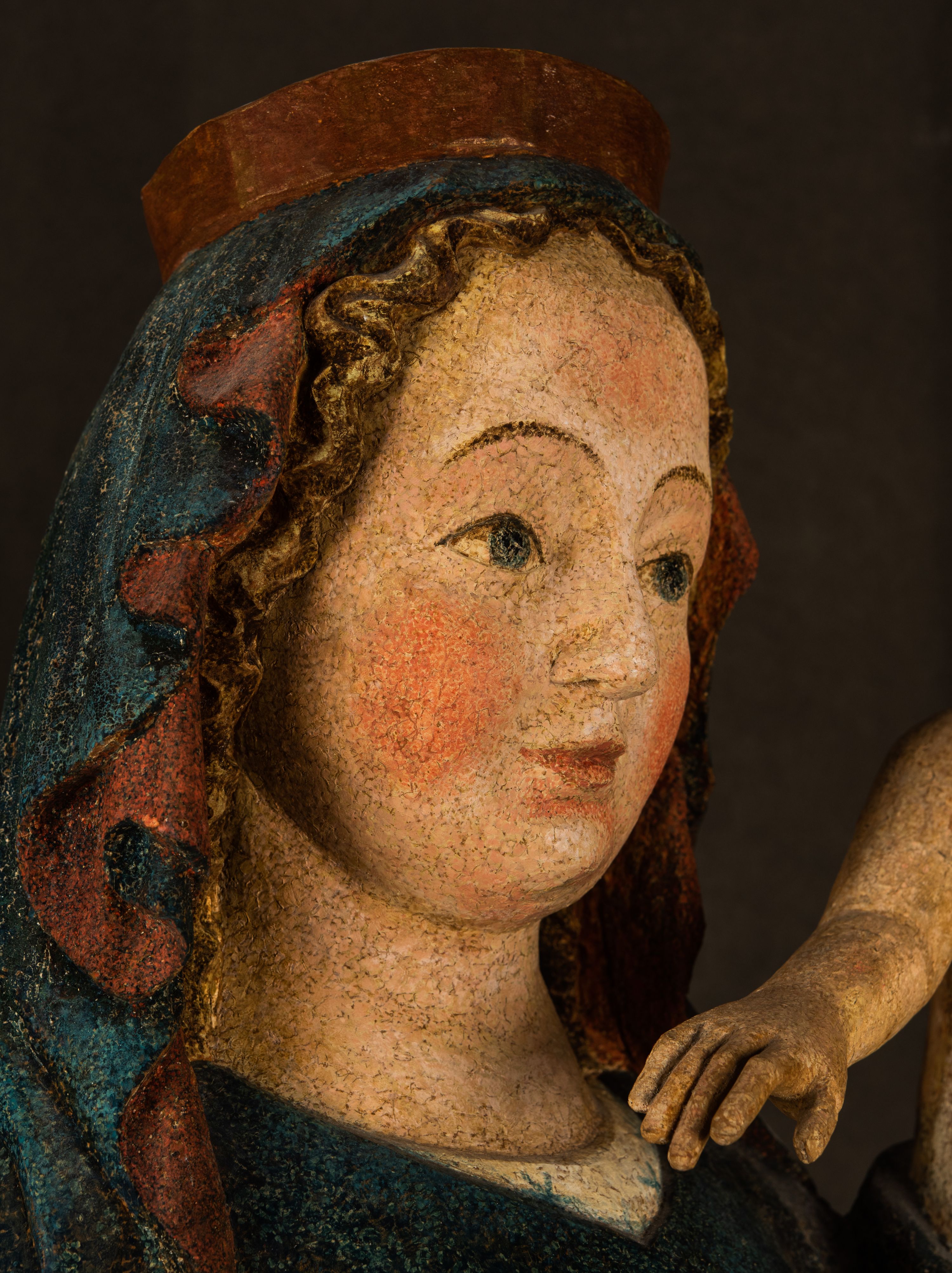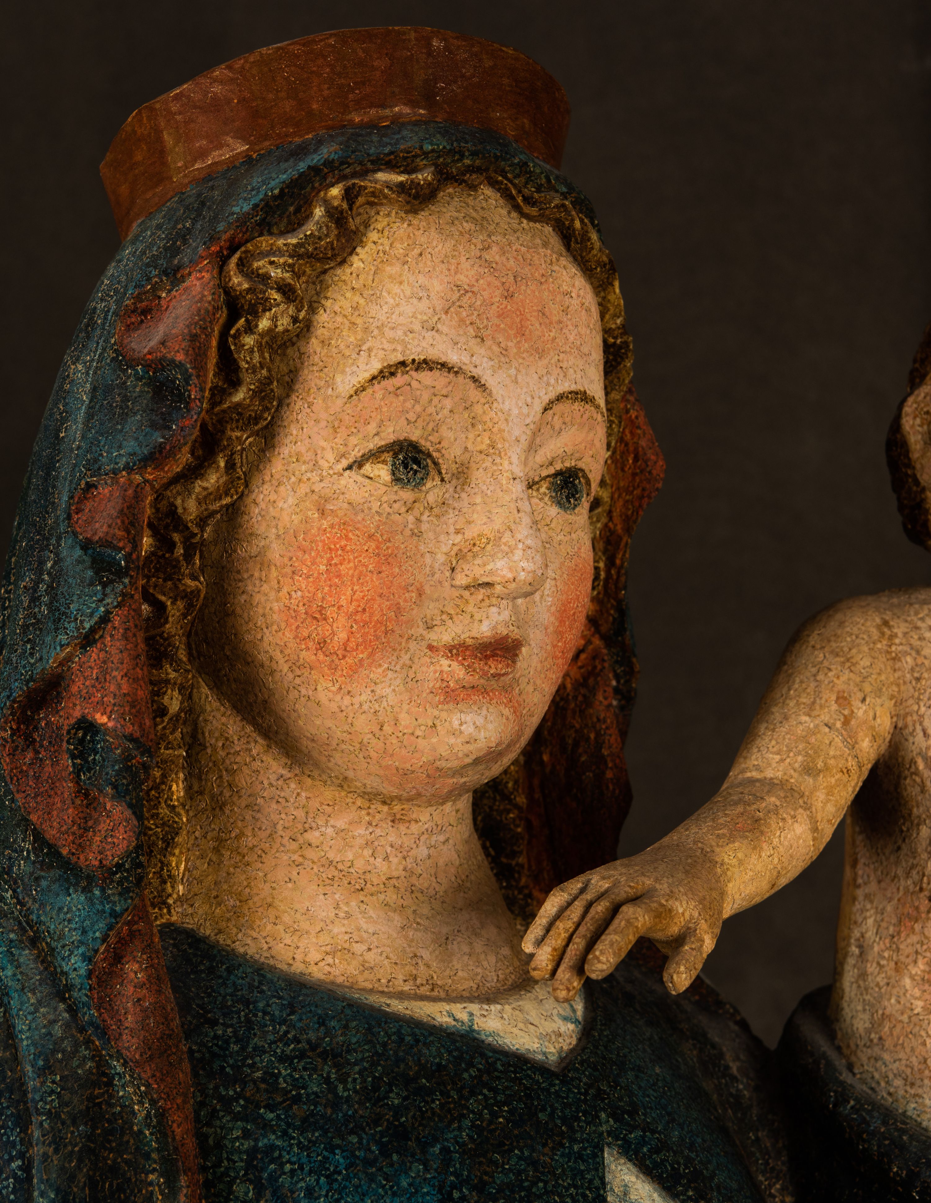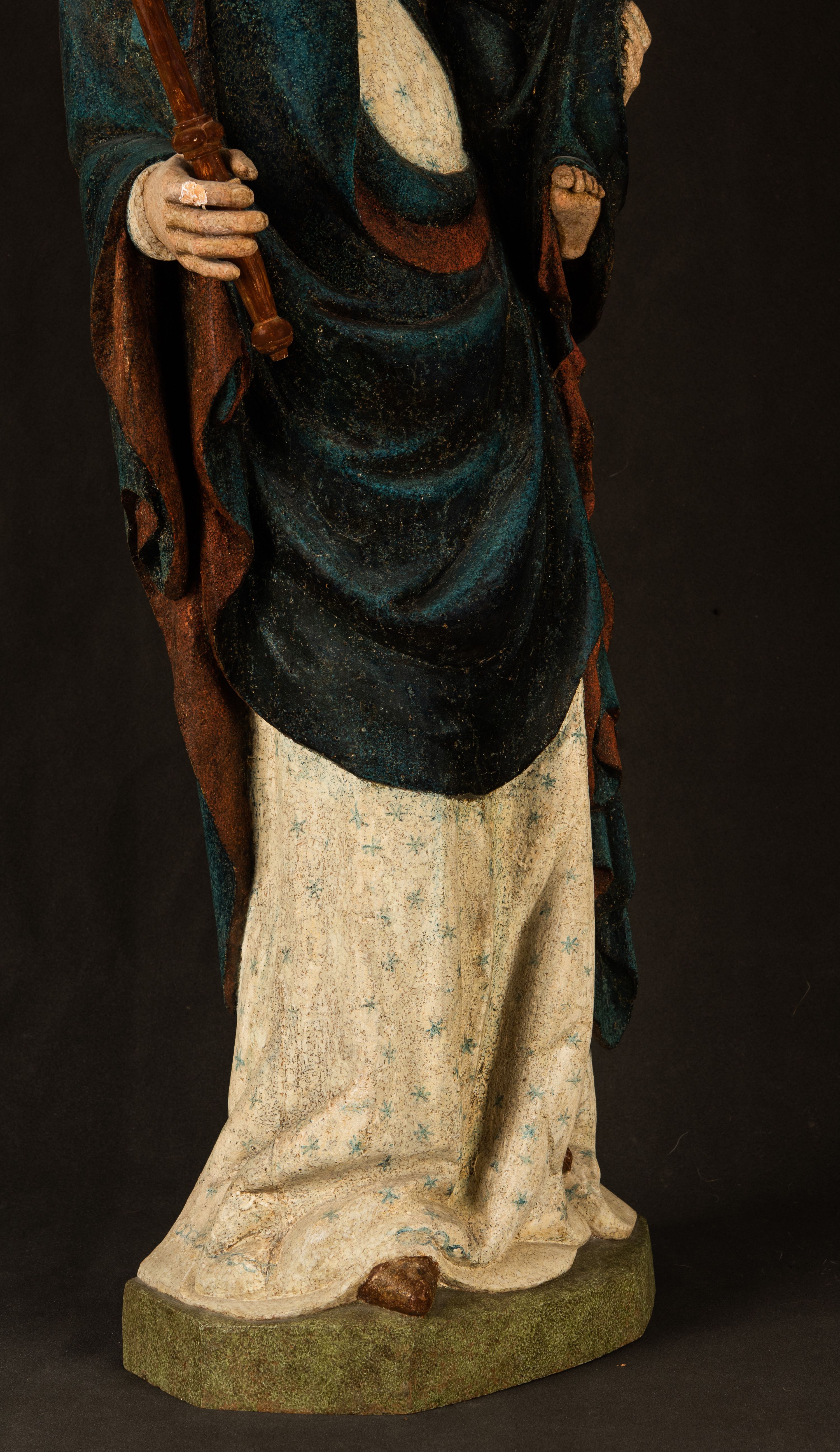 Rzeźba drążona, ukazująca Matkę Boską z Dzieciątkiem. Maria ustawiona frontalnie, w delikatnym kontrapoście, na lewym ręku trzyma Dzieciątko, w prawym dzierży berło. Twarz okrągła z wysokim czołem, drobnymi ustami i małymi oczami o delikatnie zarysowanych łukach brwiowych. Włosy jasne, ułożone w skręcone pukle spływające na plecy. Maria ubrana jest w białą suknię zdobioną drobnymi, niebieskimi gwiazdkami, ciemnobłękitny płaszcz z bordową podszewką spięty na piersi oraz spiczaste, brązowe buty. Na głowie ma założony ciemnoniebieski welon z bordową podszewką, spływający na ramiona i piersi oraz brązową podstawę do niezachowanej korony. Draperia szat miękka o wyraźnie zaznaczonych, licznych fałdach misowych i kaskadowych. Dzieciątko ukazane w pozycji siedzącej, zwrócone w prawo. W lewej dłoni trzyma jabłko królewskie, a prawą wyprostowaną podnosi na wysokość tułowia. Twarz pełna o dziecięcych rysach z małymi ustami, okolona krótkimi i kędzierzawymi włosami. Polichromia w odsłoniętych partiach ciała naturalistyczna, berło polichromowane na brązowo.