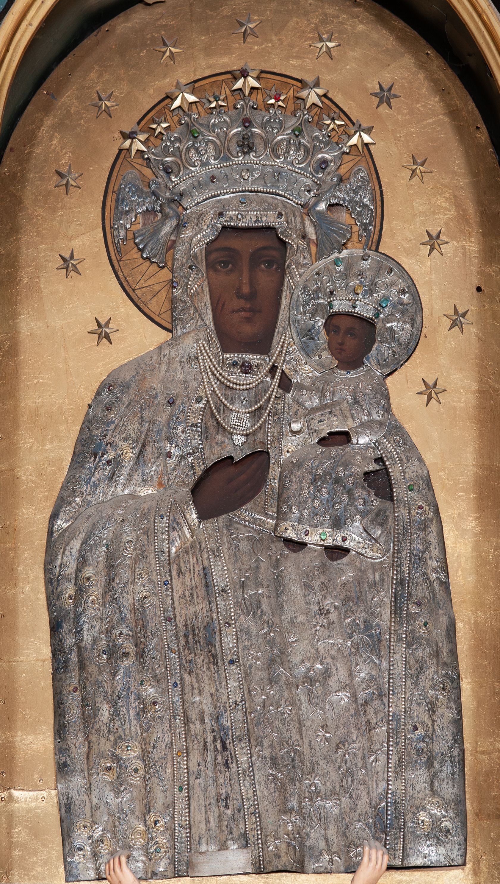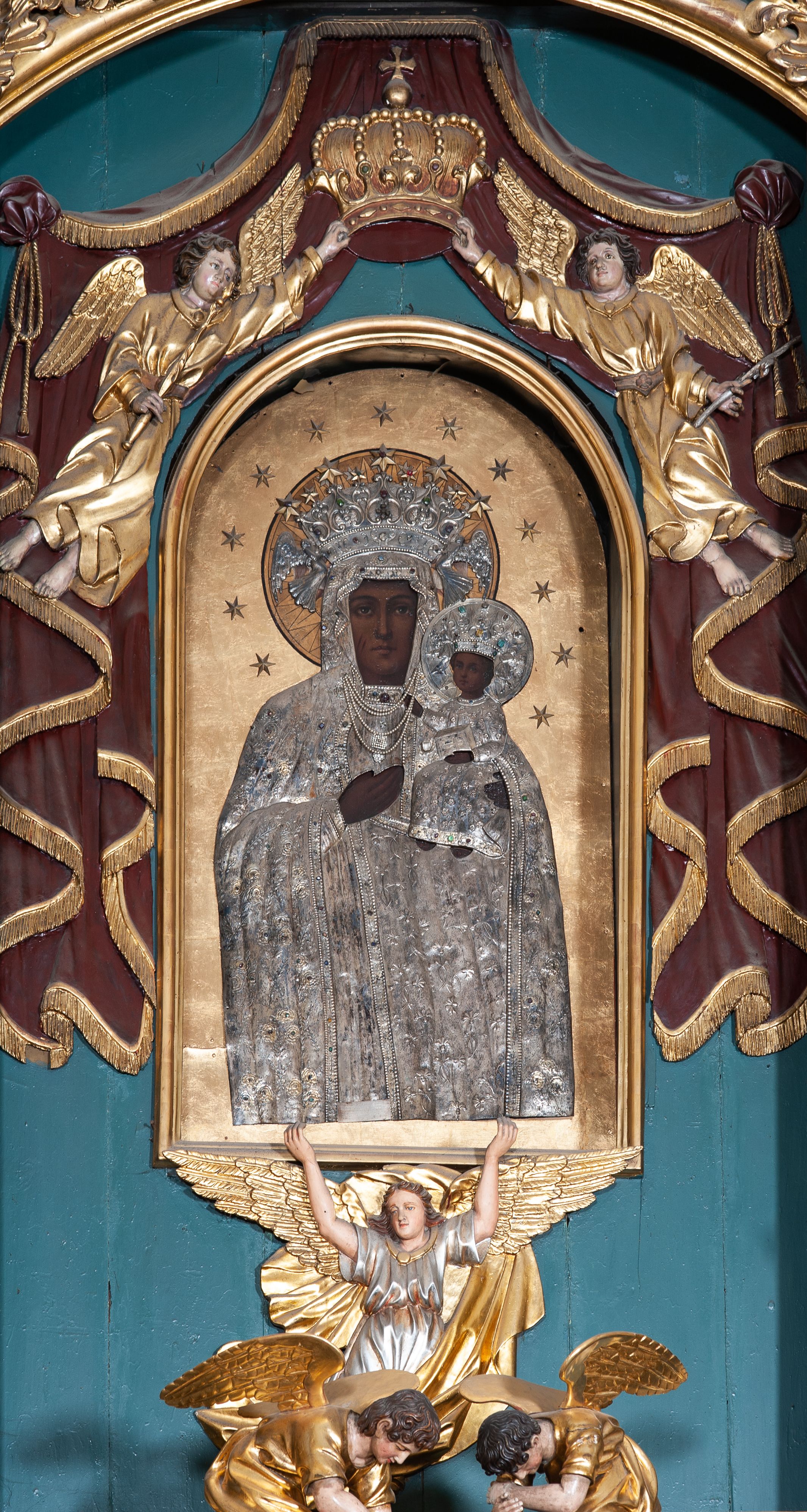 Obraz w formie stojącego prostokąta zamkniętego łukiem pełnym z przedstawieniem Matki Boskiej w typie Częstochowskiej. Maria została ukazana frontalnie, w półpostaci. Patrzy na widza, twarz ma owalną, o wyrazistych rysach, ciemnej karnacji, długim nosie, ciemnych oczach i niewielkich ustach. Prawą ręka wskazuje na trzymane na lewej ręce Dzieciątko Jezus zwrócone w trzech czwartych w prawo, z głową odwróconą do widza. Twarz ma okrągłą, o ciemnej karnacji i wyrazistych rysach, na prawym policzku dwa nacięcia. Włosy brązowe, kręcone, zaczesane na twarz. Lewą rączką podtrzymuje księgę, prawą ma uniesioną w geście błogosławieństwa. Ubrania postaci oraz nimby i korony wykonane są ze srebrnej blachy, trybowanej w ornament roślinny, podkreślonej perełkowaniem na krawędziach i kameryzowanej w partii lamowań oraz koron. Maria ma pod szyją zawieszone sznury pereł. Nimb Dzieciątka jest wykonany z blachy, Marii złocony, oba promieniste. Obie postacie mają otwarte korony przytrzymywane przez niewielkie anioły; koronę Marii dekoruje dodatkowo pięć płaskorzeźbionych, złoconych gwiazd. Wokół głów obu postaci 12 gwiazd, tło jednolite – złote.