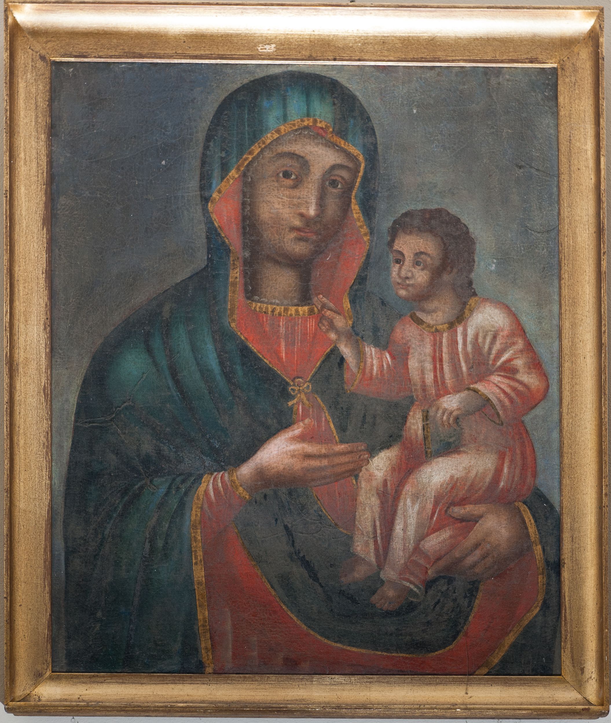 Obraz w kształcie stojącego prostokąta z przedstawieniem Matki Boskiej z Dzieciątkiem. W centrum kompozycji ukazana Maria w półpostaci, delikatnie zwrócona w lewo, trzymająca na lewym ramieniu Dzieciątko Jezus, prawą dłonią na niego wskazująca. Twarz o delikatnych rysach, z długim nosem, małymi ustami i zaokrąglonymi łukami brwiowymi. Maria ubrana jest w czerwoną suknię z długimi rękawami oraz ciemnozielony płaszcz ze złotą lamówką, założony na głowę i otulający całą postać, z prawą połą przewieszoną przez lewą rękę, spięty pod szyją złotą kokardką. Dzieciątko ukazane w pozycji siedzącej, zwrócone trzy czwarte w prawo, w lewej rączce trzyma księgę, a prawą błogosławi. Twarz okrągła o dużymi nosie, okolona bujnymi, ciemnobrązowymi, kędzierzawymi włosami. Dzieciątko ubrane jest w długą, jasnoróżową sukienkę ze złotymi lamówkami. Karnacje postaci ciemne. Tło jednolite, szare. Rama drewniana, wypukła i złocona.