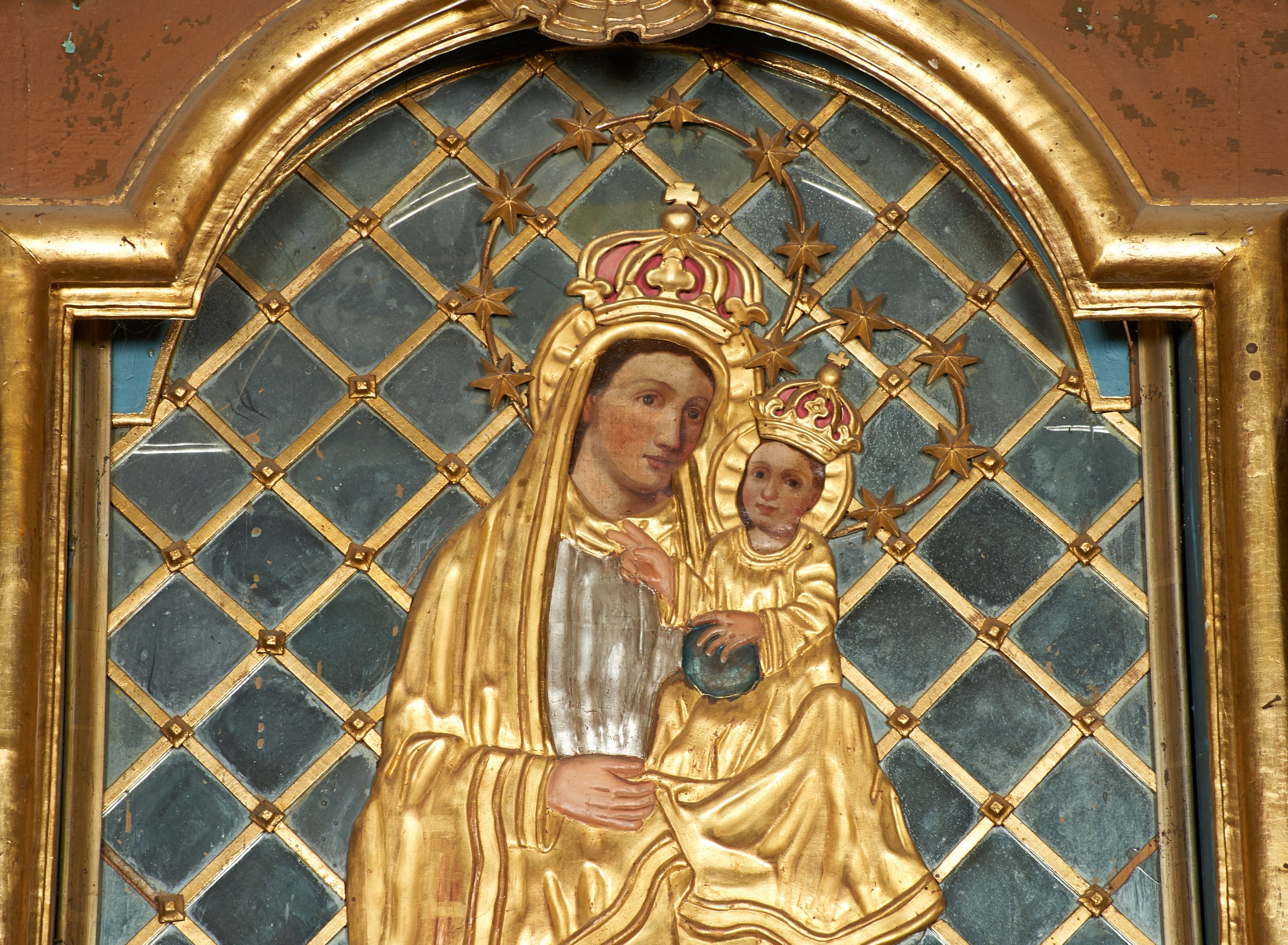 Obraz w formie stojącego prostokąta zamkniętego łukiem półkolistym nadwieszonym. Twarze postaci malowane są na płótnie, pozostałe elementy są płaskorzeźbione. W centrum kompozycji całopostaciowe przedstawienie Matki Boskiej z Dzieciątkiem stojącej na globie i sierpie księżyca. Maria ukazana jest frontalnie, z opuszczoną głową skierowaną w lewo, prawą, ugiętą rękę trzyma z przodu, lewą podtrzymuje Dzieciątko. Twarz ma owalną, o dużych, okrągłych oczach i nosie, pełnych ustach, okoloną brązowymi włosami. Ubrana jest w srebrzoną, długą suknię oraz długi, złocony płaszcz zarzucony na głowę i ramiona. Dzieciątko ukazane jest w pozycji siedzącej, zwrócone w trzech czwartych w prawo. Lewą ręką przytrzymuje na kolanie kulę, prawą unosi w geście błogosławieństwa. Twarz ma okrągłą, o dużych oczach, małym nosie i pełnych ustach, okoloną jasnobrązowymi, krótkimi włosami. Ubrane jest w luźną, złoconą tunikę. Na głowach obu postaci korony zamknięte, wokół nich nimby zamknięte i gwieździste. Maria i Dzieciątko ukazane na tle kratki wypełnionej taflami lustra. Obraz ujęty złoconą ramą.