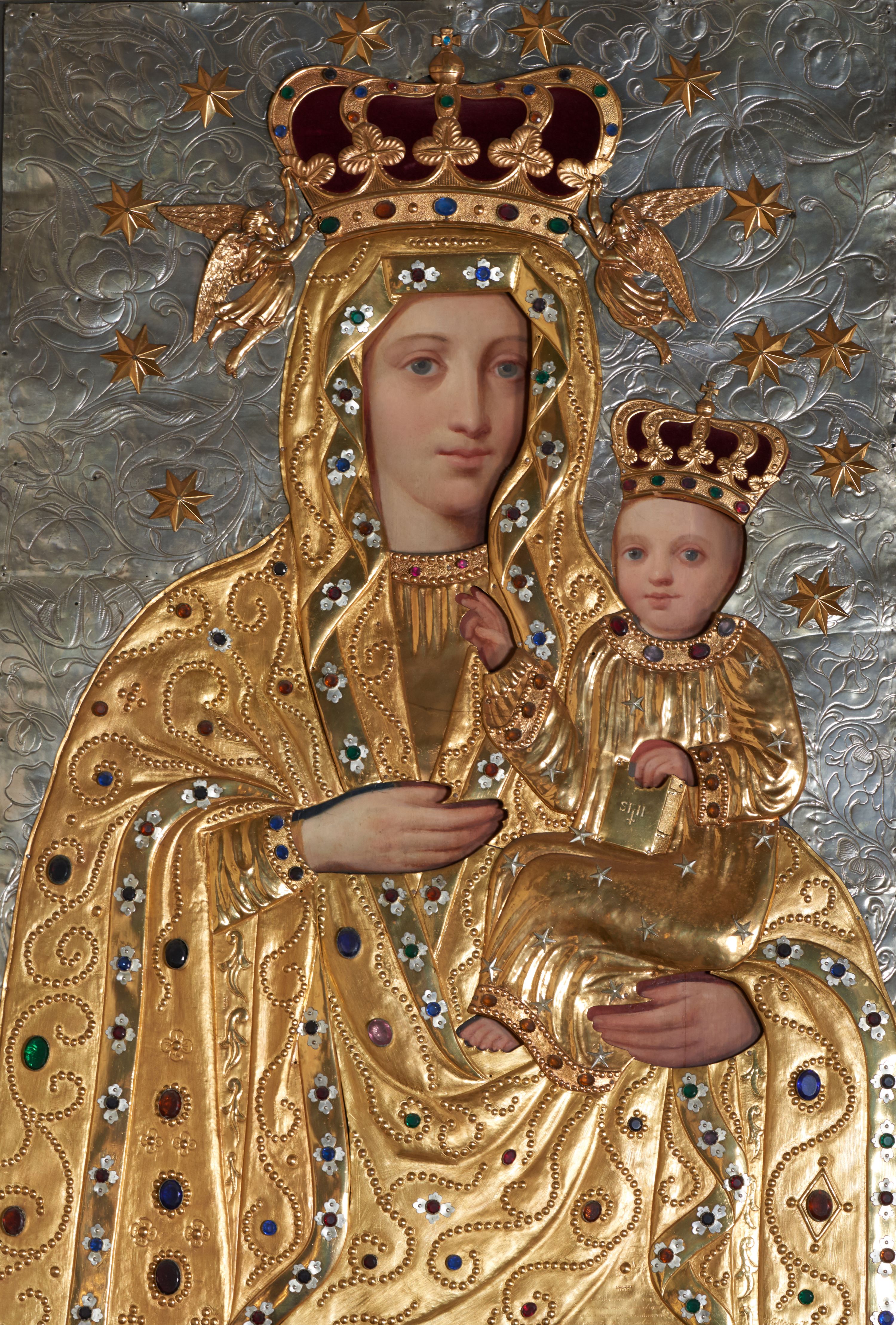 Schemat ikonograficzny obrazu jest zbliżony do Hodegetrii Jasnogórskiej, nie można jednak mówić tu o dosłownej kopii obrazu częstochowskiego, rzucają się bowiem oczy istotne różnice (m.in. brak blizn na policzku Marii, nieco odmienny układ jej rąk). Natomiast motyw aniołów podtrzymujących koronę Matki Boskiej został zapewne zapożyczony z obrazu jasnogórskiego, który do 1909 roku ozdobiony był tak ukształtowaną koroną z parą aniołów ukazanych w locie
