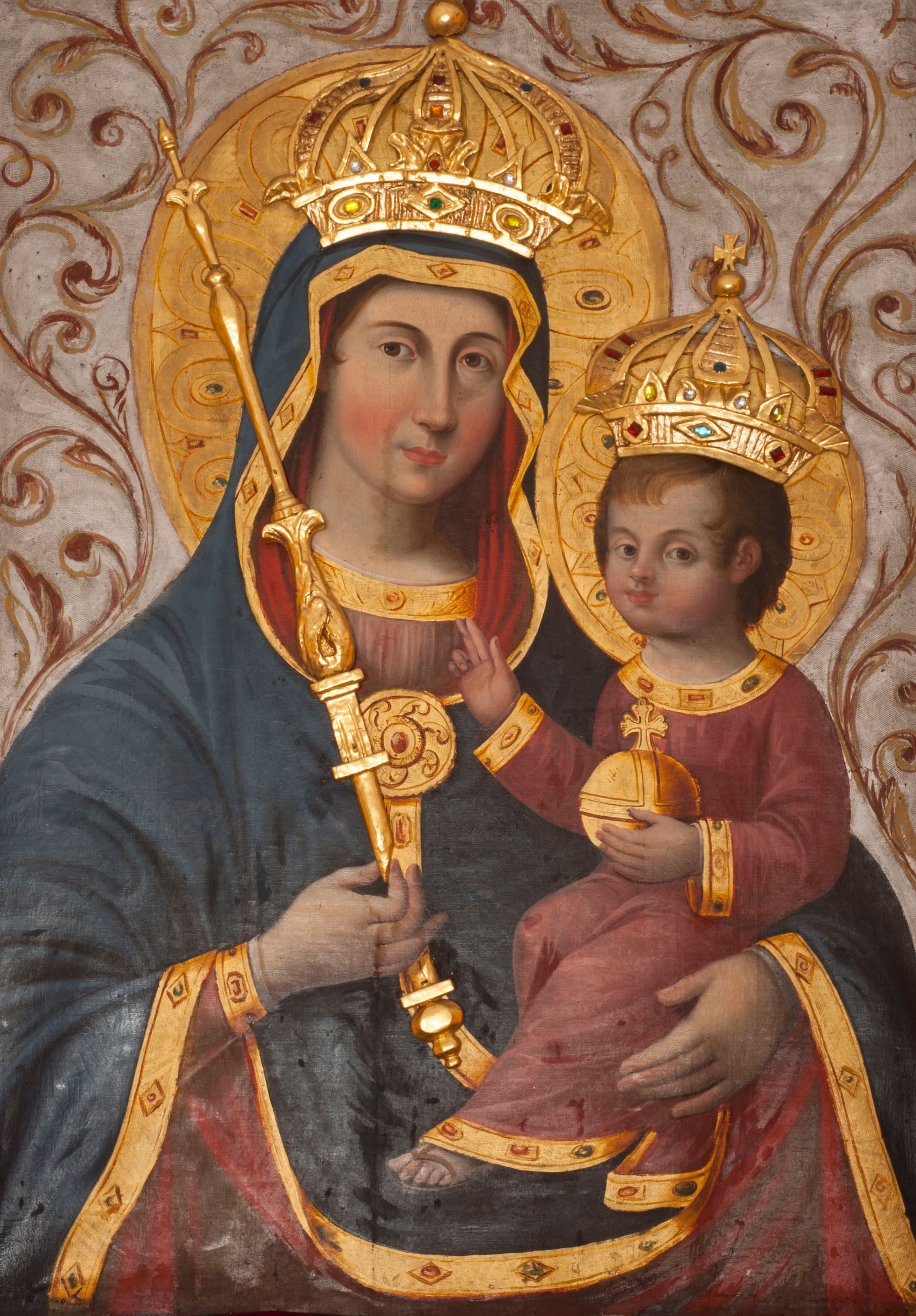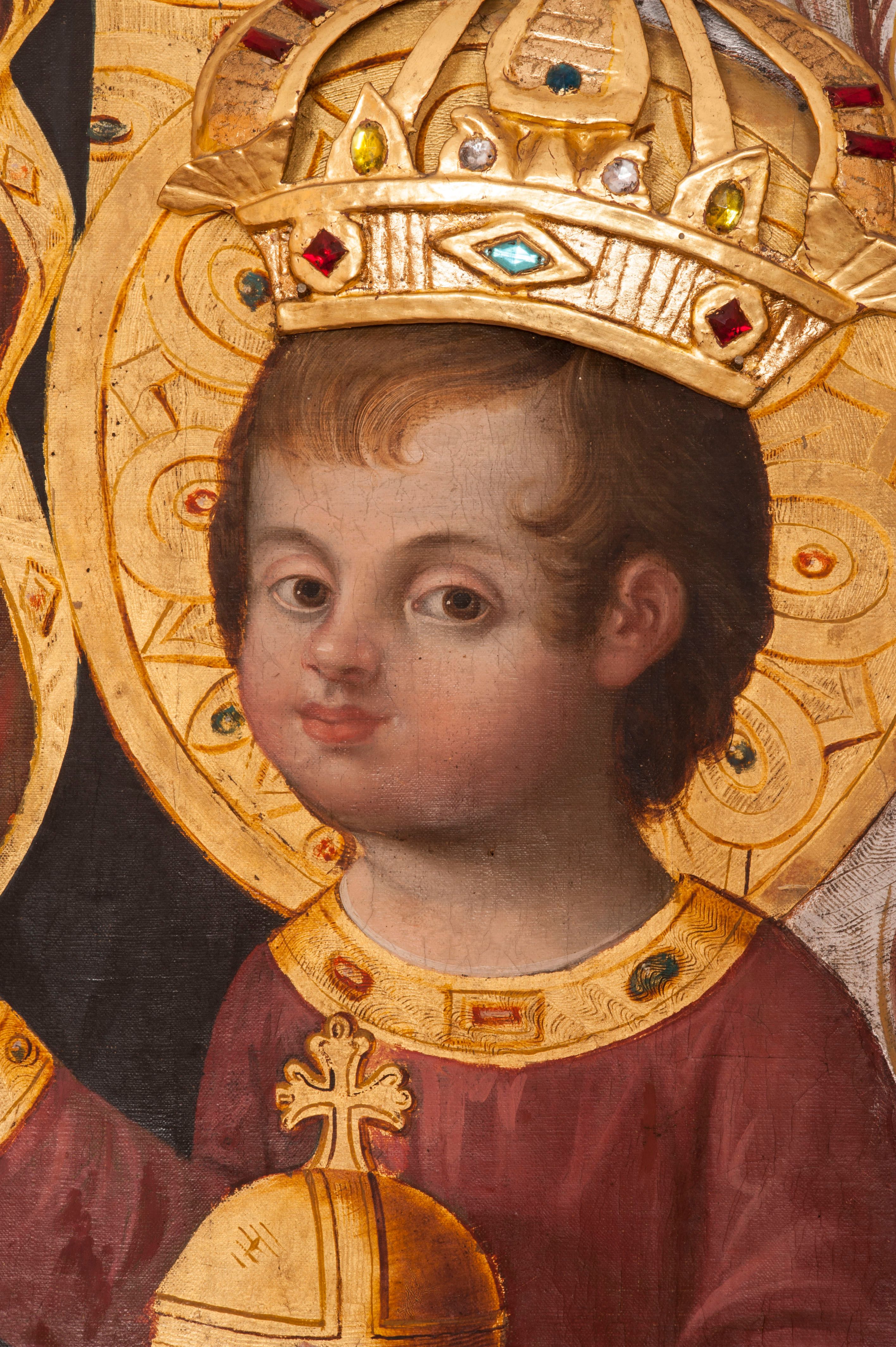 Obraz w formie stojącego prostokąta. Maria ukazana w półpostaci, zwrócona w trzech czwartych w lewo. W prawej, ugiętej ręce trzyma berło, lewą podtrzymuje Dzieciątko. Twarz ma owalną, o łagodnych rysach, migdałowatych oczach, długim nosie i pełnych ustach, okoloną jasnobrązowymi włosami. Ubrana jest w jasnoczerwoną suknię ze złoconymi lamówkami oraz granatowy maforion z czerwoną podszewką i złoconą lamówką zarzucony na głowę i ramiona, zapięty na piersi okrągłą klamrą. Dzieciątko ukazane w pozycji siedzącej, skierowane w trzech czwartych w prawo, z wysuniętą lewą nogą. Prawą rękę unosi w geście błogosławieństwa, lewą trzyma jabłko królewskie. Twarz ma kwadratową, o pełnych policzkach, dużych, migdałowatych oczach, małym nosie i pełnych ustach, okoloną krótkimi, brązowymi włosami. Ubrane jest w jasnoczerwoną tunikę ze złoconymi lamówkami, na stopach ma sandały. Maria i Dzieciątko mają na głowach zamknięte korony, a wokół nich nimby. Postacie ukazane są na srebrzonym tle wypełnionym wicią roślinną. Korony i berło rzeźbione są w drewnie, nałożone na płótno.