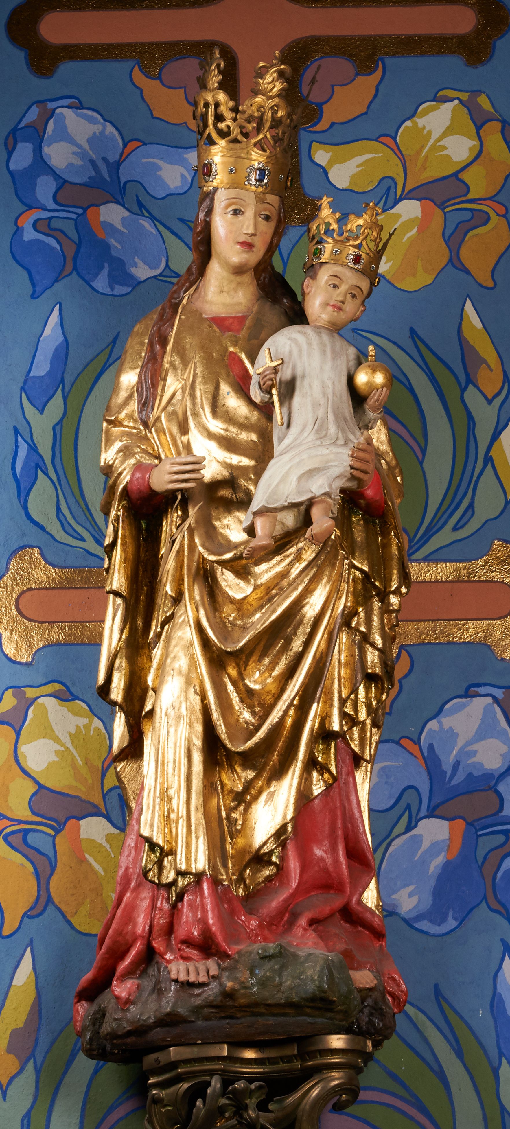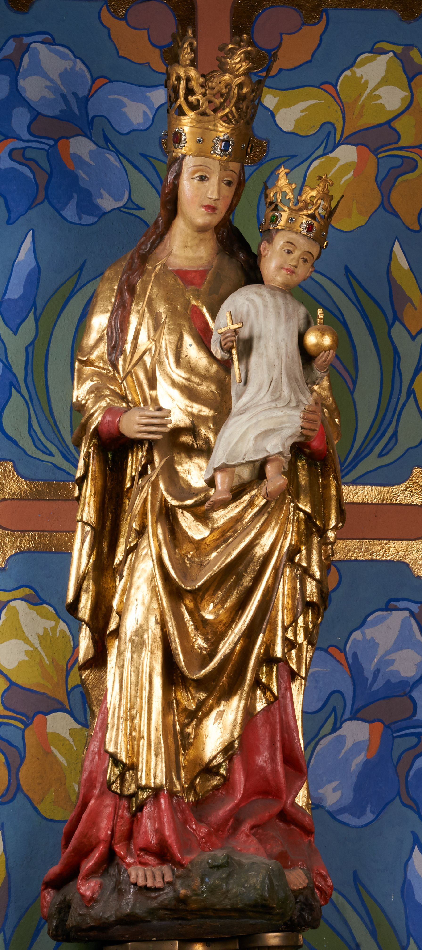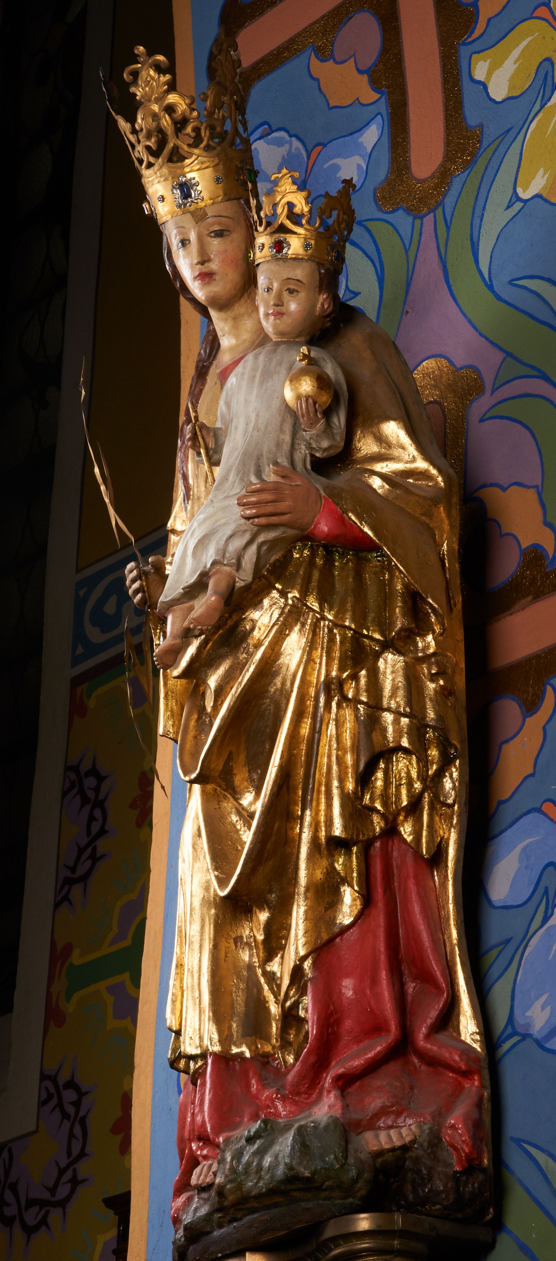 Rzeźba pełnoplastyczna, przyścienna, drążona od tyłu, ustawiona na konsoli. Maria stoi w lekkim kontrapoście, ciężar ciała opierając na lewej nodze, prawą lekko uginając w kolanie. Lewą ręką podtrzymuje siedzące na jej ramieniu Dzieciątko, w prawej ugiętej w łokciu i wysuniętej lekko do przodu trzyma błyskawicę. Twarz pociągła, z długim, prostym, wąskim nosem, oczami o migdałowym wykroju, regularnymi łukami brwiowymi oraz wąskimi ustami, okolona długimi, ciemnobrązowymi włosami, z przedziałkiem pośrodku głowy, opadającymi na ramiona dwoma skręcającymi się w pukle pasmami. Maria ubrana w długą, czerwoną suknię z wąskimi rękawami oraz złoty płaszcz spięty na piersi, przerzucony z przodu przez lewe ramię, układający się pośrodku w trzy płytkie misowe fałdy, po bokach formujący się w dwa festony. Dzieciątko siedzi wyprostowane w ramionach Matki, zwrócone przodem do widza, w prawej rączce trzymając krzyż, w lewej jabłko królewskie. Głowa pochylona lekko na lewe ramię; okrągła twarz z małym, zadartym nosem, wąskimi ustami, niewielkimi oczami i regularnymi łukami brwiowymi, okolona krótkimi ciemnobrązowymi włosami. Jezus ubrany w długą białą szatę układającą się w proste, bardzo płytkie fałdy. Na głowach nowsze korony otwarte.