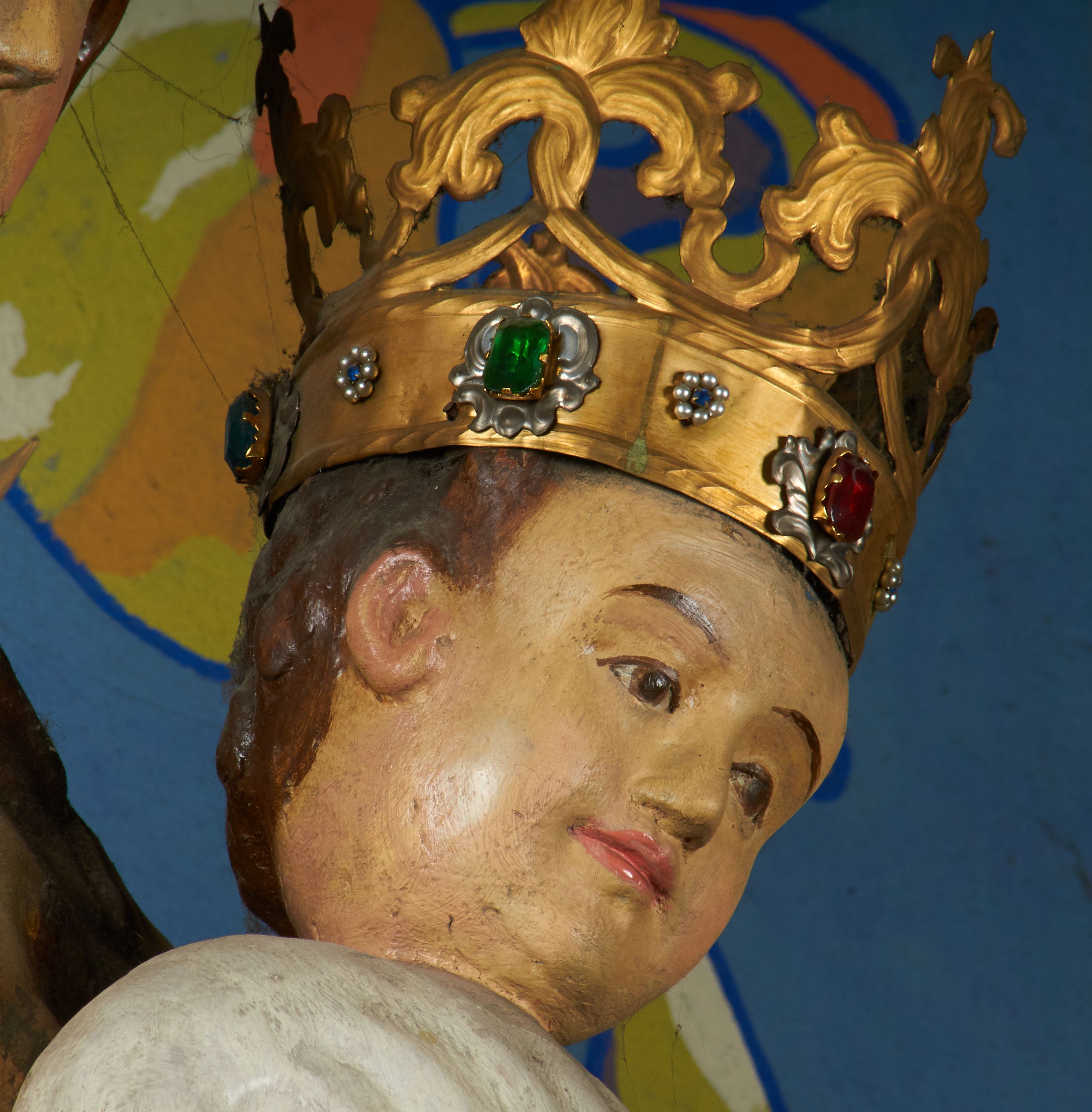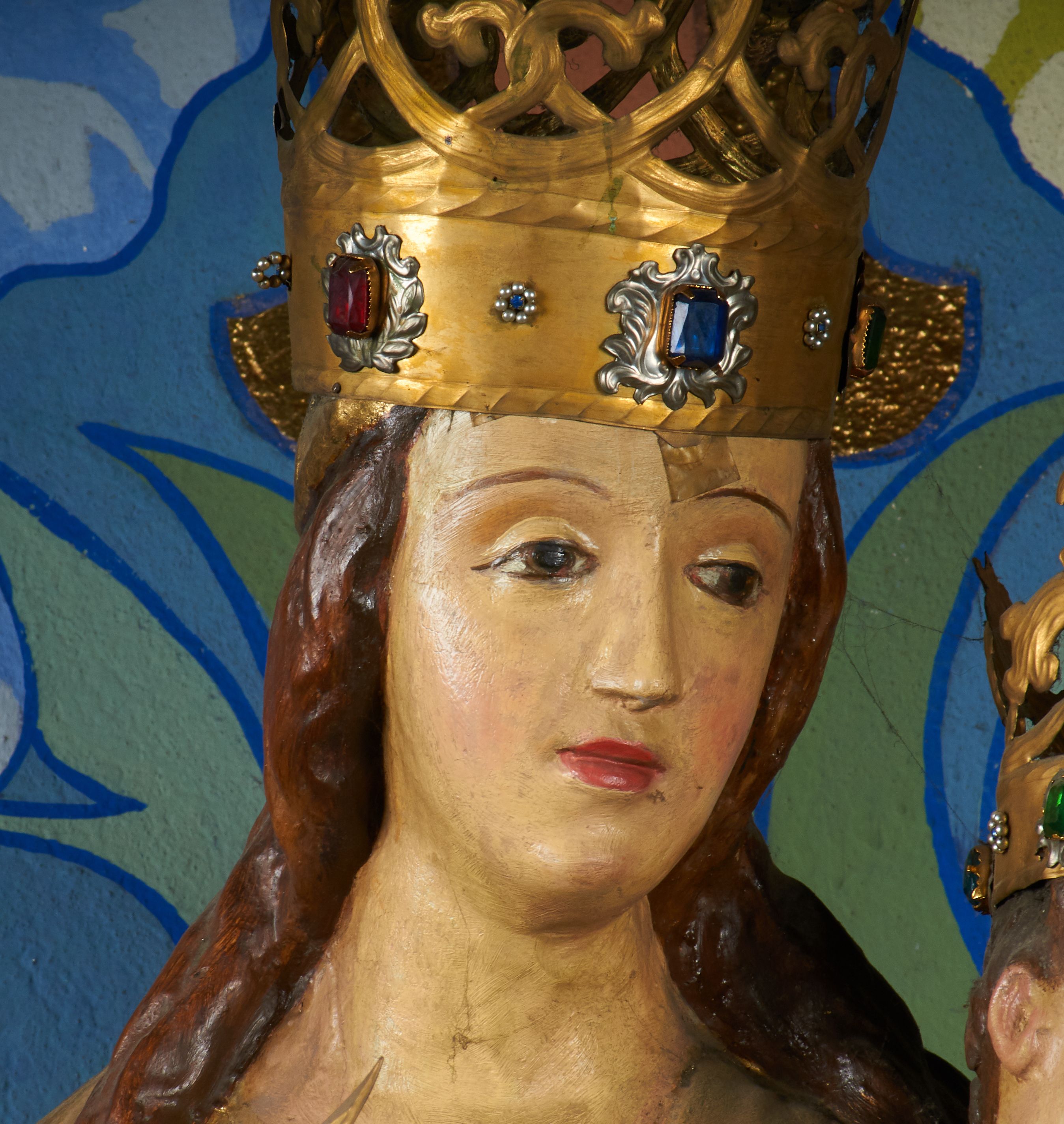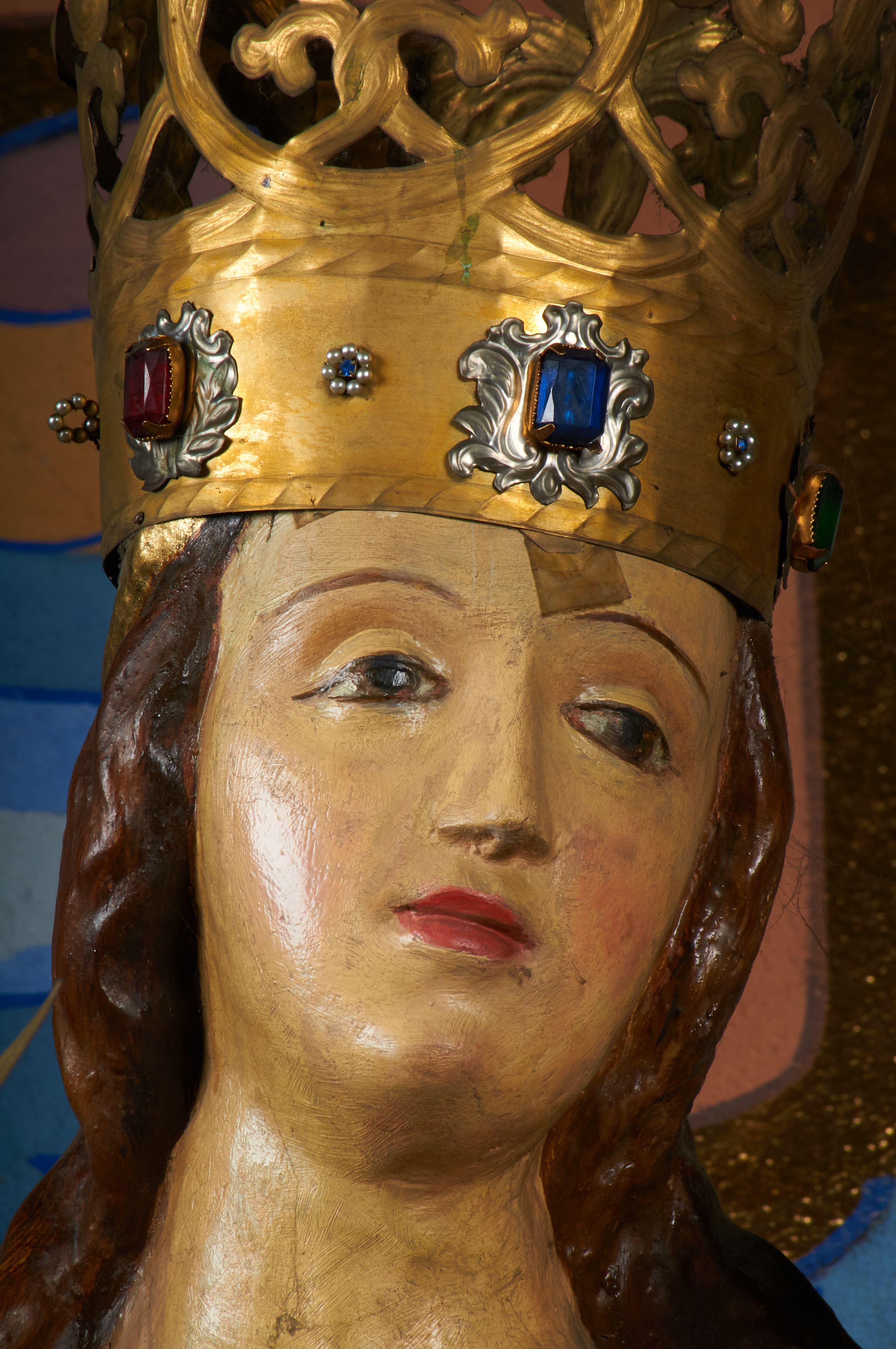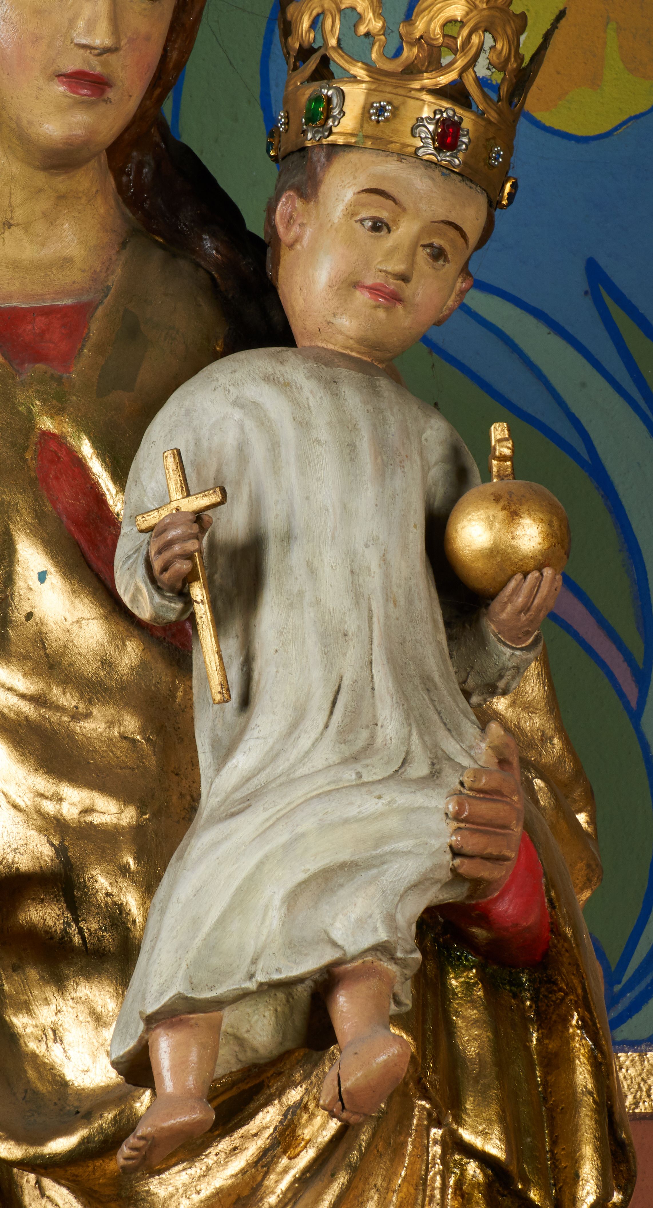 Rzeźba pełnoplastyczna, przyścienna, drążona od tyłu, ustawiona na konsoli. Maria stoi w lekkim kontrapoście, ciężar ciała opierając na lewej nodze, prawą lekko uginając w kolanie. Lewą ręką podtrzymuje siedzące na jej ramieniu Dzieciątko, w prawej ugiętej w łokciu i wysuniętej lekko do przodu trzyma błyskawicę. Twarz pociągła, z długim, prostym, wąskim nosem, oczami o migdałowym wykroju, regularnymi łukami brwiowymi oraz wąskimi ustami, okolona długimi, ciemnobrązowymi włosami, z przedziałkiem pośrodku głowy, opadającymi na ramiona dwoma skręcającymi się w pukle pasmami. Maria ubrana w długą, czerwoną suknię z wąskimi rękawami oraz złoty płaszcz spięty na piersi, przerzucony z przodu przez lewe ramię, układający się pośrodku w trzy płytkie misowe fałdy, po bokach formujący się w dwa festony. Dzieciątko siedzi wyprostowane w ramionach Matki, zwrócone przodem do widza, w prawej rączce trzymając krzyż, w lewej jabłko królewskie. Głowa pochylona lekko na lewe ramię; okrągła twarz z małym, zadartym nosem, wąskimi ustami, niewielkimi oczami i regularnymi łukami brwiowymi, okolona krótkimi ciemnobrązowymi włosami. Jezus ubrany w długą białą szatę układającą się w proste, bardzo płytkie fałdy. Na głowach nowsze korony otwarte.