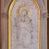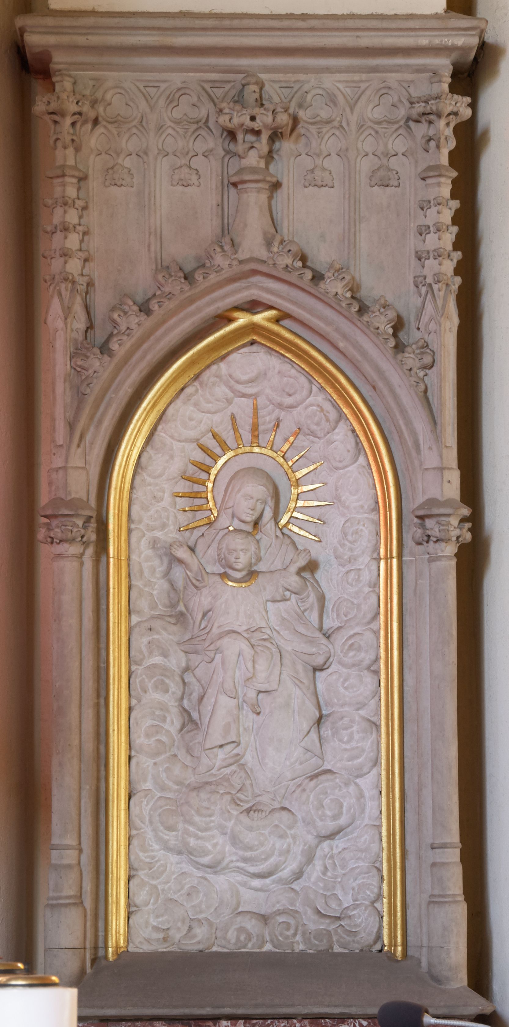 Płaskorzeźba w kształcie prostokąta zamkniętego ostrołukowo. Przedstawienie tronującej na obłokach Matki Boskiej z Dzieciątkiem. Jezus, ubrany w długą sukienkę z długimi rękawami, siedzi na kolanach Marii z uniesionymi rozłożonymi na boki ramionami. Wokół głowy Marii złocony nimb w kształcie okręgu z promieniami wokół.