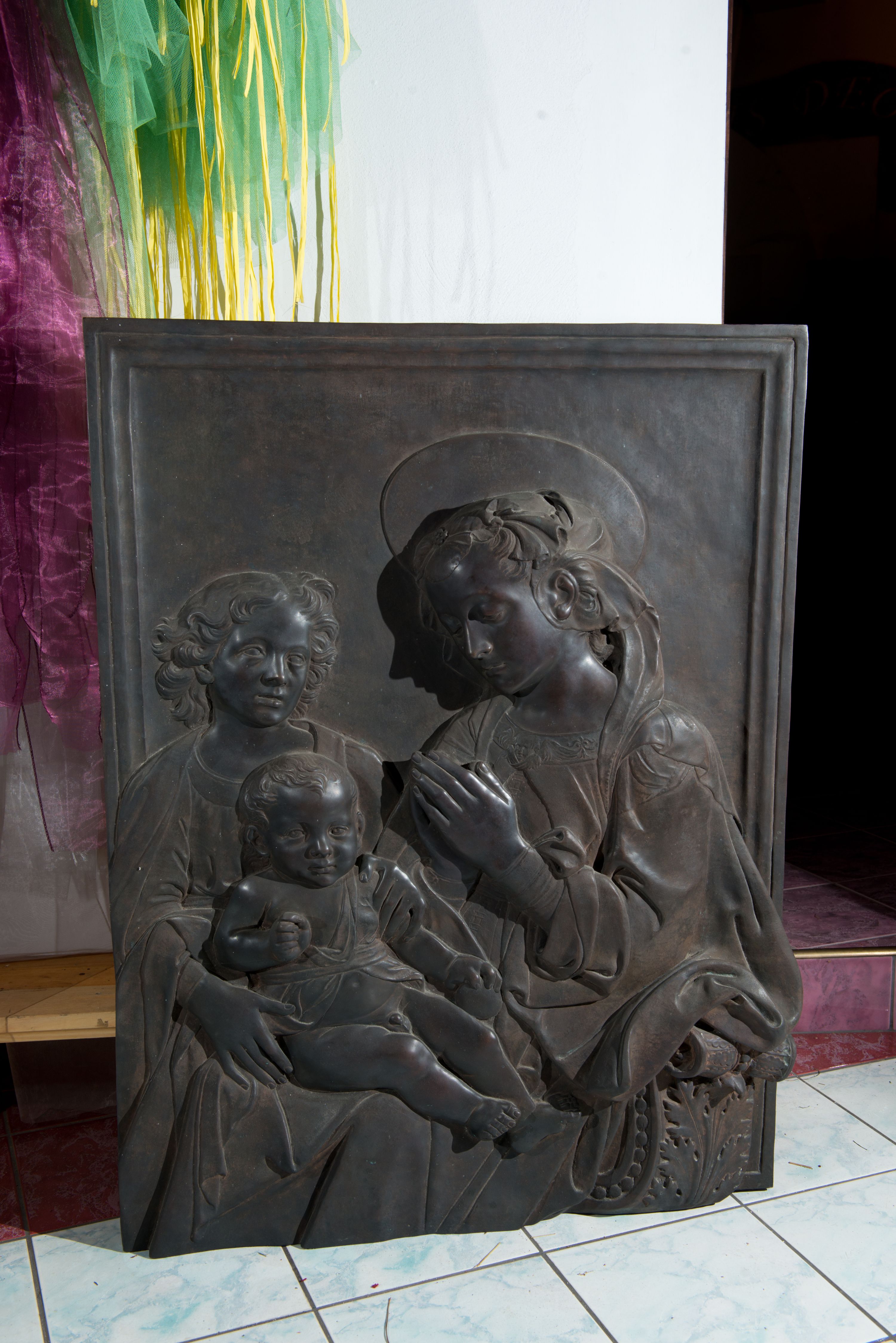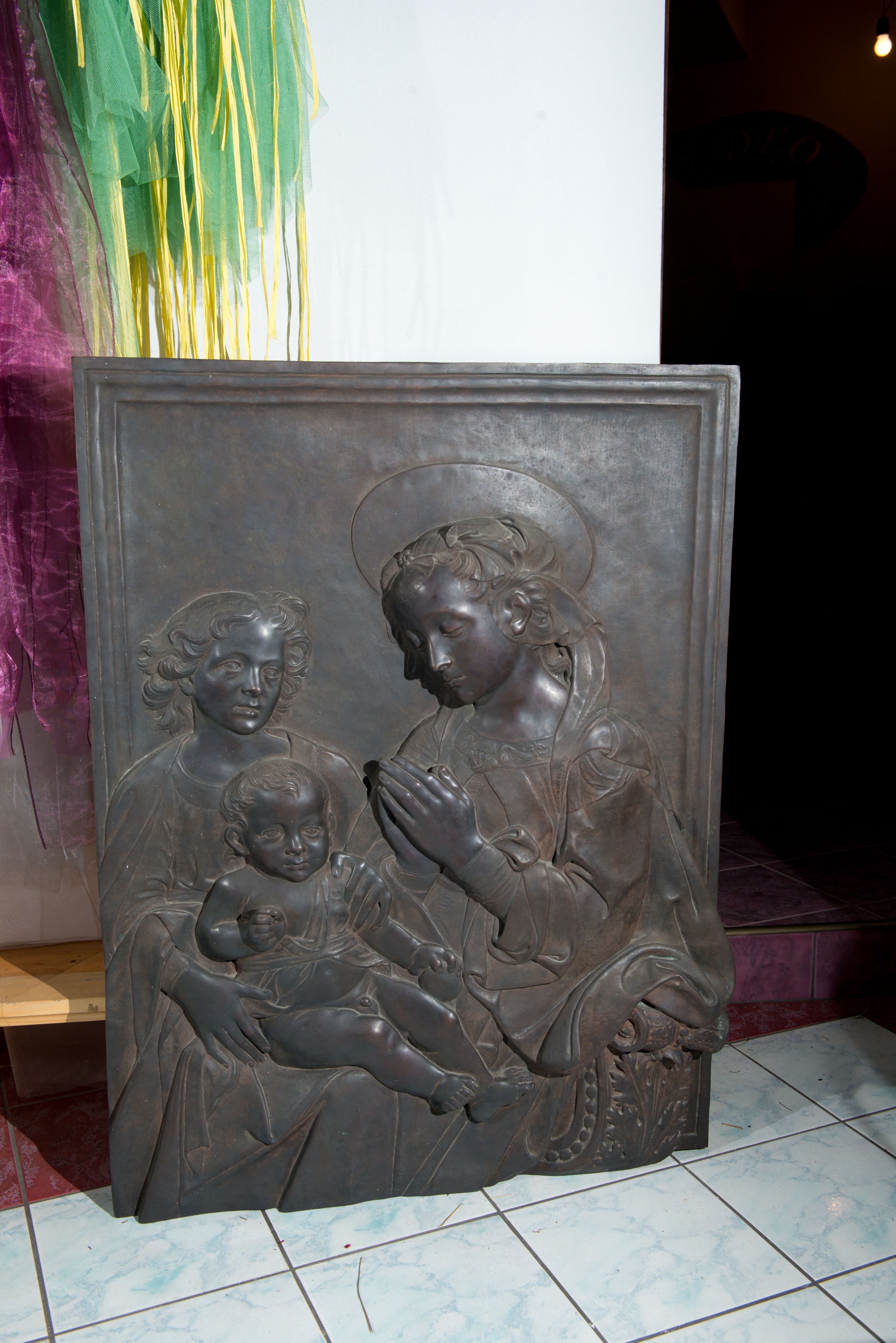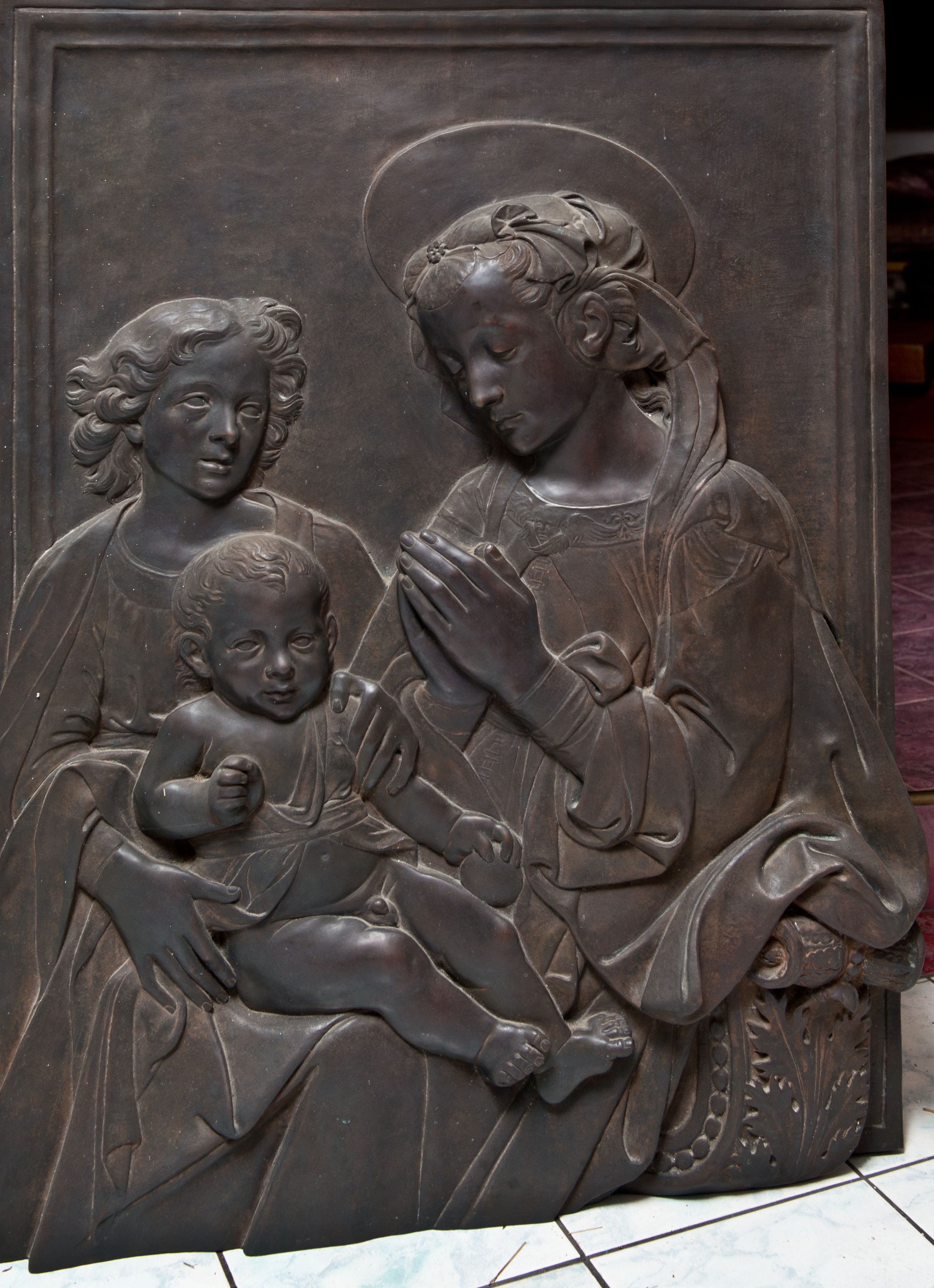 Relief powstał w wyniku odlewu. Uzyskał on kształt stojącego prostokąta ujętego profilowaną ramą. W centrum kompozycji wyobrażono adorującą Matkę Boską Dzieciątko Jezus. Siedzącą w półpostaci Marię ukazano w trzech czwartych w lewo. Jest to młoda kobieta, która na wysokości piersi trzyma złożone modlitewnie dłonie. Na jej kolanach siedzi mały Jezus podtrzymywany przez stojącego za nim młodzieńca. Twarz Madonny charakteryzują miękkie rysy, wysokie czoło, prosty nos i wydatne usta. Spojrzenie jej półprzymkniętych oczu skierowane jest na Jezusa. Falujące włosy otaczające głowę i odsłaniające lewe ucho, ukryte są pod delikatną chustą zawiązaną na głowie, której fragment opada na lewe ramię. Maria ubrana jest w suknię obszytą pod szyją haftowaną taśmą z widoczną na przedzie główką serafina oraz luźny płaszcz opadający miękkimi fałdami na ramię i widoczny fragment oparcia krzesła nożycowego. Nad głową Marii widoczny jest zaznaczony za pomocą lini nimb talerzowy.