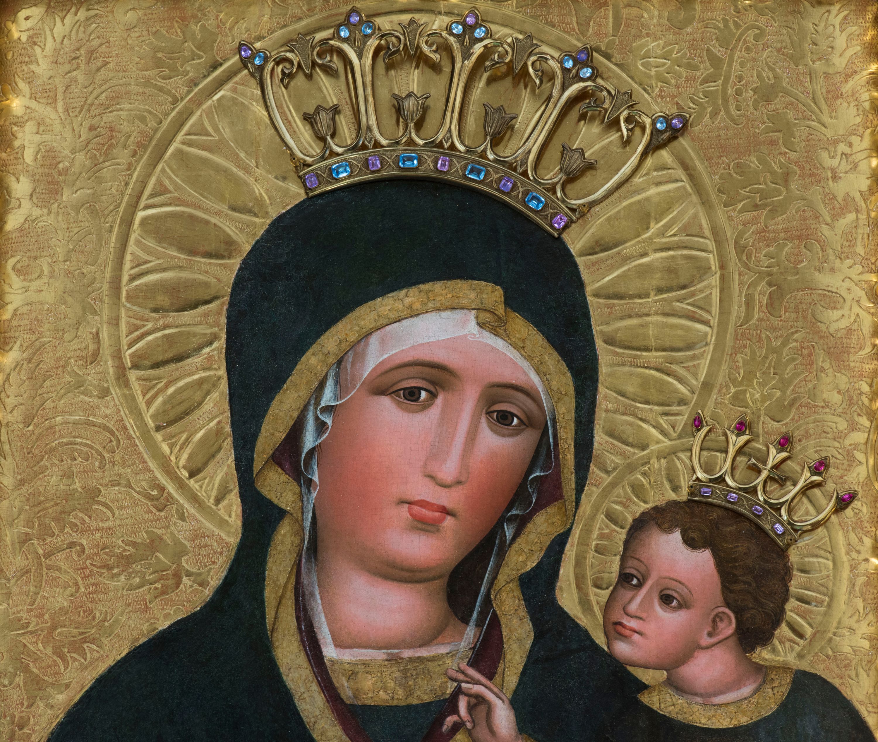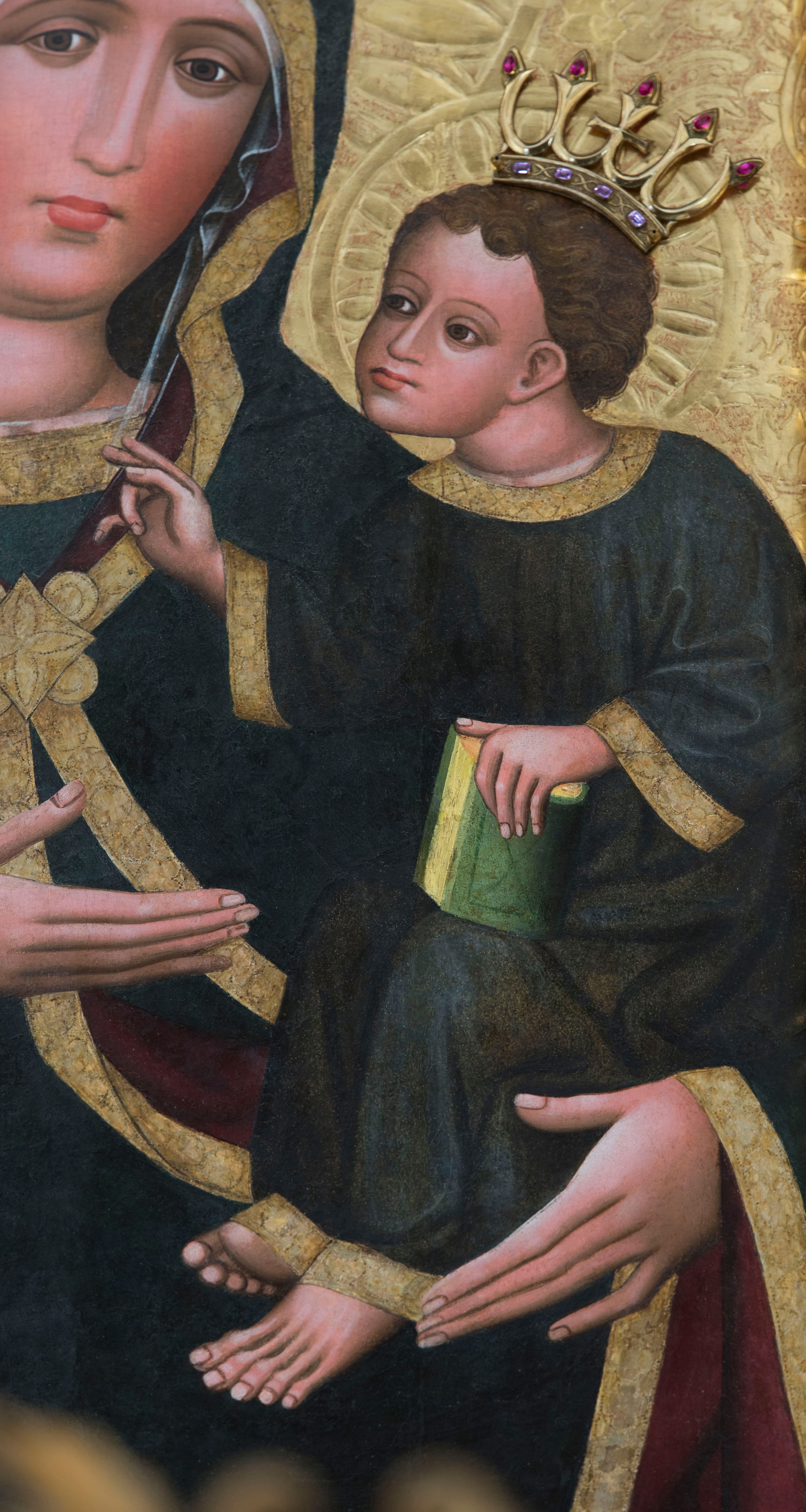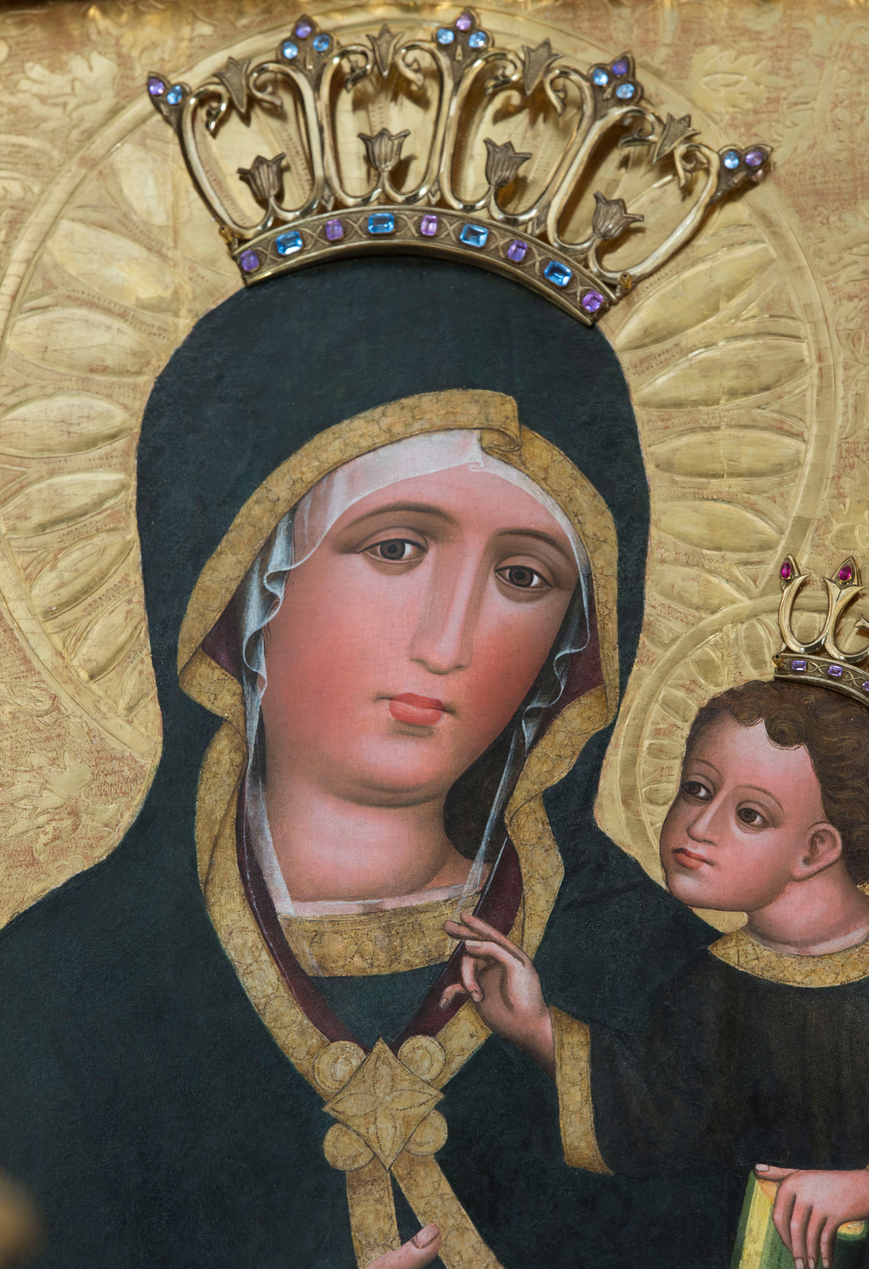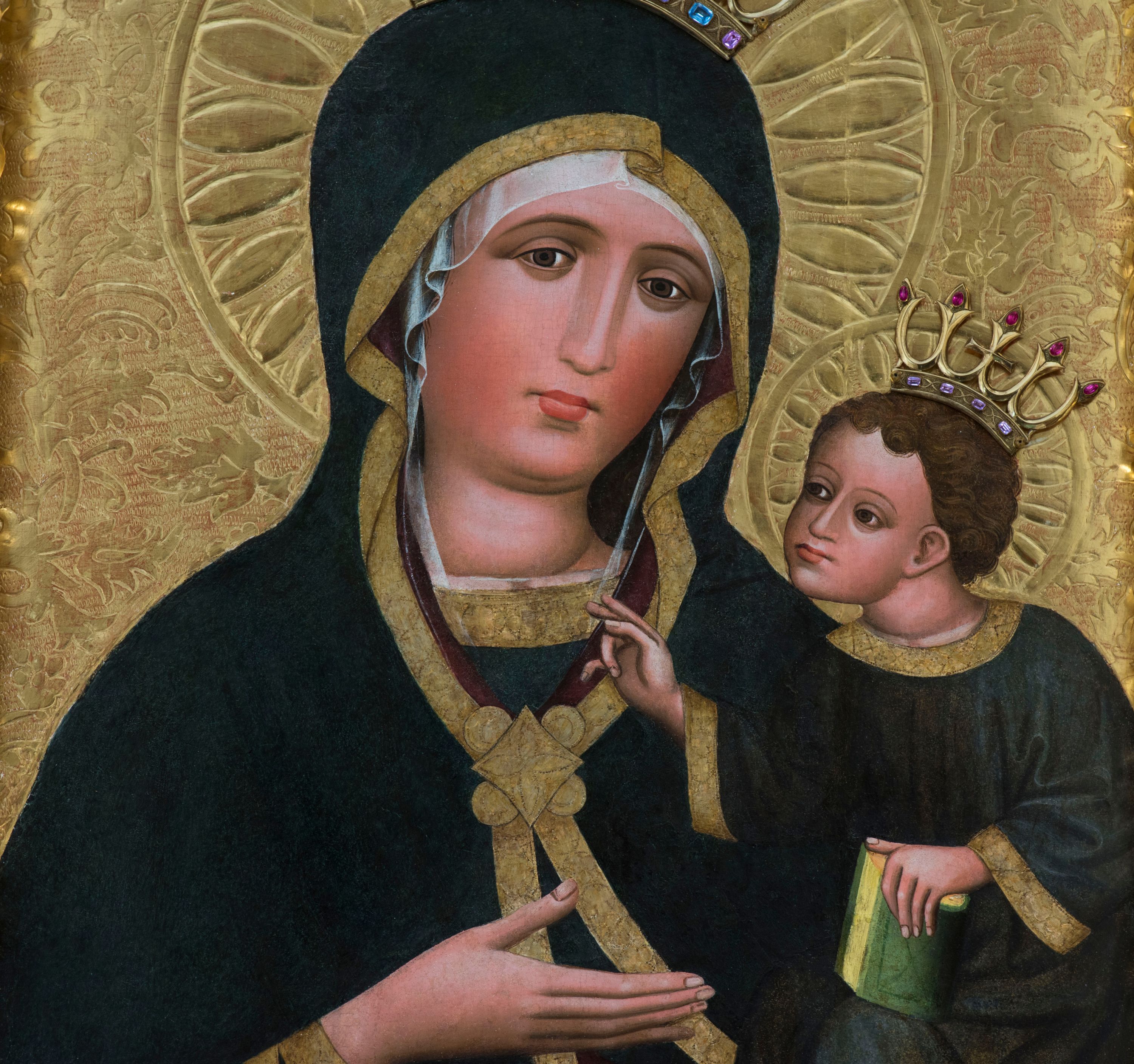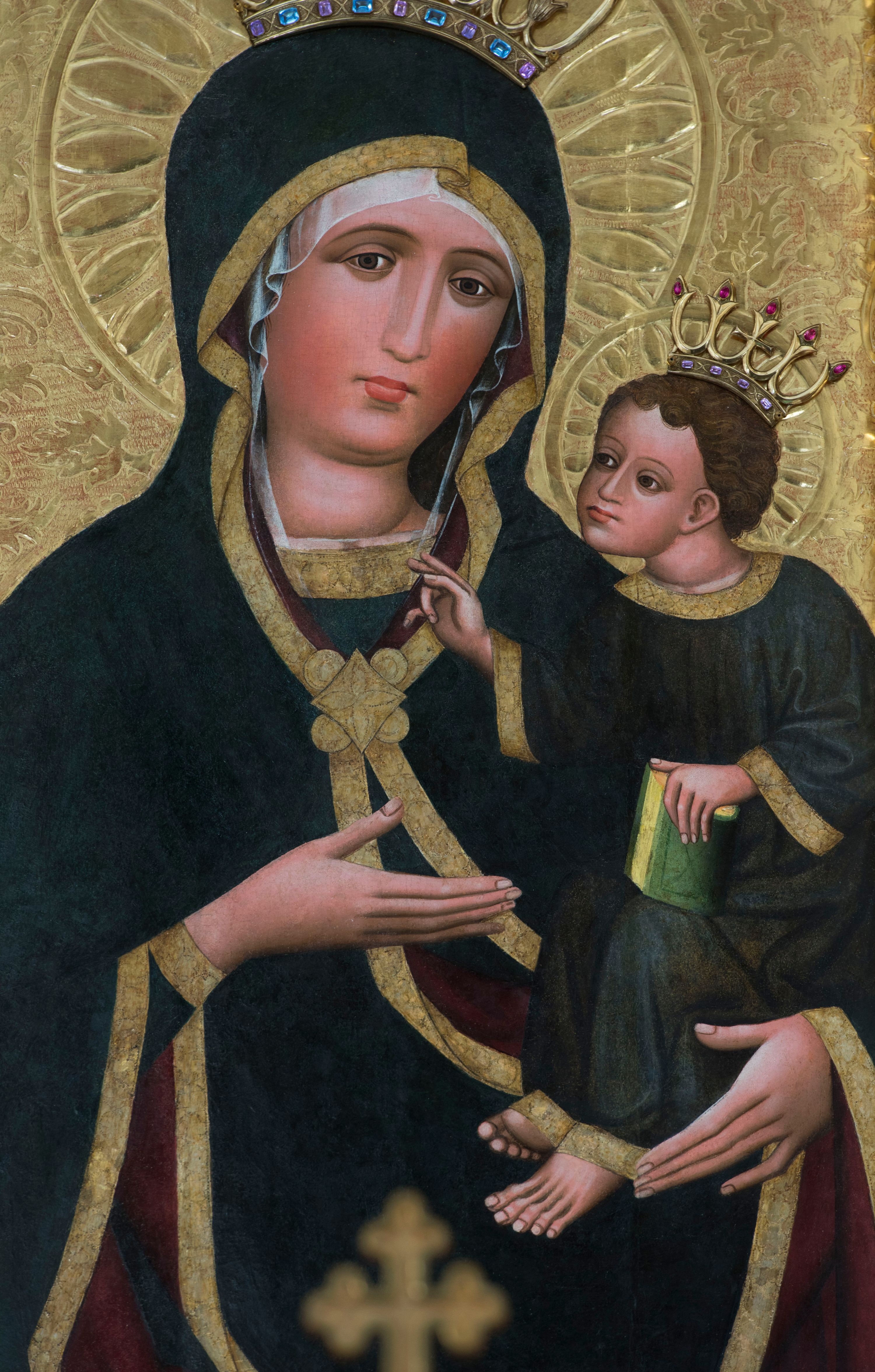 Obraz w kształcie stojącego prostokąta z półpostaciowym przedstawieniem Madonny podtrzymującej lewą ręką Dzieciątko Jezus. Maria ukazana jest na wprost, lekko przechyloną w lewo głowę charakteryzuje owalna, pociągła twarz o wyrazistych oczach z nieznacznie przymkniętymi powiekami, długim, prostym nosie, niewielkich ustach o opadających kącikach, wyraźnie zaróżowionych policzkach oraz subtelnie zaznaczonym podbródku. Maria ubrana jest w ciemnogranatową suknię z szerokimi, dekoracyjnymi, złoconymi obszyciami dekoltu i wąskich mankietów. Na jej głowie jest biała, półprzejrzysta chusta widoczna spod osłaniającego całą sylwetkę ciemnogranatowego płaszcza o bordowej podszewce i szerokiej, złoconej, dekoracyjnej lamówce, spiętego na piersiach dużą, złoconą broszą w kształcie rombu z czterema kółkami przylegającymi do jego lekko wklęsłych boków. Prawą ręką o smukłej, wyprostowanej dłoni Maria wskazuje na trzymane na lewej ręce siedzące Dzieciątko. Zwrócony w trzech czwartych w prawo Jezus lekko pochyla się do przodu. Pociągłą, o trójkątnym obrysie szczęki twarz charakteryzują duże, wyraziste oczy o nieznacznie przymkniętych powiekach, długi, prosty nos oraz niewielkie usta. Krótkie, brązowe, skręcone włosy opadają parą pukli na czoło Dzieciątka. Ubrane jest ono w długą, ciemnogranatową suknię z szerokimi, dekoracyjnymi, złoconymi lamówkami, spod której widoczne są bose stopy. Jezus prawą dłoń unosi w geście błogosławieństwa, lewą trzyma wspartą na kolanach zamkniętą księgę w zielonej oprawie. Głowy postaci okalają ryte w gruncie podobrazia nimby z motywami eliptycznych promieni ujętych wąskim okręgiem, dodatkowo wieńczą je złocone, kameryzowane korony otwarte. Złocone tło przedstawienia zdobi grawerowana wić roślinna. Obraz ujęty jest złoconą ramą w formie ażurowego układu liści akantu.