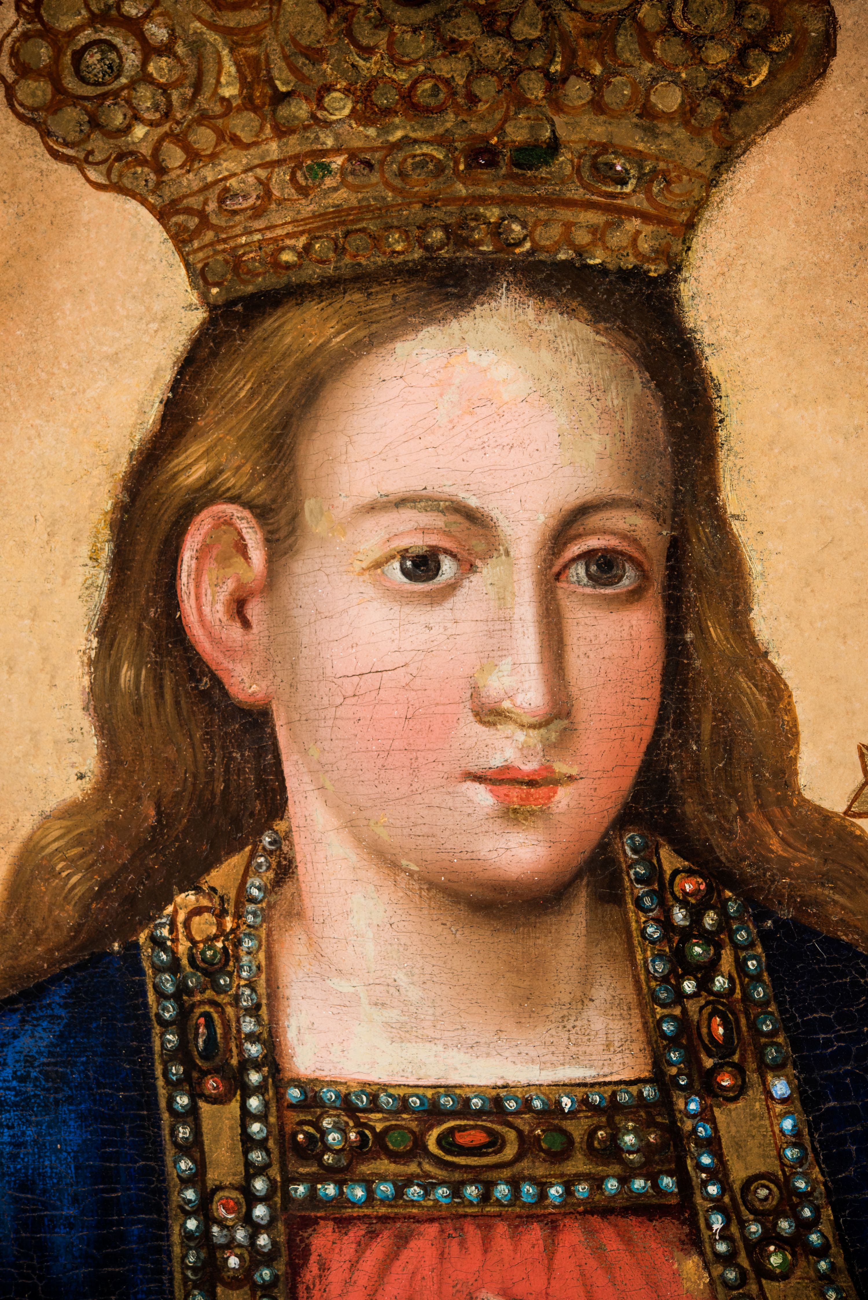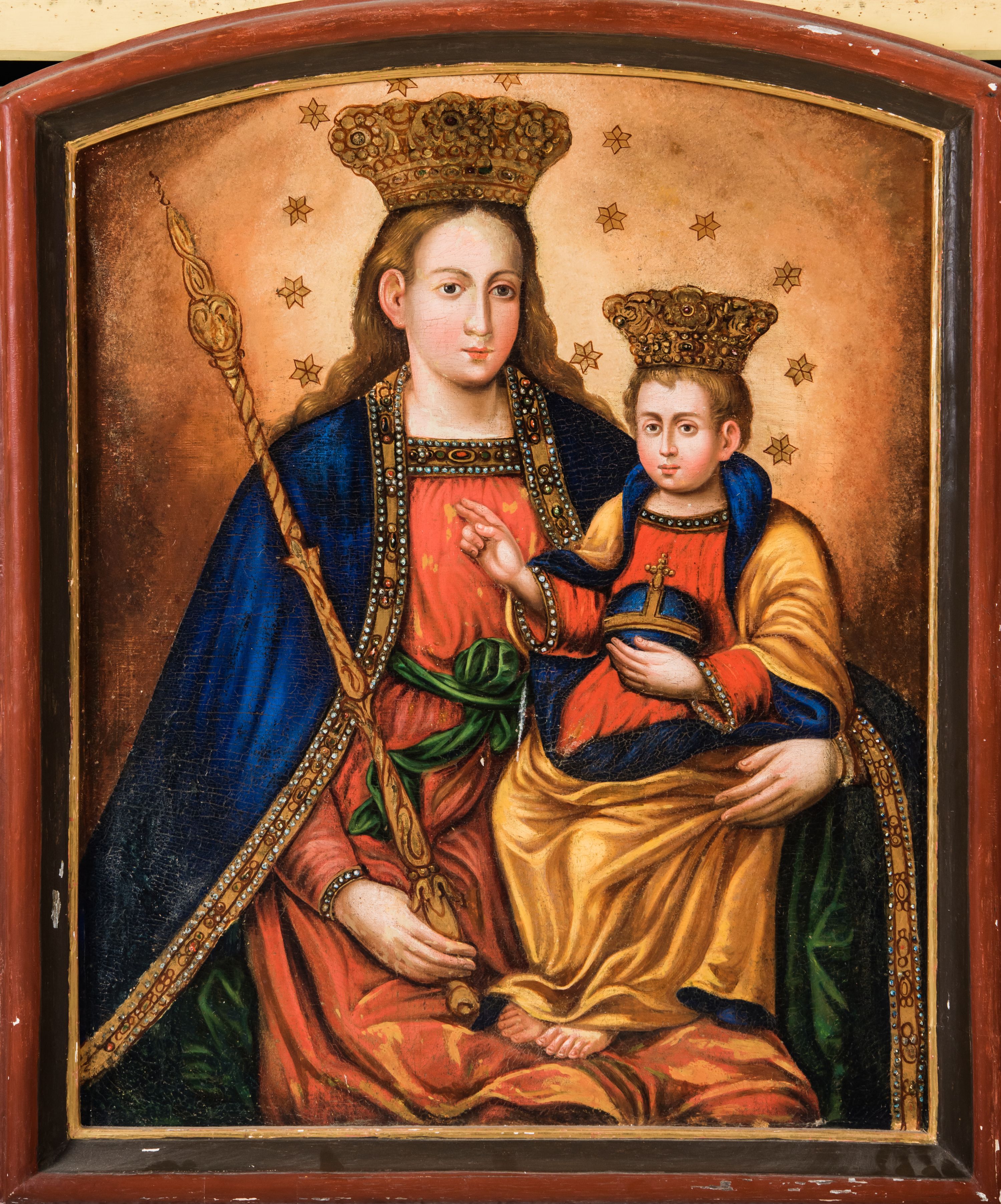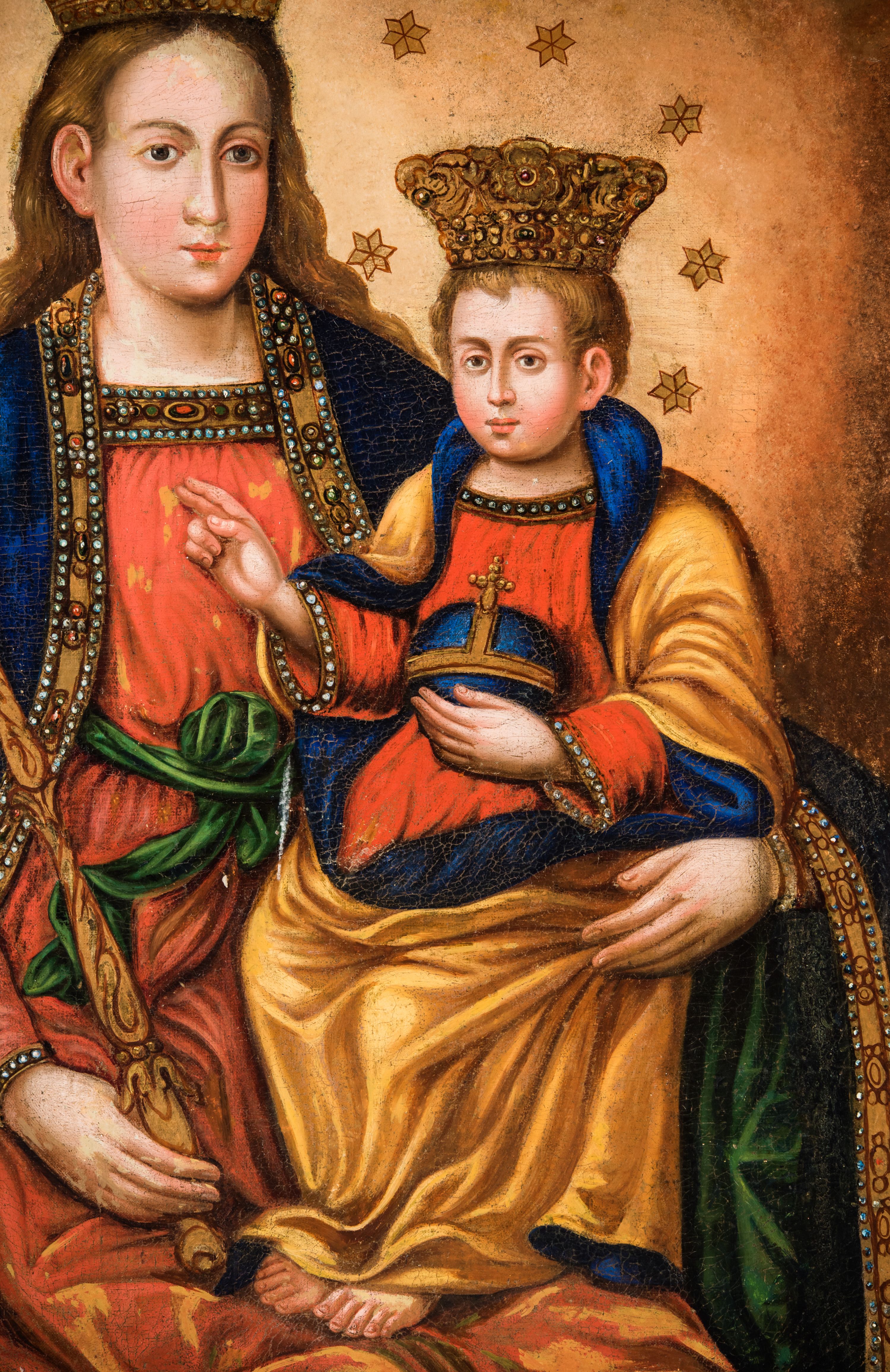 Obraz z połowy XIX wieku przedstawia popularny w Małopolsce od XVII wieku wizerunek Marii z Dzieciątkiem jako Królowej Niebios.