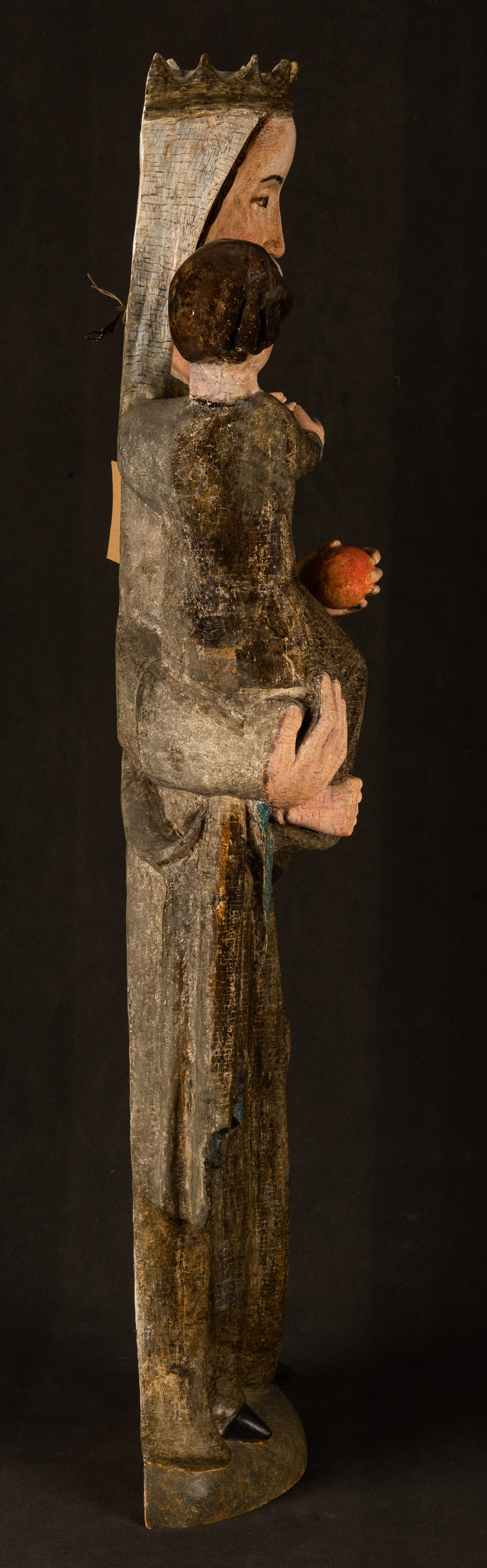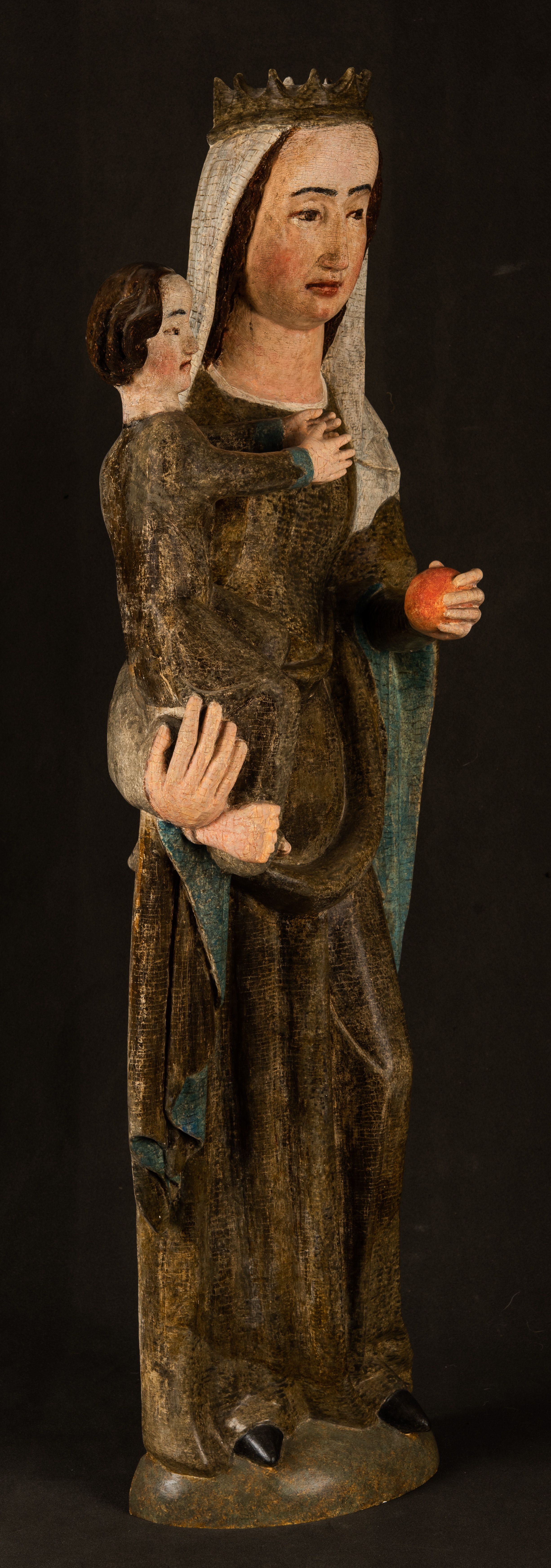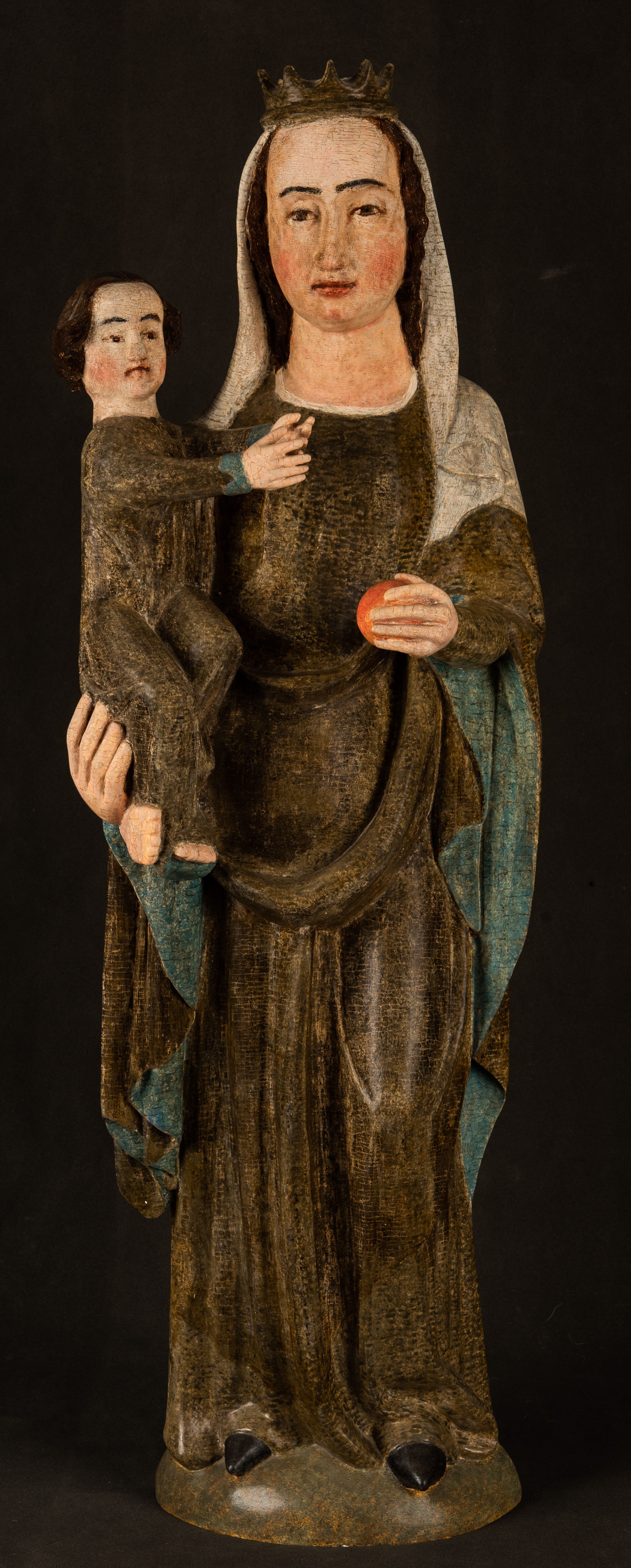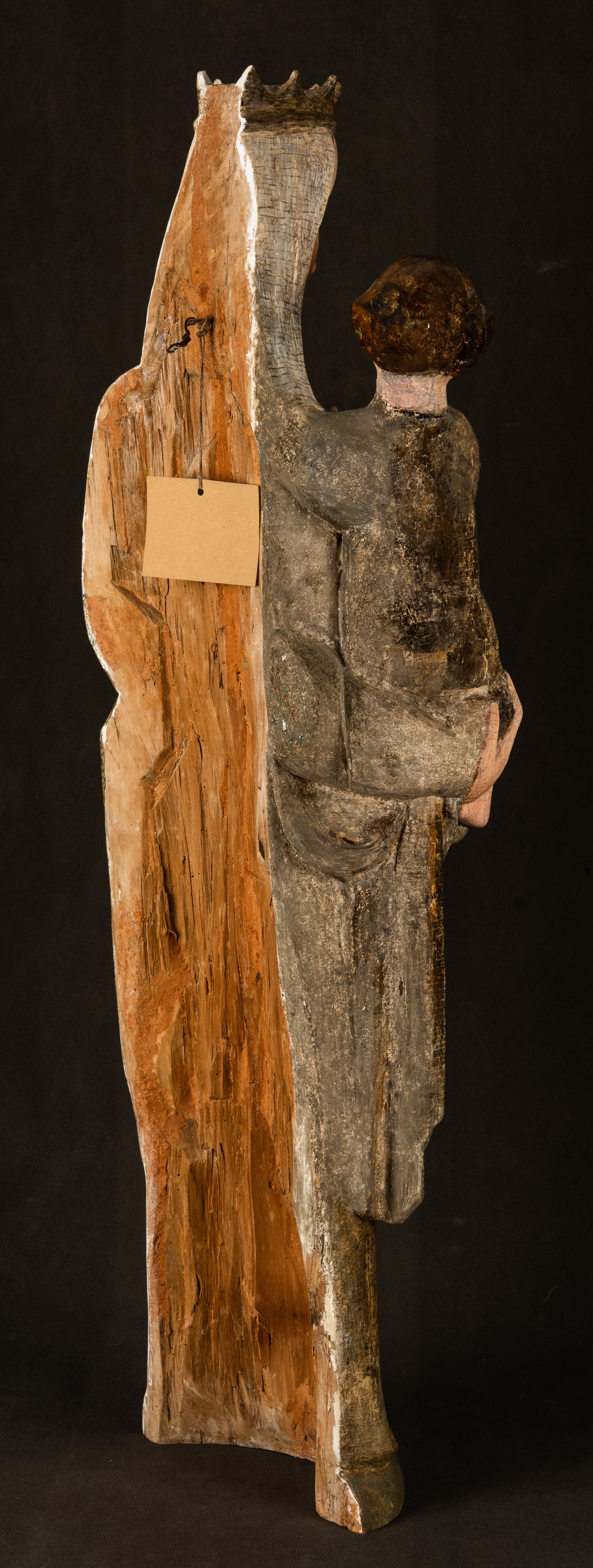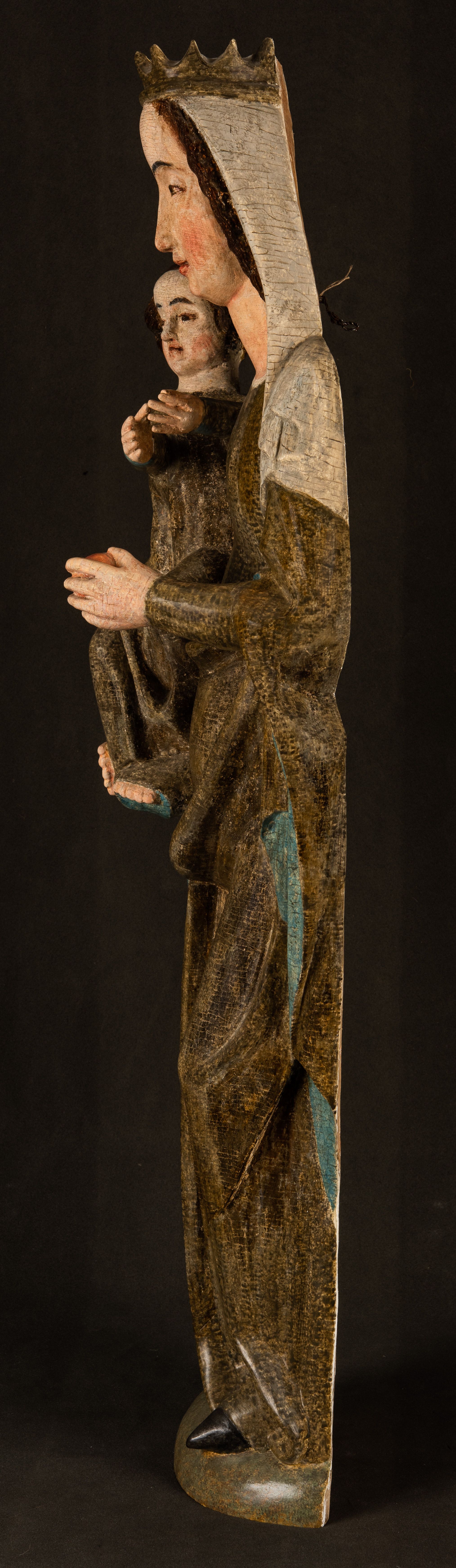 Stojąca figura Matki Boskiej z Dzieciątkiem reprezentuje przykład przyściennej rzeźby z tyłu wydrążonej. Maria stoi w lekkim kontrapoście, podkreślonym wysunięciem do przodu lewego kolana na niewielkim wzgórku. Prawą ręką podtrzymuje Dzieciątko, w lewej dłoni trzyma jabłko. Madonna ma mocno pociągłą twarz o jasnej karnacji z wysokim czołem, rumianych policzkach, długi, prosty nos i wydatne usta. Jej głowa osadzona jest na długiej szyi. Spod białej chusty ubranej na głowę i opadającej na ramiona widać brązowe włosy. Matka Boska na głowie ma koronę o ostrych, krótkich sterczynach. Nałożony na ciemnooliwkową suknię płaszcz w tym samym kolorze, podbity błękitem, tworzy dwa wałkowate zaokrąglone fałdy na brzuchu Marii, spływając miękkimi fałdami spod lewej ręki oraz festonem spod prawej ręki. Niżej fałdy płaszcza i sukni układają się niemal pionowo, opinając materią lewą nogę. Długa suknia odsłania czubki ciżemek. Dzieciątko zostało ujęte w trzech czwartych w prawo. Obie jego rączki wyciągnięte są przed siebie w stronę trzymanego przez Marię jabłka. Z kolei nóżki są skrzyżowane przy stopach. Jezus ma wyrazistą twarz o jasnej karnacji, małym nosem i wydatnych ustach. Jego głowę otaczają brązowe włosy układające się po bokach w charakterystyczne pukle. Jezus ubrany jest w długą, ciemnooliwkową tunikę odsłaniającą fragmenty stóp z charakterystycznymi mankietami przy rękawach. Szaty Matki Boskiej i Dzieciątka są srebrzone i laserowane.