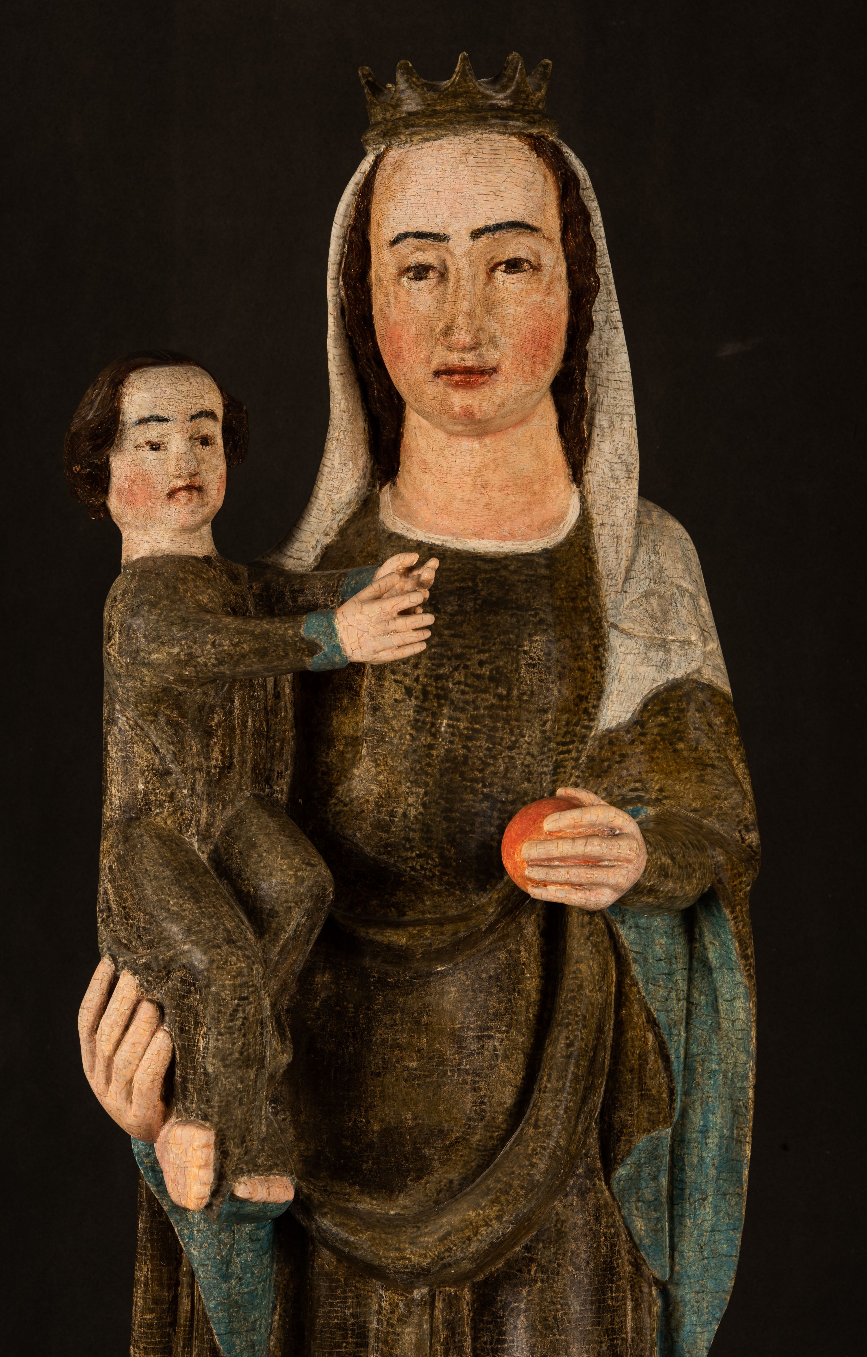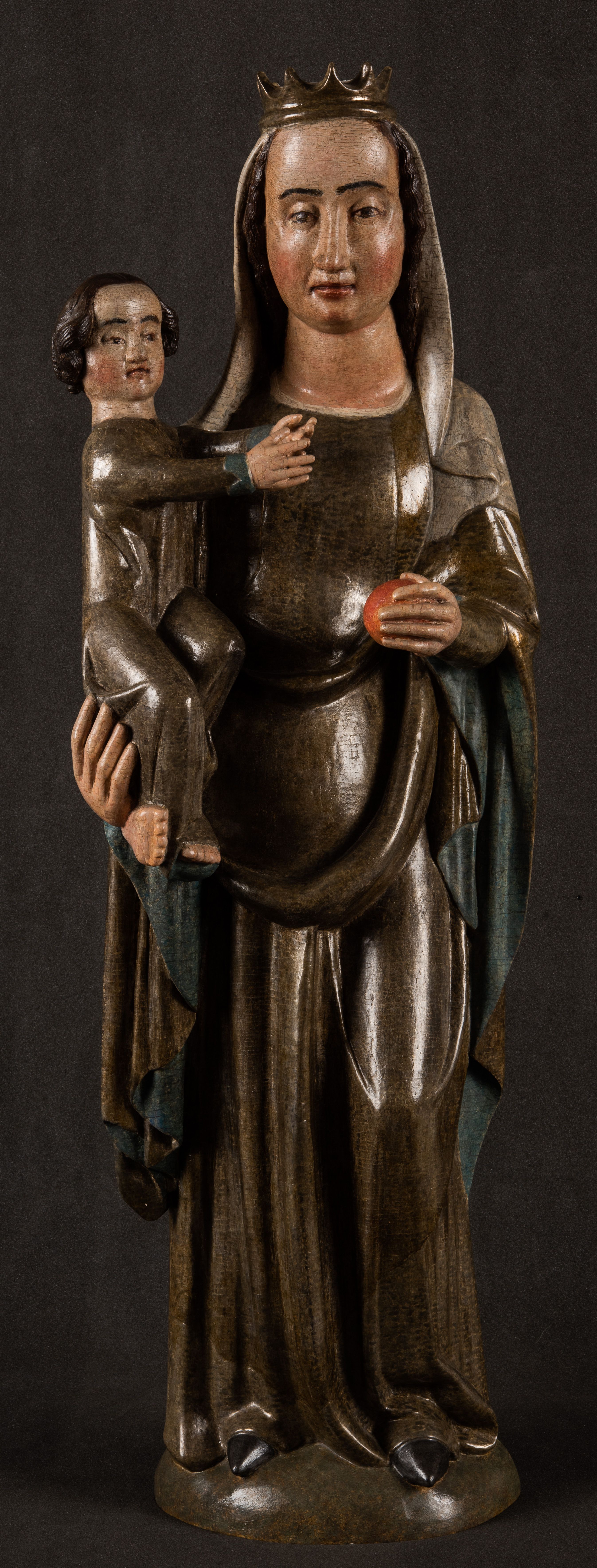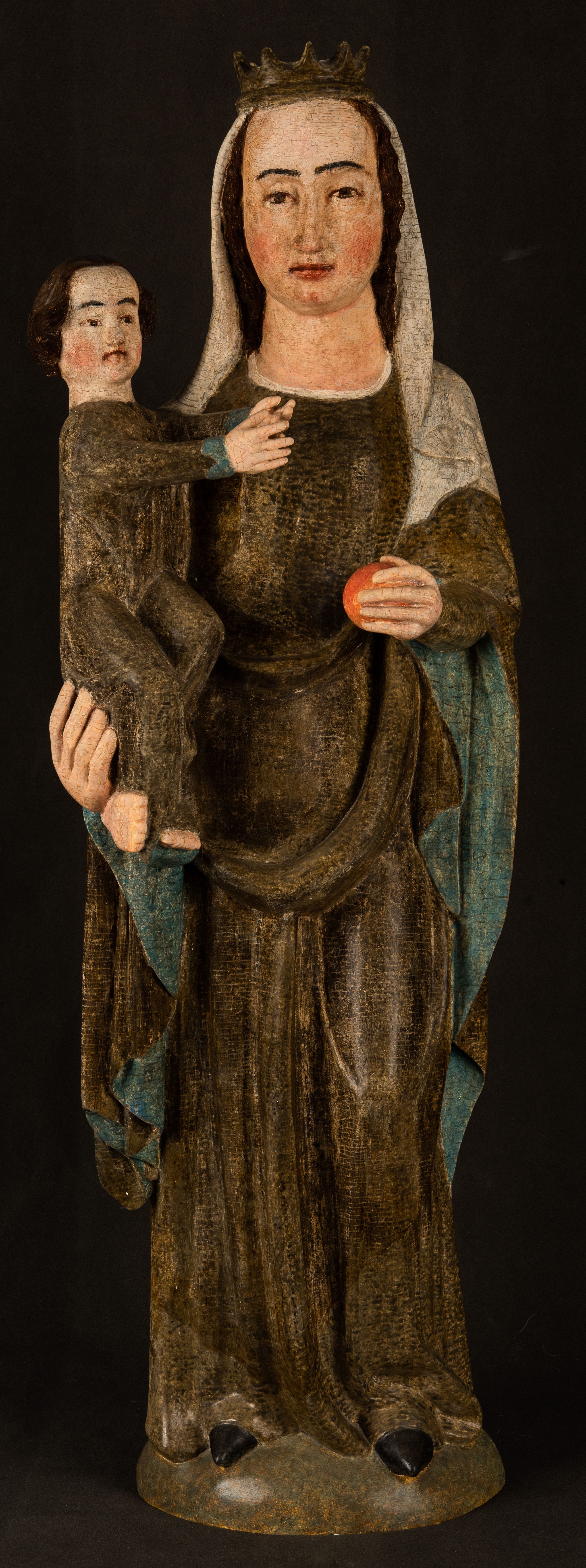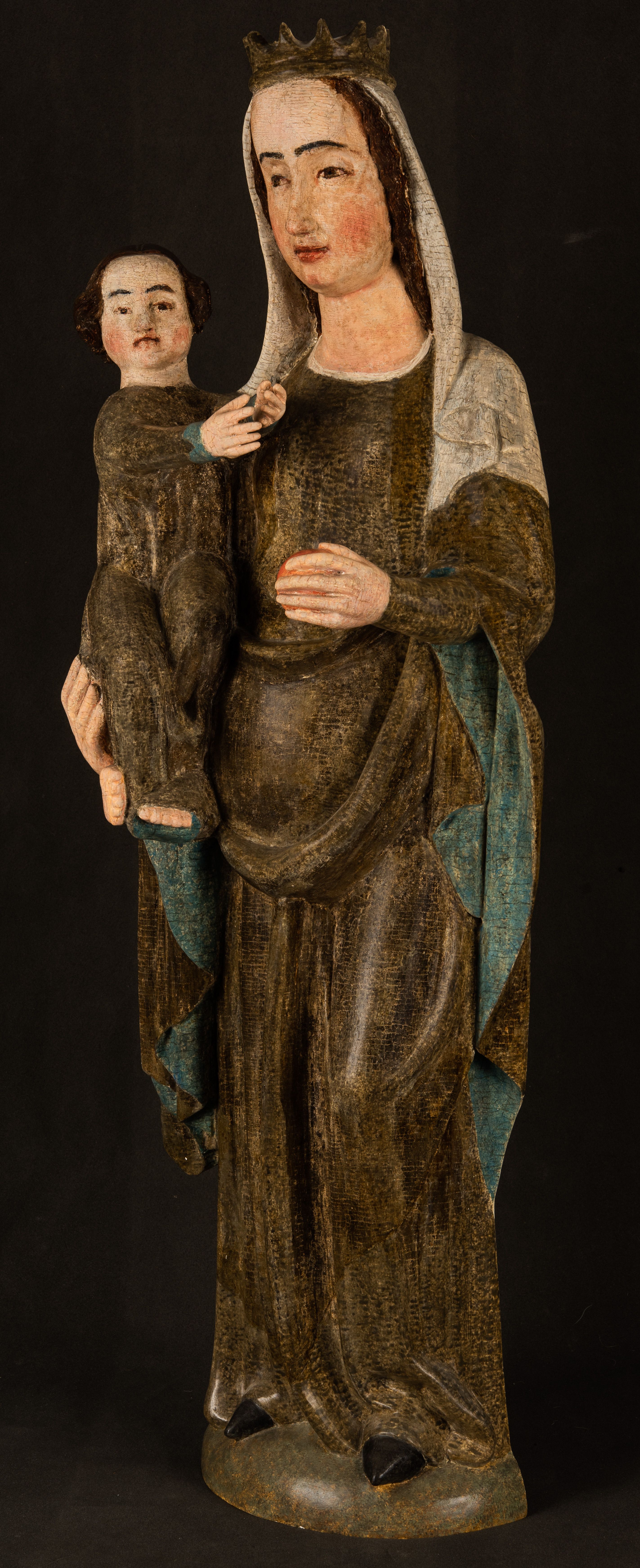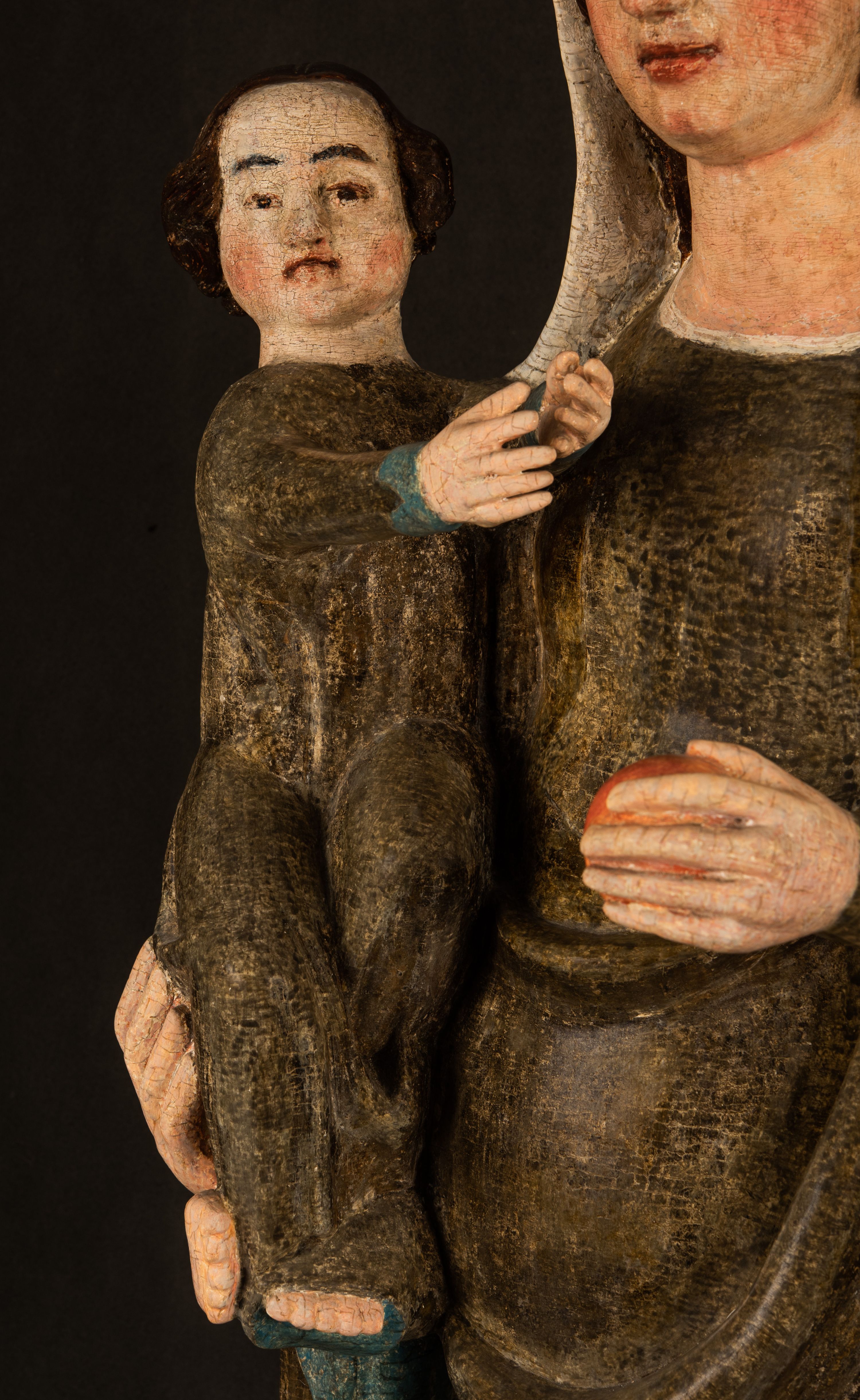 Stojąca figura Matki Boskiej z Dzieciątkiem reprezentuje przykład przyściennej rzeźby z tyłu wydrążonej. Maria stoi w lekkim kontrapoście, podkreślonym wysunięciem do przodu lewego kolana na niewielkim wzgórku. Prawą ręką podtrzymuje Dzieciątko, w lewej dłoni trzyma jabłko. Madonna ma mocno pociągłą twarz o jasnej karnacji z wysokim czołem, rumianych policzkach, długi, prosty nos i wydatne usta. Jej głowa osadzona jest na długiej szyi. Spod białej chusty ubranej na głowę i opadającej na ramiona widać brązowe włosy. Matka Boska na głowie ma koronę o ostrych, krótkich sterczynach. Nałożony na ciemnooliwkową suknię płaszcz w tym samym kolorze, podbity błękitem, tworzy dwa wałkowate zaokrąglone fałdy na brzuchu Marii, spływając miękkimi fałdami spod lewej ręki oraz festonem spod prawej ręki. Niżej fałdy płaszcza i sukni układają się niemal pionowo, opinając materią lewą nogę. Długa suknia odsłania czubki ciżemek. Dzieciątko zostało ujęte w trzech czwartych w prawo. Obie jego rączki wyciągnięte są przed siebie w stronę trzymanego przez Marię jabłka. Z kolei nóżki są skrzyżowane przy stopach. Jezus ma wyrazistą twarz o jasnej karnacji, małym nosem i wydatnych ustach. Jego głowę otaczają brązowe włosy układające się po bokach w charakterystyczne pukle. Jezus ubrany jest w długą, ciemnooliwkową tunikę odsłaniającą fragmenty stóp z charakterystycznymi mankietami przy rękawach. Szaty Matki Boskiej i Dzieciątka są srebrzone i laserowane.