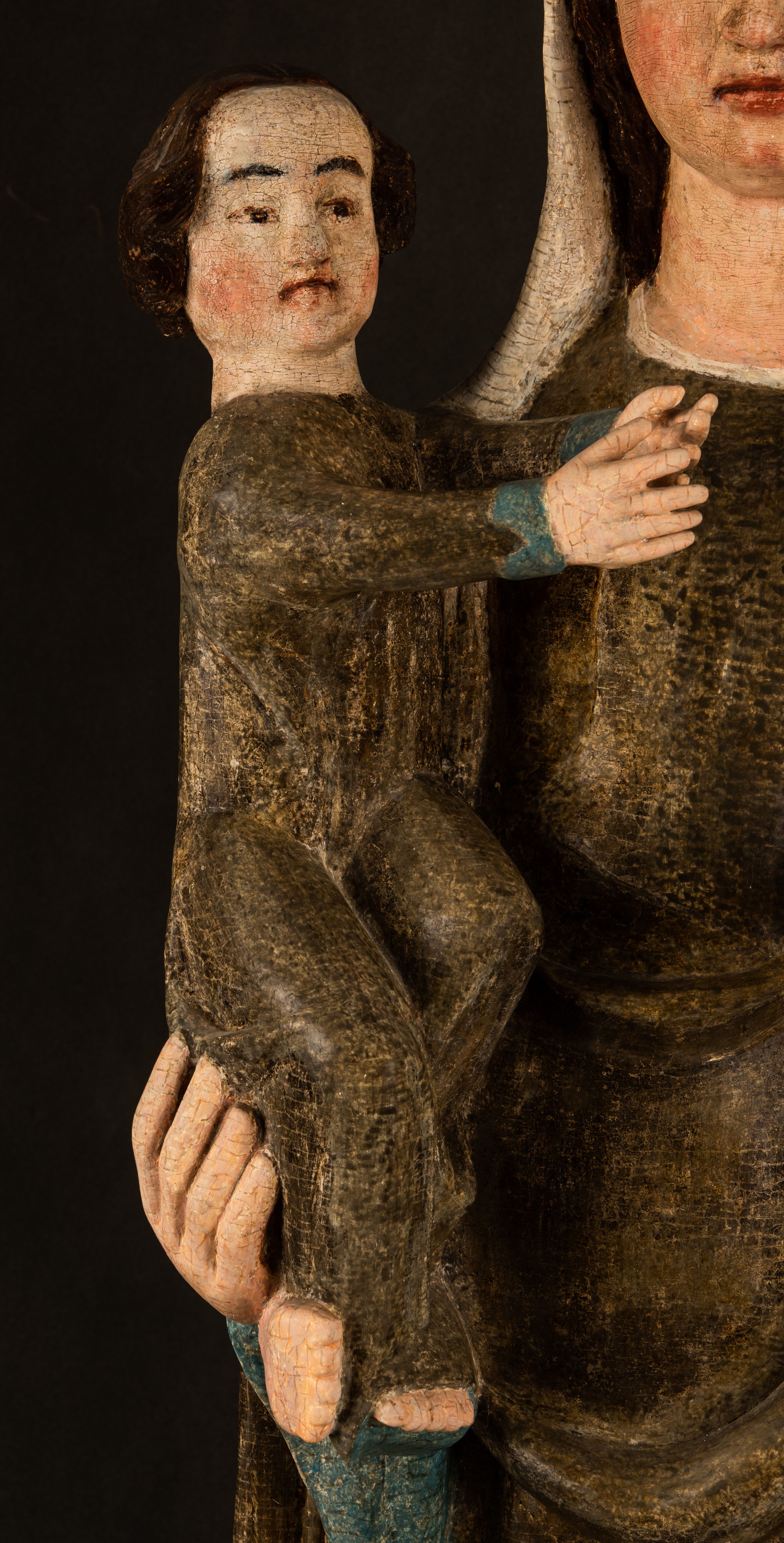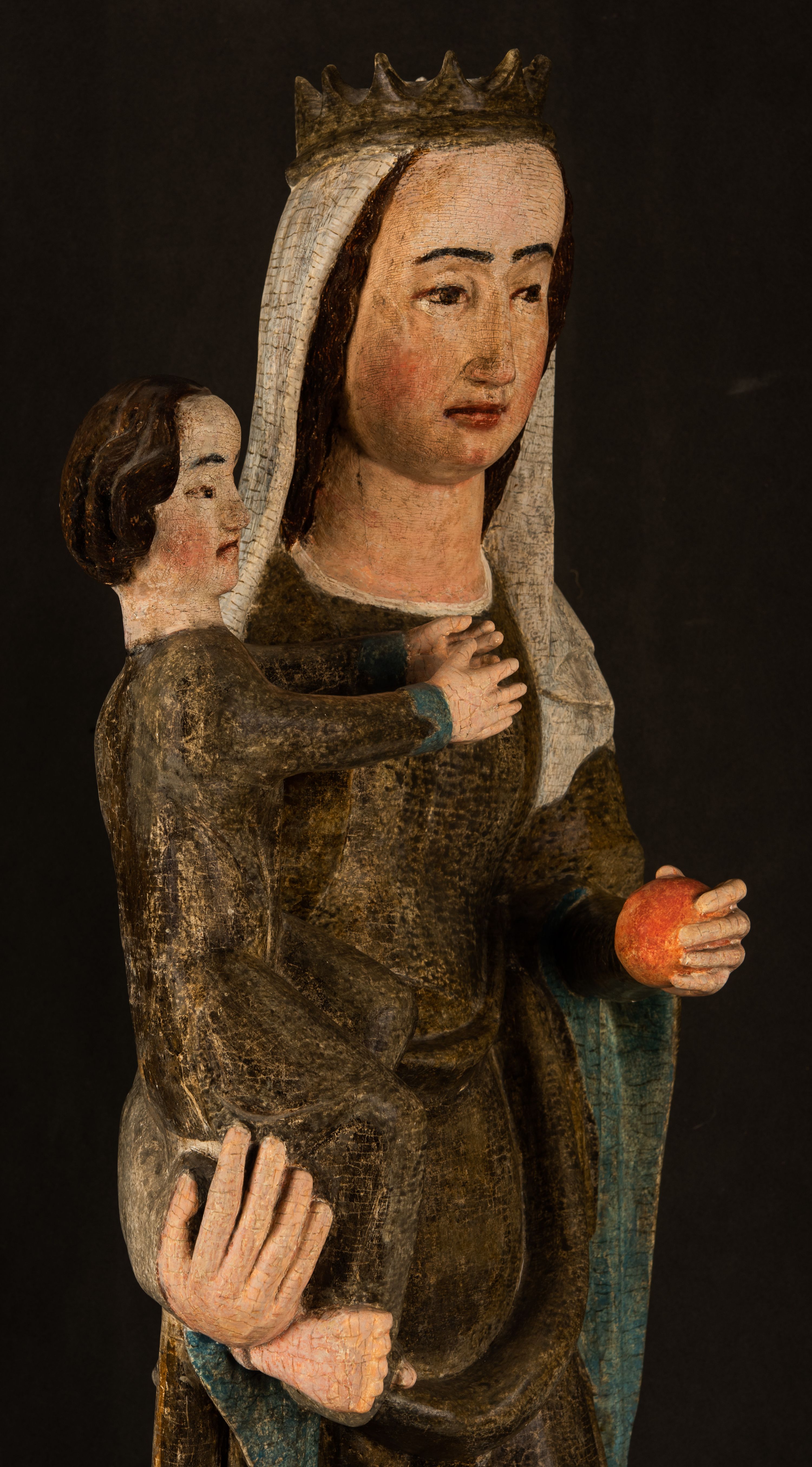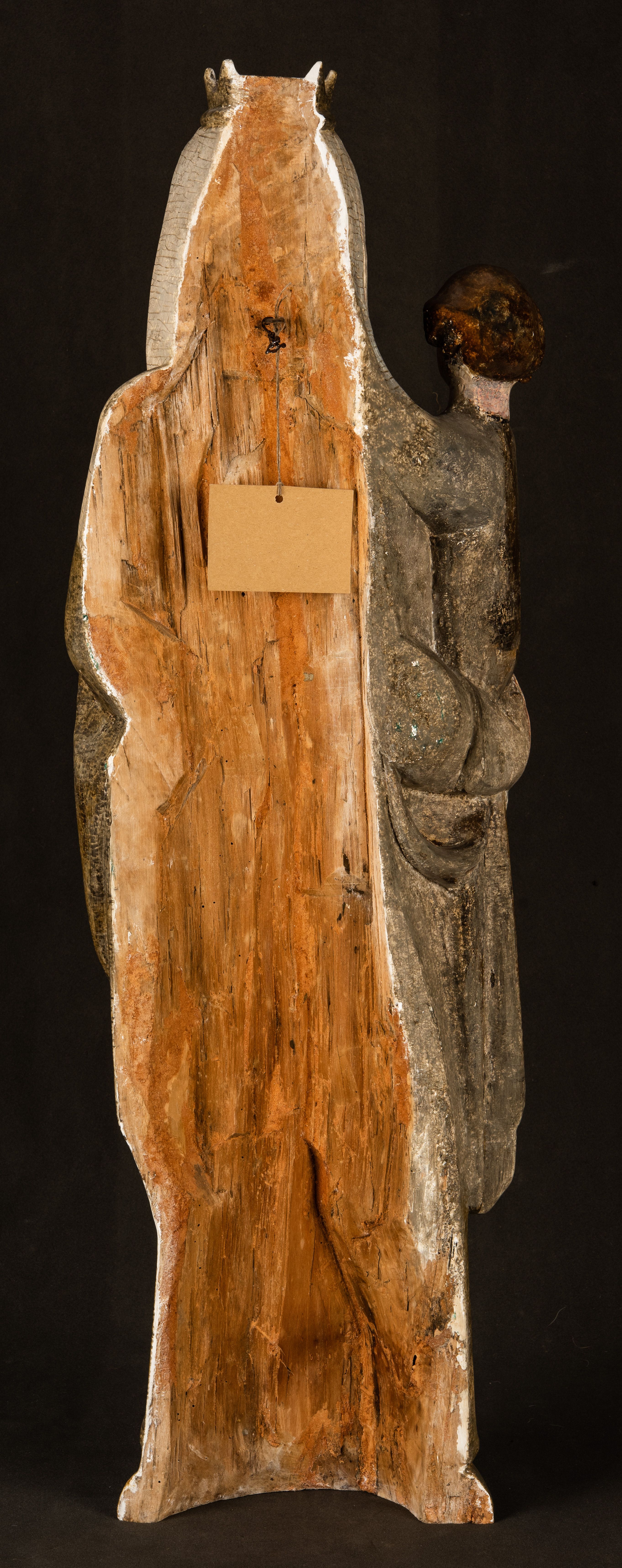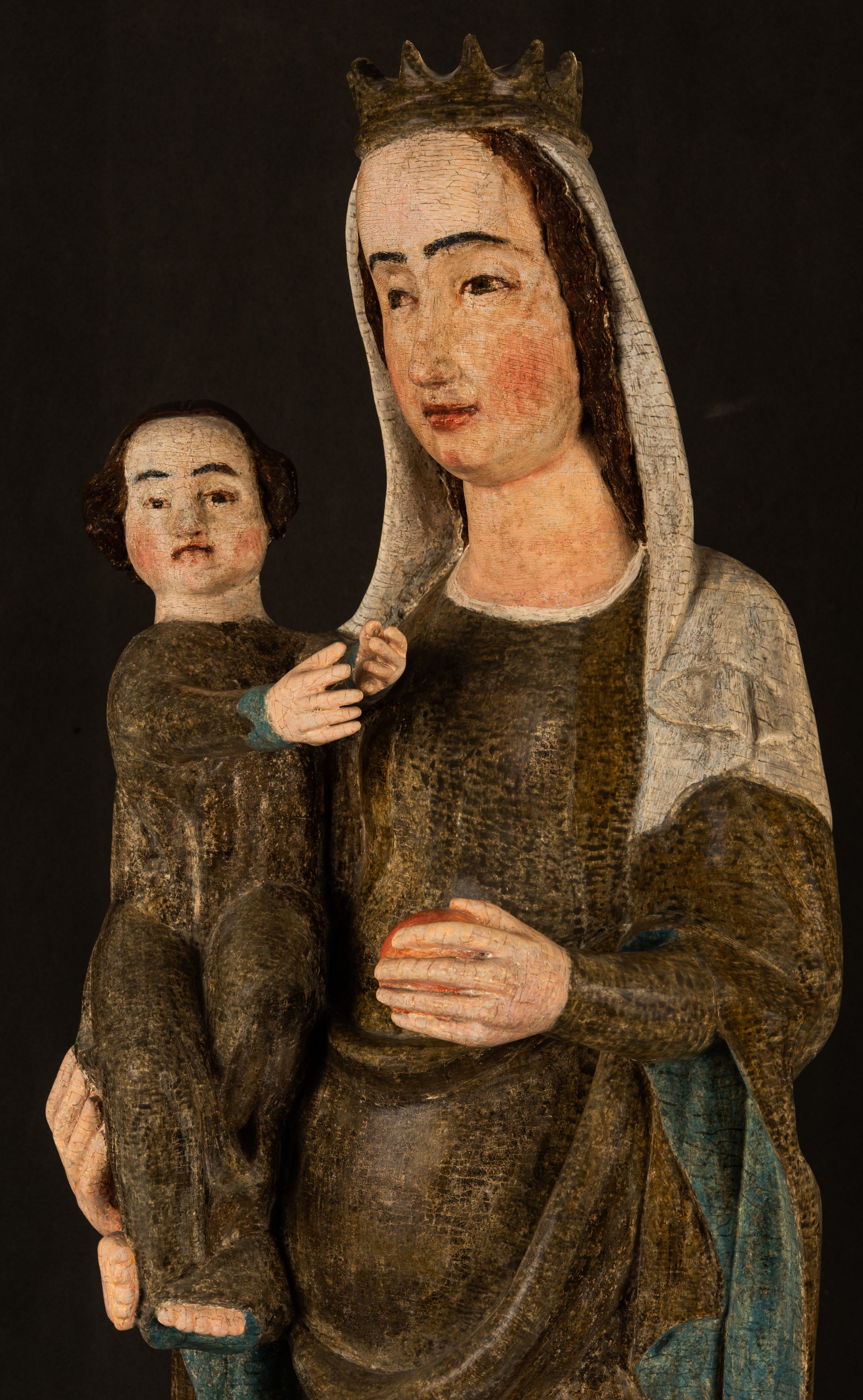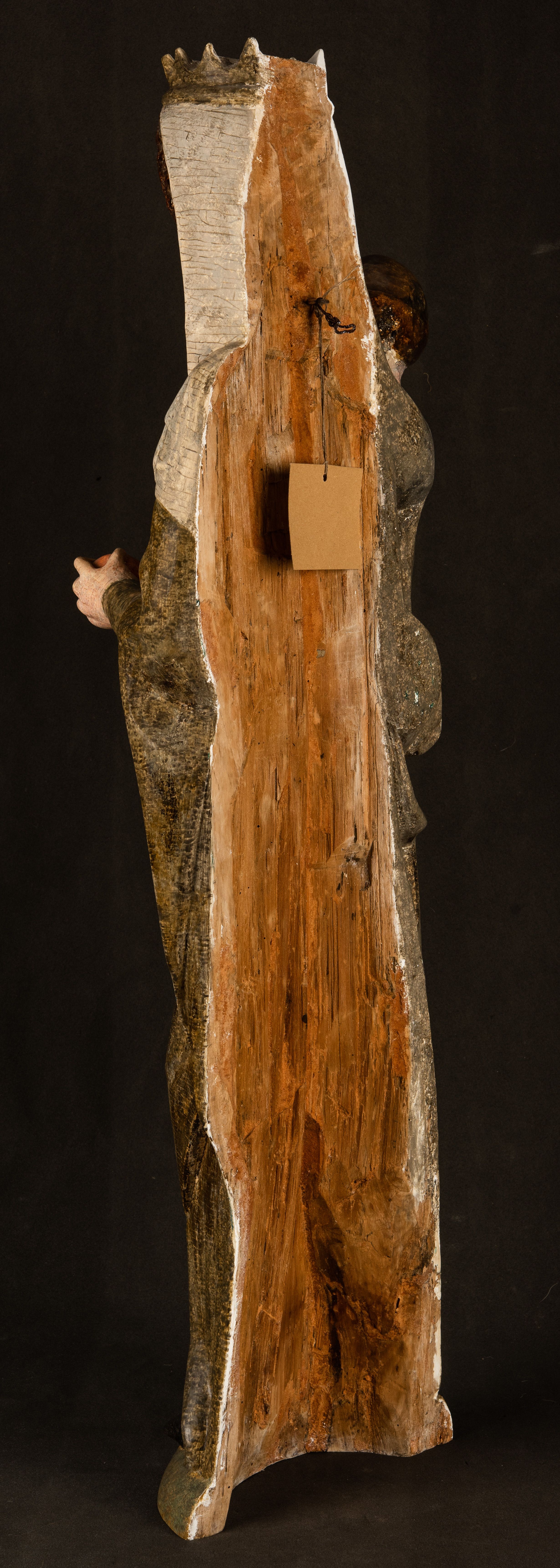 Stojąca figura Matki Boskiej z Dzieciątkiem reprezentuje przykład przyściennej rzeźby z tyłu wydrążonej. Maria stoi w lekkim kontrapoście, podkreślonym wysunięciem do przodu lewego kolana na niewielkim wzgórku. Prawą ręką podtrzymuje Dzieciątko, w lewej dłoni trzyma jabłko. Madonna ma mocno pociągłą twarz o jasnej karnacji z wysokim czołem, rumianych policzkach, długi, prosty nos i wydatne usta. Jej głowa osadzona jest na długiej szyi. Spod białej chusty ubranej na głowę i opadającej na ramiona widać brązowe włosy. Matka Boska na głowie ma koronę o ostrych, krótkich sterczynach. Nałożony na ciemnooliwkową suknię płaszcz w tym samym kolorze, podbity błękitem, tworzy dwa wałkowate zaokrąglone fałdy na brzuchu Marii, spływając miękkimi fałdami spod lewej ręki oraz festonem spod prawej ręki. Niżej fałdy płaszcza i sukni układają się niemal pionowo, opinając materią lewą nogę. Długa suknia odsłania czubki ciżemek. Dzieciątko zostało ujęte w trzech czwartych w prawo. Obie jego rączki wyciągnięte są przed siebie w stronę trzymanego przez Marię jabłka. Z kolei nóżki są skrzyżowane przy stopach. Jezus ma wyrazistą twarz o jasnej karnacji, małym nosem i wydatnych ustach. Jego głowę otaczają brązowe włosy układające się po bokach w charakterystyczne pukle. Jezus ubrany jest w długą, ciemnooliwkową tunikę odsłaniającą fragmenty stóp z charakterystycznymi mankietami przy rękawach. Szaty Matki Boskiej i Dzieciątka są srebrzone i laserowane.