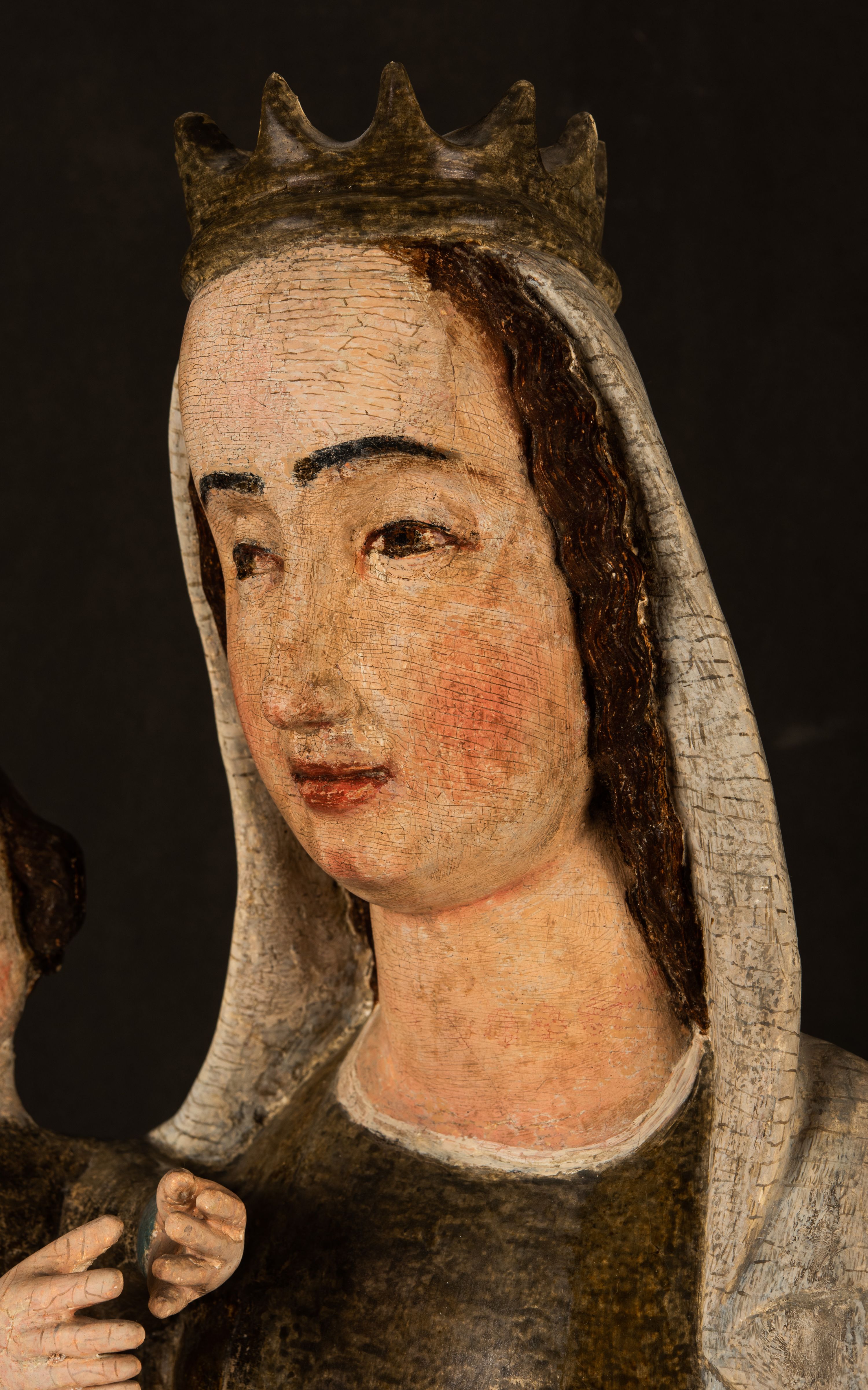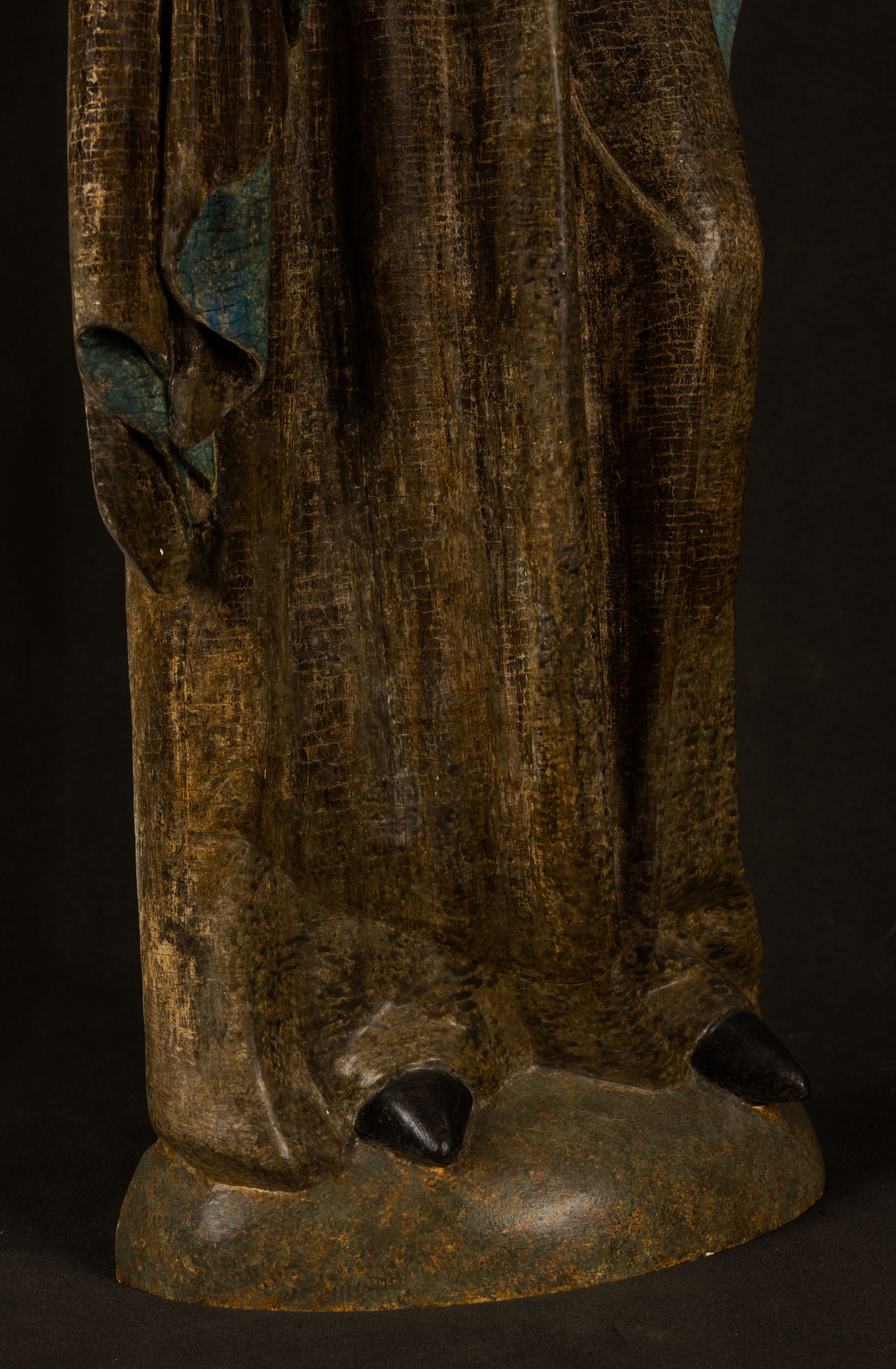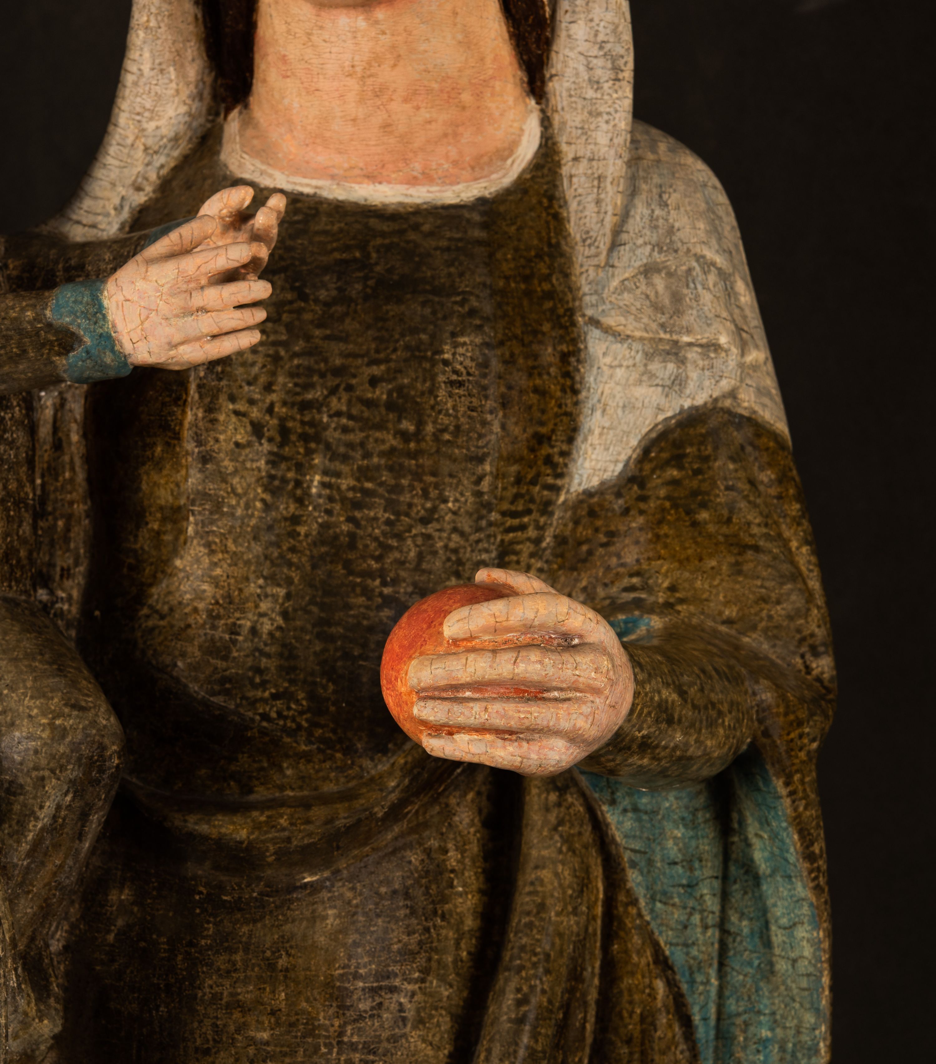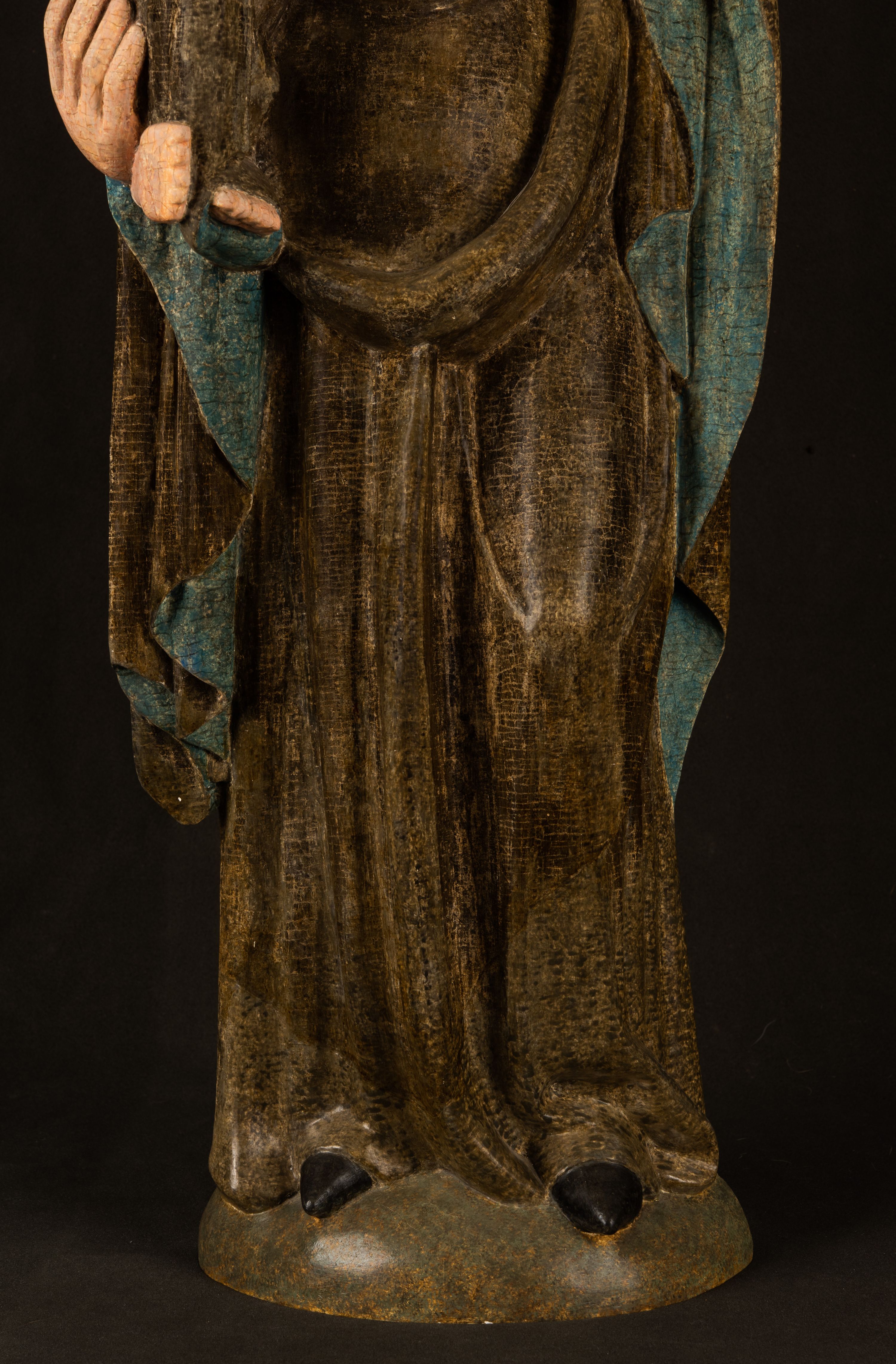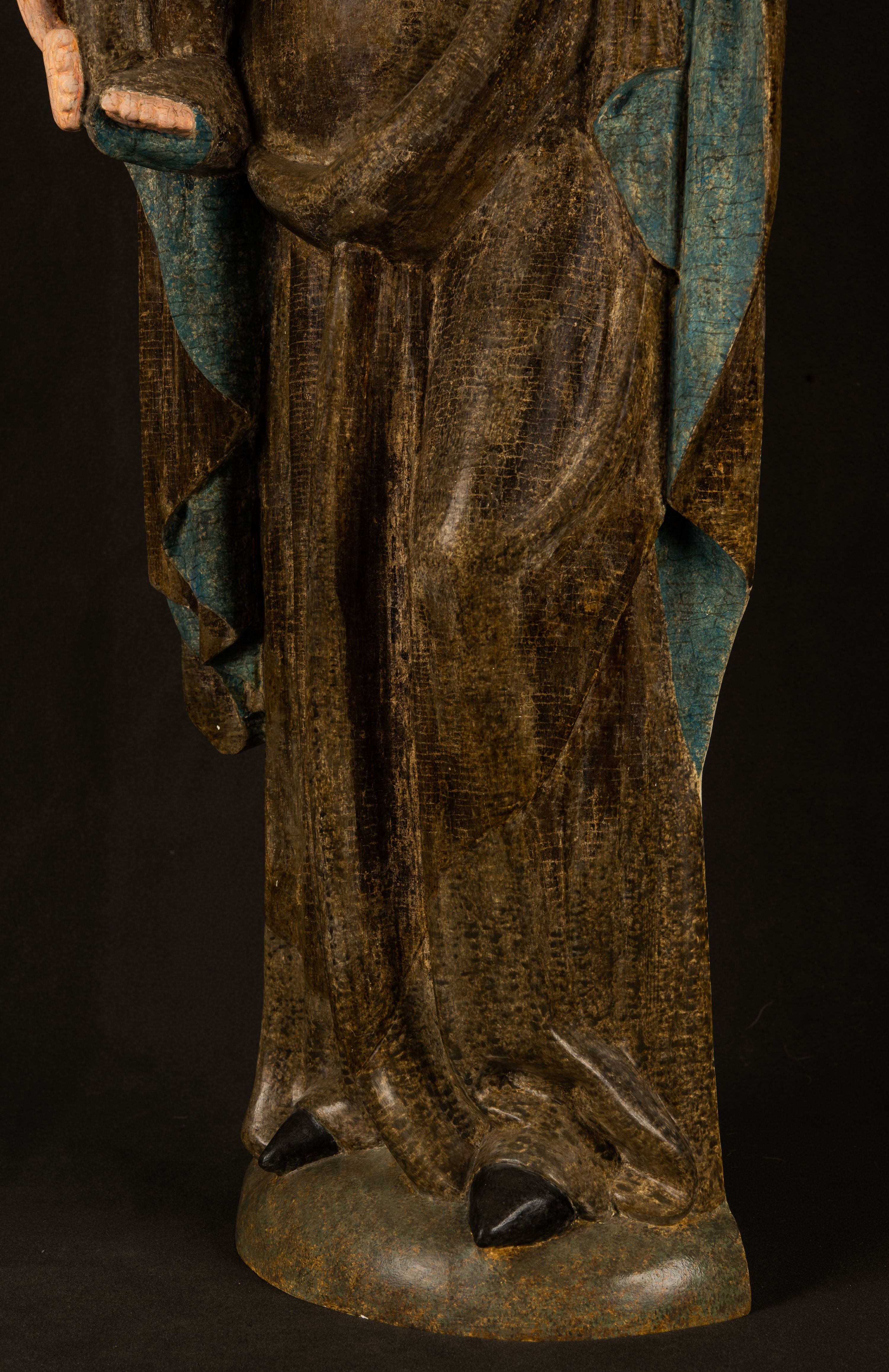 Stojąca figura Matki Boskiej z Dzieciątkiem reprezentuje przykład przyściennej rzeźby z tyłu wydrążonej. Maria stoi w lekkim kontrapoście, podkreślonym wysunięciem do przodu lewego kolana na niewielkim wzgórku. Prawą ręką podtrzymuje Dzieciątko, w lewej dłoni trzyma jabłko. Madonna ma mocno pociągłą twarz o jasnej karnacji z wysokim czołem, rumianych policzkach, długi, prosty nos i wydatne usta. Jej głowa osadzona jest na długiej szyi. Spod białej chusty ubranej na głowę i opadającej na ramiona widać brązowe włosy. Matka Boska na głowie ma koronę o ostrych, krótkich sterczynach. Nałożony na ciemnooliwkową suknię płaszcz w tym samym kolorze, podbity błękitem, tworzy dwa wałkowate zaokrąglone fałdy na brzuchu Marii, spływając miękkimi fałdami spod lewej ręki oraz festonem spod prawej ręki. Niżej fałdy płaszcza i sukni układają się niemal pionowo, opinając materią lewą nogę. Długa suknia odsłania czubki ciżemek. Dzieciątko zostało ujęte w trzech czwartych w prawo. Obie jego rączki wyciągnięte są przed siebie w stronę trzymanego przez Marię jabłka. Z kolei nóżki są skrzyżowane przy stopach. Jezus ma wyrazistą twarz o jasnej karnacji, małym nosem i wydatnych ustach. Jego głowę otaczają brązowe włosy układające się po bokach w charakterystyczne pukle. Jezus ubrany jest w długą, ciemnooliwkową tunikę odsłaniającą fragmenty stóp z charakterystycznymi mankietami przy rękawach. Szaty Matki Boskiej i Dzieciątka są srebrzone i laserowane.