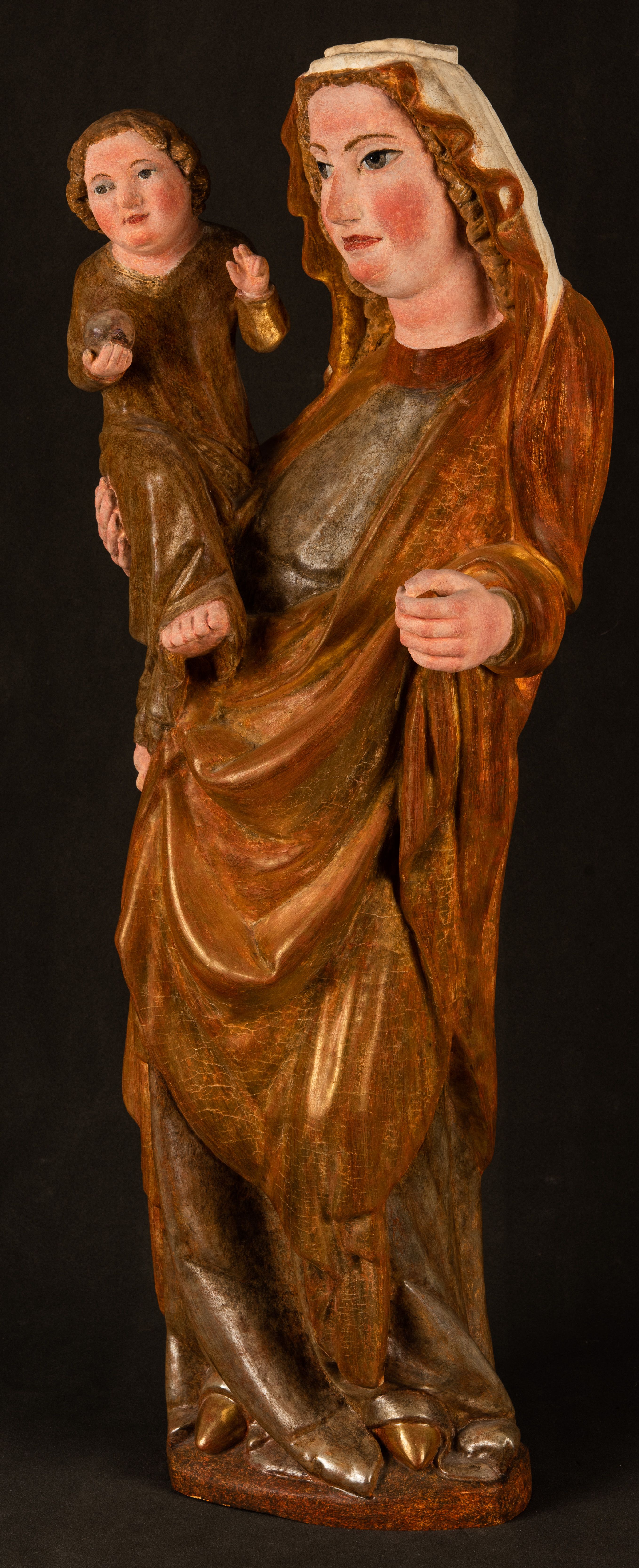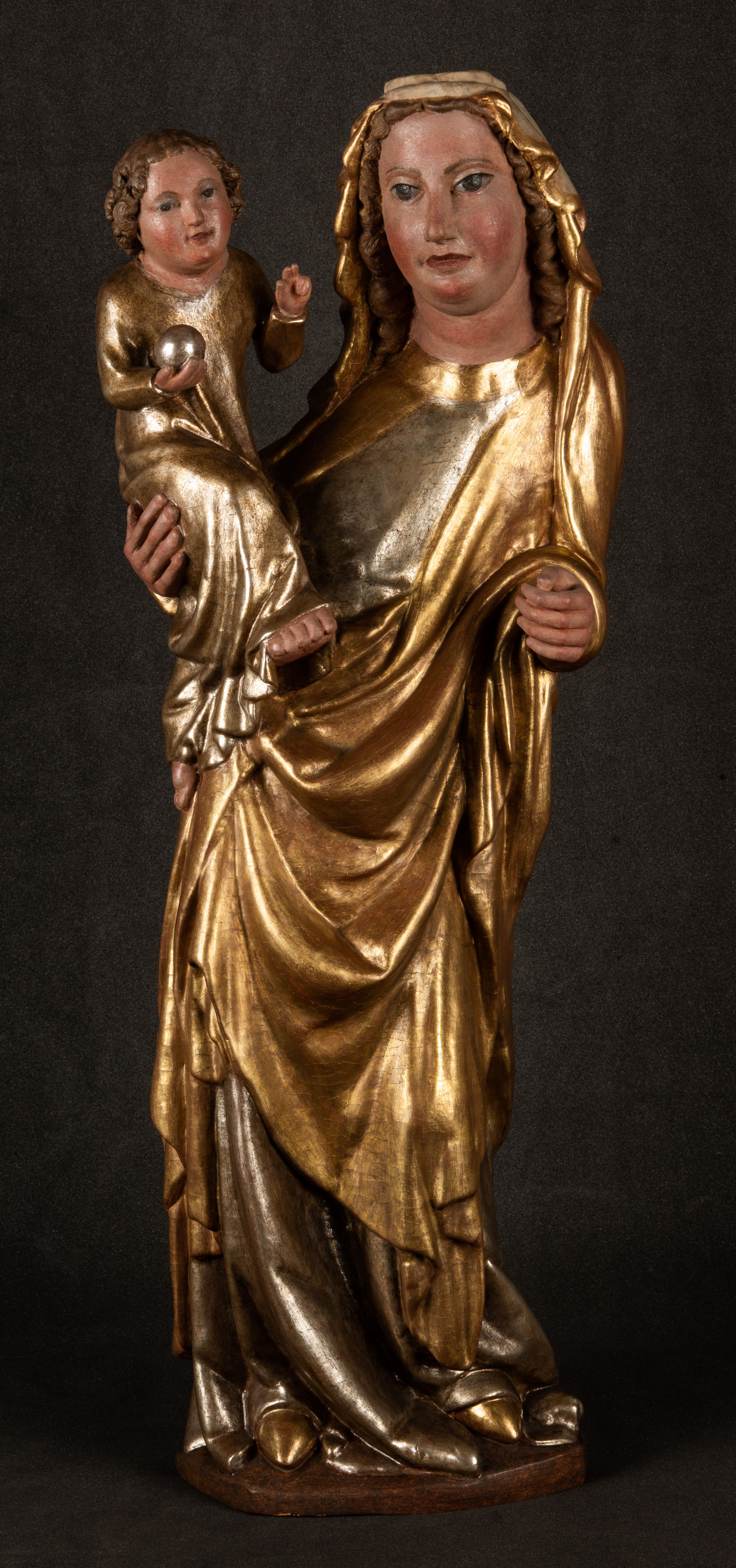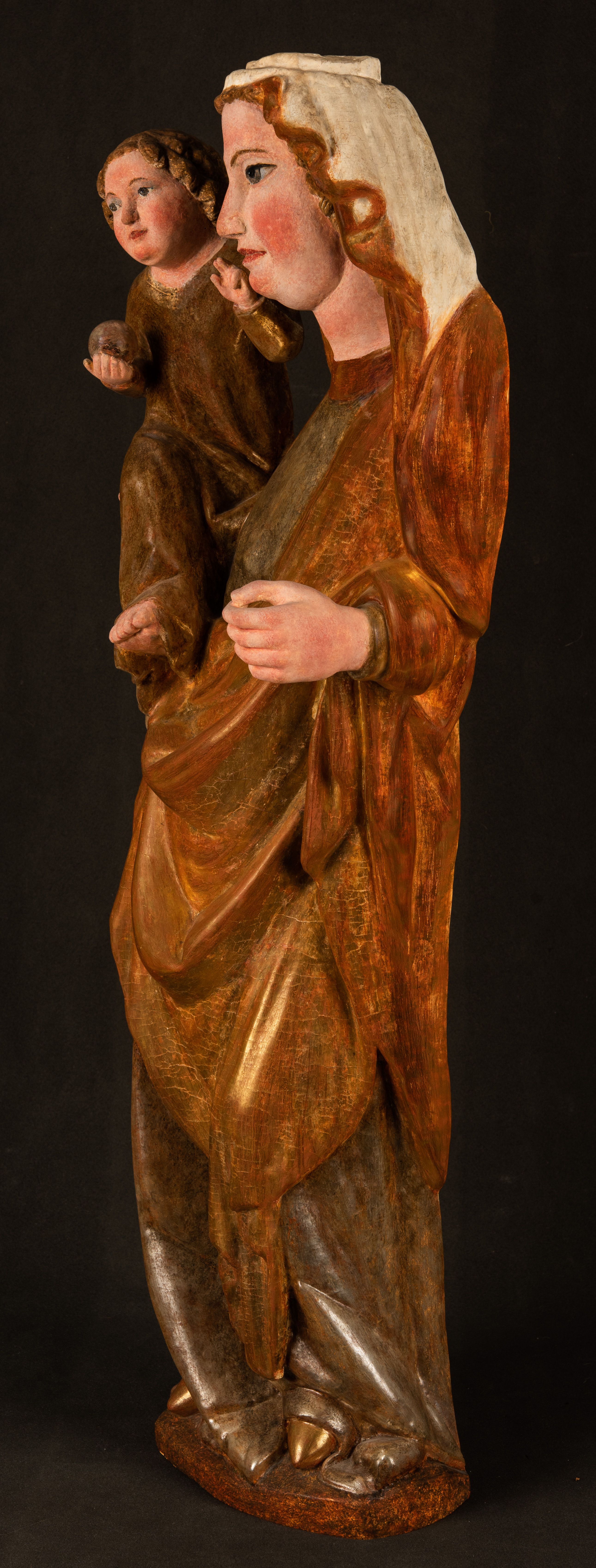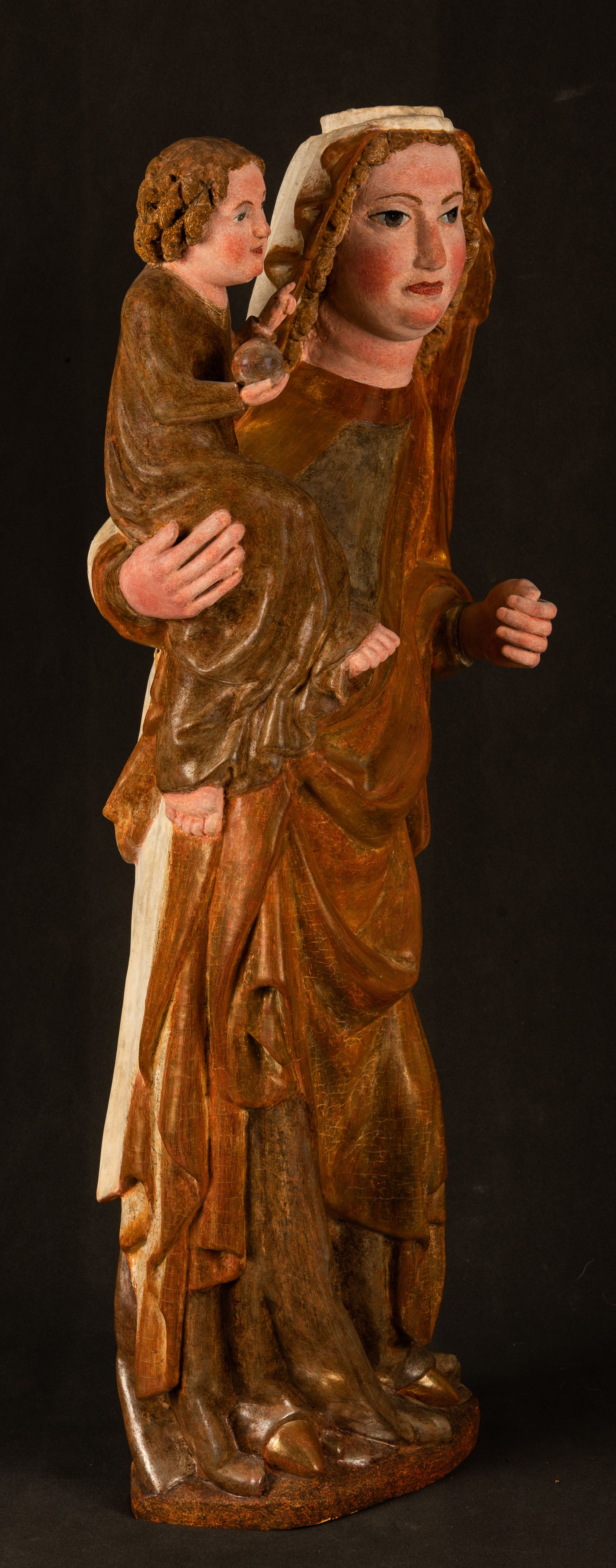 Rzeźba drążona, ustawiona na niewielkim, wielobocznym postumencie. Stojąca Maria ukazana frontalnie, w silnym kontrapoście z esowato wygiętym ciałem. Na lewej ręce podtrzymuje siedzące Dzieciątko, w prawej ręce ugiętej w łokciu i wyciągniętej do przodu najpewniej znajdowało się kiedyś berło. Maria została ukazana jako młoda kobieta o owalnej twarzy, dużych, migdałowatych oczach, długim, prostym nosie i wyraźnie zaakcentowanych, dużych ustach. Karnacja jasna z rumieńcem zaznaczonym na policzkach i podbródku. Długie, jasne i falowane włosy częściowo zakryte chustą, symetrycznie okalają twarz postaci, spadając na jej ramiona. Maria jest ubrana w długą, sięgającą ziemi suknię, spod której widoczne są ostro zakończone czubki złotych butów oraz obszerny, złoty płaszcz tworzący ostro załamujące się fałdy na wysokości kolan Marii i formujący kaskadę wzdłuż prawego boku postaci. Na głowie Marii znajduje się biała chusta ze złota lamówką. Dzieciątko Jezus ukazane w pozycji siedzącej z lewą nogą wysuniętą wyraźnie do przodu. Prawą ręką wykonuje gest błogosławieństwa, w lewej trzyma niewielkie jabłko. Chłopiec o okrągłej, pulchnej twarzy i krótkich, falowanych włosach spogląda przed siebie. Ubrany jest w wąską, suknię o długich rękawach, wykończoną przy dekolcie złotą lamówką. Spod sukni widoczne są bose stopy postaci. Karnacje postaci i część szat polichromowane, suknia Marii srebrzona, płaszcz i buty złocone.