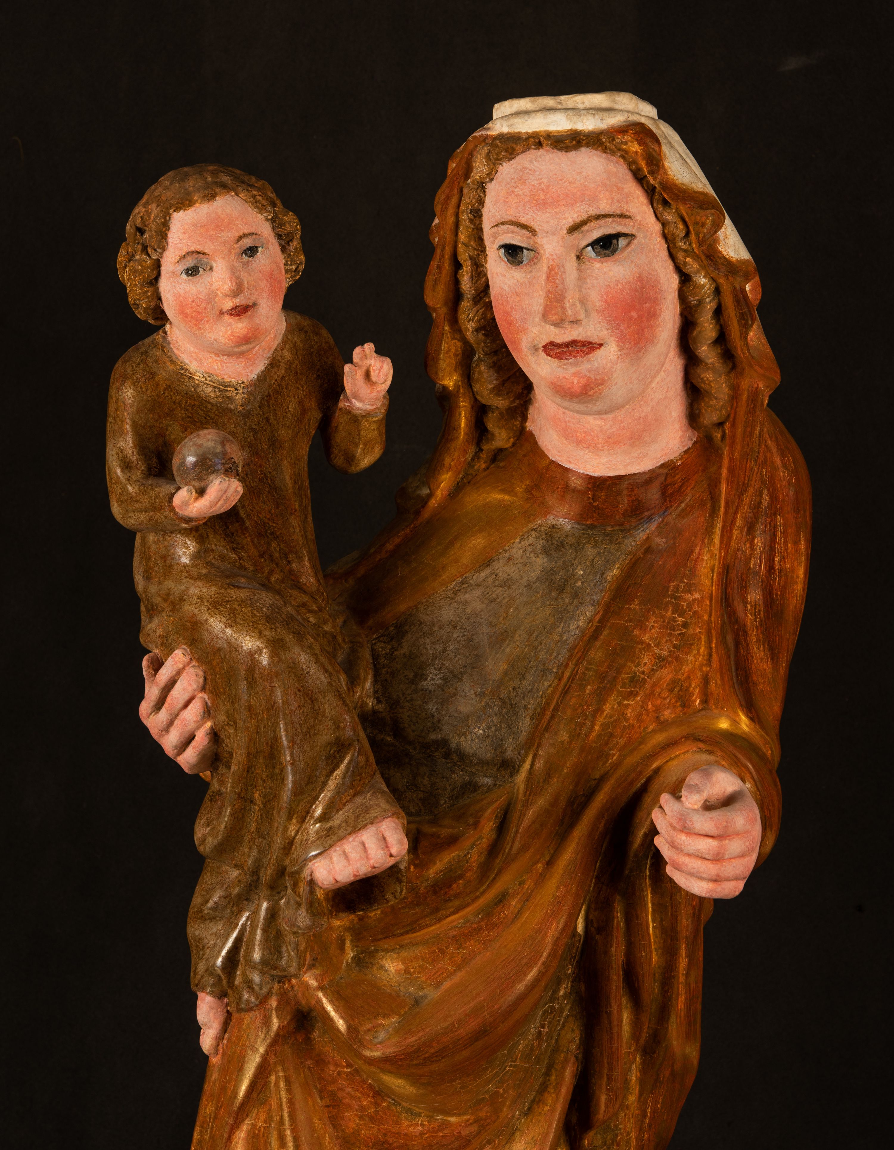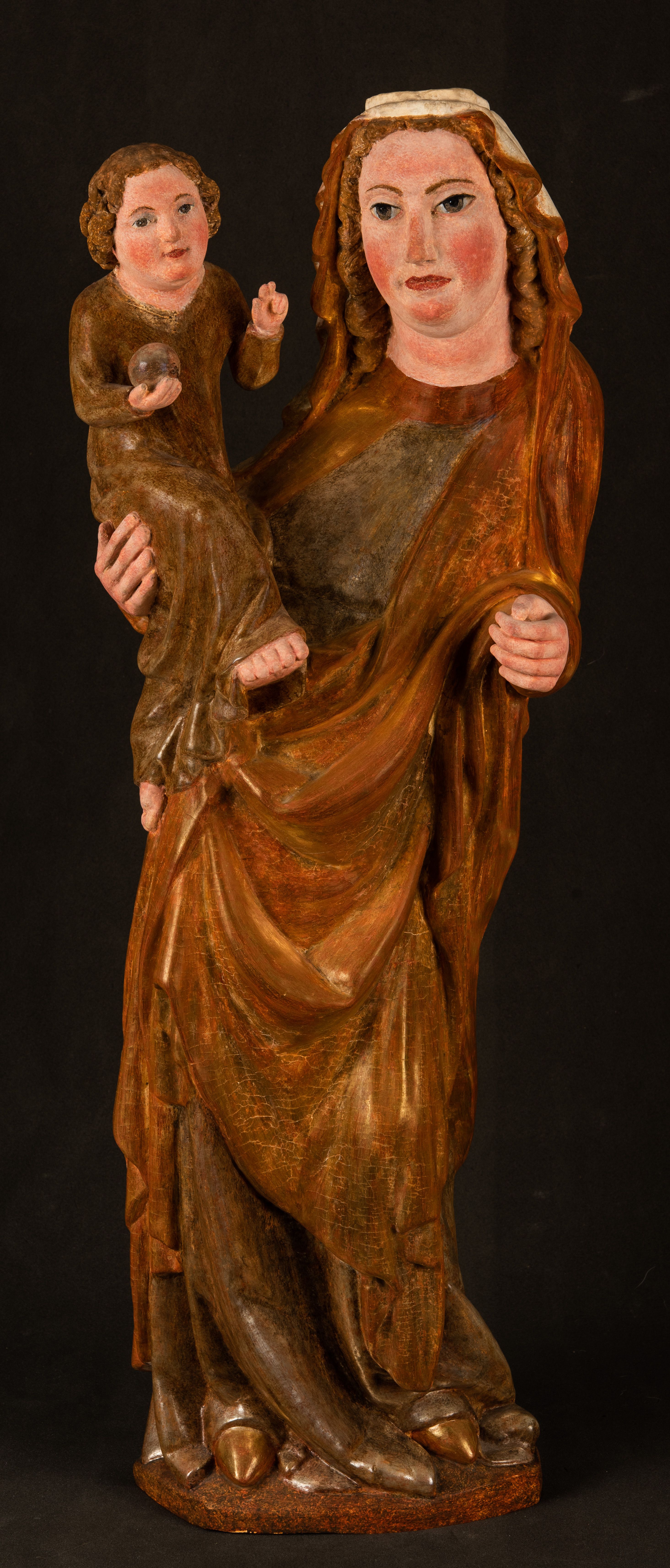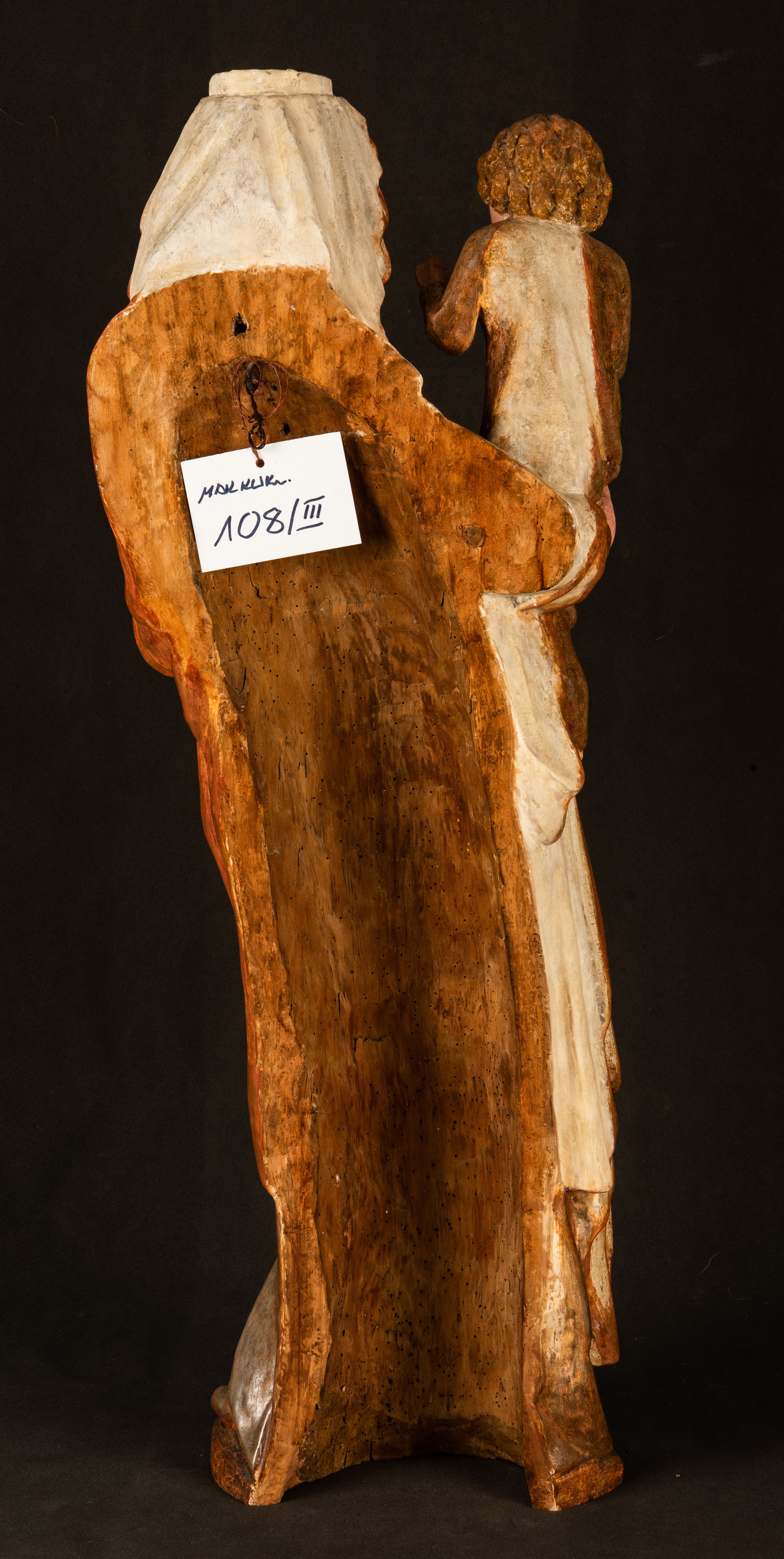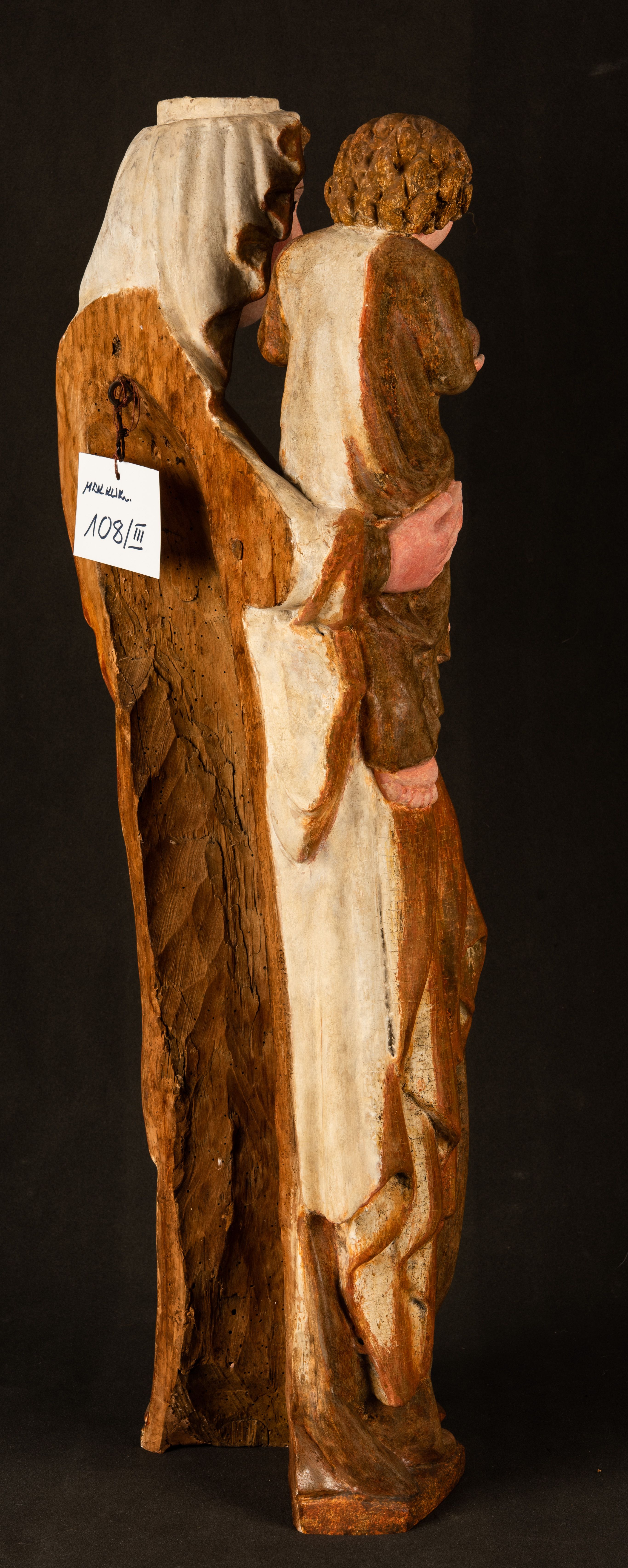 Rzeźba drążona, ustawiona na niewielkim, wielobocznym postumencie. Stojąca Maria ukazana frontalnie, w silnym kontrapoście z esowato wygiętym ciałem. Na lewej ręce podtrzymuje siedzące Dzieciątko, w prawej ręce ugiętej w łokciu i wyciągniętej do przodu najpewniej znajdowało się kiedyś berło. Maria została ukazana jako młoda kobieta o owalnej twarzy, dużych, migdałowatych oczach, długim, prostym nosie i wyraźnie zaakcentowanych, dużych ustach. Karnacja jasna z rumieńcem zaznaczonym na policzkach i podbródku. Długie, jasne i falowane włosy częściowo zakryte chustą, symetrycznie okalają twarz postaci, spadając na jej ramiona. Maria jest ubrana w długą, sięgającą ziemi suknię, spod której widoczne są ostro zakończone czubki złotych butów oraz obszerny, złoty płaszcz tworzący ostro załamujące się fałdy na wysokości kolan Marii i formujący kaskadę wzdłuż prawego boku postaci. Na głowie Marii znajduje się biała chusta ze złota lamówką. Dzieciątko Jezus ukazane w pozycji siedzącej z lewą nogą wysuniętą wyraźnie do przodu. Prawą ręką wykonuje gest błogosławieństwa, w lewej trzyma niewielkie jabłko. Chłopiec o okrągłej, pulchnej twarzy i krótkich, falowanych włosach spogląda przed siebie. Ubrany jest w wąską, suknię o długich rękawach, wykończoną przy dekolcie złotą lamówką. Spod sukni widoczne są bose stopy postaci. Karnacje postaci i część szat polichromowane, suknia Marii srebrzona, płaszcz i buty złocone.