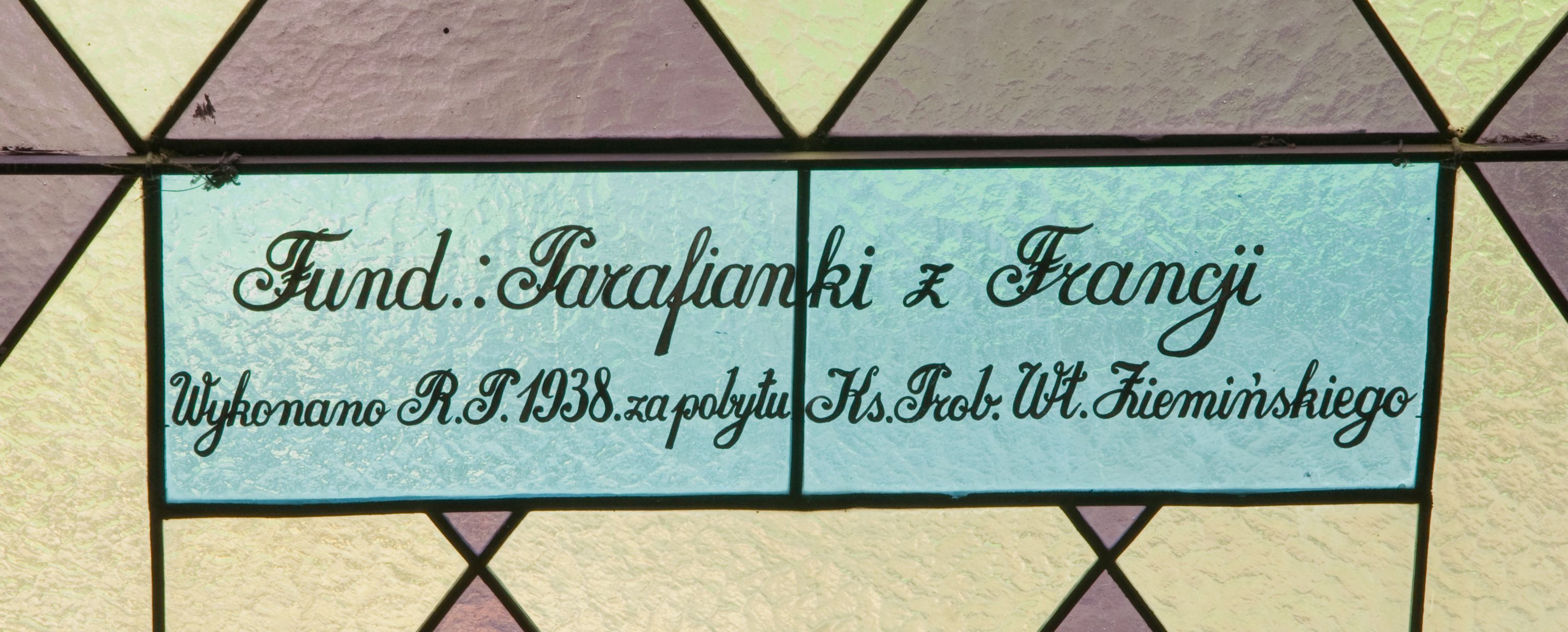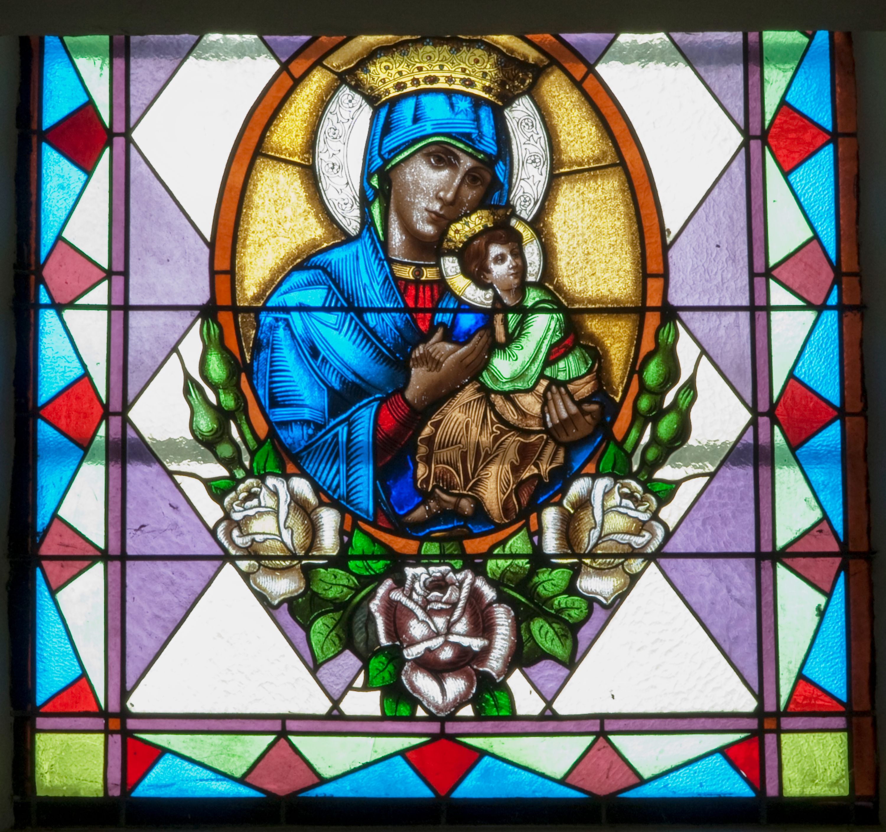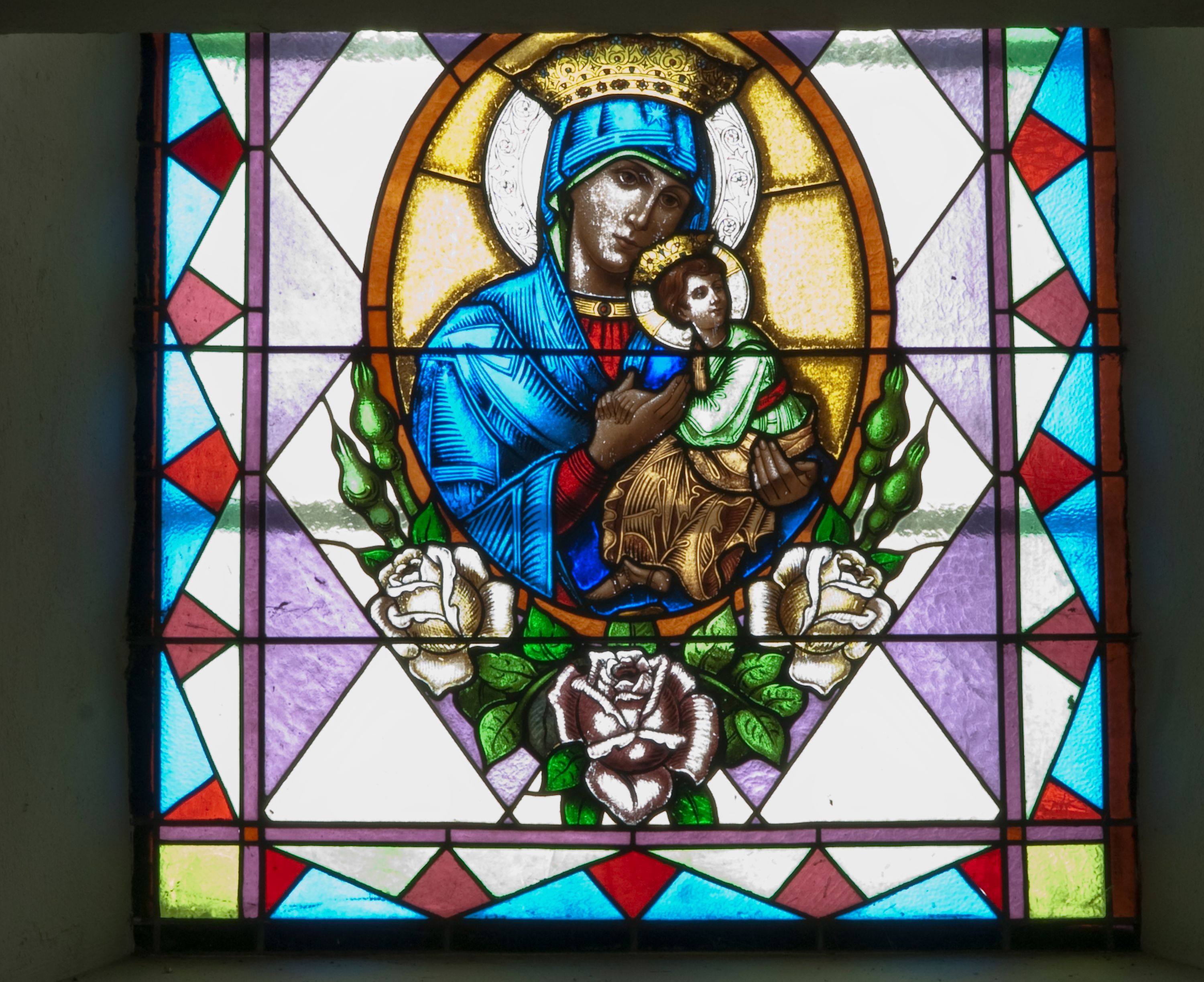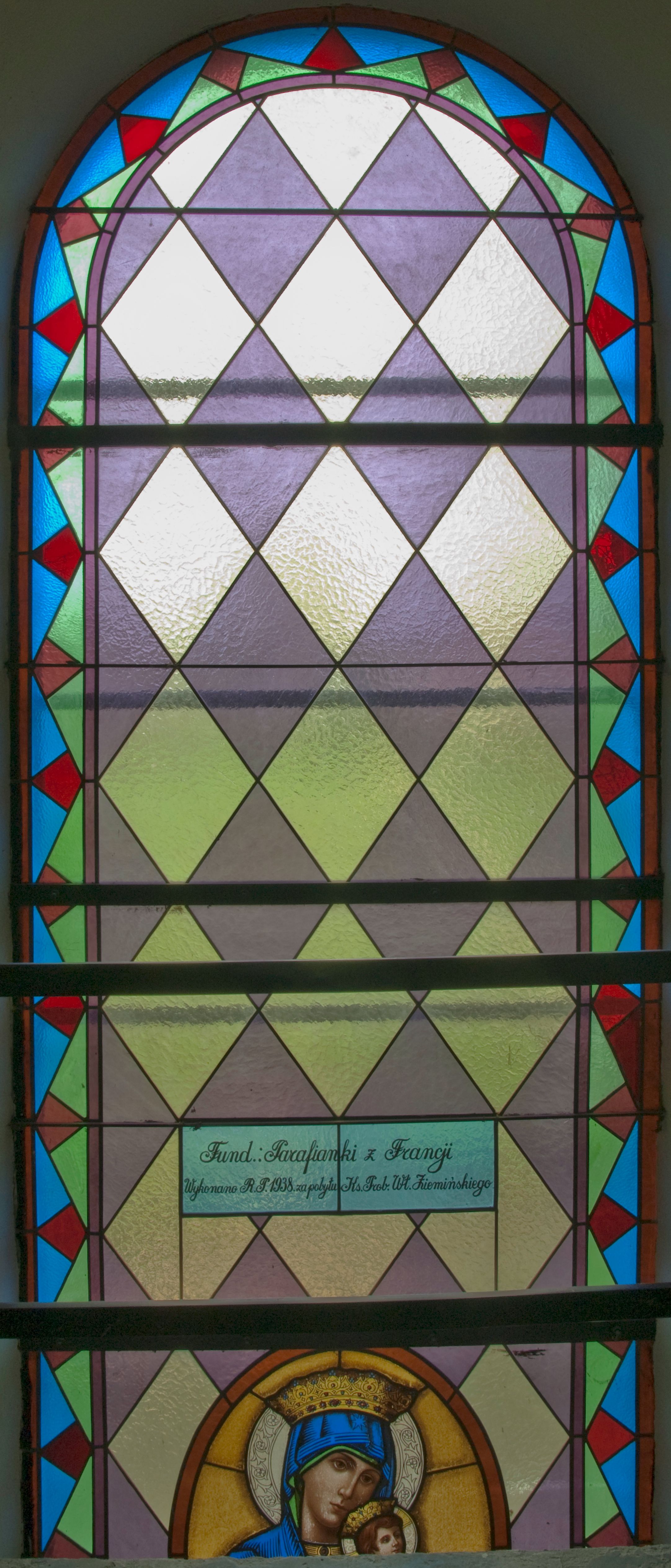Witraż w kształcie stojącego prostokąta zamkniętego łukiem półkolistym ujęty geometryczną bordiurą wypełnioną motywem białych i niebieskich trójkątów oraz ciemnoczerwonych rombów. W polu ukośna kratka wypełniona ułożonymi naprzemiennie białymi i jasnofioletowymi rombami. W dolnej części witraża owalny medalion wsparty na girlandzie białych, kwitnących róż mieszczący popiersie Matki Boskiej z Dzieciątkiem ukazanej w typie Matki Boskiej Nieustającej Pomocy umieszczone na złotym tle. Maria zwrócona w trzech czwartych w lewo, na lewym przedramieniu trzyma siedzące Dzieciątko, prawą dłonią podtrzymuje dłonie Jezusa. Matka Boska ubrana jest w czerwoną suknię z długimi rękawami wykończoną przy dekolcie złotą lamówką oraz niebieski płaszcz zarzucony na głowę. Dzieciątko jest zwrócone w trzech czwartych w prawo z głową w przeciwnym kierunku. Jezus nosi jasnozieloną tunikę z długimi, szerokimi rękawami oraz złoty, szrafowany płaszcz, spod którego widoczne są bose stopy. Wokół głowy Marii znajduje się biały nimb wypełniony bordiurą roślinną, wokół głowy Dzieciątka nimb krzyżowy. Obie postaci ukazane są w złotych, kameryzowanych koronach typu otwartego. Powyżej medalionu prostokątne pole z napisem: „Fund[acja] Parafianki z Francji / Wykonano R[oku] P[ańskiego] 1939 za pobytu Ks[iędza] Prob[oszcza] Wł[adysława] Ziemińskiego”.