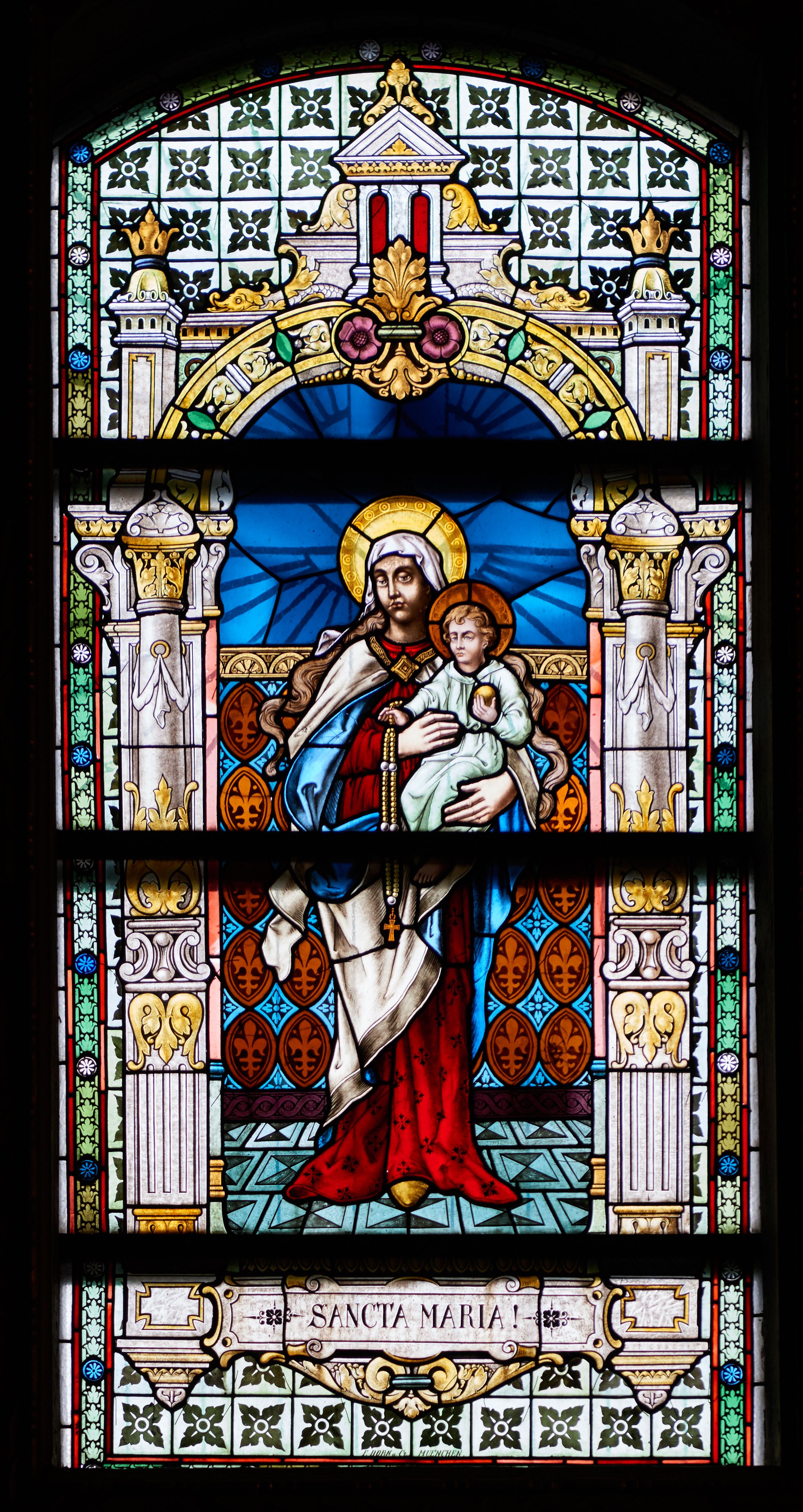 Witraż w kształcie stojącego prostokąta, zamkniętego łukiem odcinkowym. W centrum kompozycji ukazana jest Matka Boska z Dzieciątkiem wewnątrz dekoracyjnej aediculi. Maria przedstawiona jest frontalnie, na lewej ręce trzyma Dzieciątko Jezus, a prawą je podtrzymuje. Twarz podłużna o ciemnej karnacji z wysokim czołem, długim nosem, dużymi oczami i małymi ustami. Maria ubrana jest w czerwoną suknię; biały płaszcz z niebieską podszewką, spięty na dekolcie romboidalną klamrą oraz biały welon na głowie, spod którego spływają jej bujne i długie włosy. Dzieciątko ukazane jest w pozycji siedzącej, zwrócone trzy czwarte w prawo, w prawej dłoni trzyma różaniec, a w lewej złote jabłko. Dzieciątko ubrane jest w jasnozieloną suknię z długimi rękawami. Ma podłużną twarz o jasnej karnacji z dużymi oczami i długim nosem, okoloną kędzierzawymi, jasnymi włosami. Maria i Dzieciątko mają wokół głów koliste nimby.