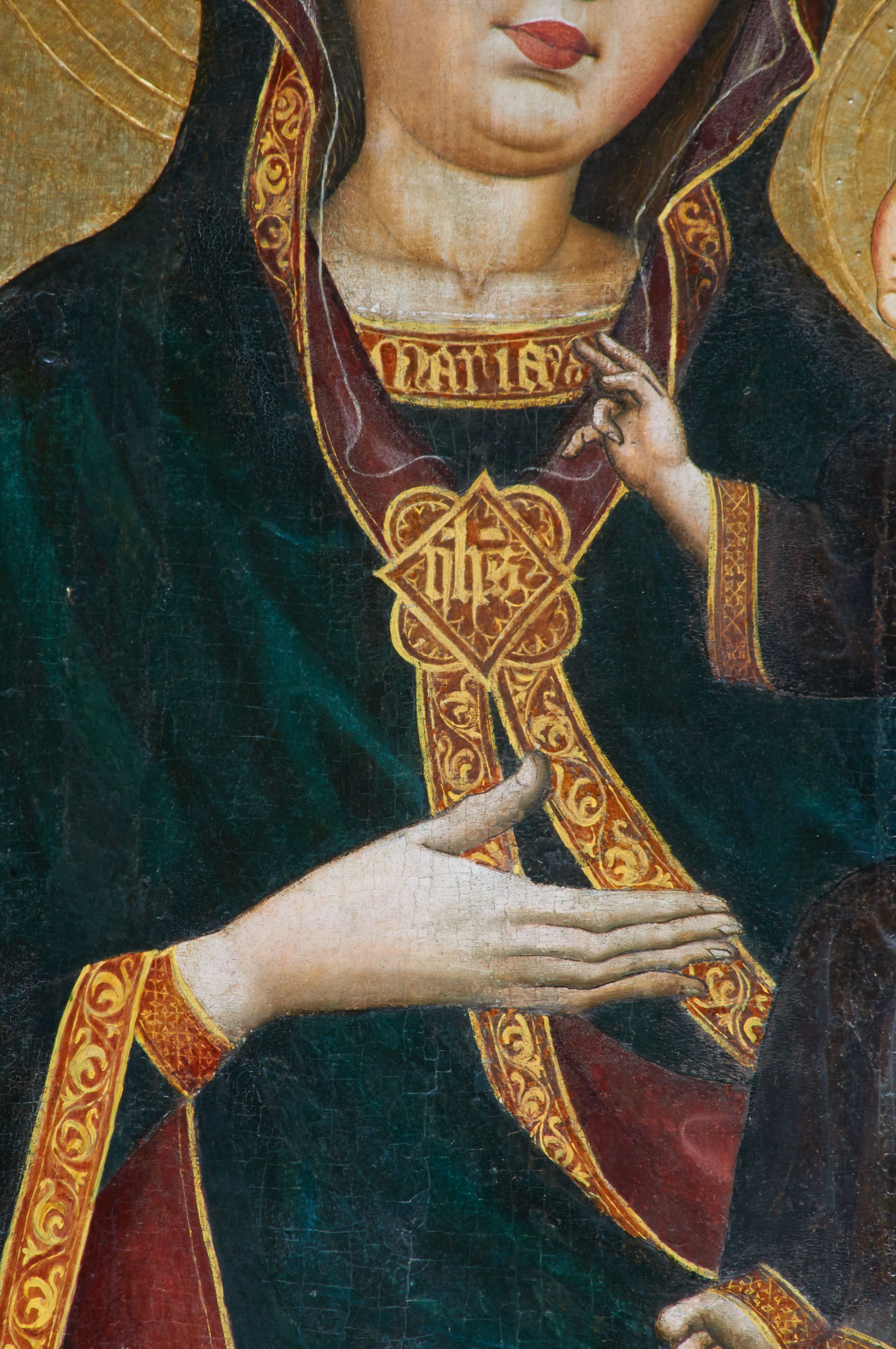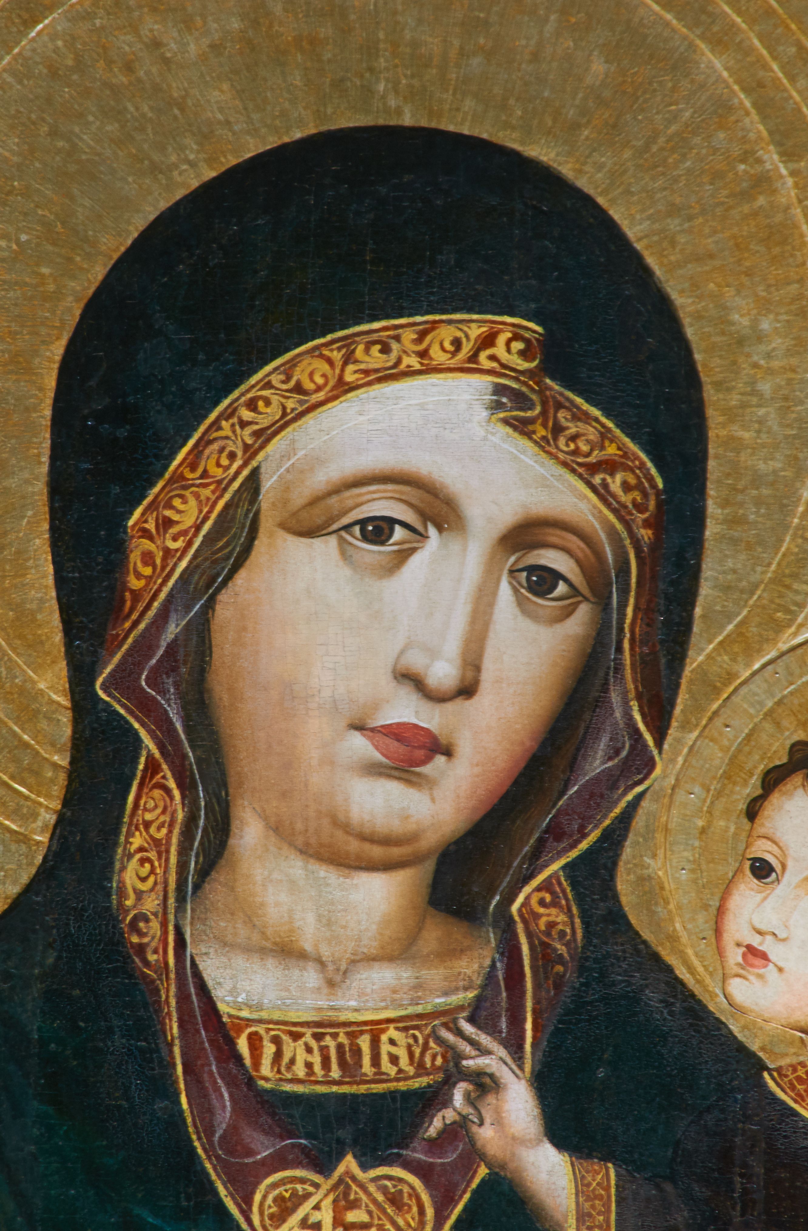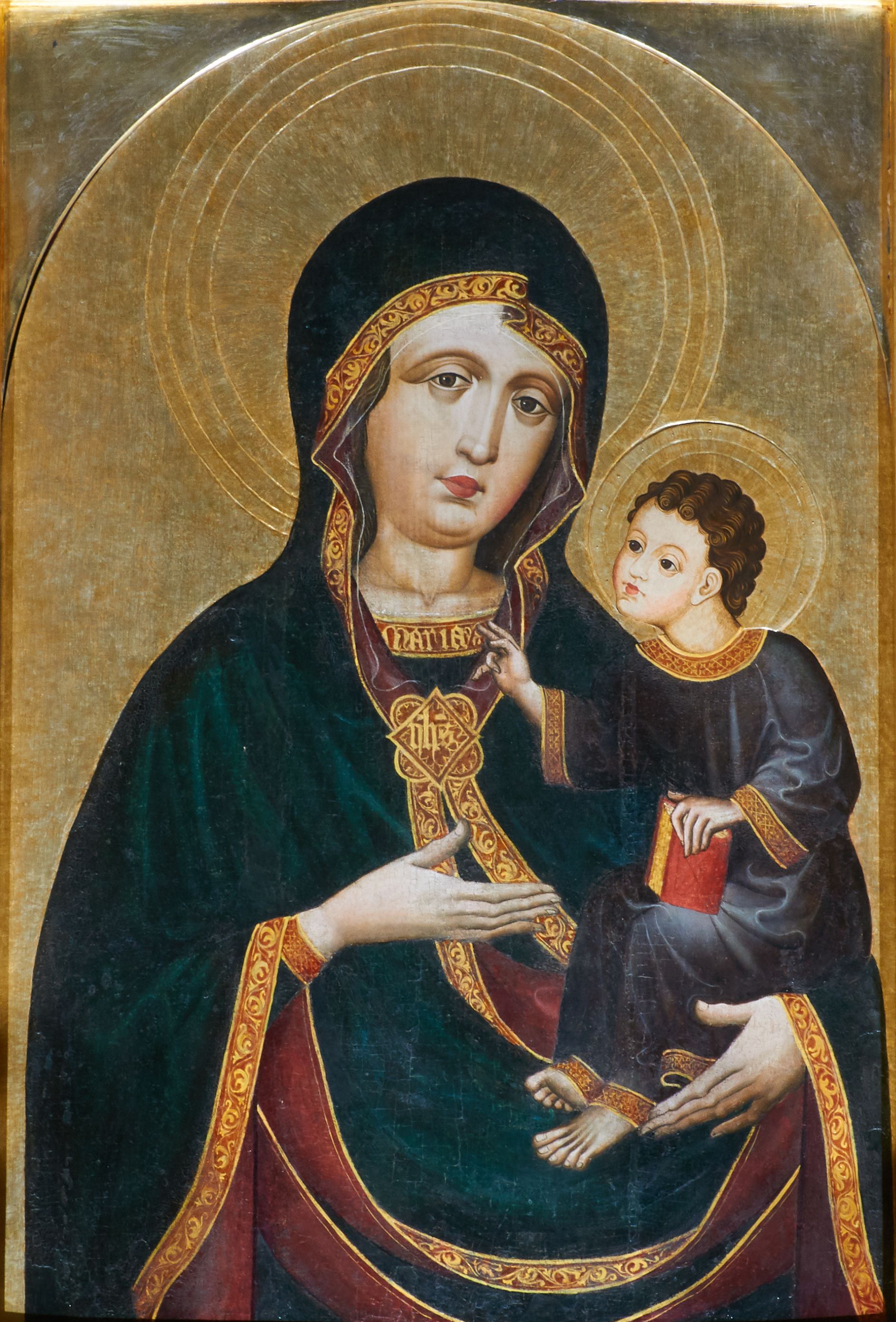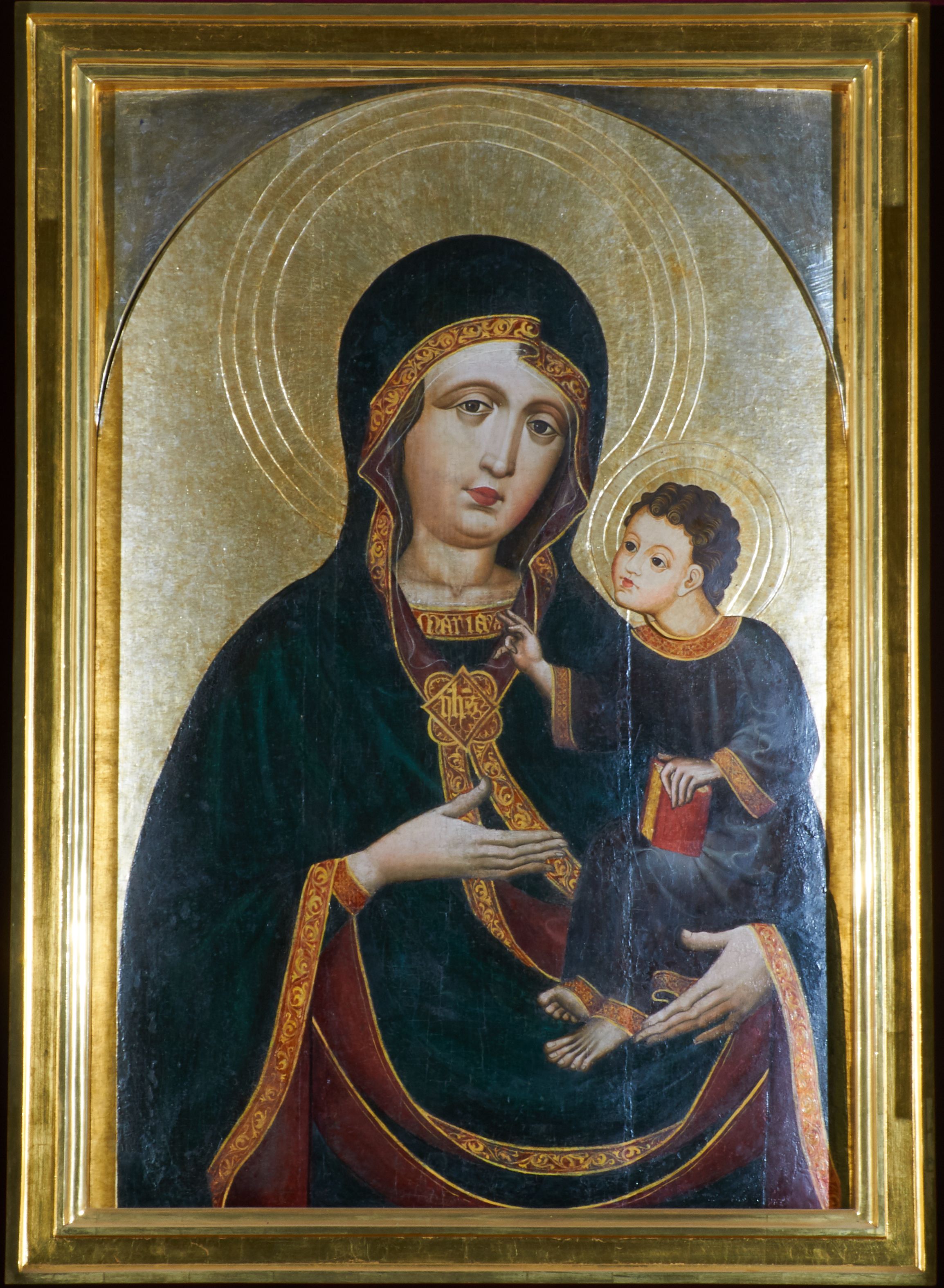 Obraz w kształcie stojącego prostokąta zamkniętego półkoliście. Matka Boska z Dzieciątkiem na ręku przedstawiona frontalnie w półpostaci, z głową lekko przechyloną na lewe ramię. Ręce ugięte w łokciach, lewą podtrzymuje Dzieciątko, wskazując na nie prawą dłonią. Twarz pełna, modelowana światłocieniowo, o dużych oczach, małych ustach i wydatnym podbródku. Cała postać Marii wraz z głową okryta maforionem ozdobionym na brzegach lamówką i spiętym na piersiach ozdobną klamrą z literami: ihs. Lamówka pierwotnie srebrzona i laserowana, ozdobiona malowaną wicią z motywów półpalmet. Spod maforionu widoczne jedynie niewielkie fragmenty sukni ozdobione lamówką, przy dekolcie z minuskułowym napisem: maria, oraz chusta na głowie nieosłaniająca szyi. Dzieciątko siedzi na lewej ręce Marii, zwrócone w trzech czwartych w kierunku widza. Ręce ugięte w łokciach; prawą z palcami ułożonymi w geście błogosławieństwa kieruje w stronę Matki, lewą podtrzymuje kodeks, który opiera na lewym kolanie. Jezus ubrany jest w długą tunikę z długimi, szerokimi rękawami, ozdobioną przy brzegach ozdobną lamówką. Wokół głów koliste nimby z koncentrycznych okręgów. Tło złote.