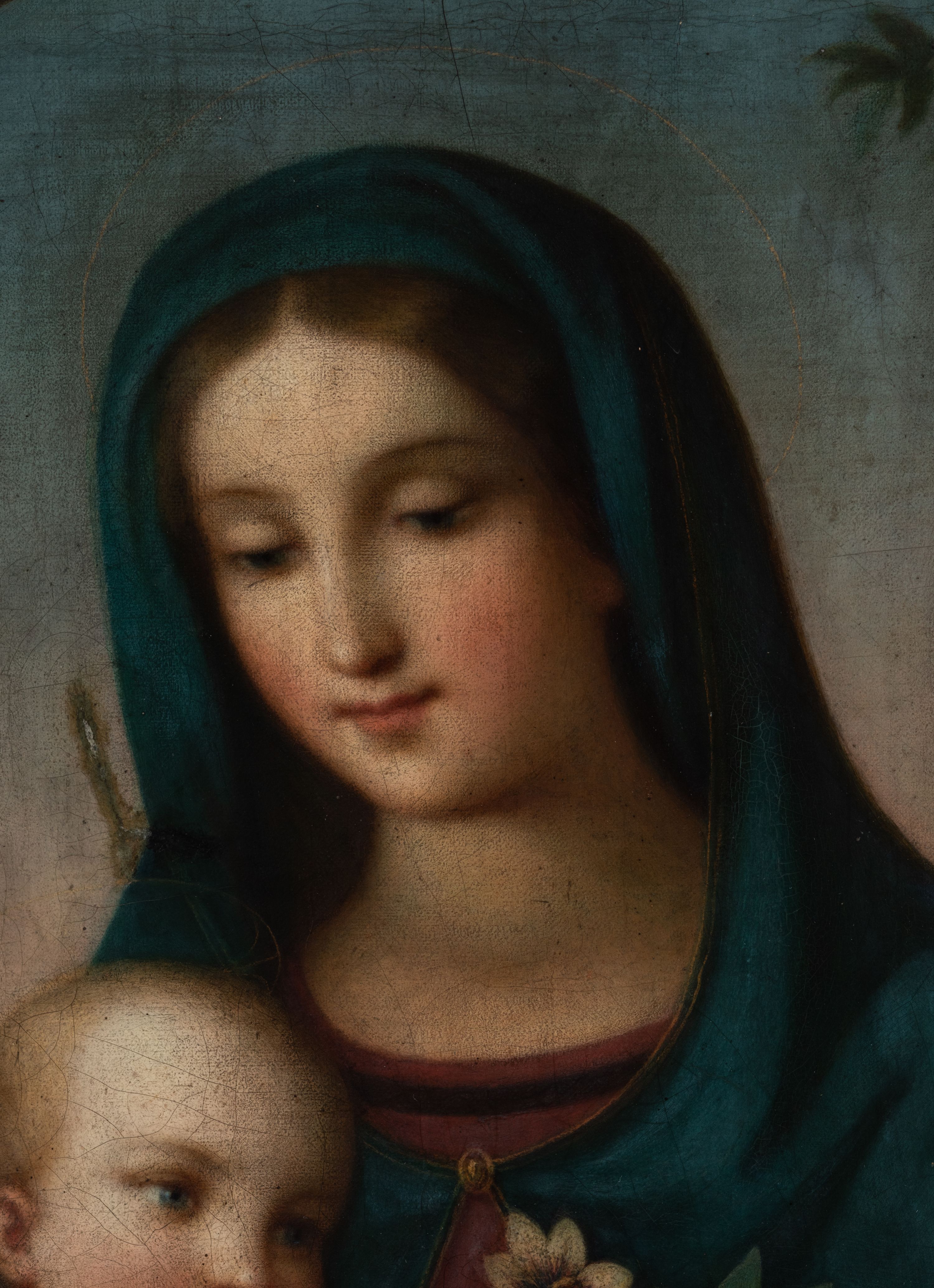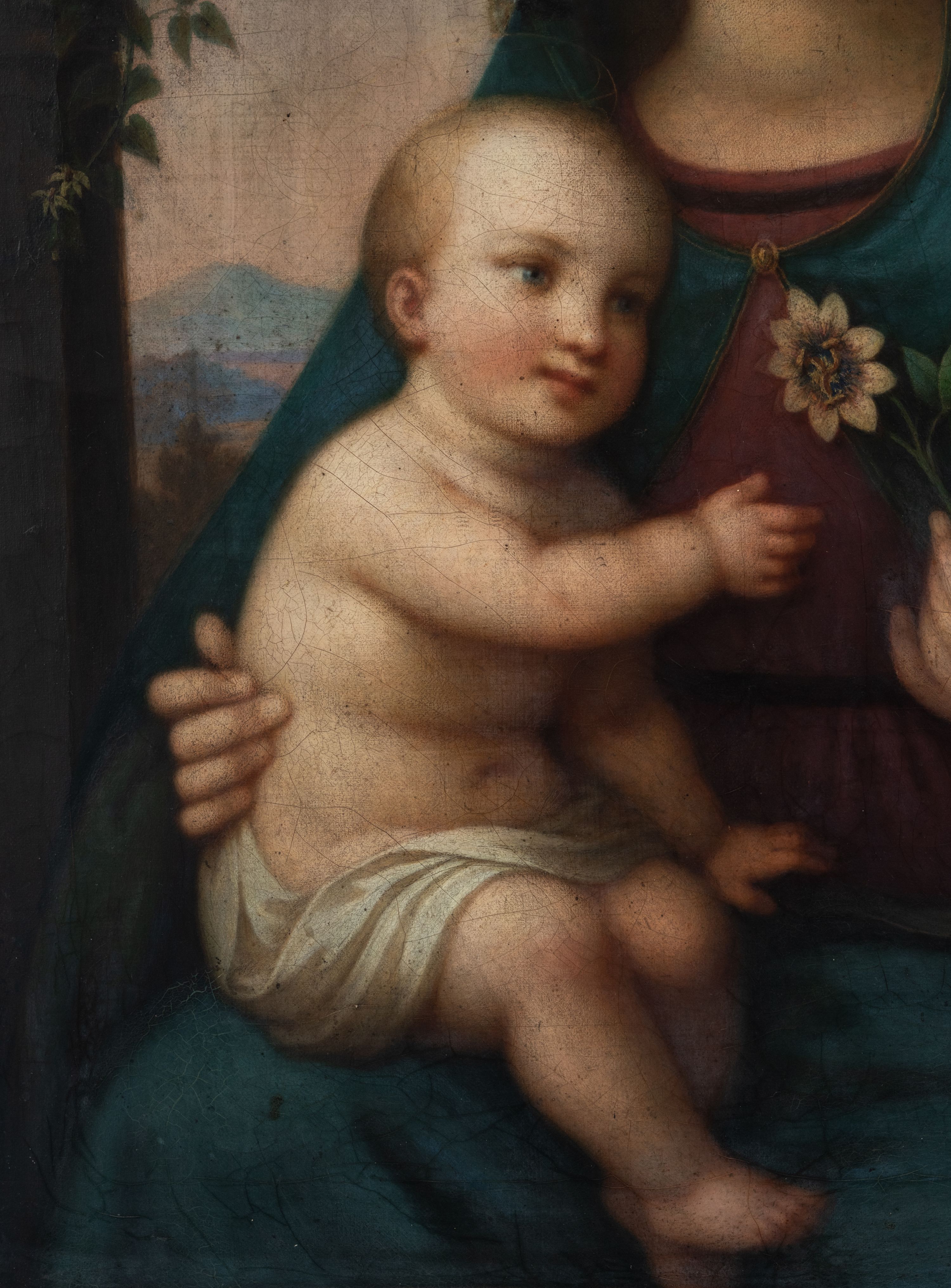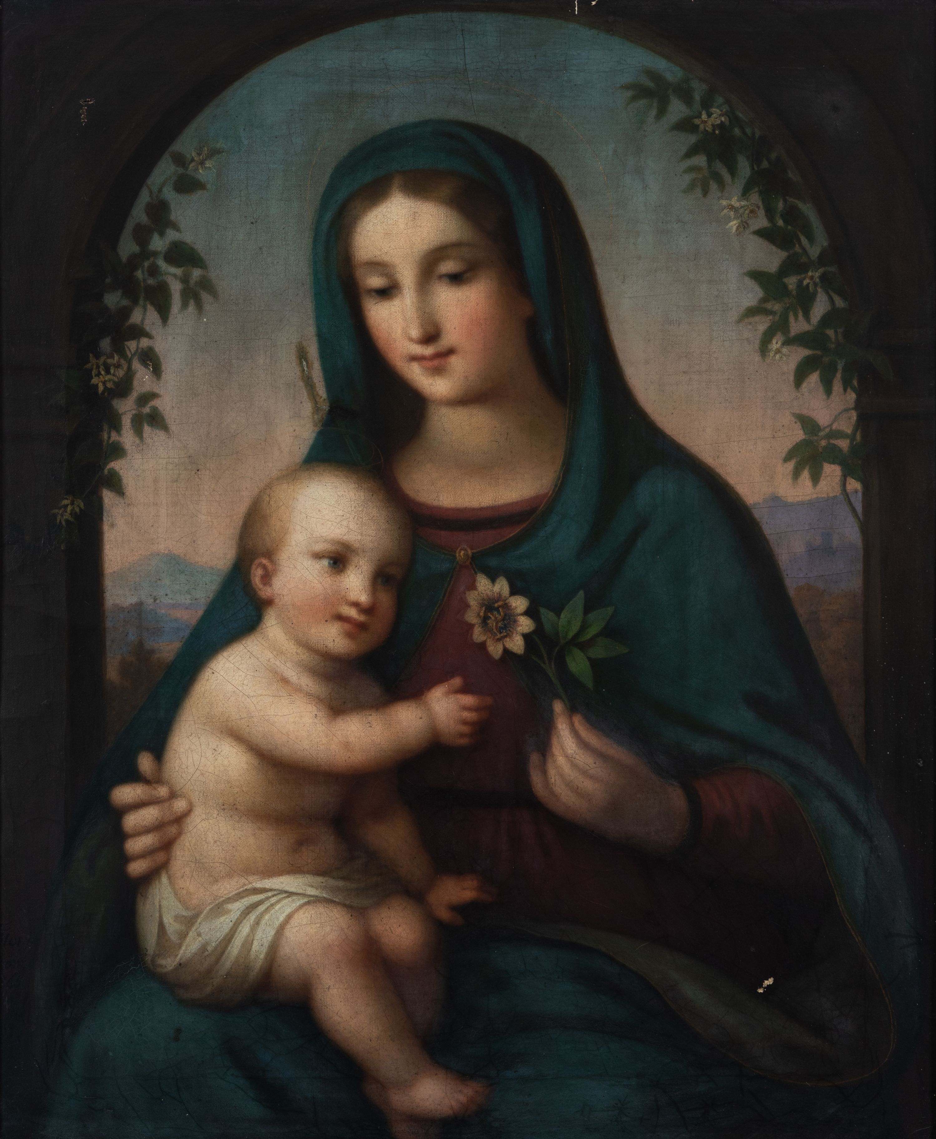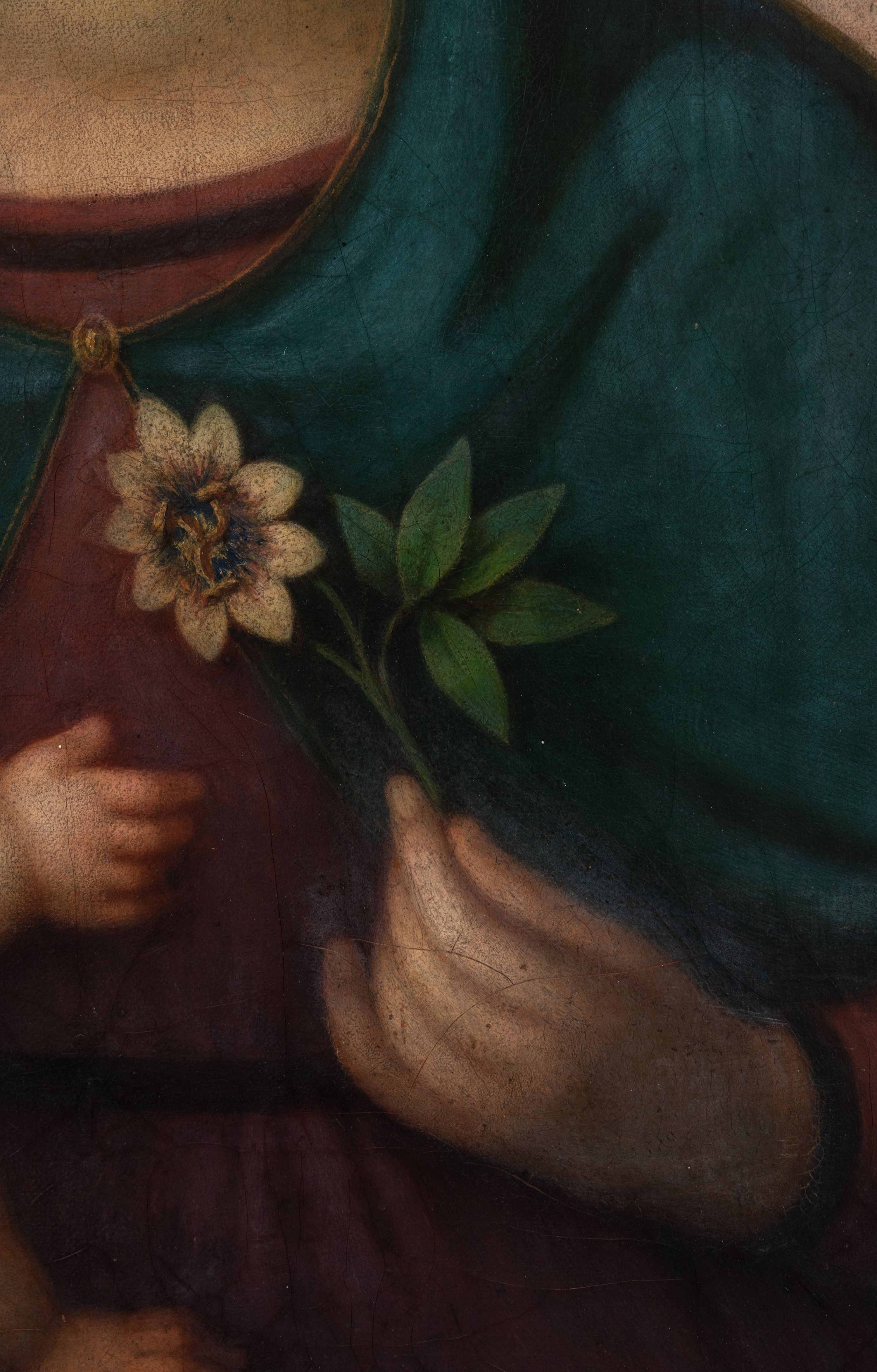 Obraz w profilowanej, złoconej ramie przedstawiający Matkę Boską z Dzieciątkiem. Maria siedzi, prawą ręką przytrzymuje Jezusa, w lewej trzyma kwiat passiflory. Pochyla nieznacznie głowę, spogląda w dół, ma owalną twarz o łagodnym wyrazie, ciemne oczy, prosty nos i małe usta. Jest ubrana w czerwoną, przepasaną suknię i niebieski maforion z zielonym podbiciem zarzucony na głowę i spięty na dekolcie. Dzieciatko siedzi na jej prawym kolanie zwrócone w trzech czwartych w lewo. Spogląda na kwiat i sięga po niego prawą ręką, lewą przytrzymuje się Matki. Ma okrągłą twarz, jasne oczy, prosty nos i małe usta, na policzkach rumieńce. Biodra osłania mu biała szarfa. Scena rozgrywa się przed arkadą, za postaciami widać fragmenty podpór z archiwoltą, przy której rośnie pnącze. Za arkadą rozciąga się górzysty krajobraz, którego większą część wypełnia niebo pomarańczowe w dolnej partii i przechodzące wyżej w niebieskie.