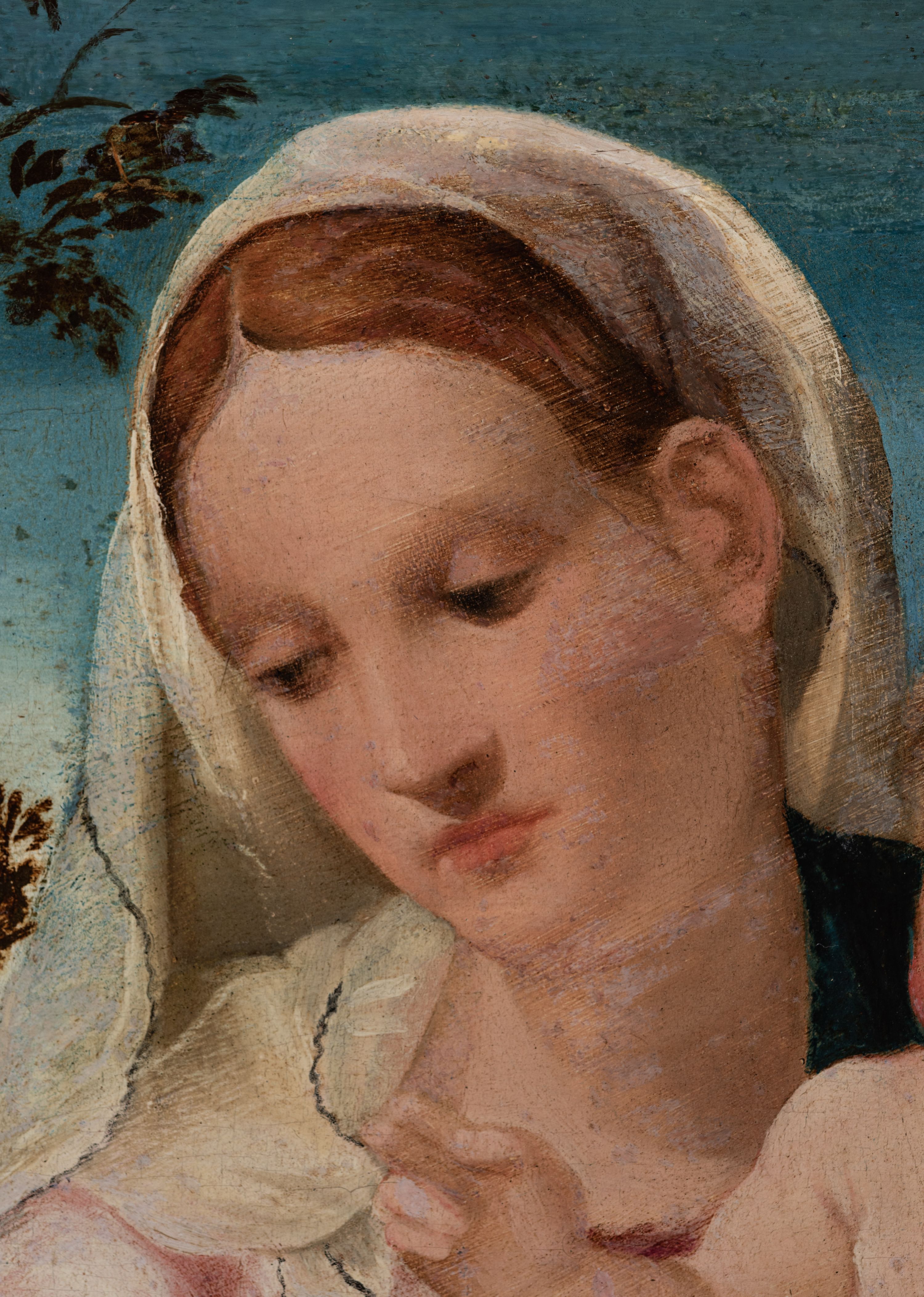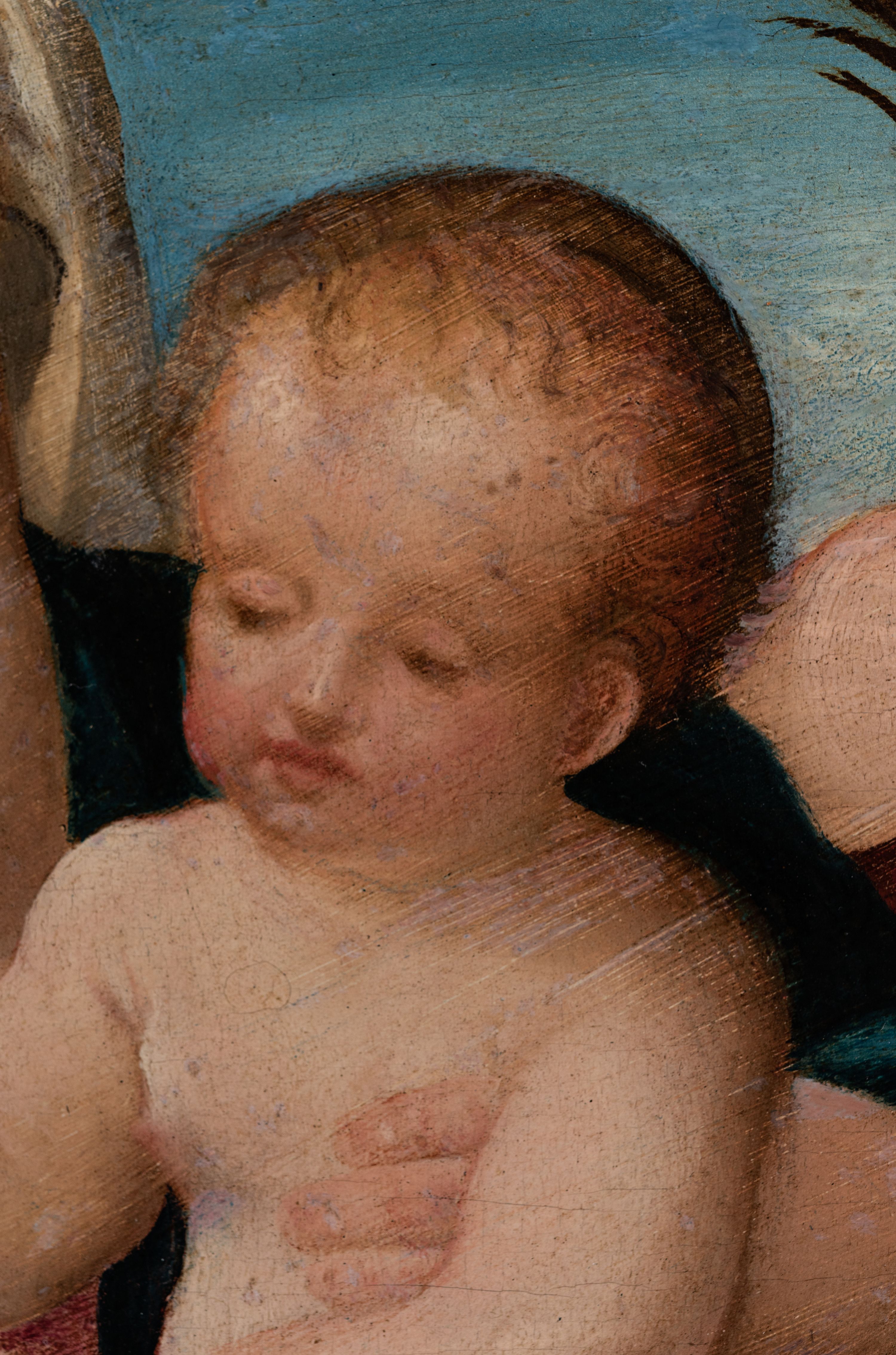 Całkowicie przemalowany; na odwrocie znaczne ślady żerowania drewnojadów, parkietaż z tyłu, zabrudzenia, przetarcia warstwy malarskiej, spękania podobrazia. Rama: spękania, odpryski i przetarcia złoceń.