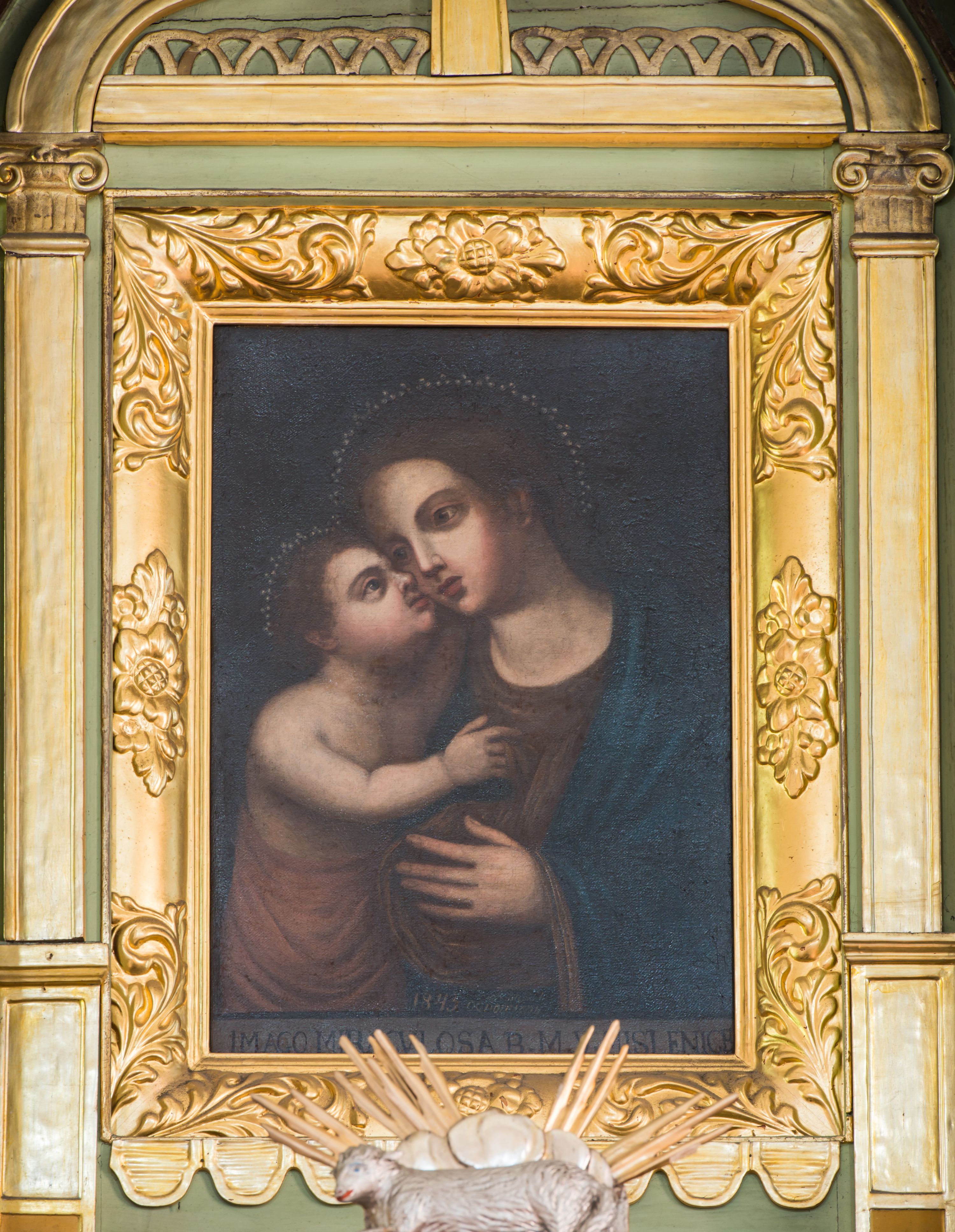 Obraz w kształcie stojącego prostokąta z przedstawieniem Madonny z Dzieciątkiem na wzór wizerunku Matki Boskiej Myślenickiej. Maria ukazana została w półpostaci, zwrócona prawo, w stronę Dzieciątka, przytulonego do jej prawego policzka. Twarz Madonny o pełnym kształcie, dziewczęcych rysach okolona jest ciemnymi, gładko upiętymi włosami. Maria ma duże oczy o regularnych łukach brwiowych, nos o prostym profilu, usta pełne, niewielkie. Matka Boska ubrana jest w ciemnoczerwoną suknię i granatowy płaszcz. Dzieciątko ukazane do wysokości bioder, niemal nagie, przepasane ciemnoróżową chustą; prawą rękę wyciąga w kierunku Marii. Głowę ma uniesioną, ukazaną z prawego profilu. Twarz Dzieciątka jest pełna, okolona krótkimi, ciemnymi włosami. Ma duże, niebieskie oczy, nos krótki, usta pełne. Karnacje ciała postaci w jasnokremowym odcieniu, policzki lekko zaróżowione. Wokół głów nimby z otokiem z malowanych pereł. Tło obrazu jednolite, ciemnobrązowe. U dołu kompozycji napis „1843 odnowiony / IMAGO MIRACVLOSA B(EATAE) M(ARIAE) V(IRGINIS) MISLENICE”. Obraz ujęto złoconą, rzeźbioną ramą z 1748 roku.