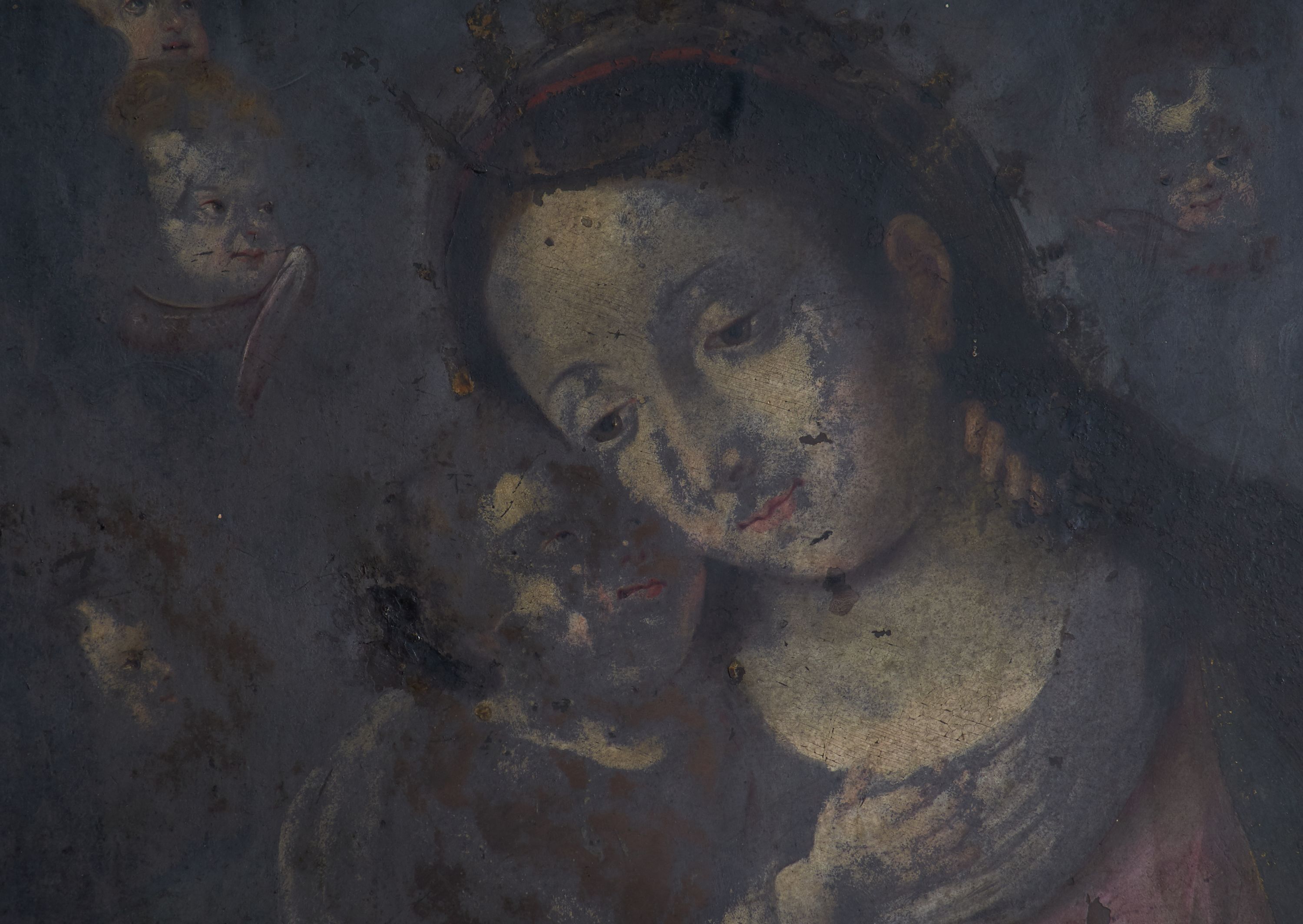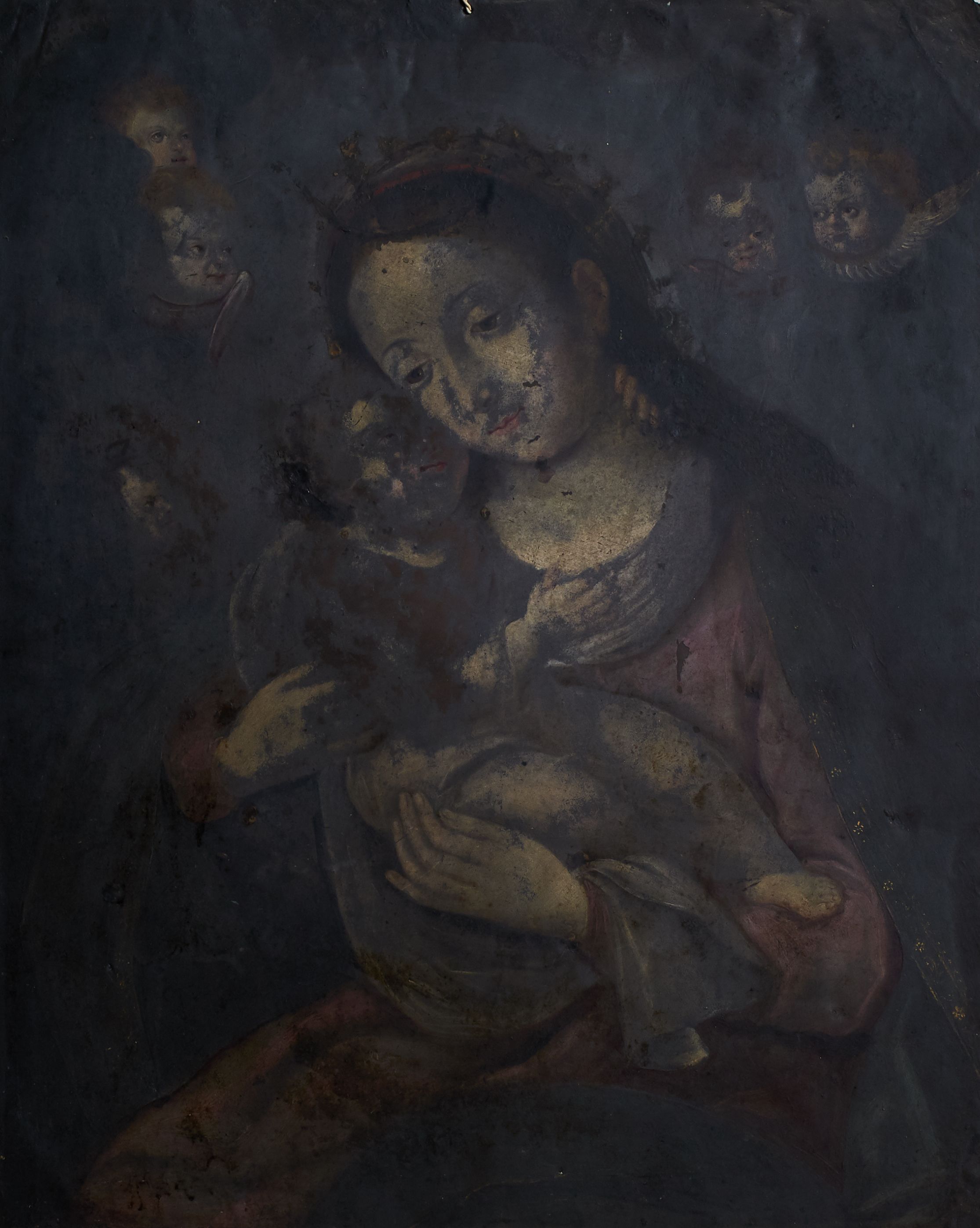 Obraz w kształcie stojącego prostokąta, przedstawiający Matkę Boską z Dzieciątkiem oraz Zaślubiny Marii na odwrociu. Madonna ukazana jest w pozycji siedzącej, widoczna w półpostaci, zwrócona w trzech czwartych w swoją prawą stronę, obejmująca obiema rękami Dzieciątko Jezus. Głowę ma lekko pochyloną w prawą stronę. Twarz okrągła, oczy półprzymknięte, brwi łukowato wygięte. Włosy ciemne, swobodnie opadające na ramiona. Matka Boska odziana jest w czerwoną suknię, na ramiona ma zarzucony ciemnozielony płaszcz, zdobiony na brzegach bordiurą. Na głowie maforium, owinięte też wokół szyi. Dzieciątko ukazane jest w pozycji siedzącej na pieluszce i rękach Marii. Lewą ręką obejmuje Matkę za szyję, prawą ma położoną na jej dekolcie, głowę unosi do góry i przytula do policzka Marii. Włosy krótkie i kręcone. Dzieciątko odziane jest w długą suknię. W tle pięć uskrzydlonych główek aniołków. Na odwrociu scena przedstawiająca Zaślubiny Marii. Pośrodku kompozycji ukazani Maria i Józef, zwróceni ku sobie, trzymający się za dłonie. Pomiędzy nimi kapłan udzielający ślubu. Za plecami Matki Boskiej widoczna kobieta, za plecami św. Józefa dwaj mężczyźni. Pozostałe elementy kompozycji nieczytelne, z powodu dużego zniszczenia dzieła.