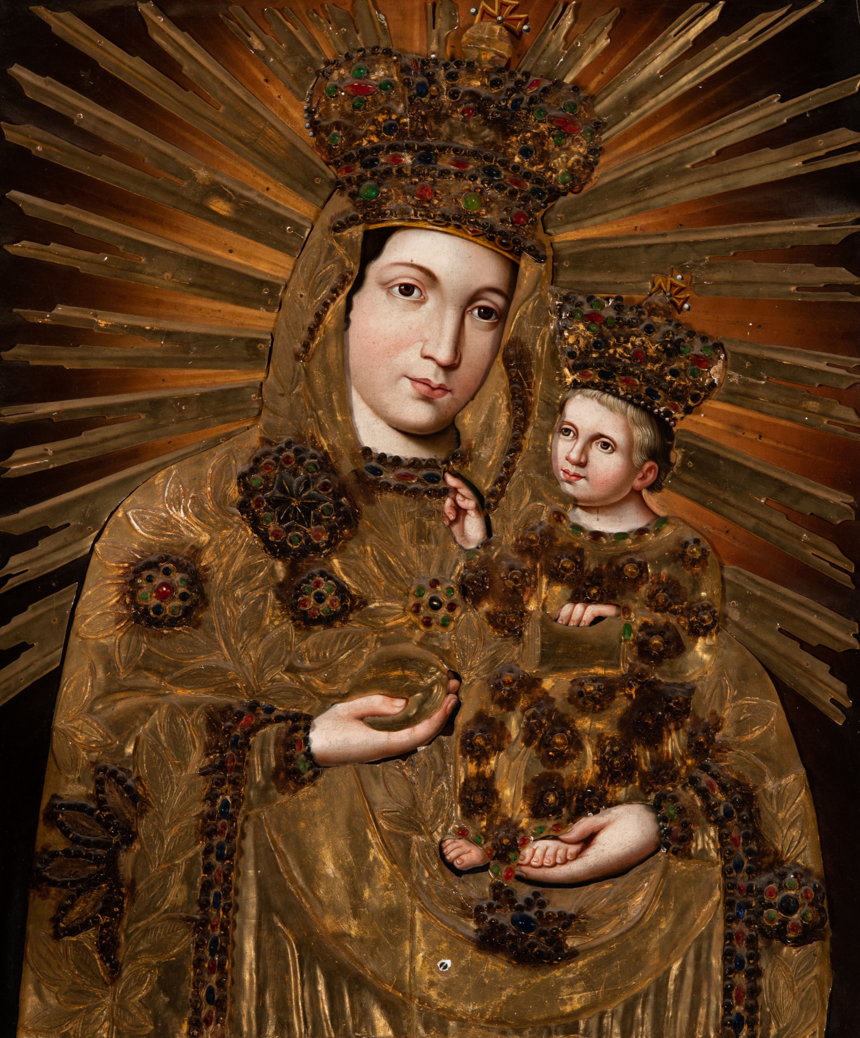 Obraz w kształcie prostokąta zbliżonego do kwadratu, ukazuje Matkę Boską z Dzieciątkiem w typie Hodegetrii krakowskiej. Drewniana, rzeźbiona i złocona sukienka wotywna przesłania obraz, odsłaniając jedynie twarze, dłonie, stopy oraz fragmenty tła. Matka Boska została ujęta frontalnie w półpostaci, trzymając na lewym przedramieniu małego Jezusa. Prawą dłonią zgiętej w łokciu ręki wskazuje na Dzieciątko, trzymając w niej równocześnie gruszkę, zaś lewą, opuszczoną, podtrzymuje jego stopy. Maria nieznacznie pochyla głowę w stronę Syna. Jej twarz ma jasną karnację o rumianych policzkach, duże, szeroko rozstawione oczy, prosty nos, wąskie usta i tylko częściowo widoczne ciemne włosy. Mały Jezus siedzi wyprostowany na lewym ramieniu Marii. Ma nieznacznie uniesioną głowę ze spojrzeniem skierowanym na matkę. Prawą ręką błogosławi, lewą zaś opiera na trzymanej na kolanach księdze Ewangelii. Jego owalna twarz o jasnej karnacji z rumianymi policzkami widoczna jest w trzech czwartych. Na głowie spod korony wotywnej widać jasne, krótkie włosy. Obie postacie okrywa drewniana, płaskorzeźbiona i złocona sukienka wotywna z koronami. Sukienka zapewne powtarza dukt maforionu Matki Boskiej oraz kształt i drapowanie długiej tuniki, która okrywa małego Jezusa. Szaty Marii dekorowane są płaskorzeźbionym ornamentem z motywem szerokolistnych gałązek z kwiatami w kształcie rozet, naśladujących kameryzacje. Malowana kameryzacja widoczna jest także na taśmach lamujących maforion oraz spodnią suknię pod szyją i na jej rękawach. Pod szyją Marii widać drewniany krzyżyk. Tunika Dzieciątka jest pokryta płaskorzeźbionymi rozetami z naśladowaniem malowanej kameryzacji. Obie postacie mają na głowach zamknięte, płaskorzeźbione i złocone korony z globem i krzyżykiem. Także one są dekorowane malowaną kameryzacją. Marię i Dzieciątko otaczają nakładane, płaskorzeźbione i złocone promienie, zakończone w jaskółczy ogon, ułożone na kształt glorii.