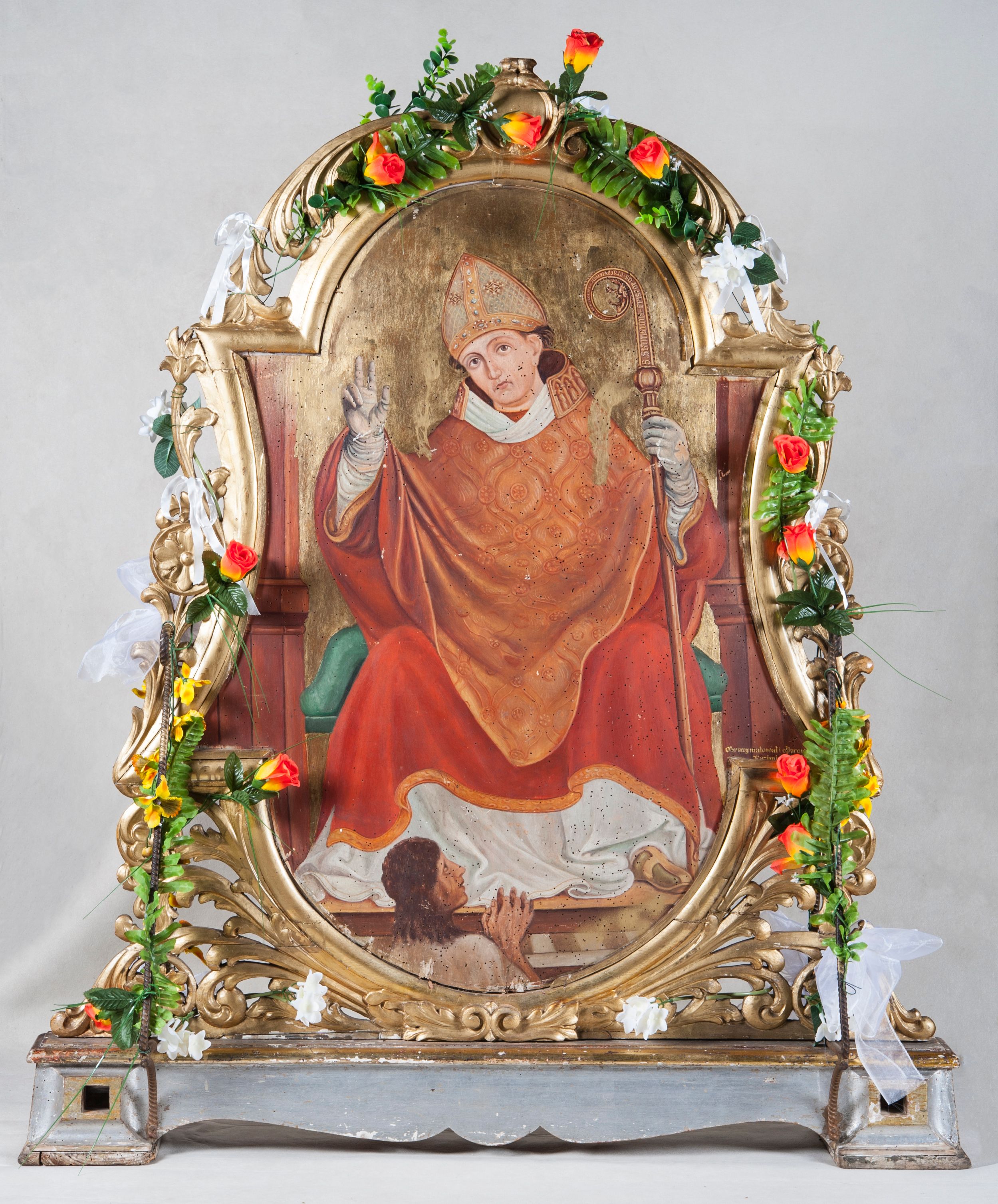 Feretron malowany, dwustronny, w kształcie zbliżonym do stojącego prostokąta zamkniętego półkoliście na prostopadłościennej podstawie. Wizerunki oprawione w złoconą, profilowaną ramę o wklęsłych bokach, od góry i od dołu zamkniętą łukiem nadwieszonym. Ramę ujmuje ażurowa wić roślinna szczególnie rozbudowania w dolnej partii. Podstawa feretronu jest srebrzona i złocona, rama złocona.