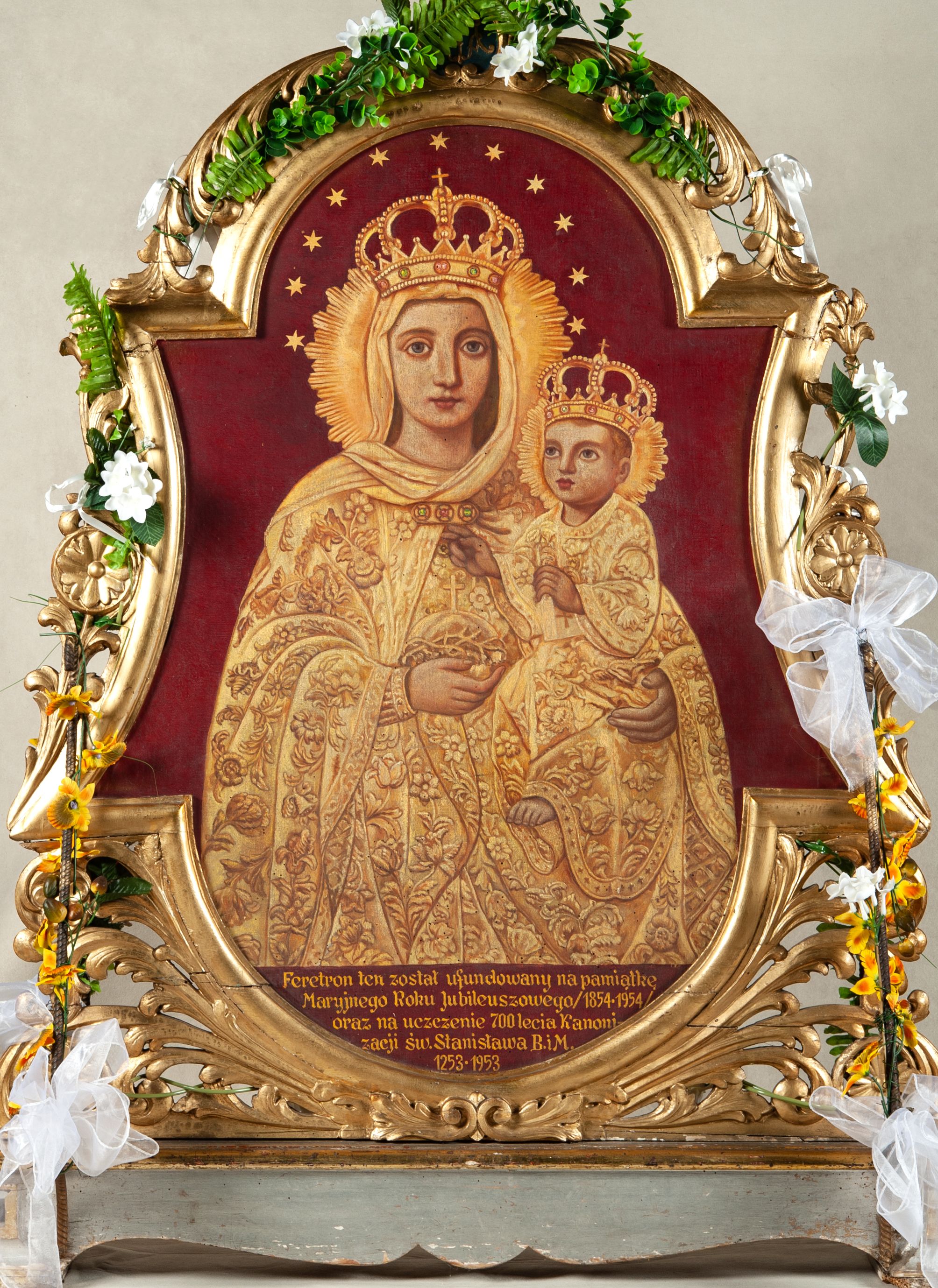 Na awersie wizerunek Matki Boskiej z Dzieciątkiem. Maria została ukazana w półpostaci, frontalnie, spoglądając na widza. Ma owalną twarz o delikatnych rysach, duże, niebieskie oczy, długi nos i niewielkie usta. Lewą ręką podtrzymuje Dzieciątko, w prawej trzyma jabłko królewskie oplecione koroną cierniową. Jest ubrana w długą, złotą suknię z wąskimi rękawami i złoty płaszcz dekorowany kwiatami spięty na dekolcie fibulą z zielonymi i czerwonymi kamieniami. Dzieciątko spogląda nieco w górę, ma okrągłą twarz. Prawą ręką czyni znak błogosławieństwa, w lewej trzyma księgę. Jest ubrane w długą, złotą suknię o wzorze podobnym do umieszczonego na płaszczu Marii. Oboje mają na głowach zamknięte korony i nimby promieniste. Głowę Marii otacza dodatkowo 11 gwiazdek. W dolnej partii obrazu napis „Feretron ten został ufundowany na pamiątkę / Maryjnego Roku Jubileuszowego /1854-1954/ / oraz na uczczenie 700 lecia Kanoni/zacji św(iętego) Stanisława B(iskupa) i M(ęczennika) / 1253-1953”. W odsłoniętych partiach ciała naturalna karnacja, tło przedstawienia jednolite, bordowe.