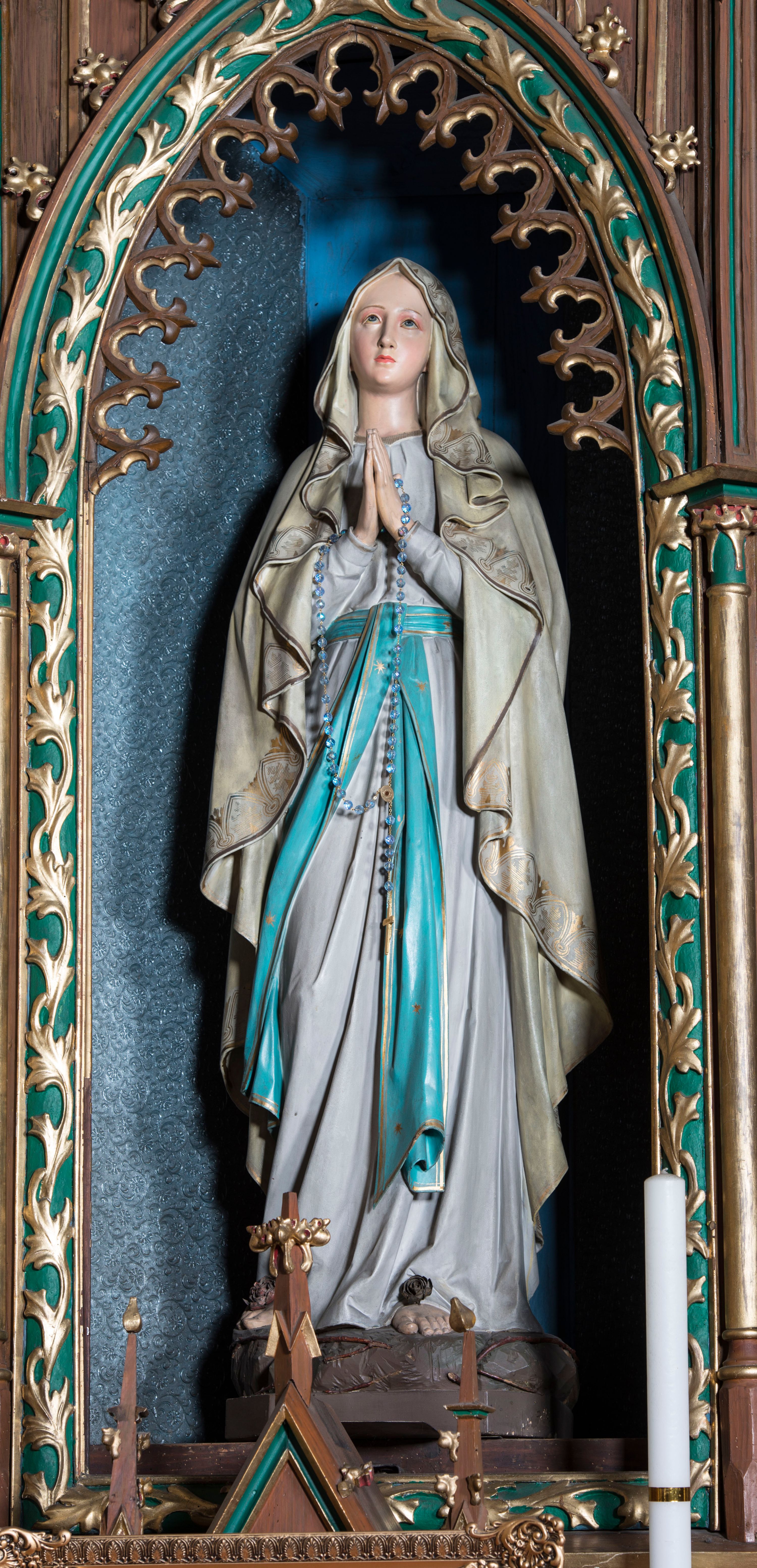 Kult Matki Boskiej rozwijał się w XIX wieku szczególnie intensywnie, do czego przyczyniło się ogłoszenie w 1854 roku dogmatu o Niepokalanym Poczęciu Najświętszej Marii Panny. Do najpopularniejszych i najbardziej czczonych wizerunków tego okresu należy widoczna w środkowej niszy ołtarza bocznego figura Matki Boskiej z Lourdes. Ten typ przedstawienia wykształcił się w wyniku wizji, jakich od 11 lutego do 16 lipca 1858 aż 18 razy w grocie Massabielle koło Lourdes doświadczyła Bednadetta Soubirous. Zgodnie z opisem dziewczynki posąg Marii w marmurze karraryjskim wykonać miał Joseph-Hugues Fabisch, uznany artysta, profesor szkoły artystycznej w Lyonie. Bernadetcie nie spodobał się efekt jego prac, a i artysta nie był z nich zadowolony. Mimo to, gotowy posąg ustawiono w grocie i w niedługim czasie stał się inspiracją dla wielu podobnych przedstawień.