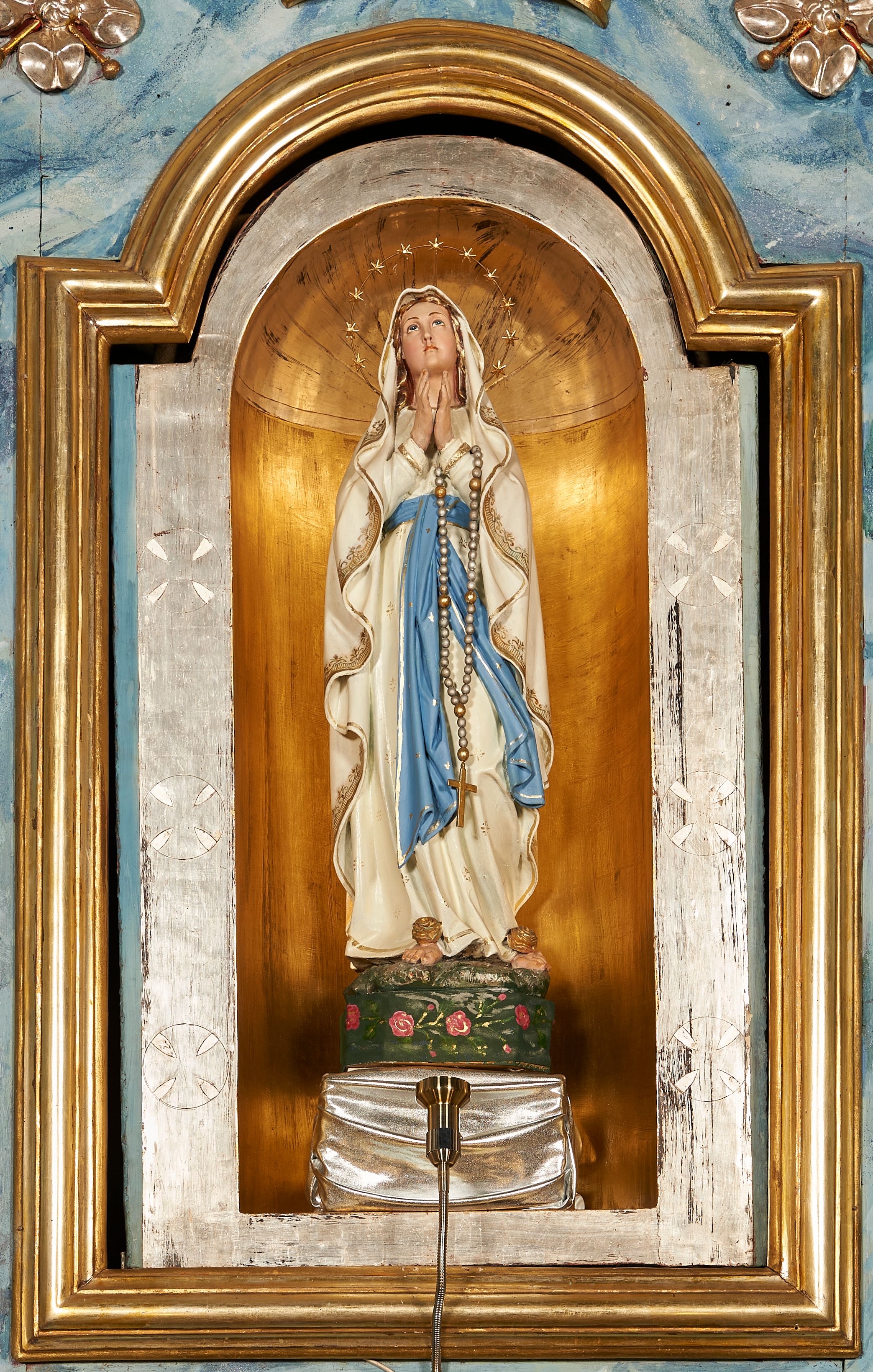 Kult Matki Boskiej rozwijał się w XIX wieku szczególnie intensywnie, do czego przyczyniło się ogłoszenie w 1854 roku dogmatu o Niepokalanym Poczęciu Najświętszej Marii Panny. Do najpopularniejszych i najbardziej czczonych wizerunków tego okresu należy widoczna w środkowej niszy ołtarza bocznego figura Matki Boskiej z Lourdes. Ten typ przedstawienia wykształcił się w wyniku wizji, jakich od 11 lutego do 16 lipca 1858 aż 18 razy w grocie Massabielle koło Lourdes doświadczyła Bednadetta Soubirous. Zgodnie z opisem dziewczynki posąg Marii w marmurze karraryjskim wykonać miał Joseph-Hugues Fabisch, uznany artysta, profesor szkoły artystycznej w Lyonie. Bernadetcie nie spodobał się efekt jego prac, a i artysta nie był z nich zadowolony. Mimo to, gotowy posąg ustawiono w grocie i w niedługim czasie stał się inspiracją dla wielu podobnych przedstawień.