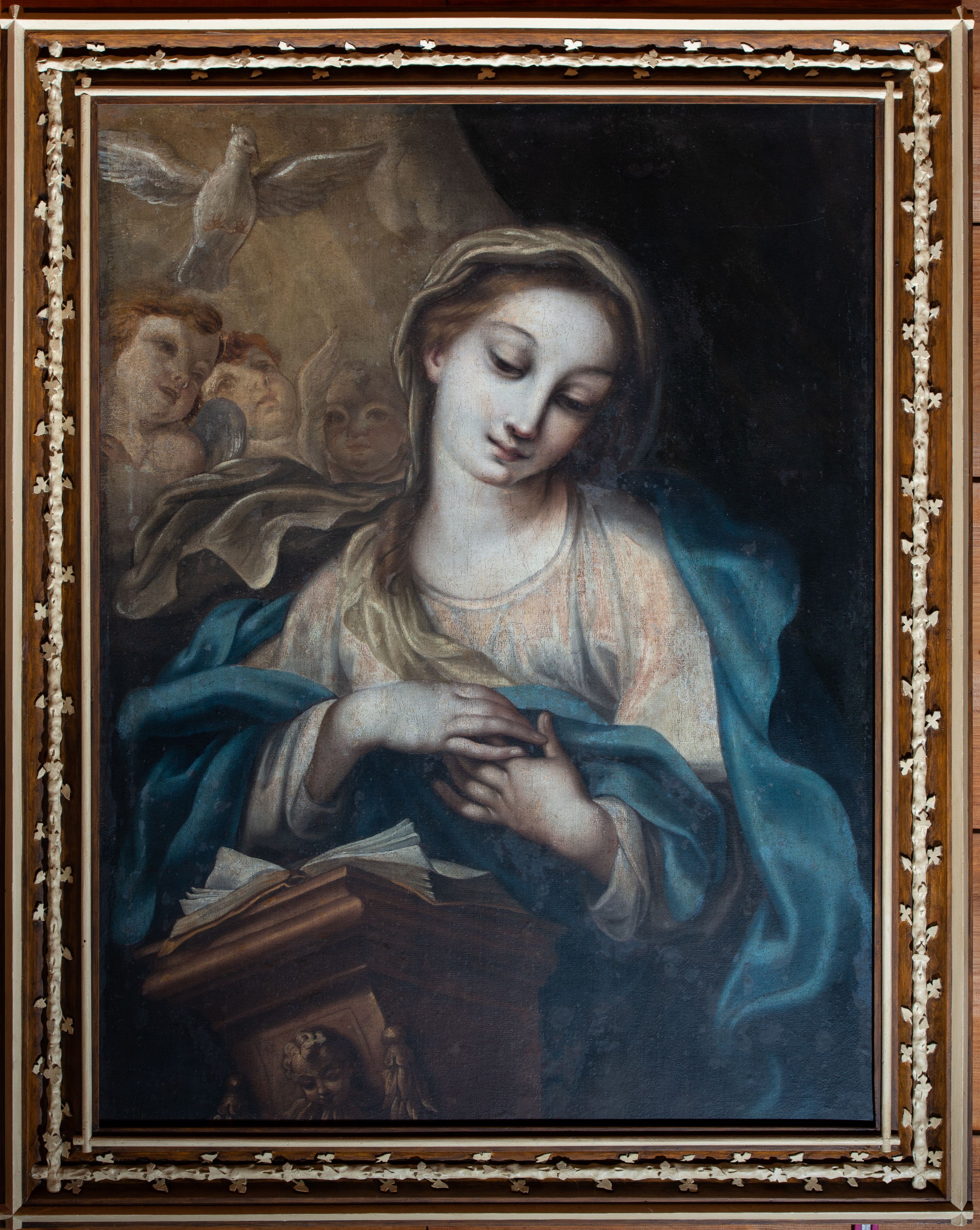 Obraz w kształcie stojącego prostokąta z półpostaciowym przedstawieniem Matki Boskiej w ujęciu frontalnym. Głowa lekko zwrócona i przechylona w lewo. Twarz owalna o pełnych, młodzieńczych rysach. Włosy lekko falowane, ciemny blond, z jednym puklem opadające na prawy bark. Maria ubrana jest w białą sukienkę z półokrągłym dekoltem i długimi rękawami oraz niebieski płaszcz osłaniający plecy i ramiona z jedną połą podtrzymywaną złożonymi na piersiach dłońmi. Na głowie biała chusta opadająca na prawe ramię. Przed Marią, w lewym dolnym narożu obrazu fragment pulpitu o lekko rozszerzającym się ku górze, prostopadłościennym trzonie zdobionym główkami putta i zwisami z liści laurowych. Blat pulpitu o profilowanych krawędziach. Na pulpicie leży otwarty modlitewnik. W tle w prawym górnym rogu fragment ciemnej tkaniny, a w lewym rogu gołębica Ducha Świętego i trzy putta na tle jasnych obłoków.