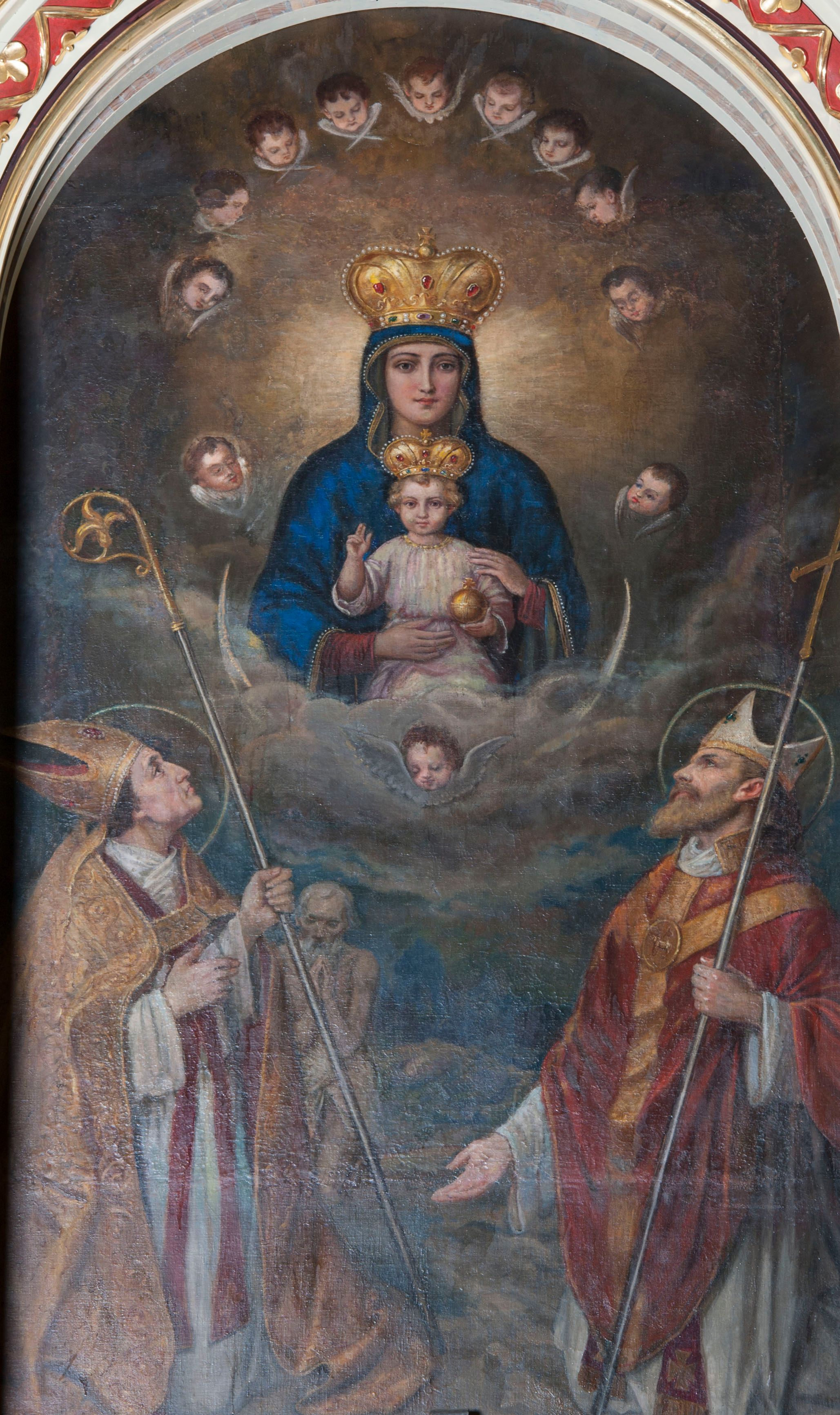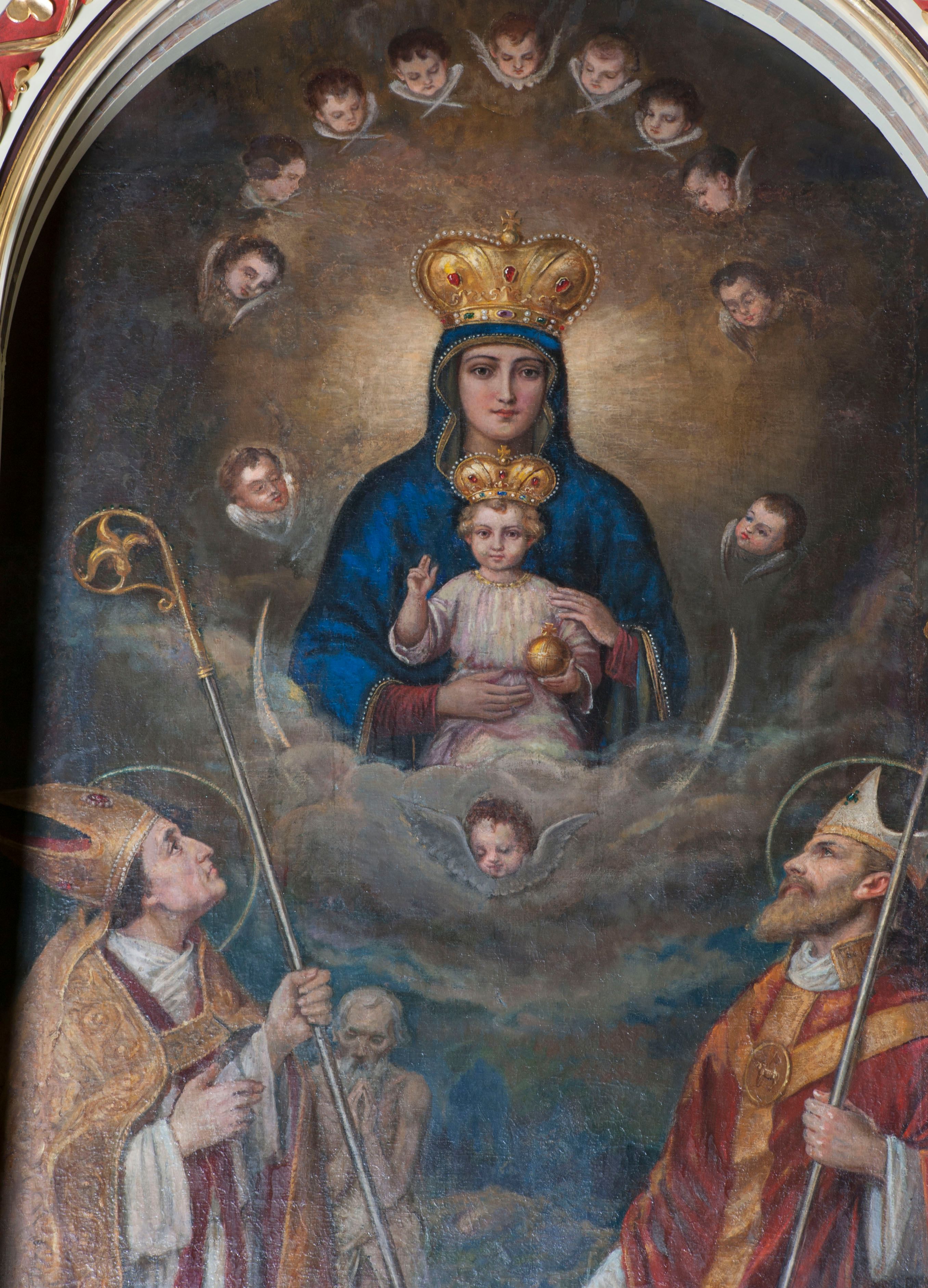 Obraz w kształcie stojącego prostokąta zamkniętego od góry łukiem półkolistym z przedstawieniem Matki Boskiej z Dzieciątkiem tronującej między świętymi. Madonna ukazana frontalnie, w półpostaci, z podtrzymywanym obiema rękami Dzieciątkiem Jezus na kolanach. Ma owalną twarz z podłużnym nosem, drobnymi ustami i dużymi, wyraźnie zaznaczonymi oczami. Dzieciątko spogląda na widza, prawą rękę unosi w geście błogosławieństwa, w lewej trzyma jabłko królewskie. Ma owalną, delikatną twarz z wąskim nosem, małymi ustami i okrągłymi oczami, otoczoną puklami jasnych włosów. Matka Boska jest ubrana w widoczną tylko przy nadgarstkach czerwoną suknię i obszerny, zarzucony na głowę niebieski płaszcz zdobiony przy brzegu rzędem pereł oraz złotą taśmą. Dzieciątko ubrane w jasnoróżową sukienkę przewiązaną w pasie. Na głowach postaci zamknięte korony zdobione kamieniami szlachetnymi, a wokół uskrzydlone główki anielskie. W dolnej partii obrazu klęczą, spoglądając na Marię z Jezusem św. Stanisław po lewej stronie i św. Wojciech po prawej. Obaj mają nad głowami nimby. Święty Stanisław w lewej ręce trzyma pastorał, a prawą ma uniesioną na wysokości mostka. Jest ubrany w strój biskupi: infułę, albę, humerał, stułę, na to założoną ma obszerną, złotą kapę, która spięta pod szyją ozdobną fibulą okrywa ramiona i spływa do ziemi, wywijając się obszernymi fałdami. Za nim stoi Piotrowin ukazany jako starszy, modlący się mężczyzna okryty w pasie białą tkaniną. Święty Wojciech prawą rękę wyciąga przed siebie, a w lewej trzyma krzyż misyjny. Jest ubrany w białą albę, czerwoną stułę, której końce są widoczne na wysokości kolan, czerwony ornat o wykroju w szpic dekorowany złotą kolumną. Pod szyją ma biały humerał, na głowie białą infułę zdobioną złotymi paskami i krzyżami greckimi. W tle skłębione obłoki, szaro-niebieskie na wysokości świętych, wyżej gęste, ujmujące od dołu Marię z Dzieciątkiem, w górnej partii przechodzą w brunatne, rozświetlone za plecami tronujących.